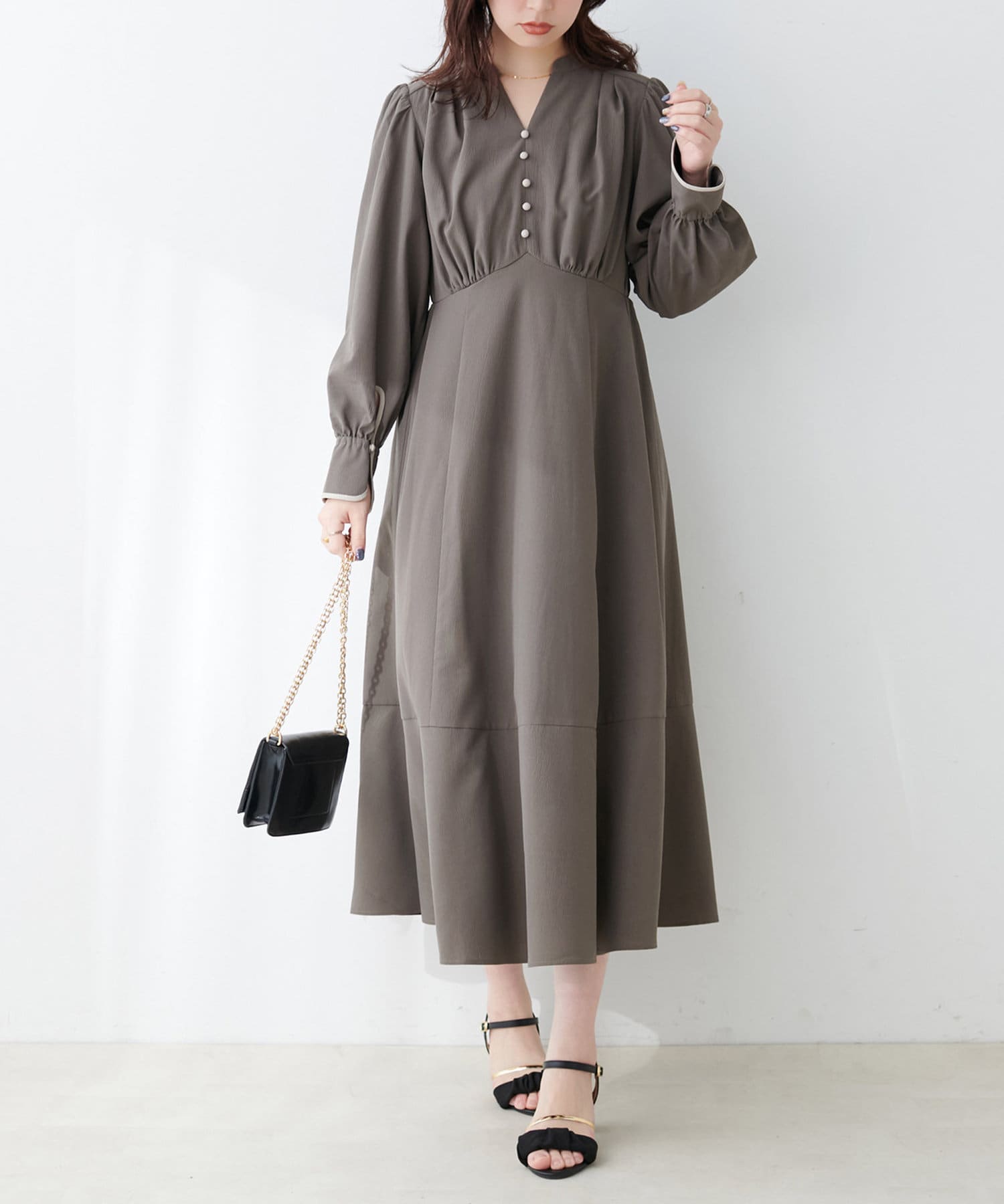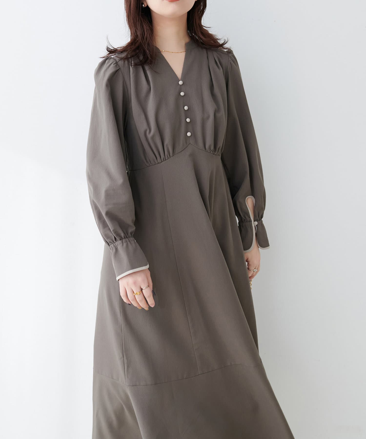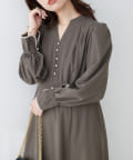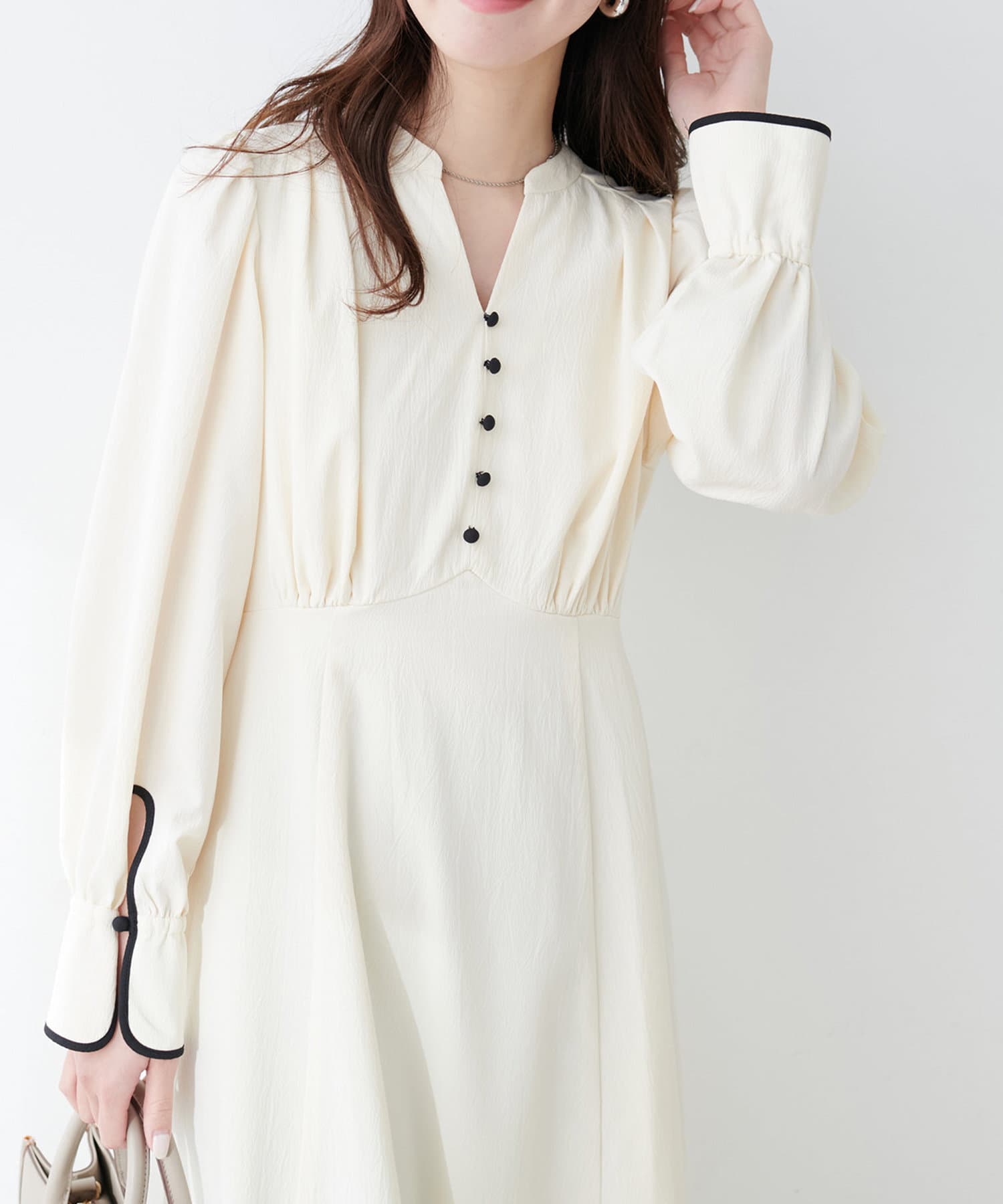 衿元はキーネックデザインで、顔まわりを華やかで、すっきりみせてくれます。