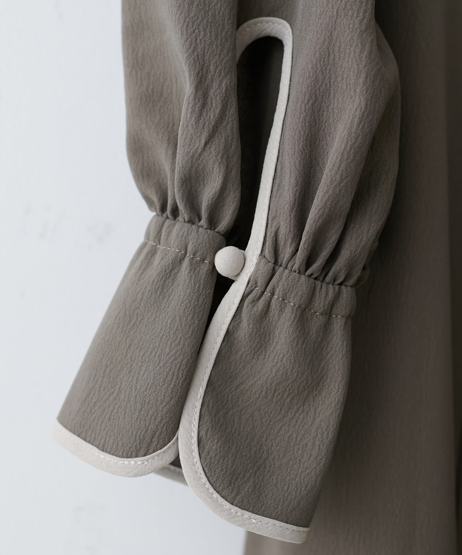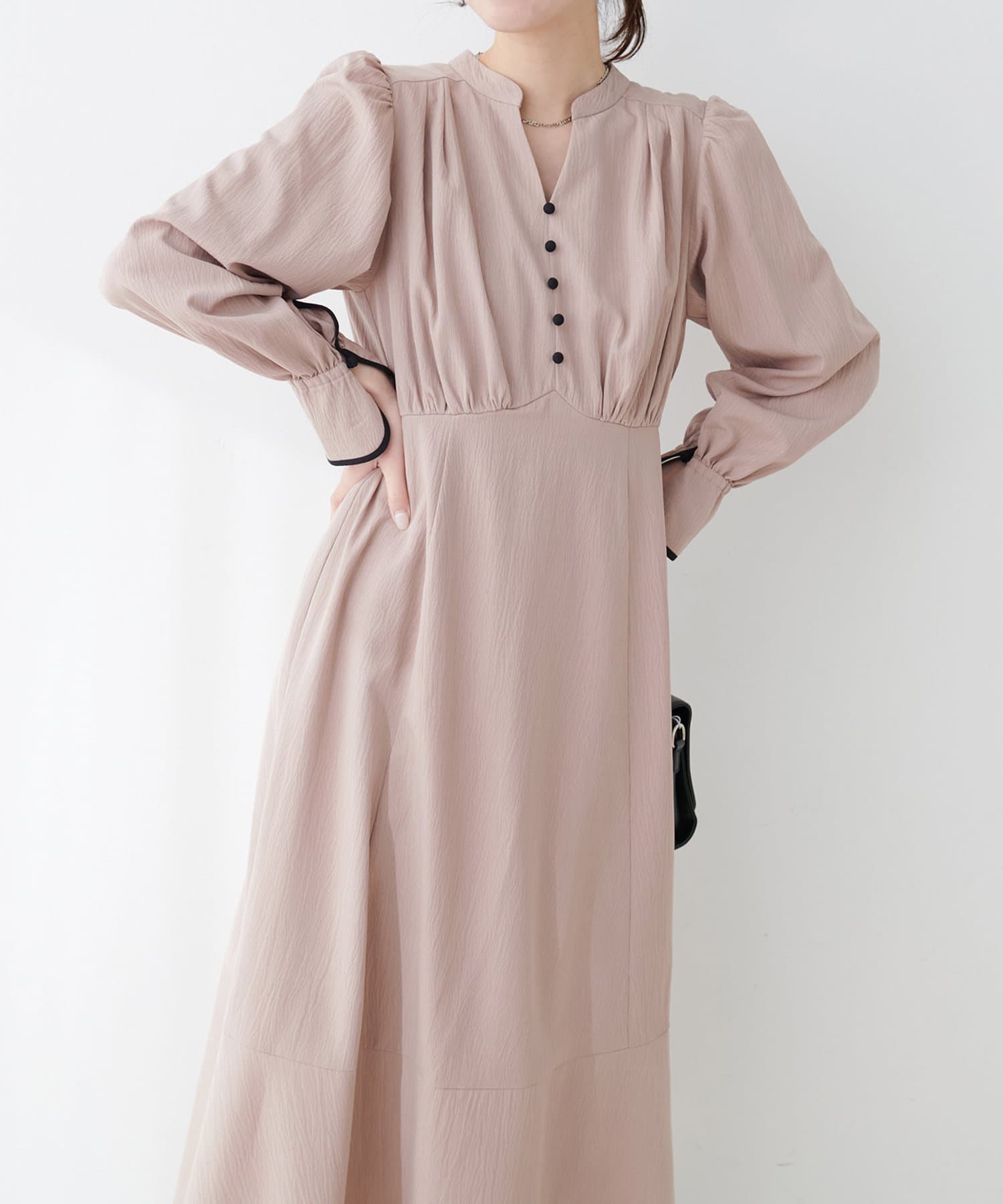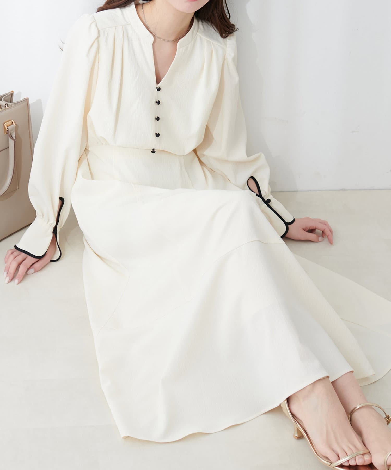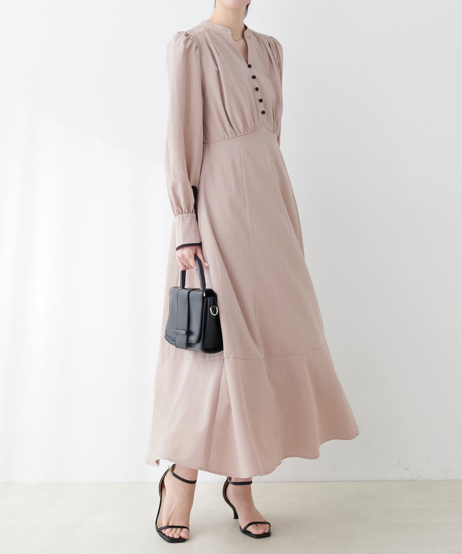衿元はキーネックデザインで、顔まわりを華やかで、すっきりみせてくれます。