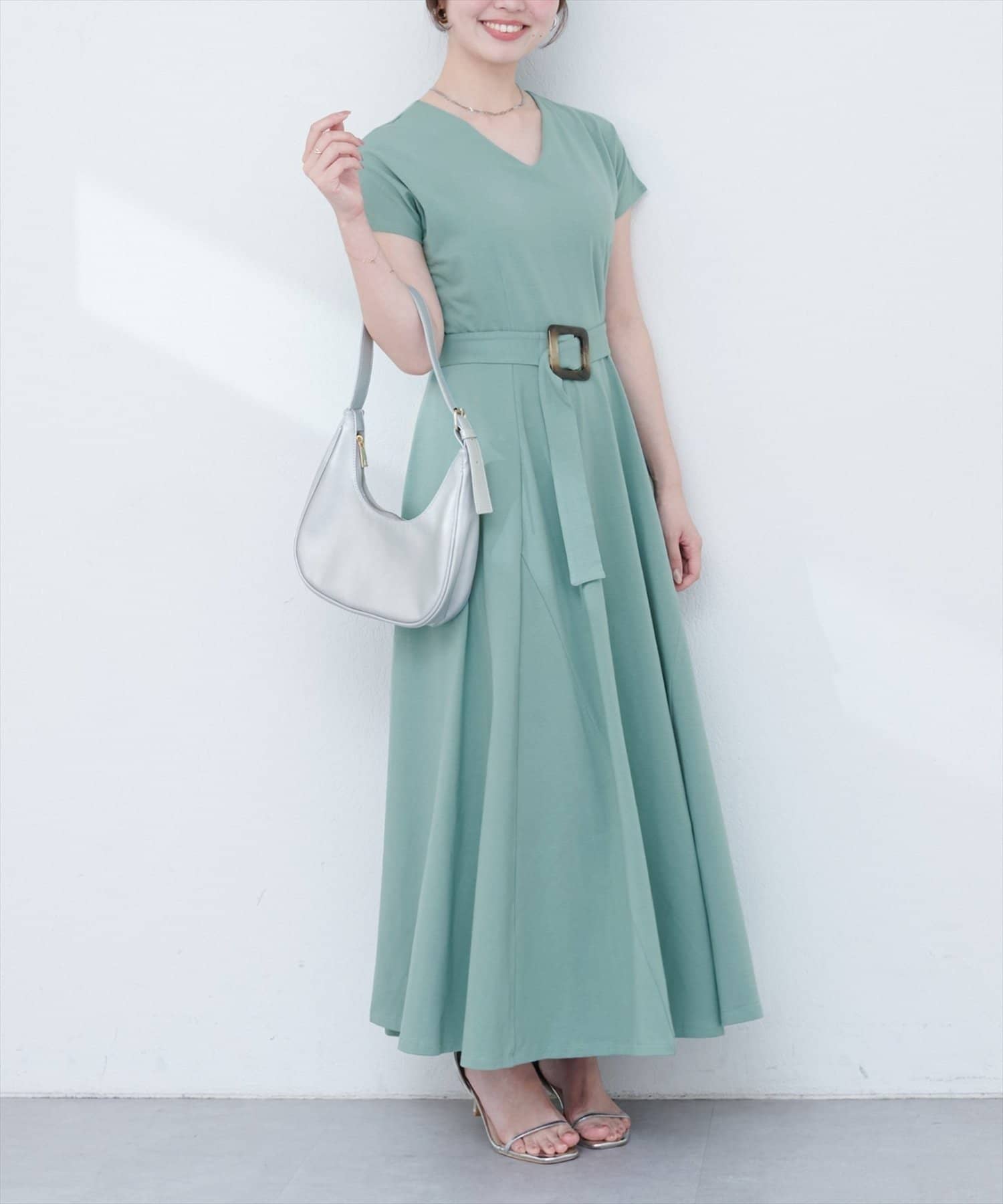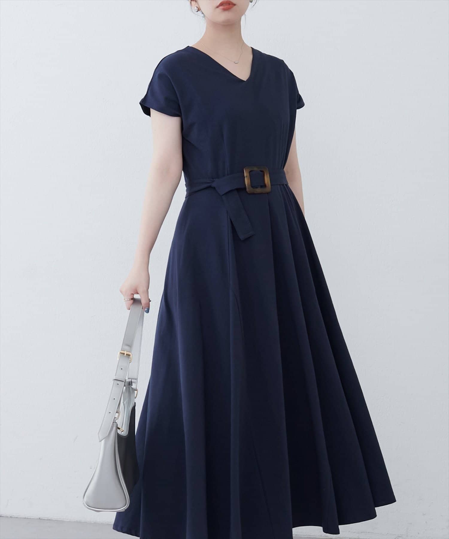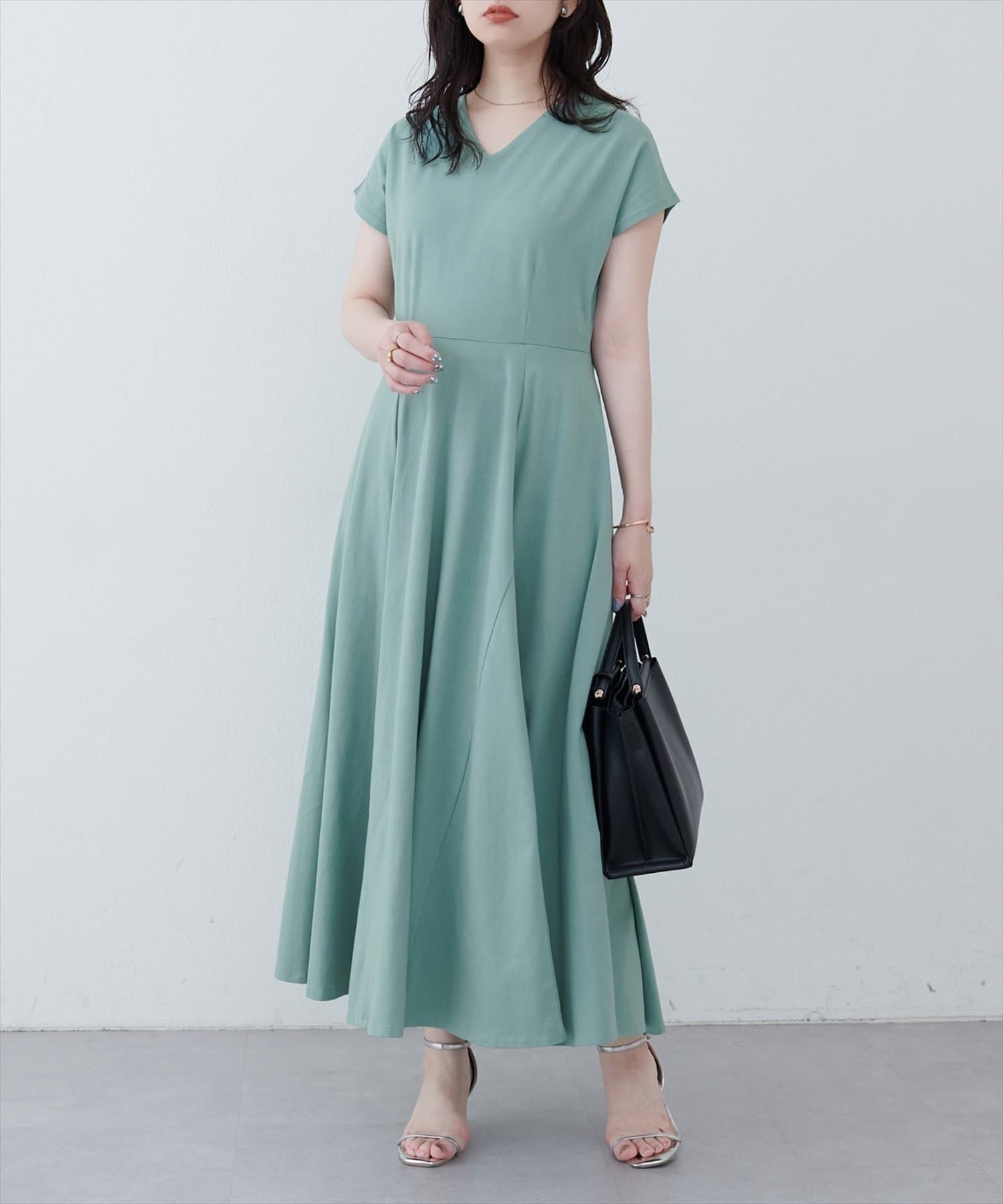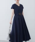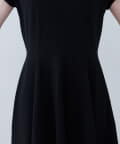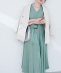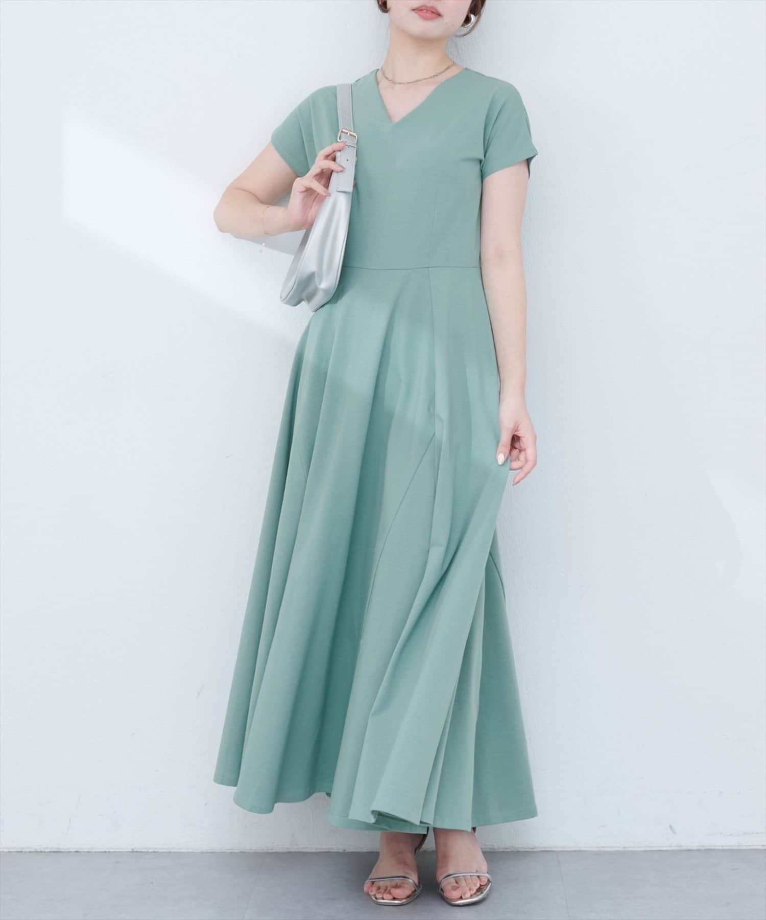 Vネックとフレアスカートの組み合わせが、女性らしい美しいシルエットを演出。
