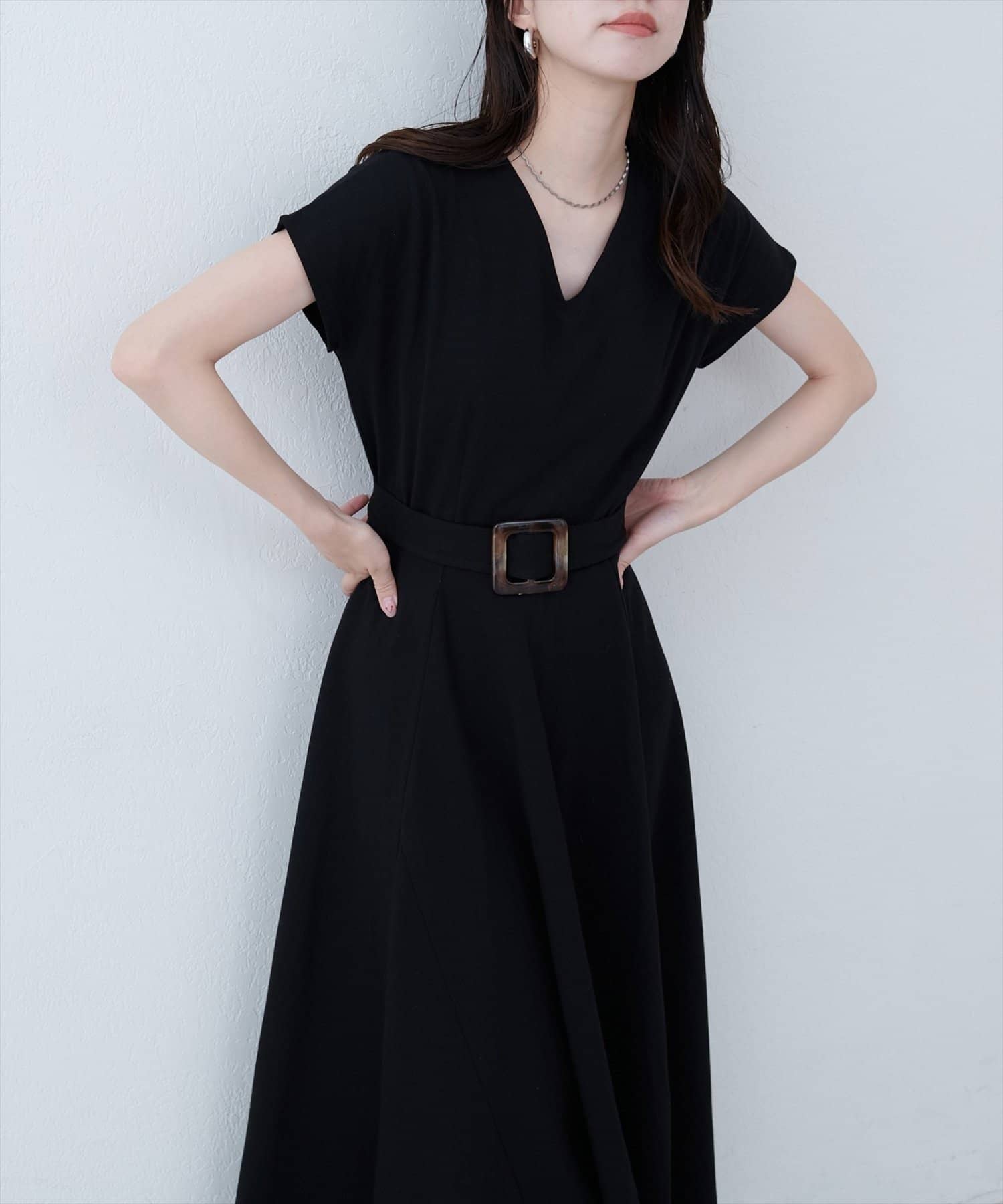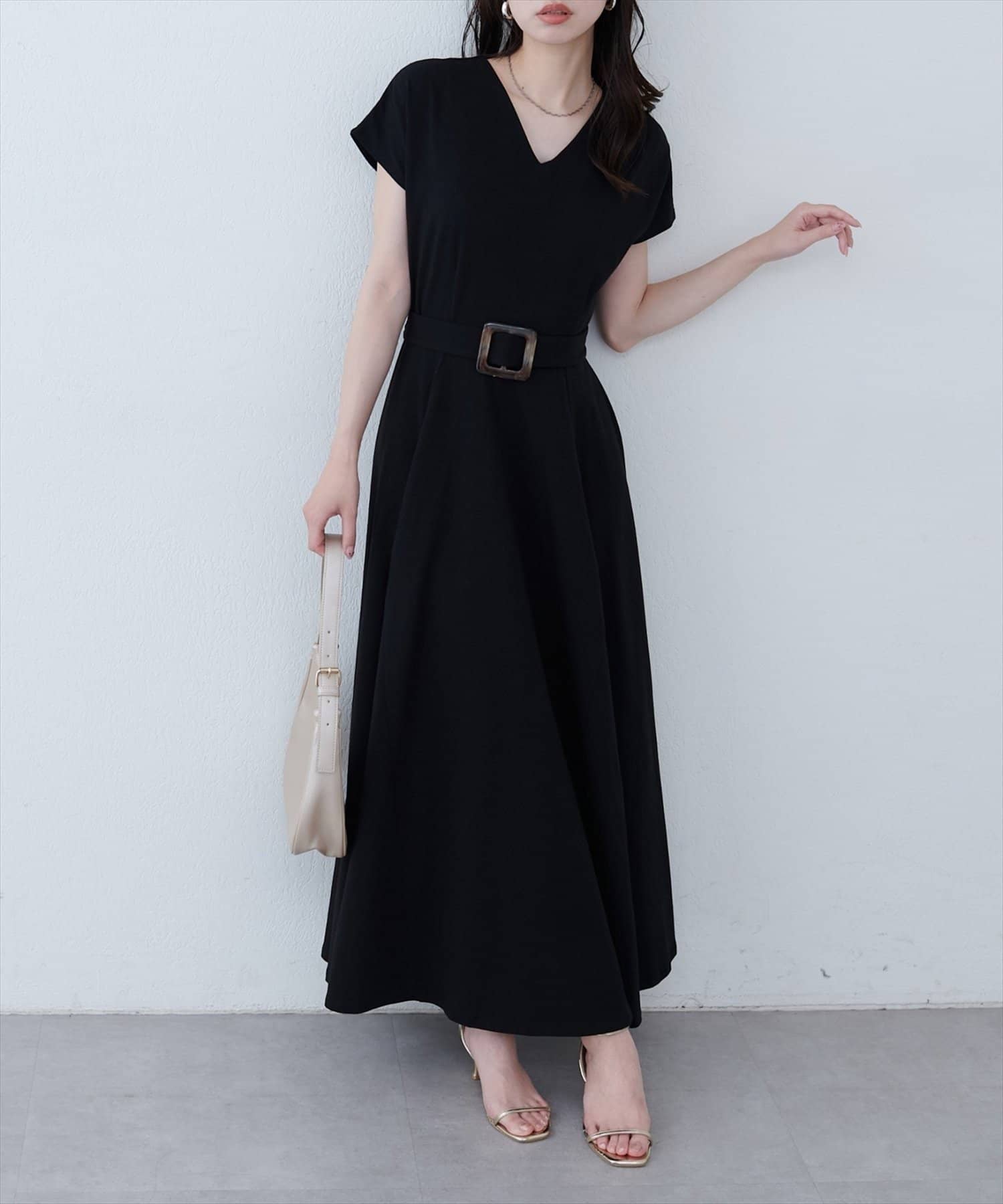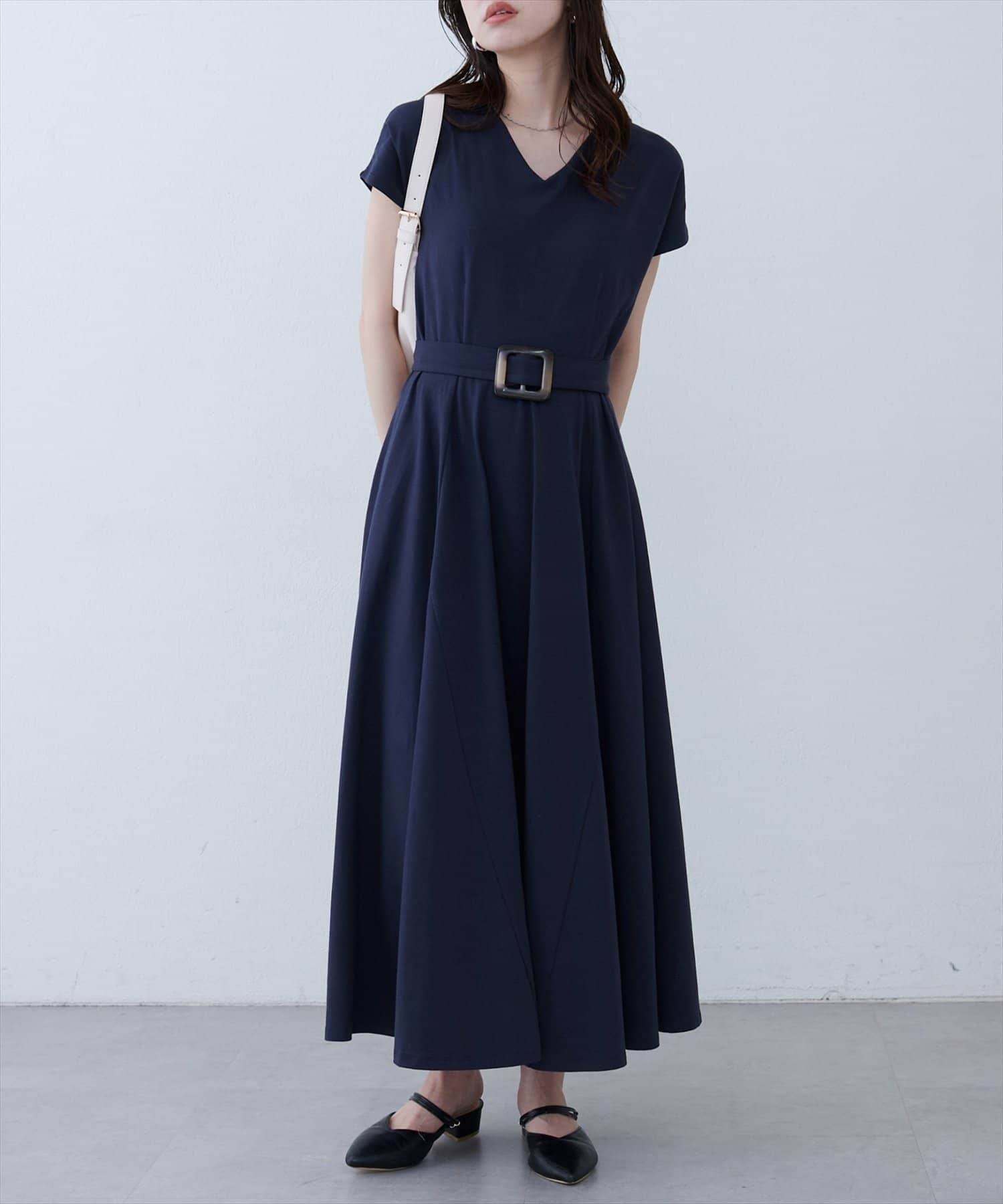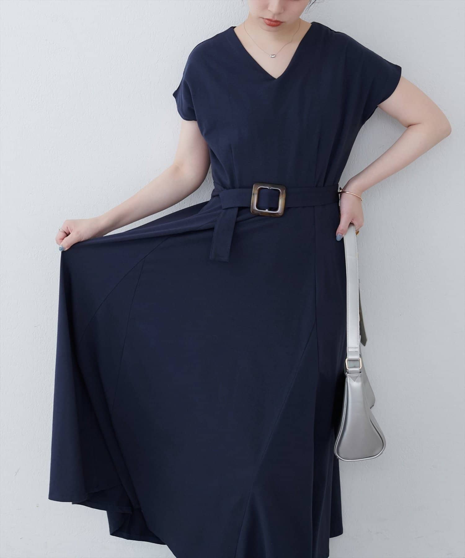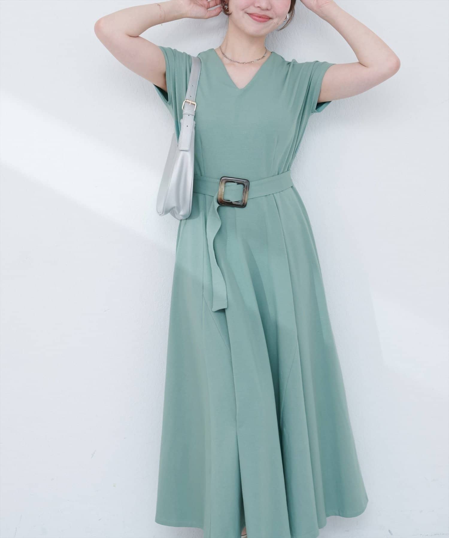 Vネックとフレアスカートの組み合わせが、女性らしい美しいシルエットを演出。