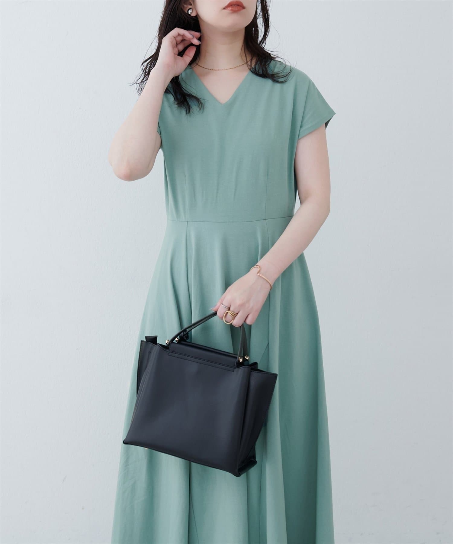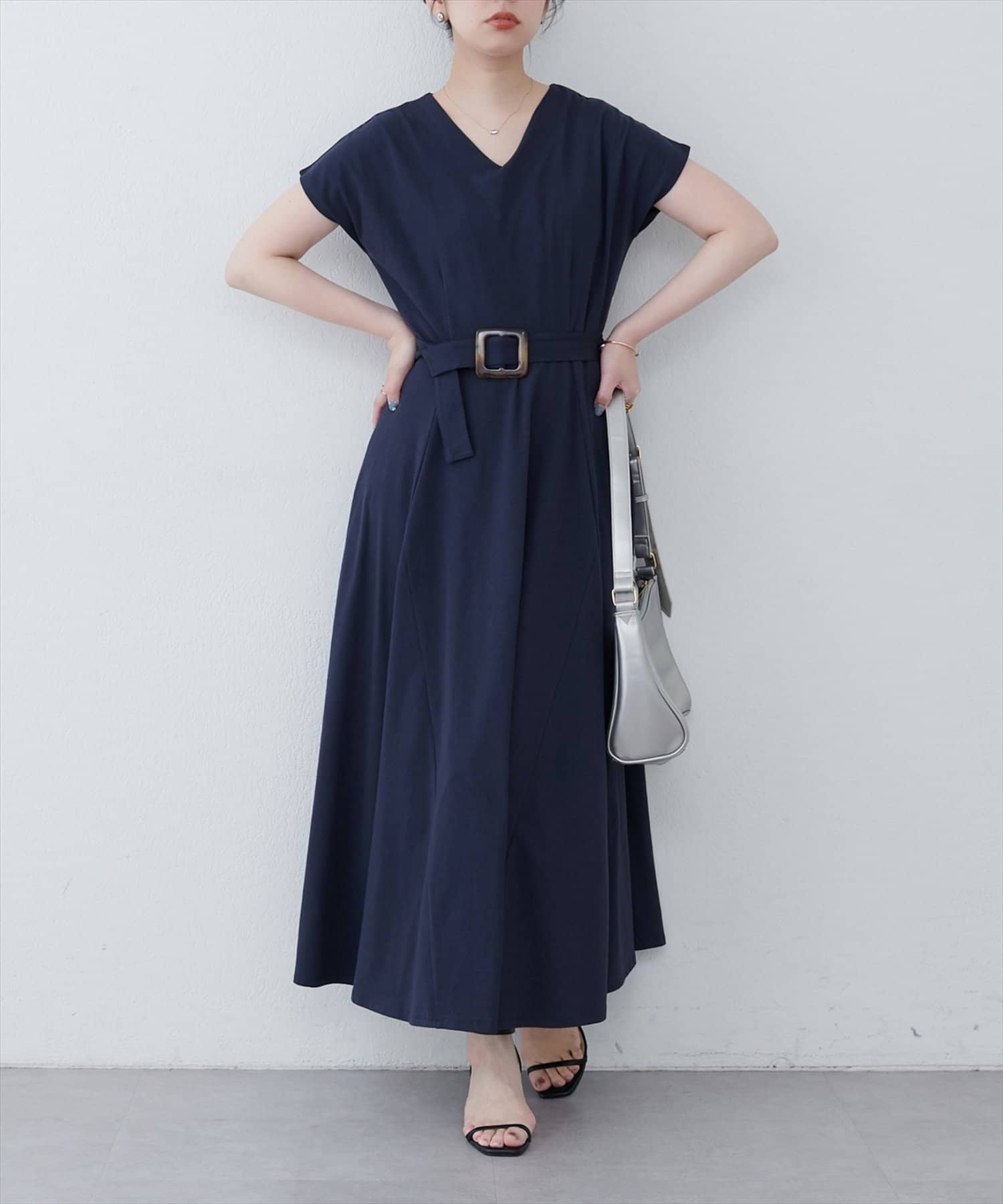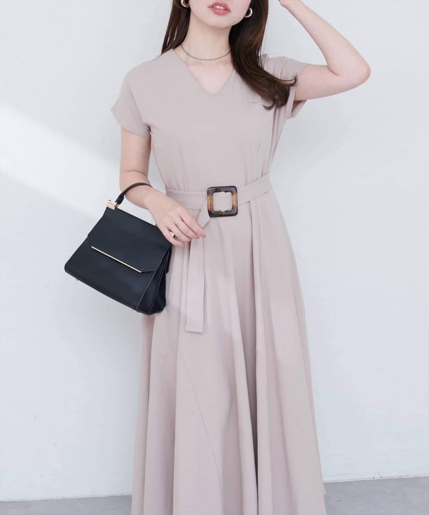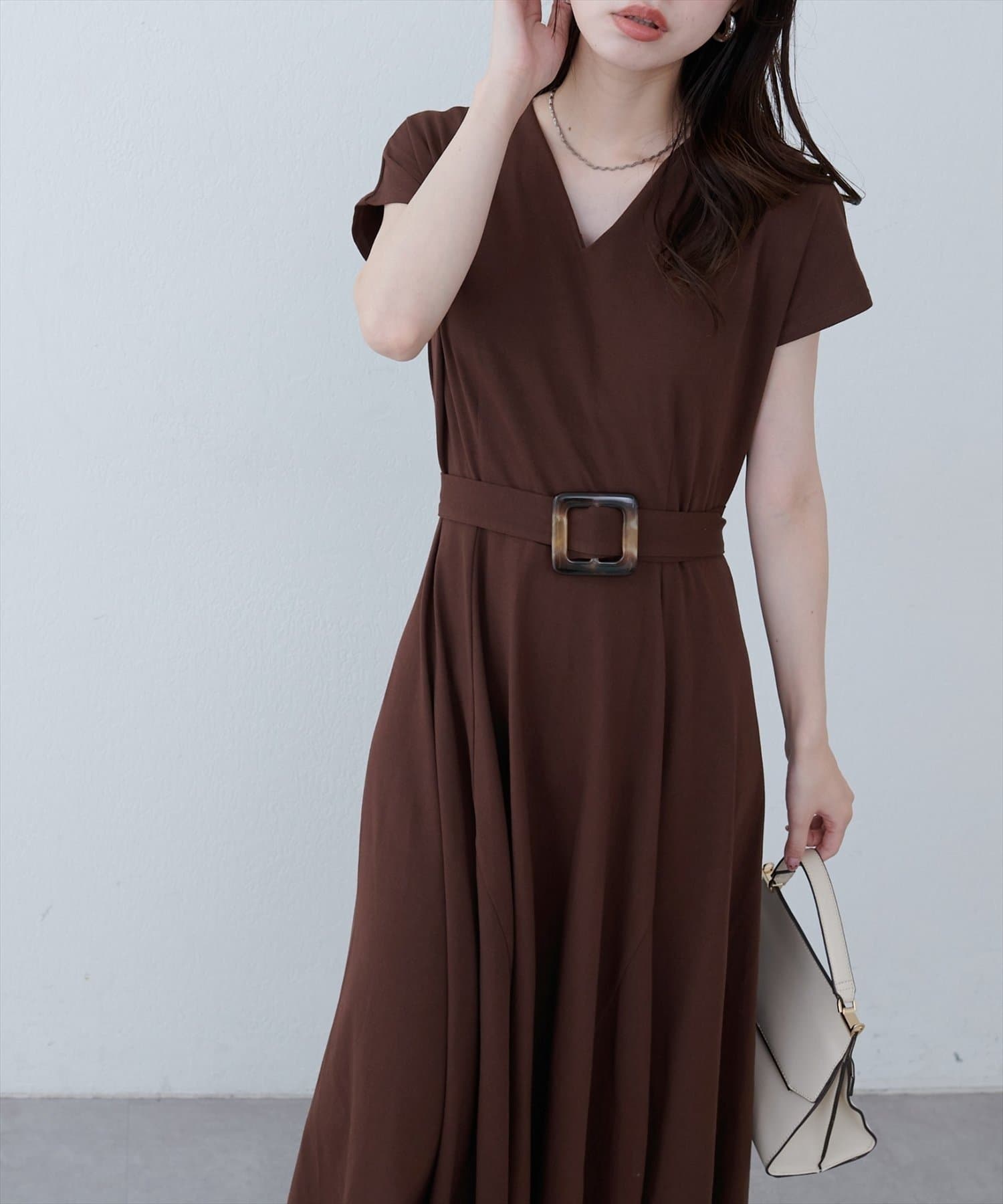Vネックとフレアスカートの組み合わせが、女性らしい美しいシルエットを演出。