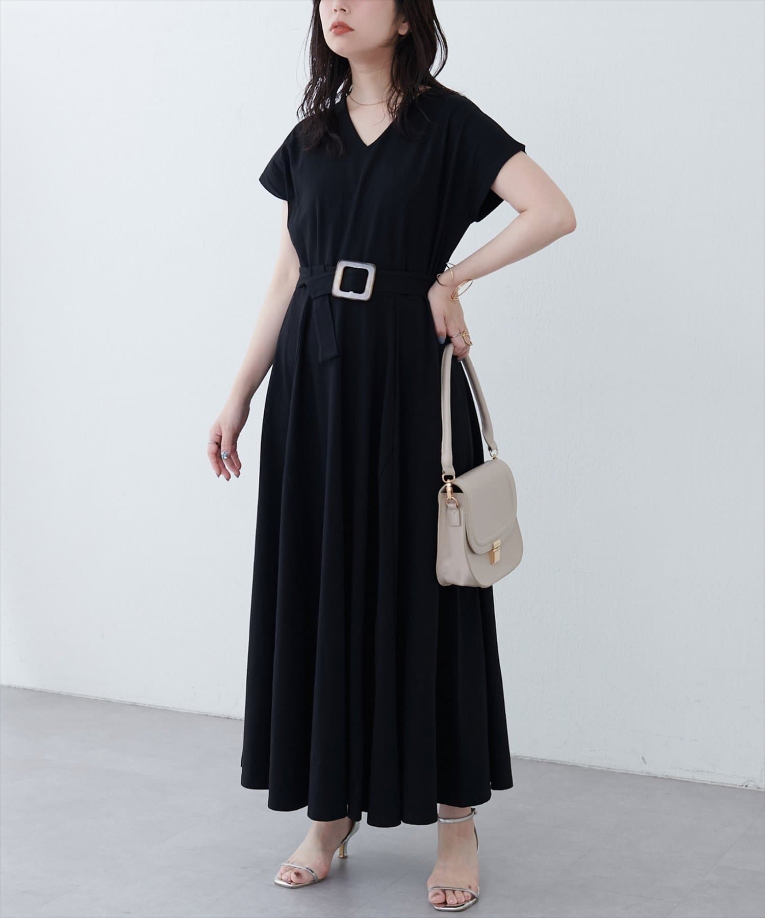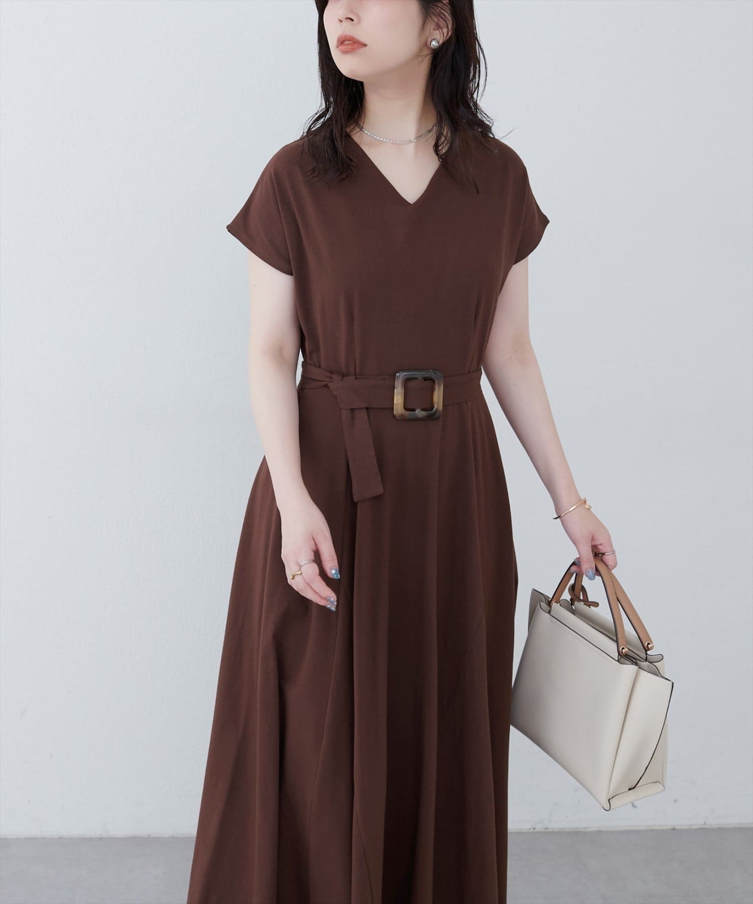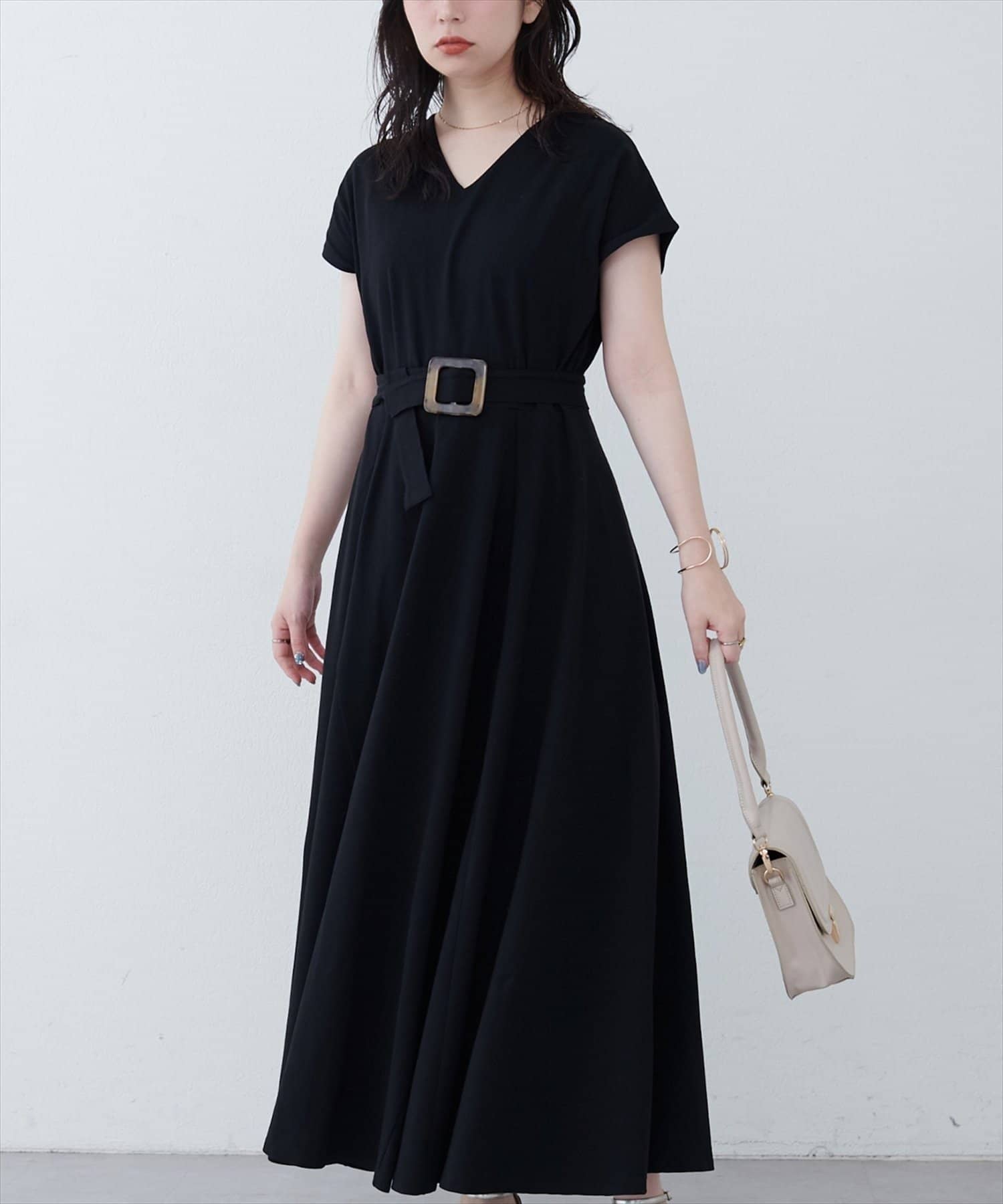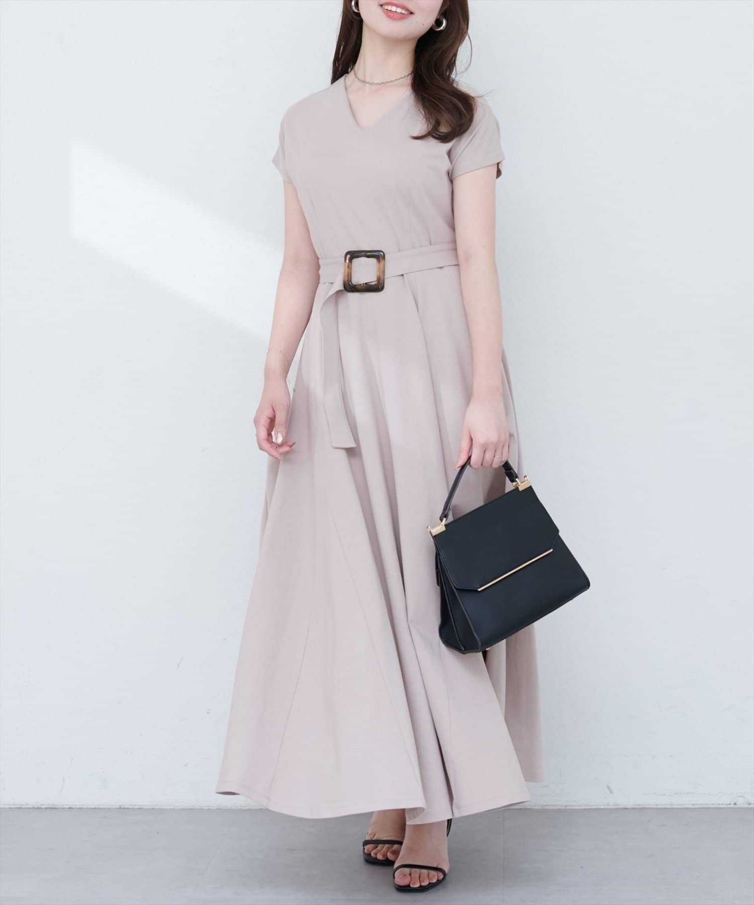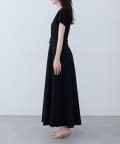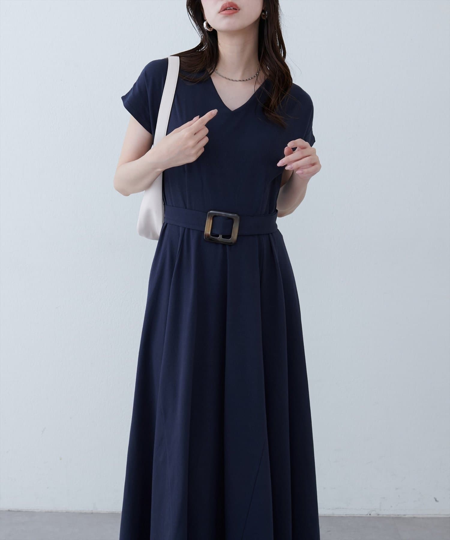 Vネックとフレアスカートの組み合わせが、女性らしい美しいシルエットを演出。