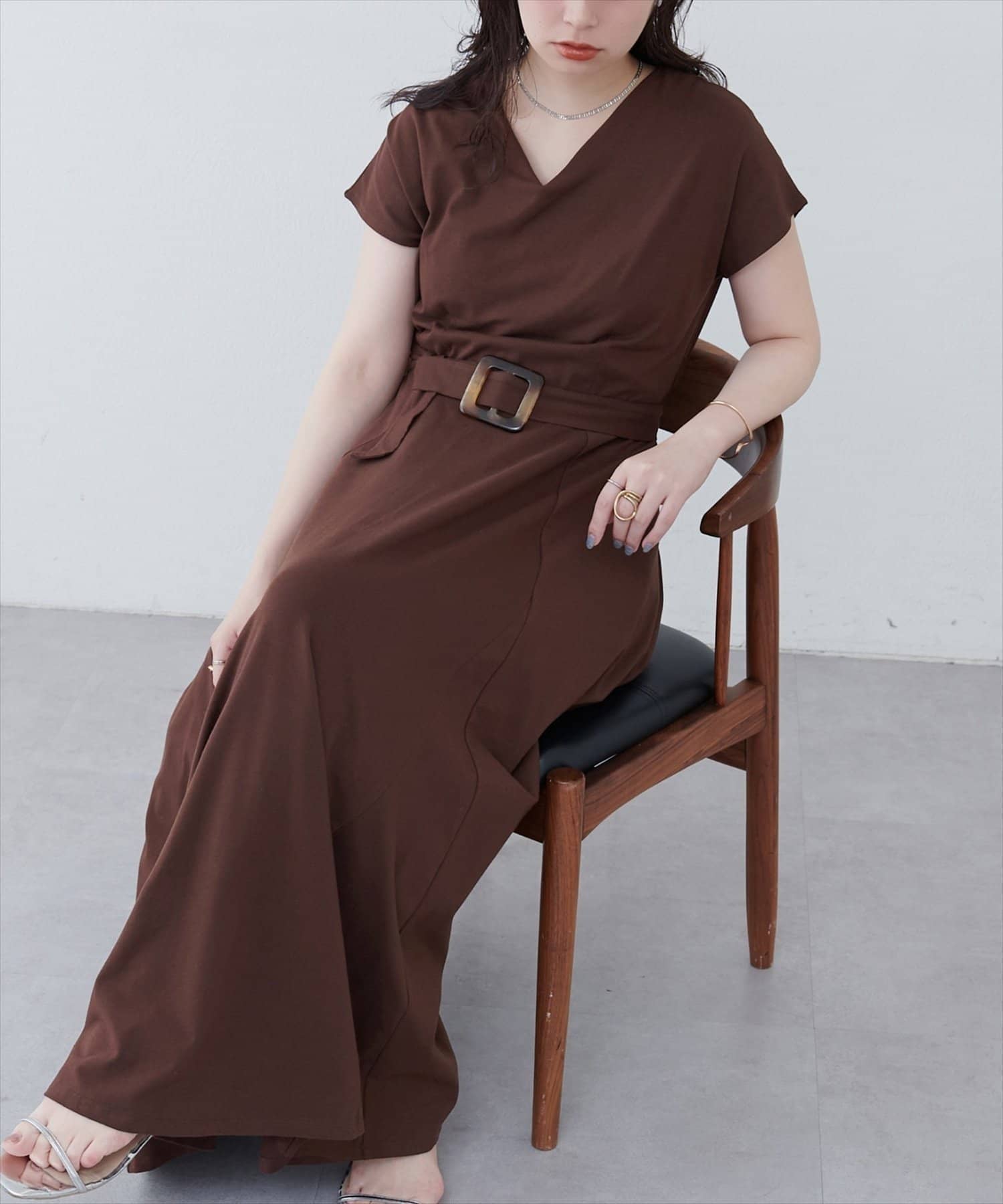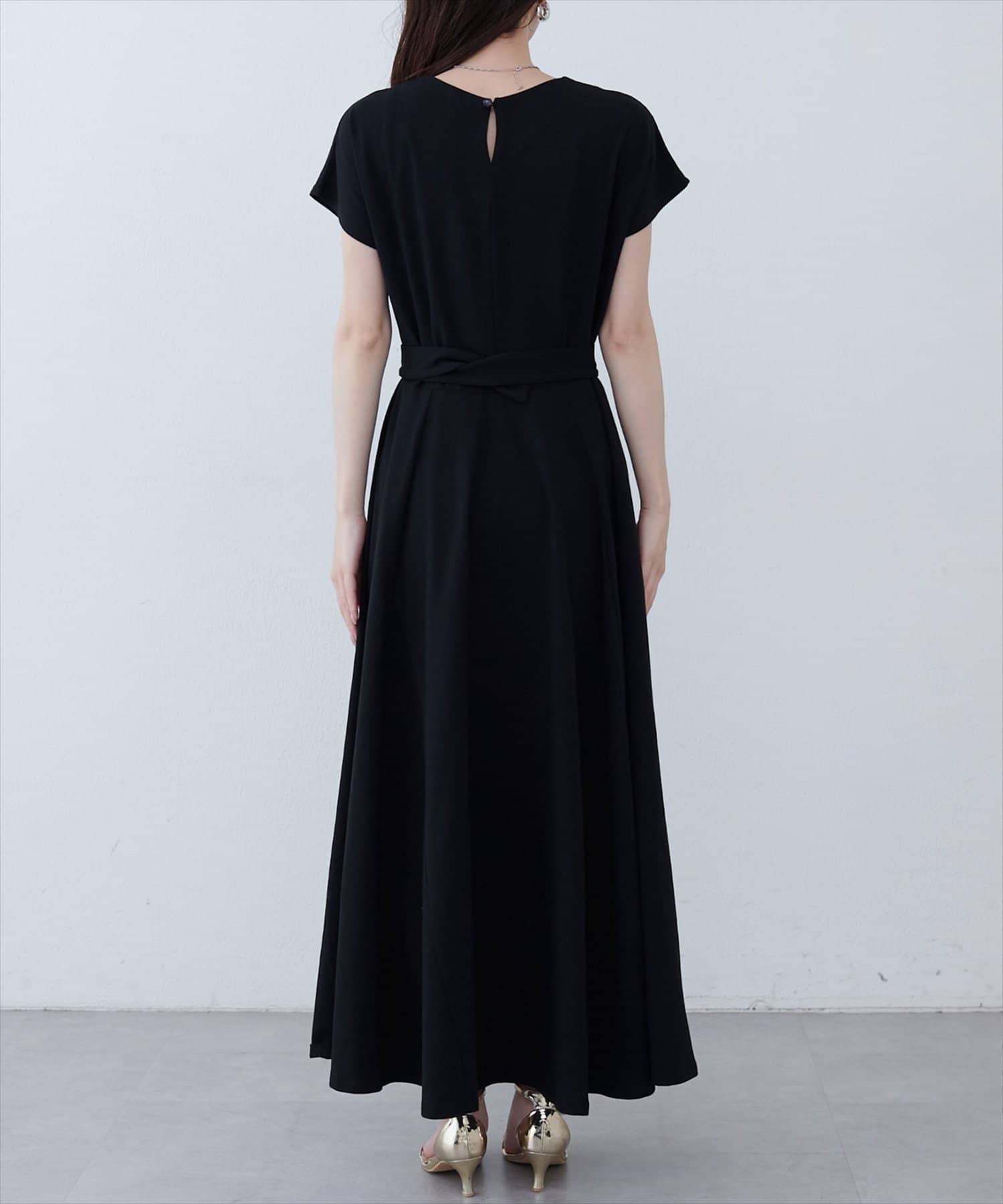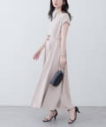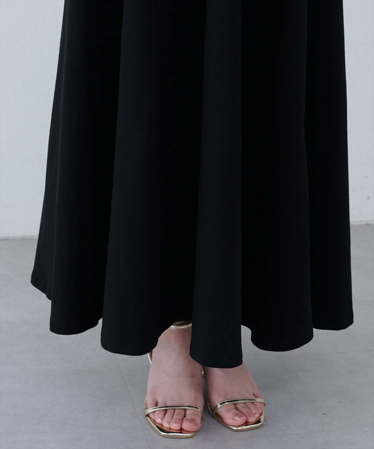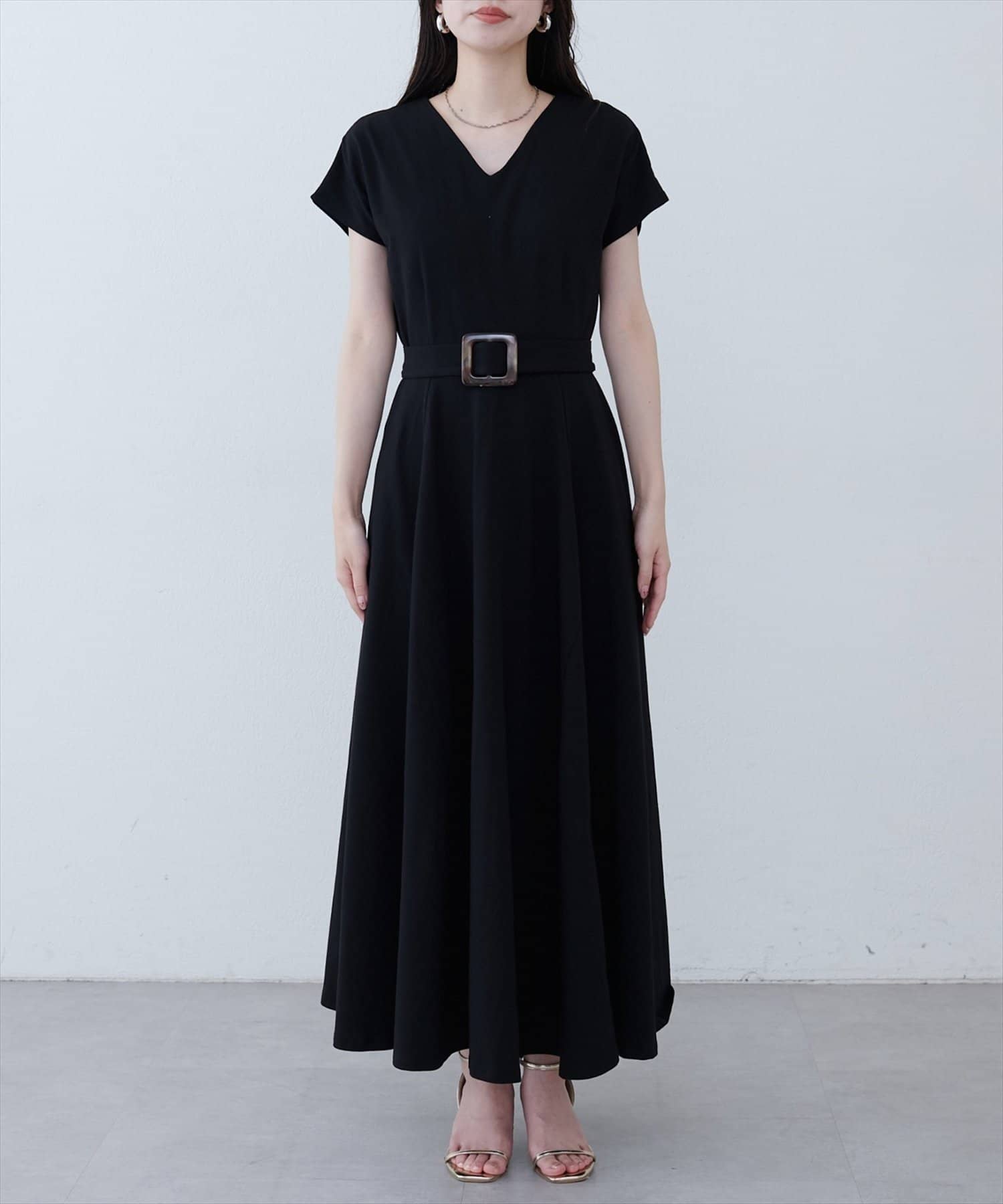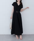 Vネックとフレアスカートの組み合わせが、女性らしい美しいシルエットを演出。