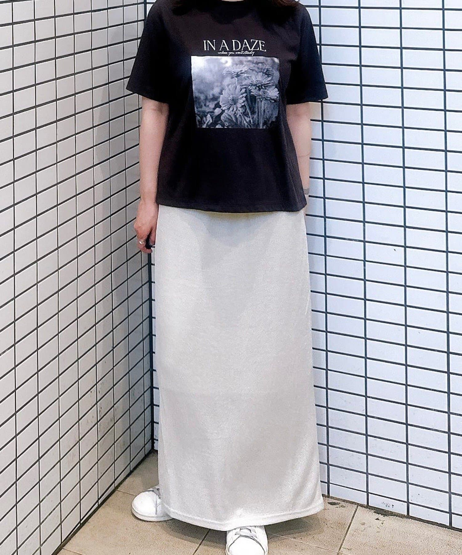 スカートのラメ感を引き立てるシンプルなTシャツ合わせ。足元はスニーカーでカジュアルダウン。
