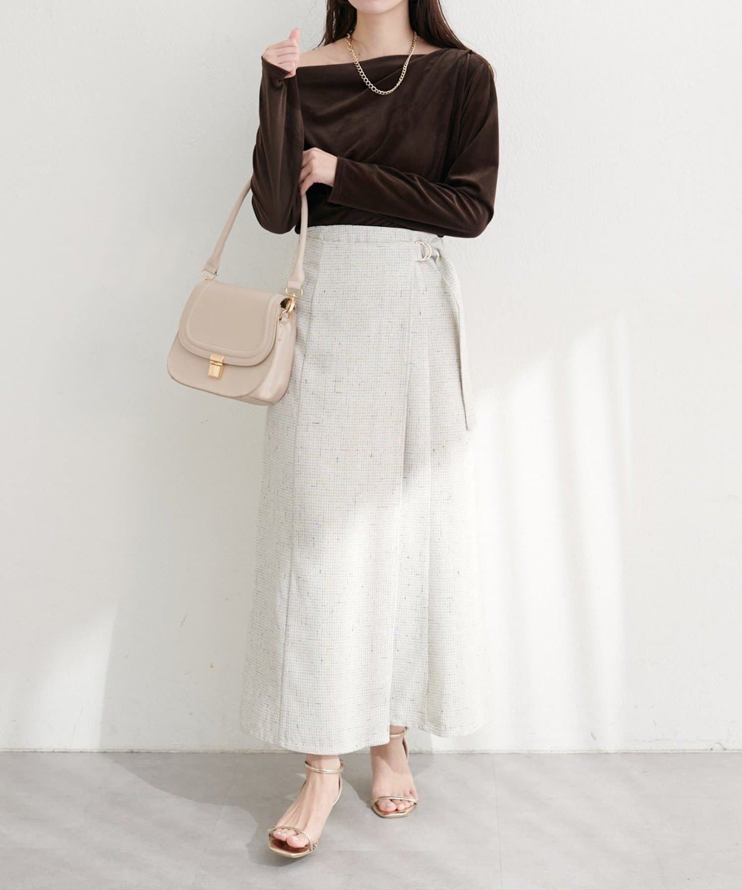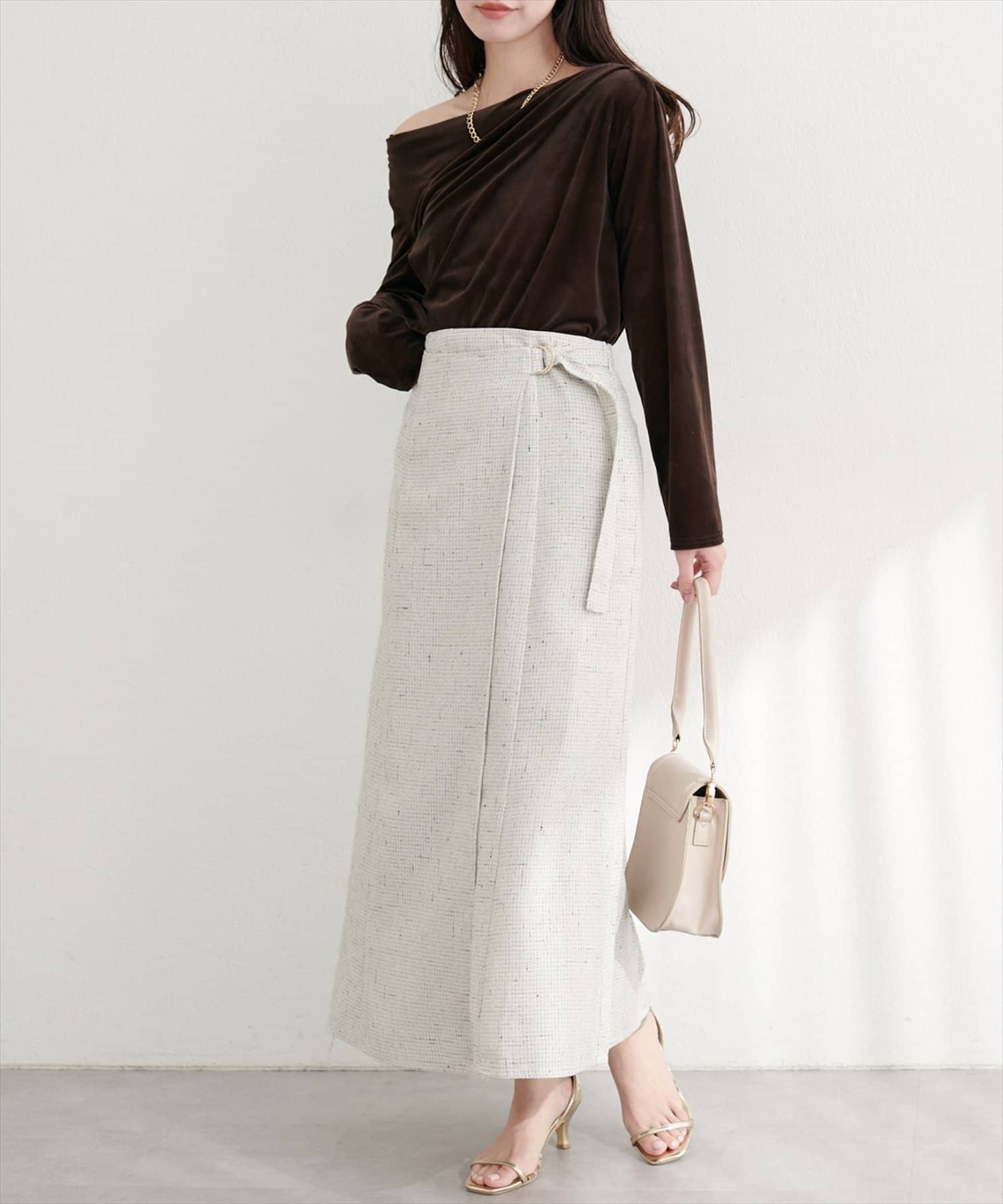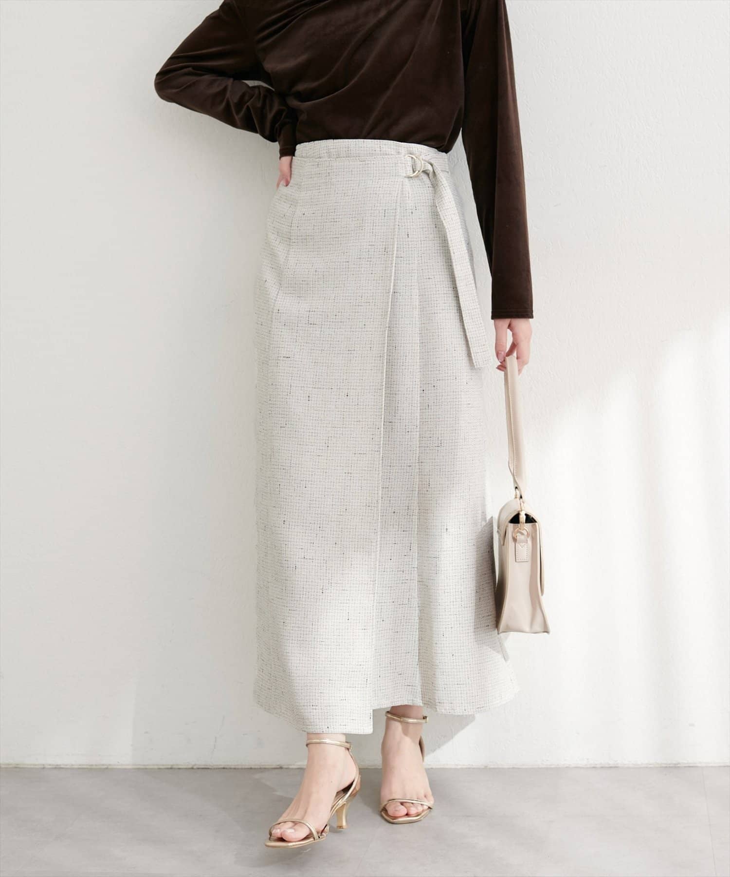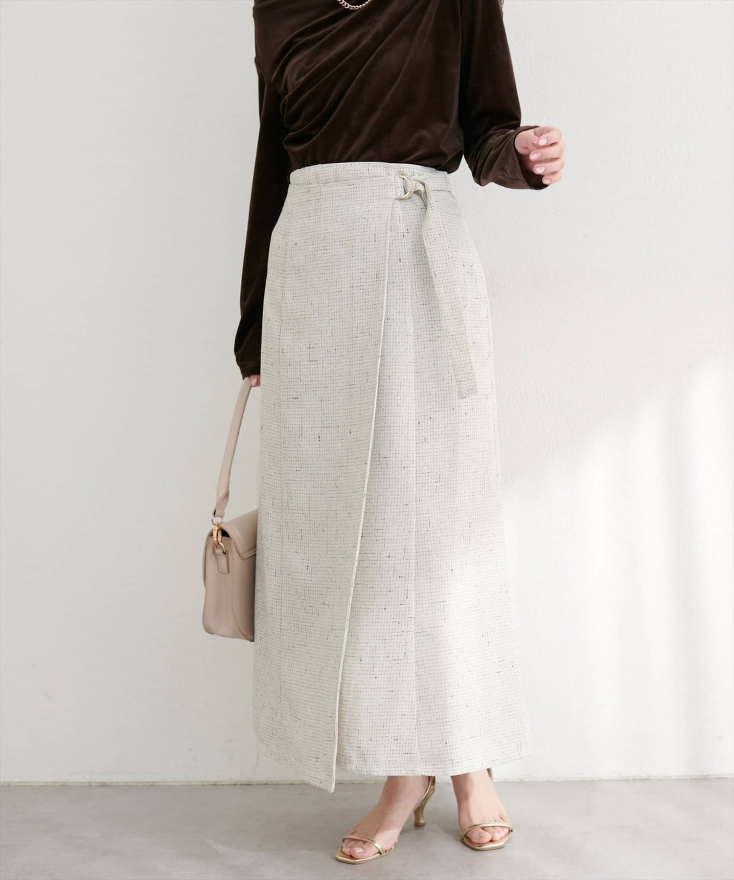 大人の女性らしさを引き出す、ラップ風ツイードスカート。