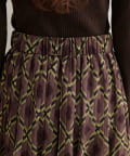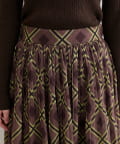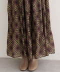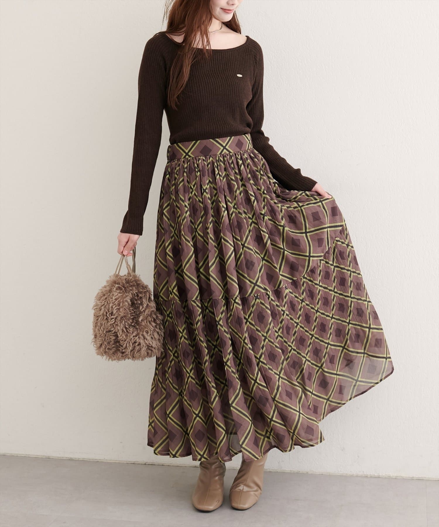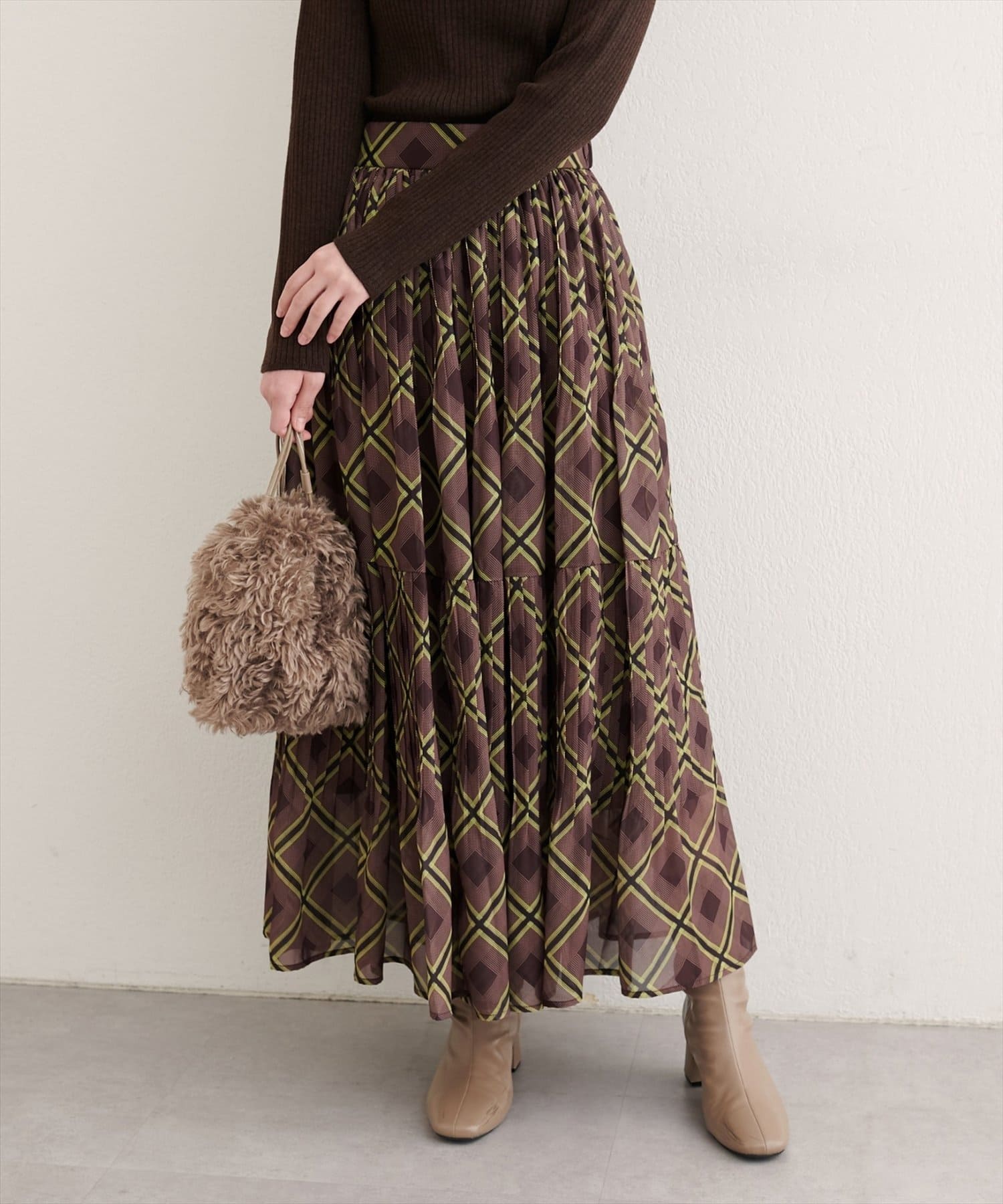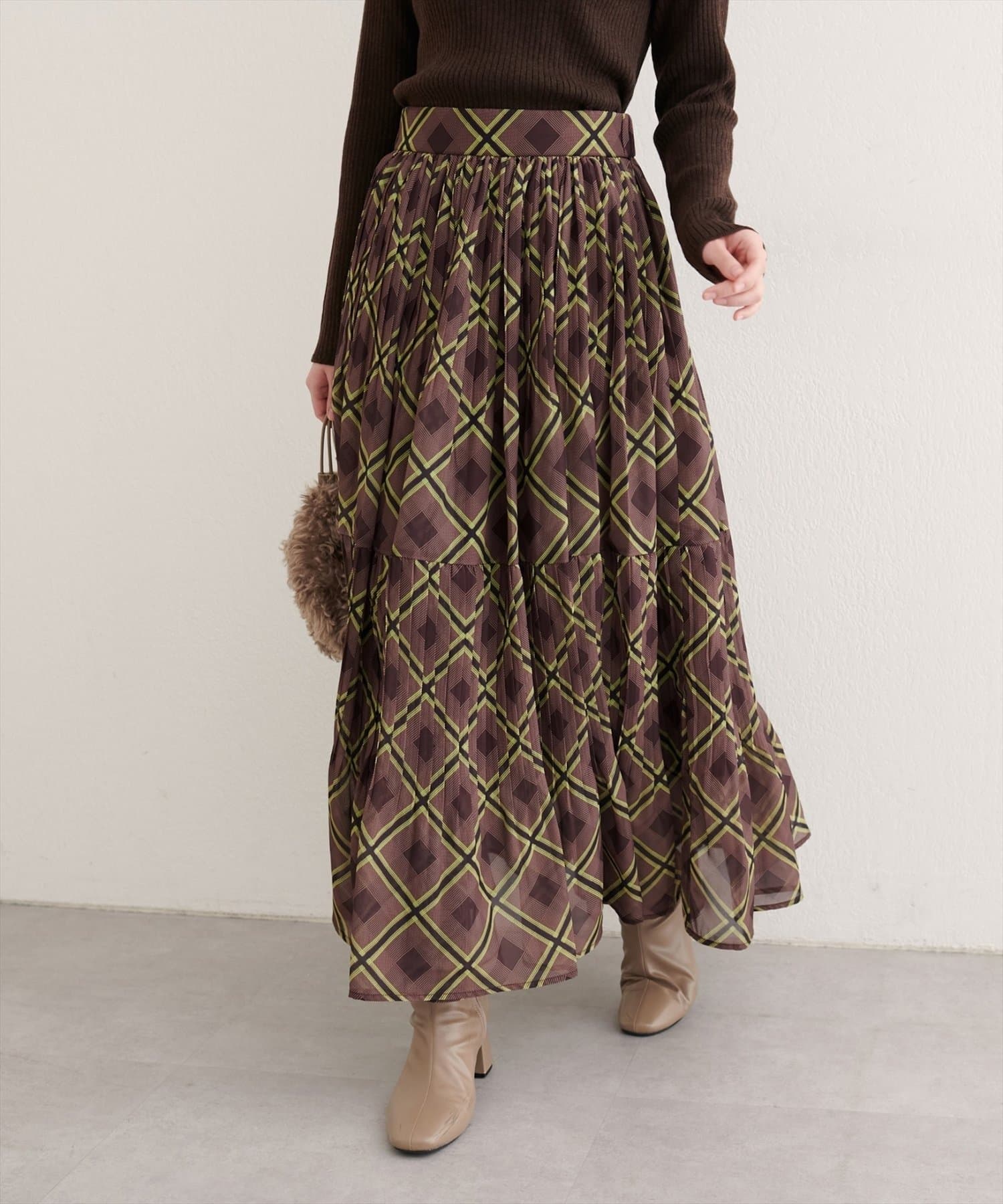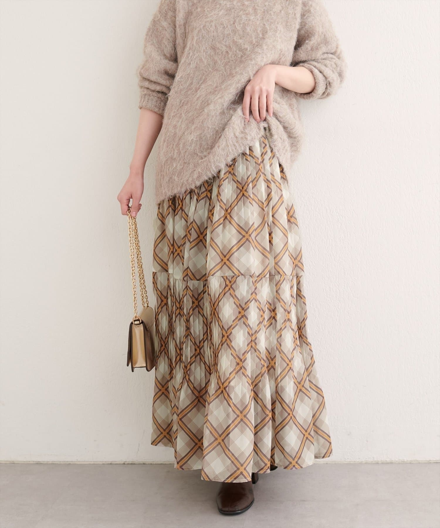 柄×プリーツが生み出す、奥行きのある表情。歩くたびにふわりと揺れる裾が、エレガントな雰囲気を演出します。