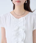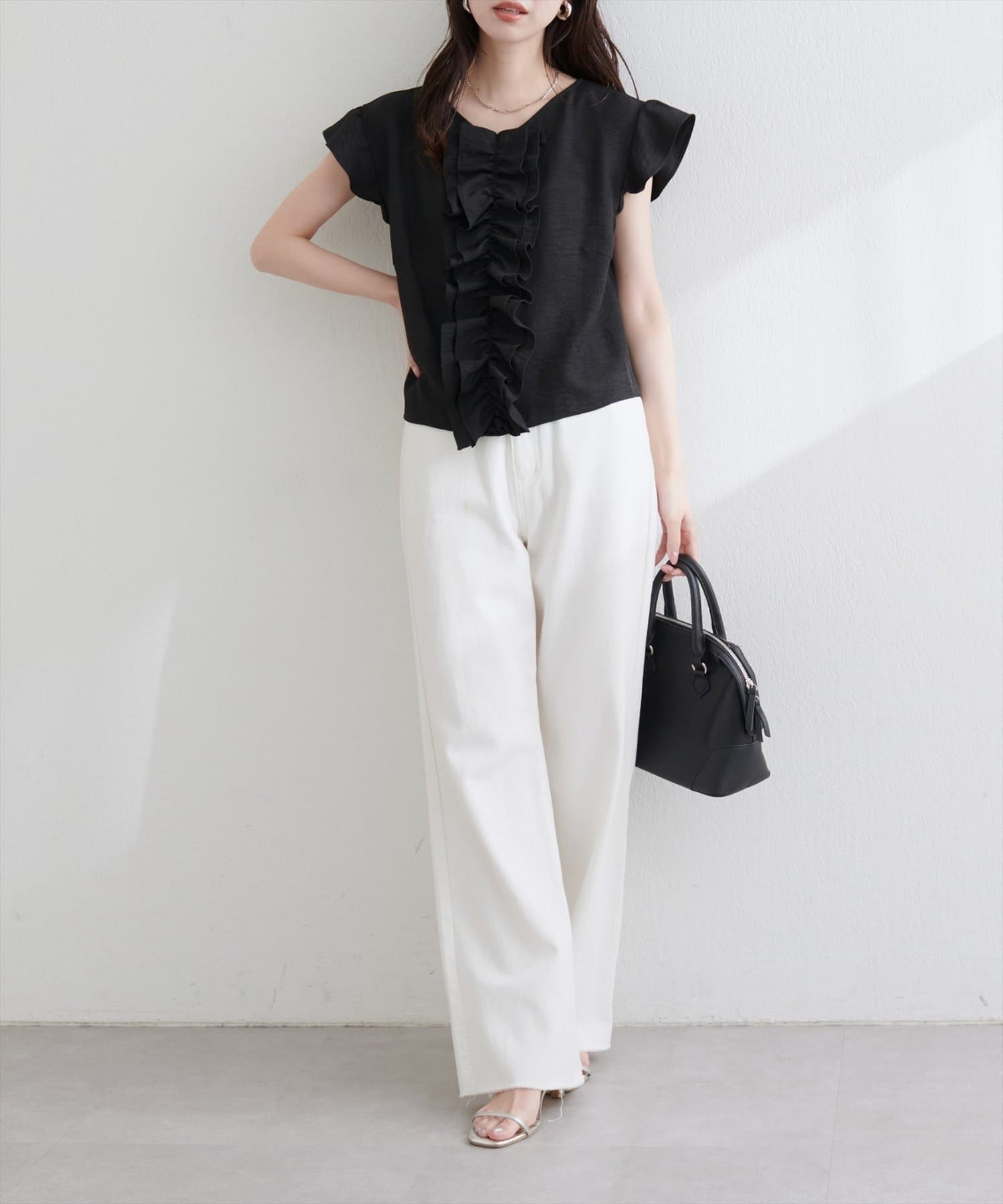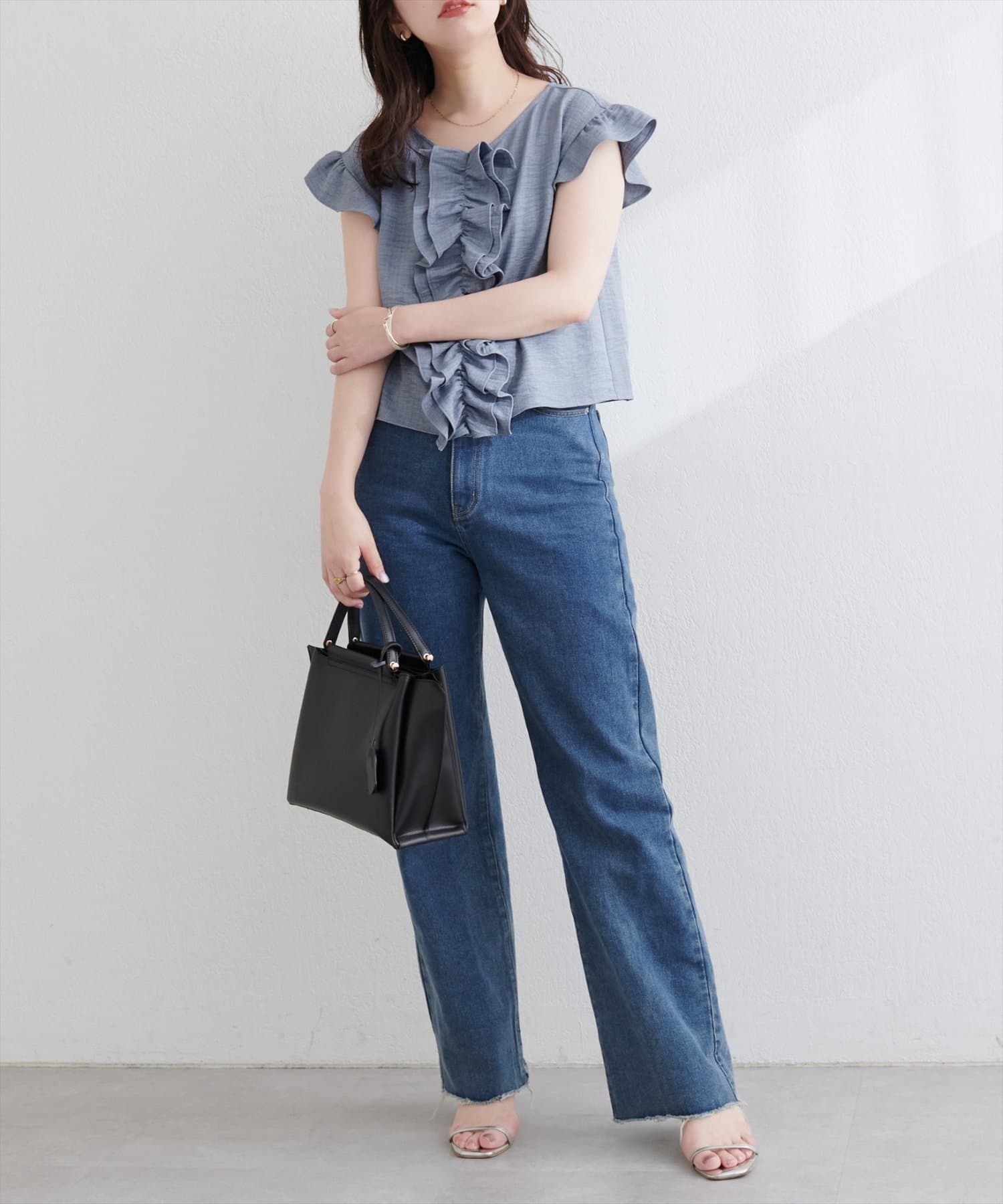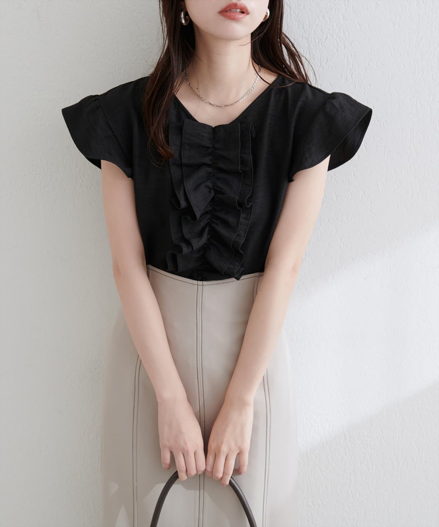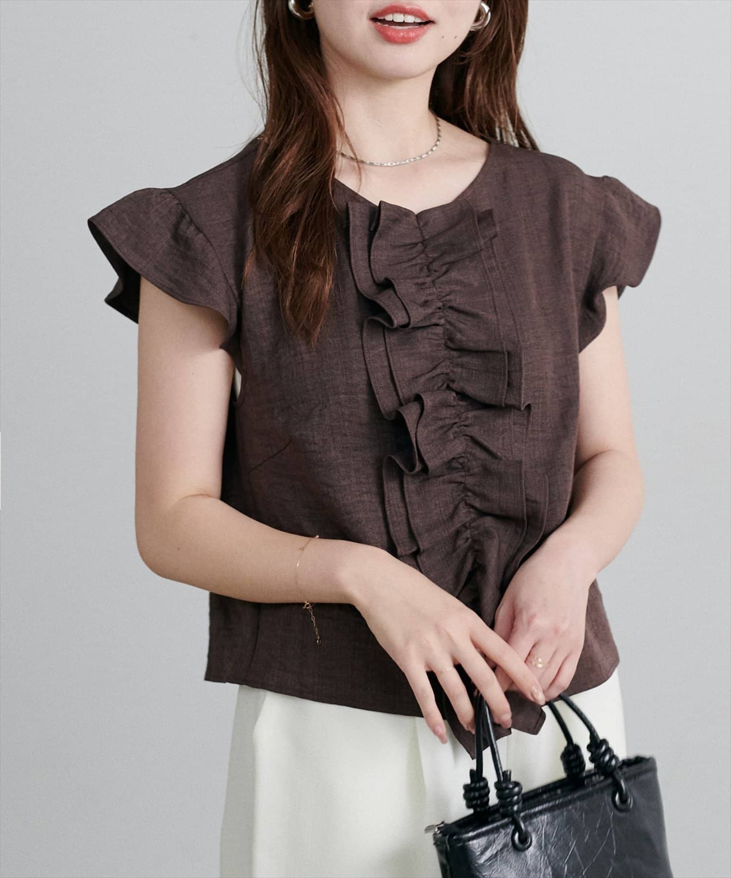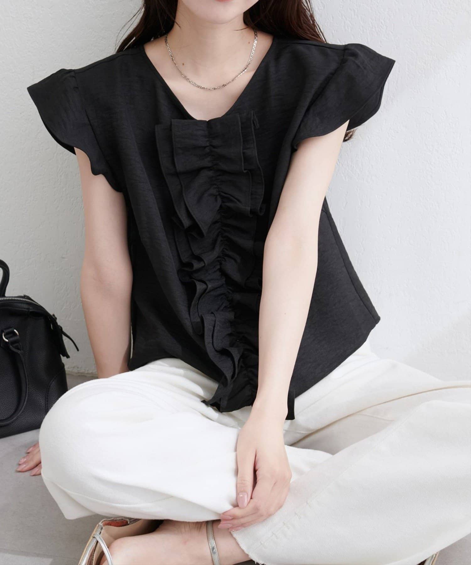 胸元を飾る繊細なフリルは、甘すぎない上品なアクセントとなり、周囲の視線を惹きつけます。
