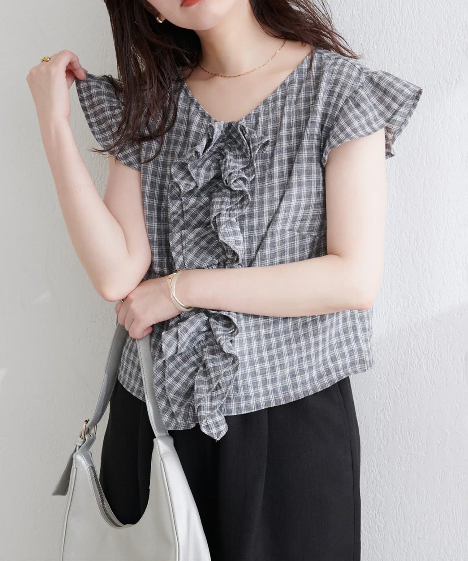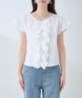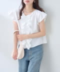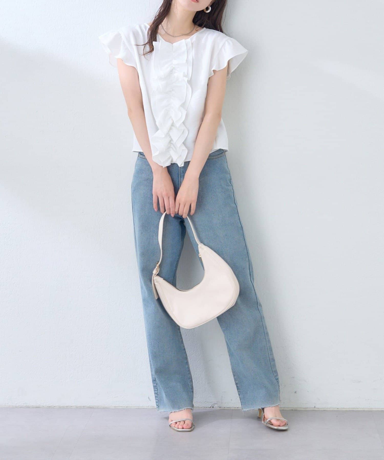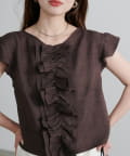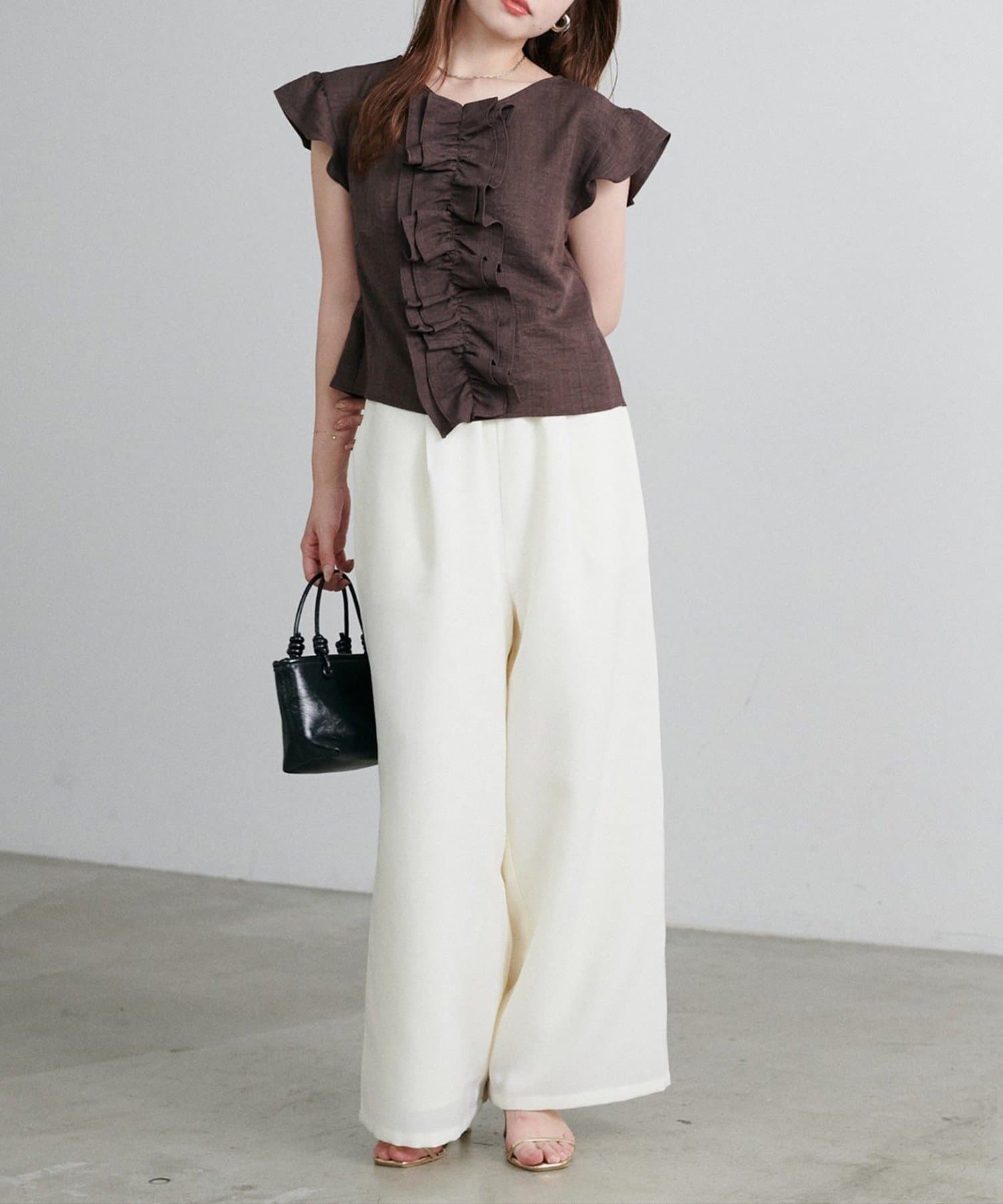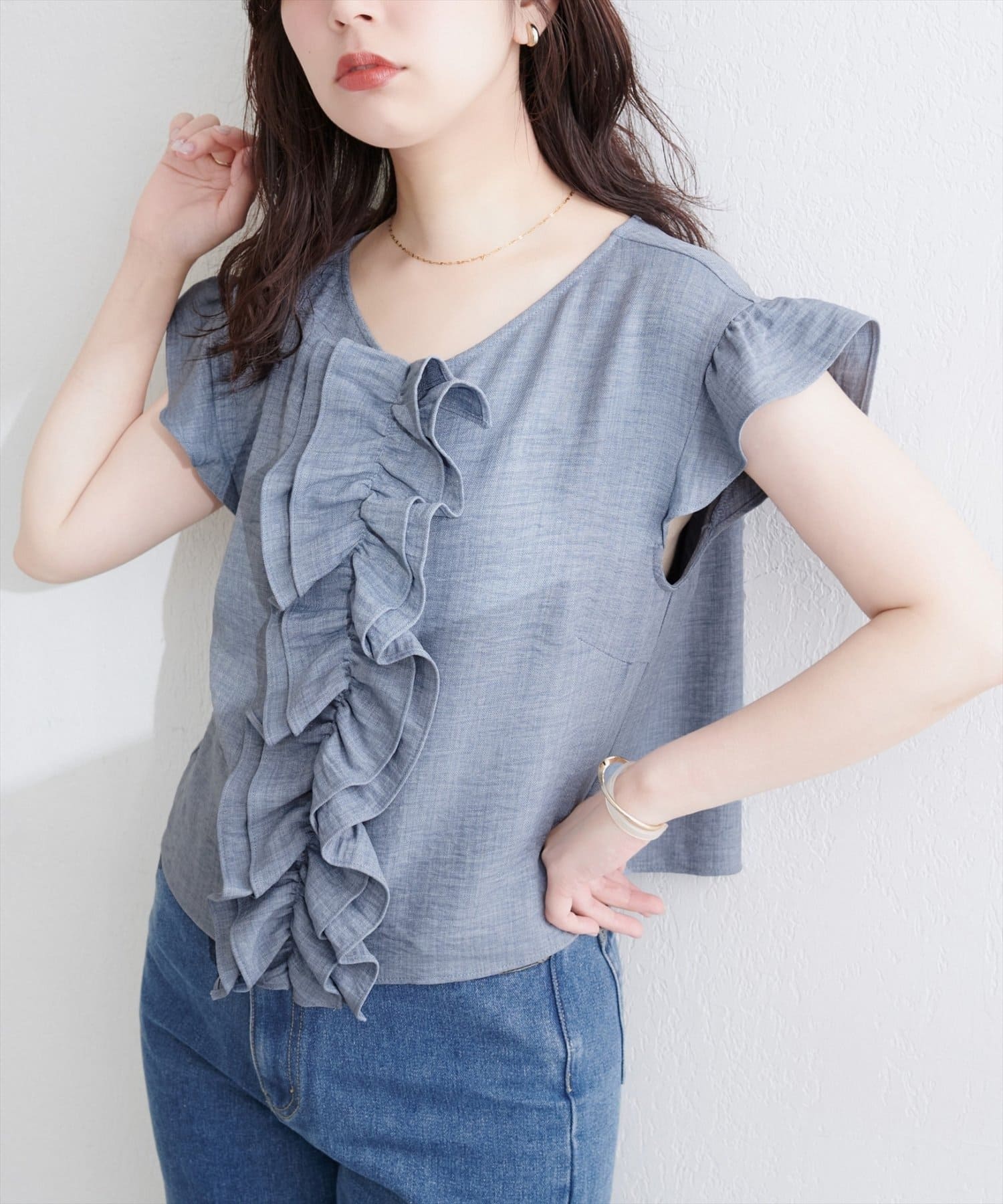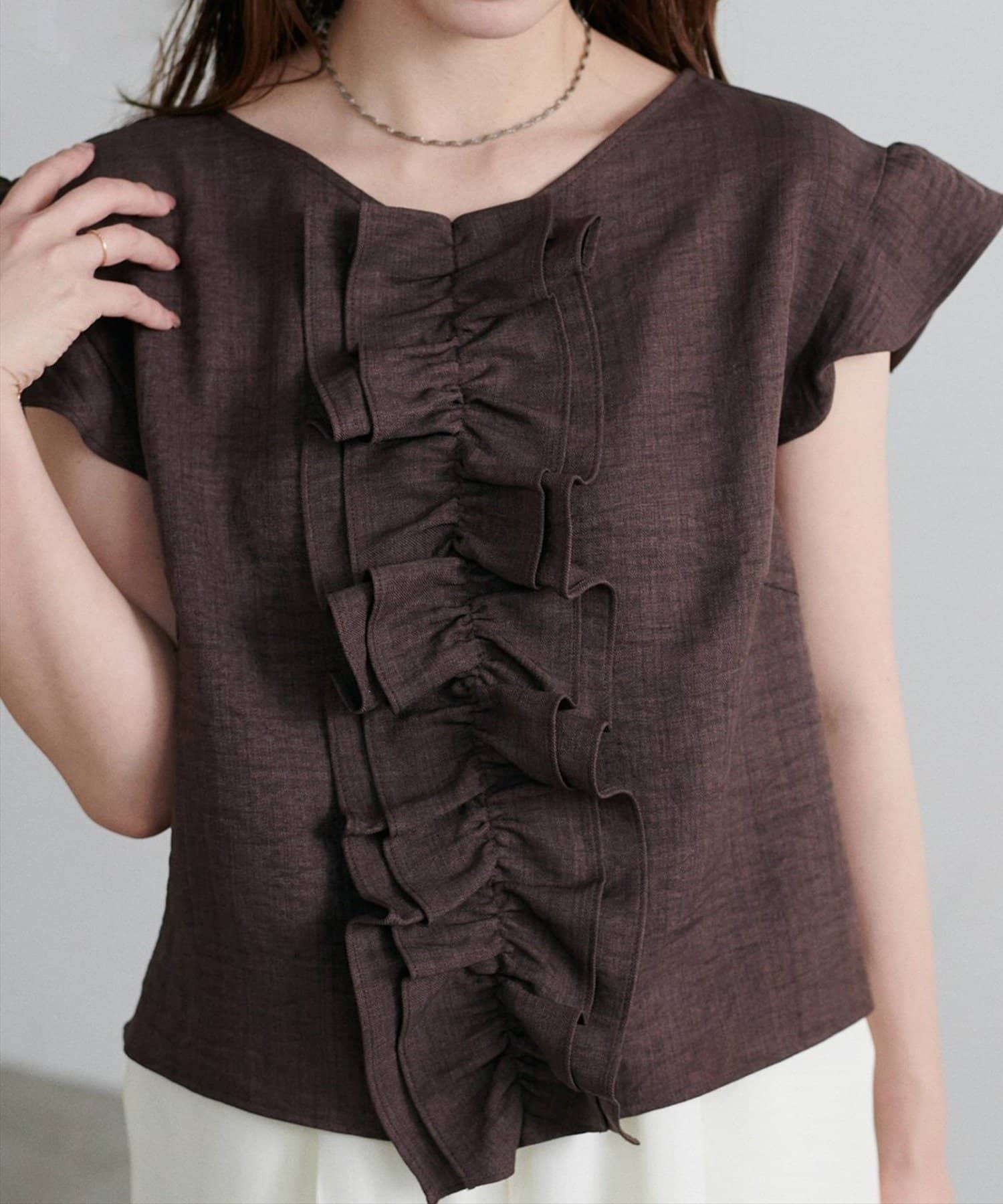 胸元を飾る繊細なフリルは、甘すぎない上品なアクセントとなり、周囲の視線を惹きつけます。