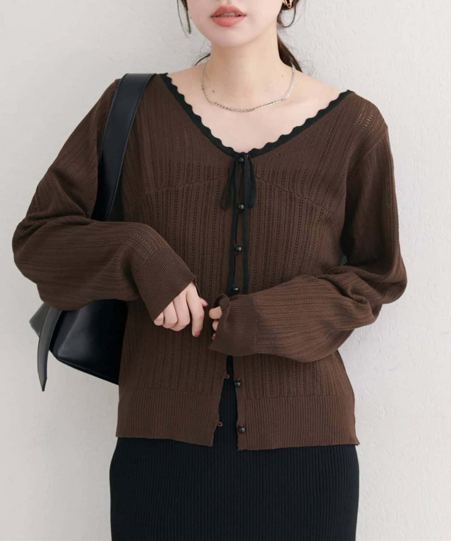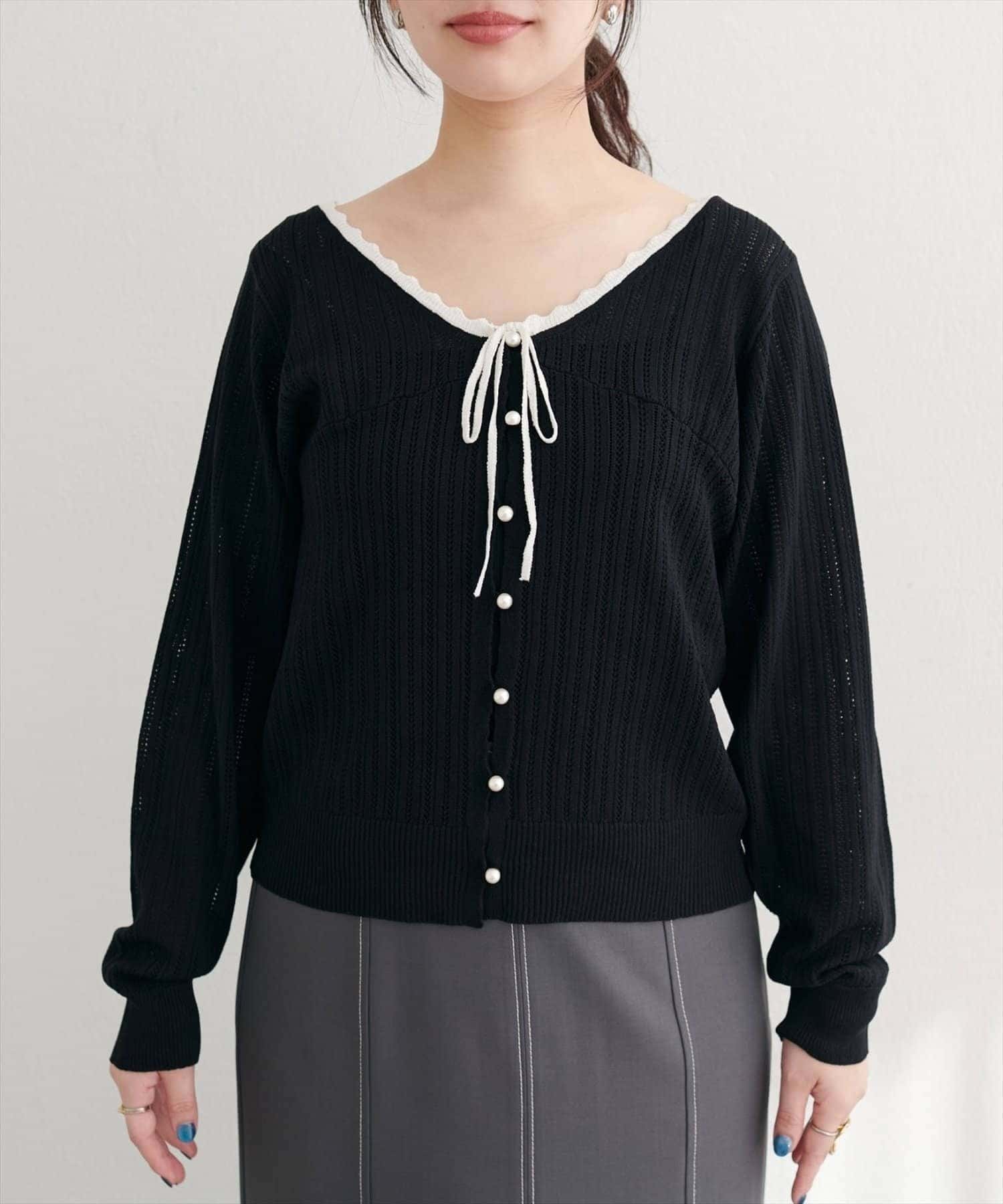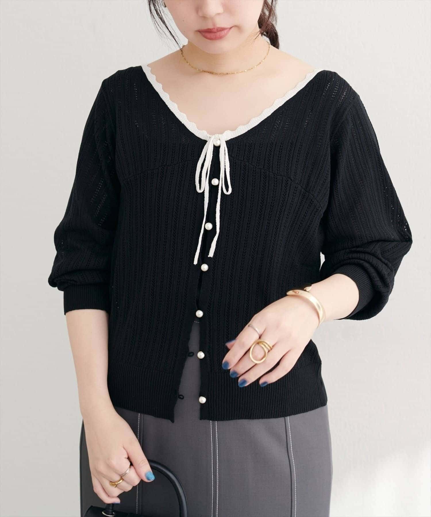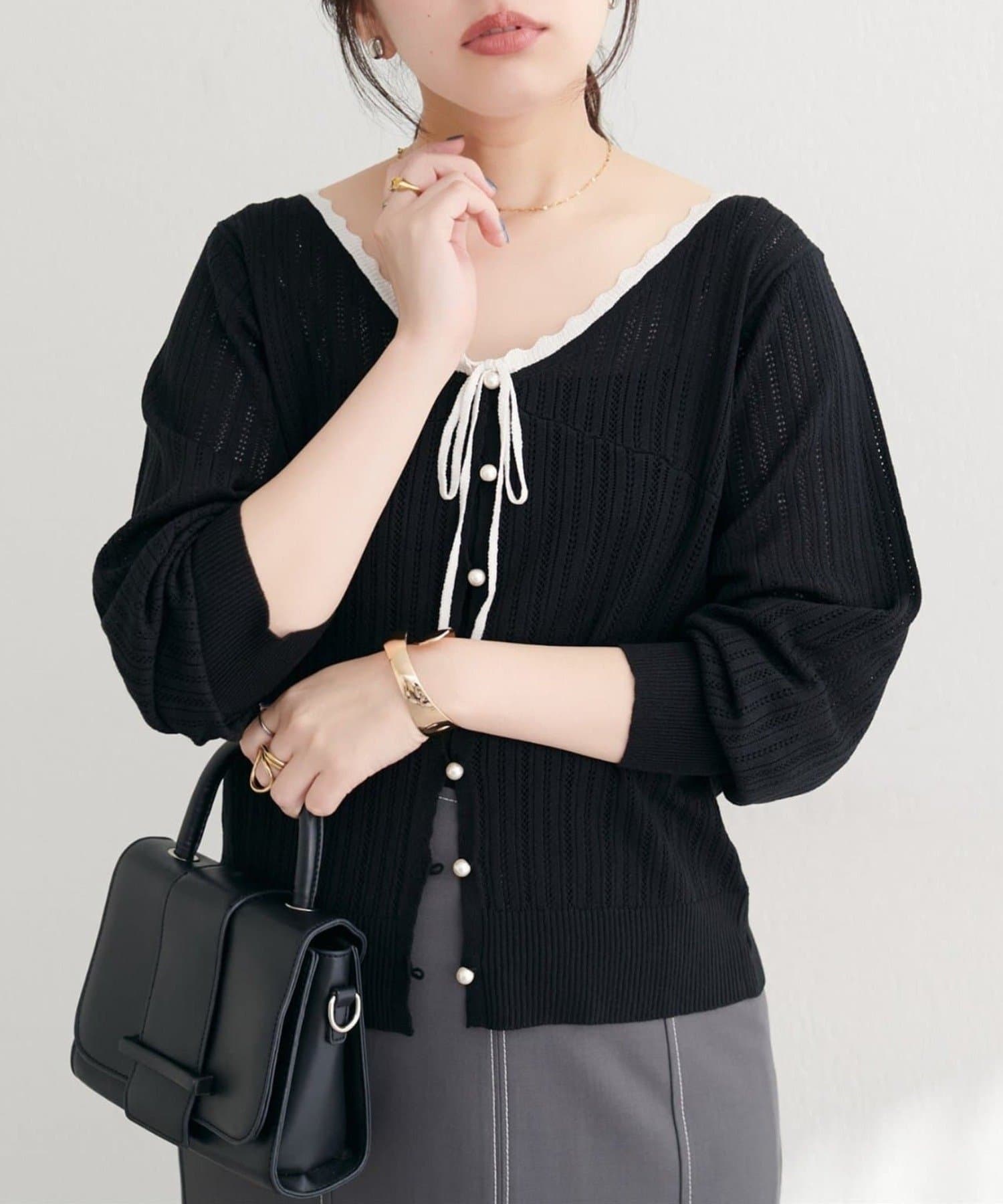 胸元のリボンとレーストリムが、大人の可愛らしさを引き立てるカーディガン。