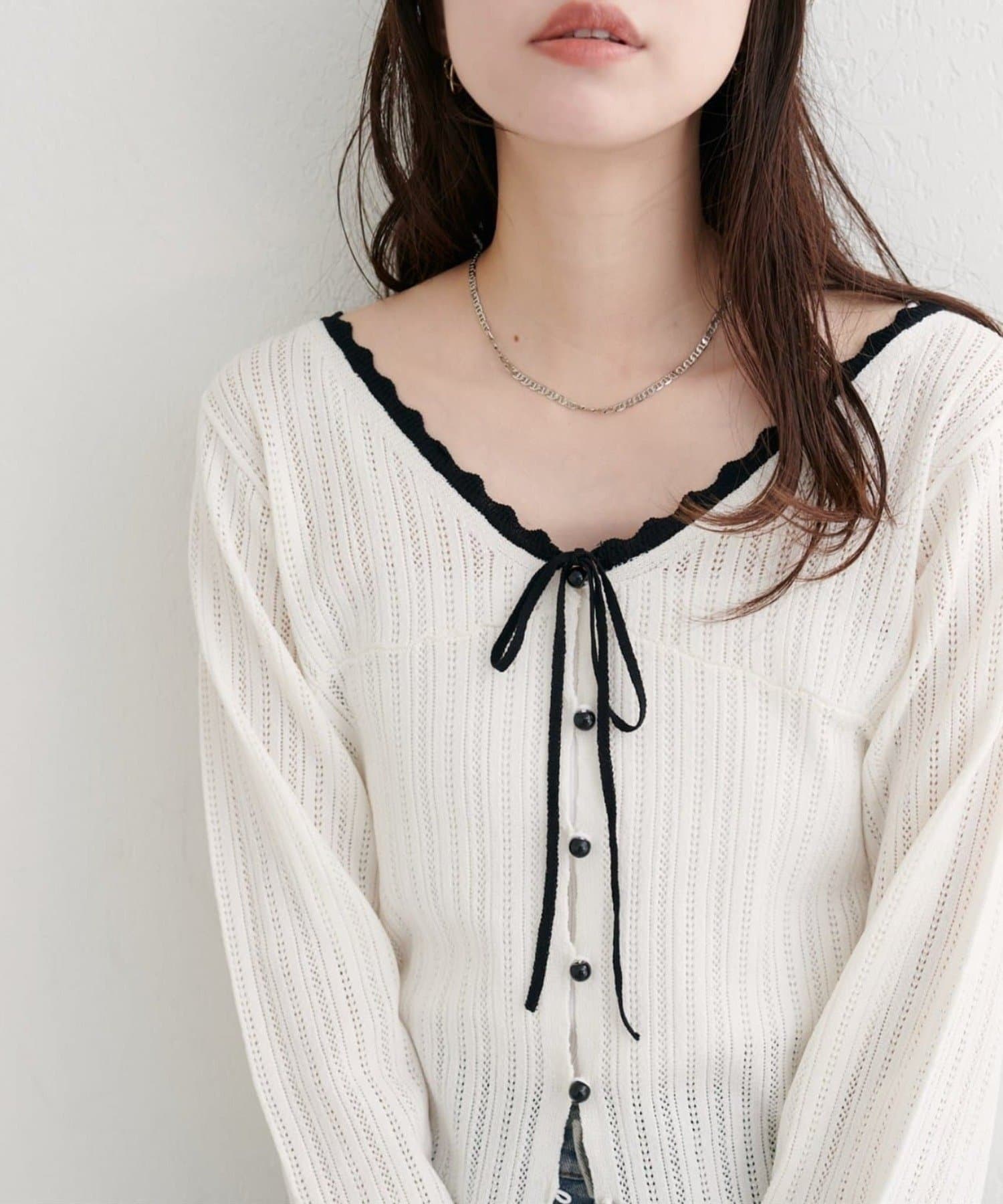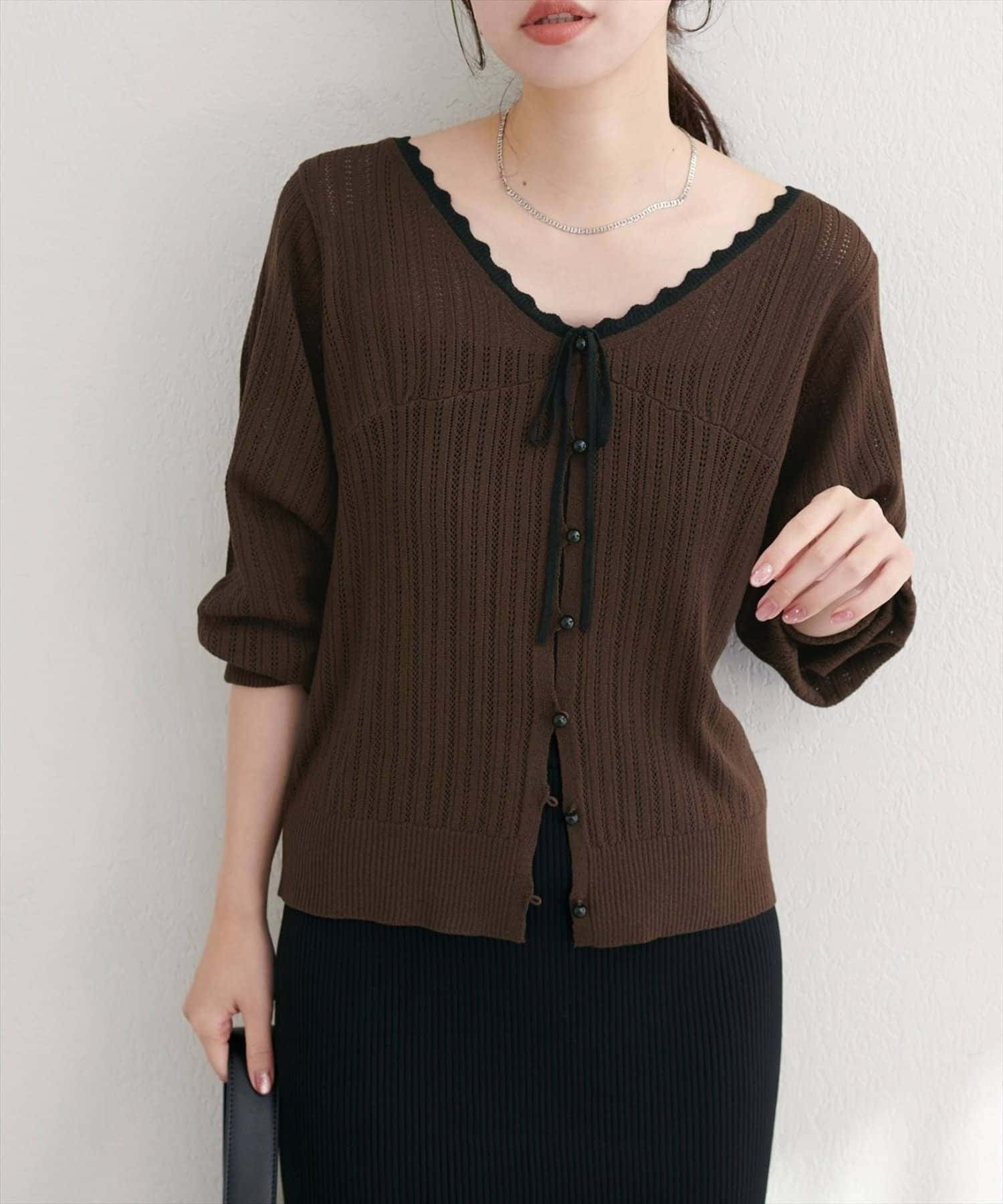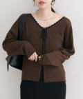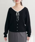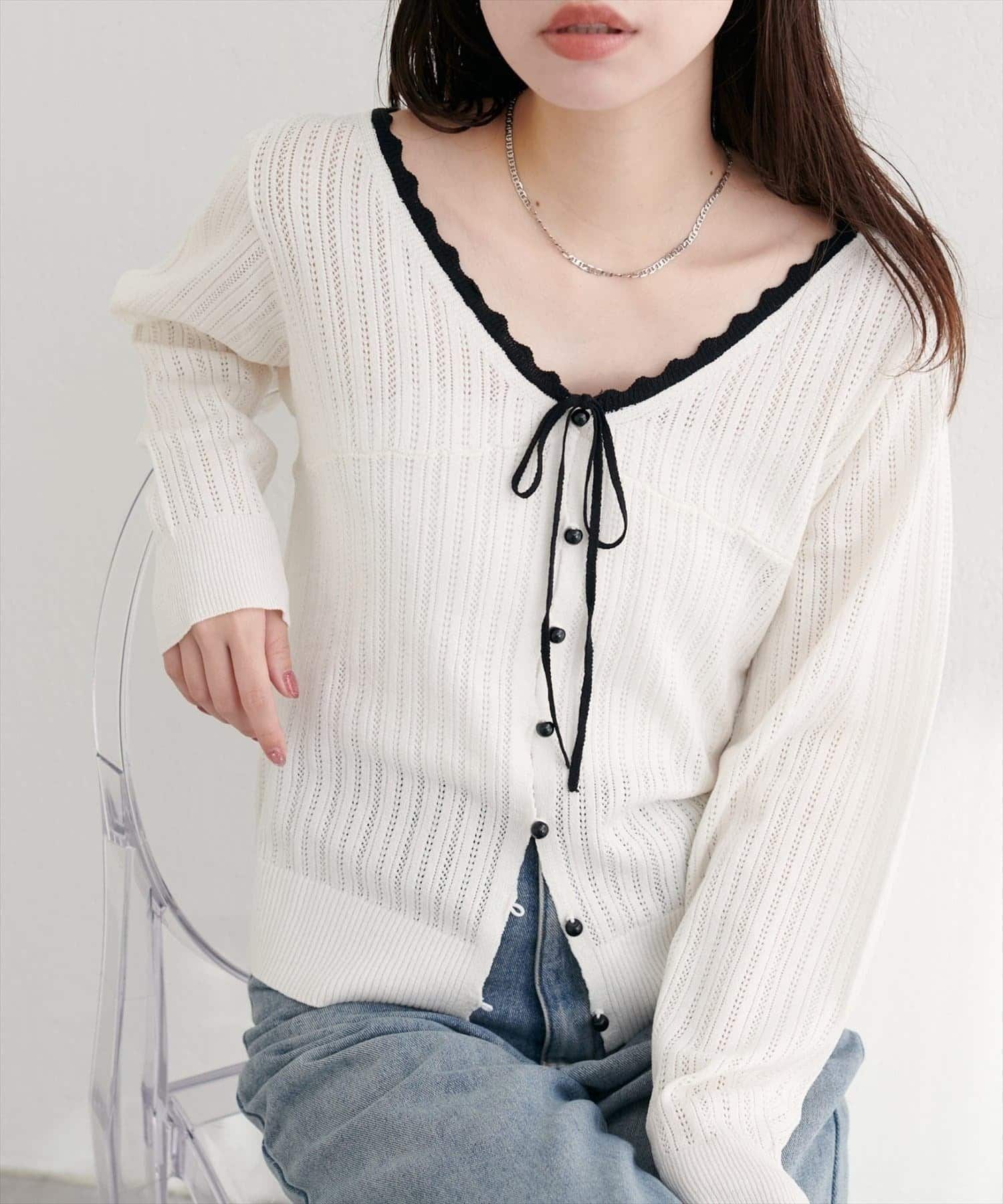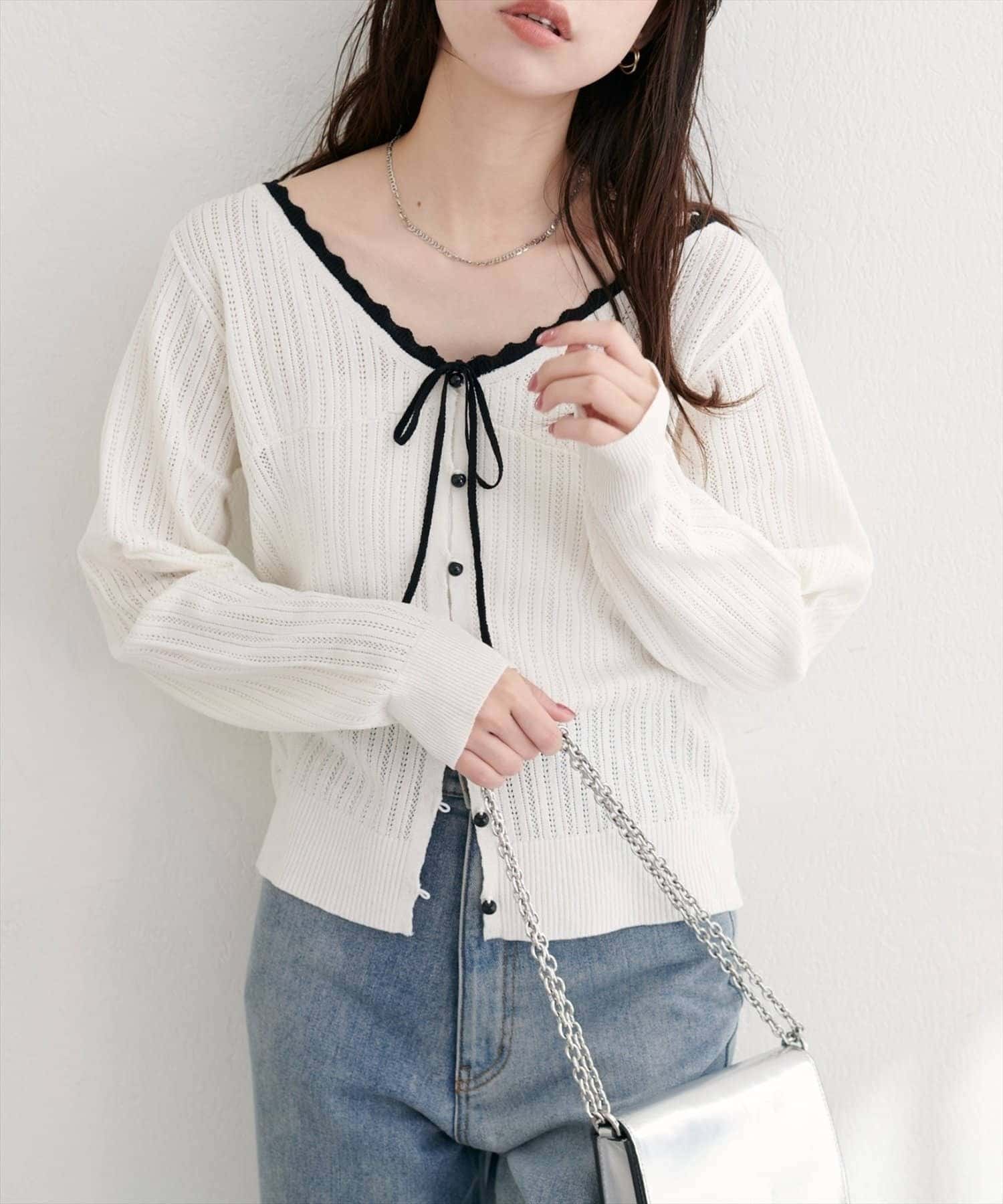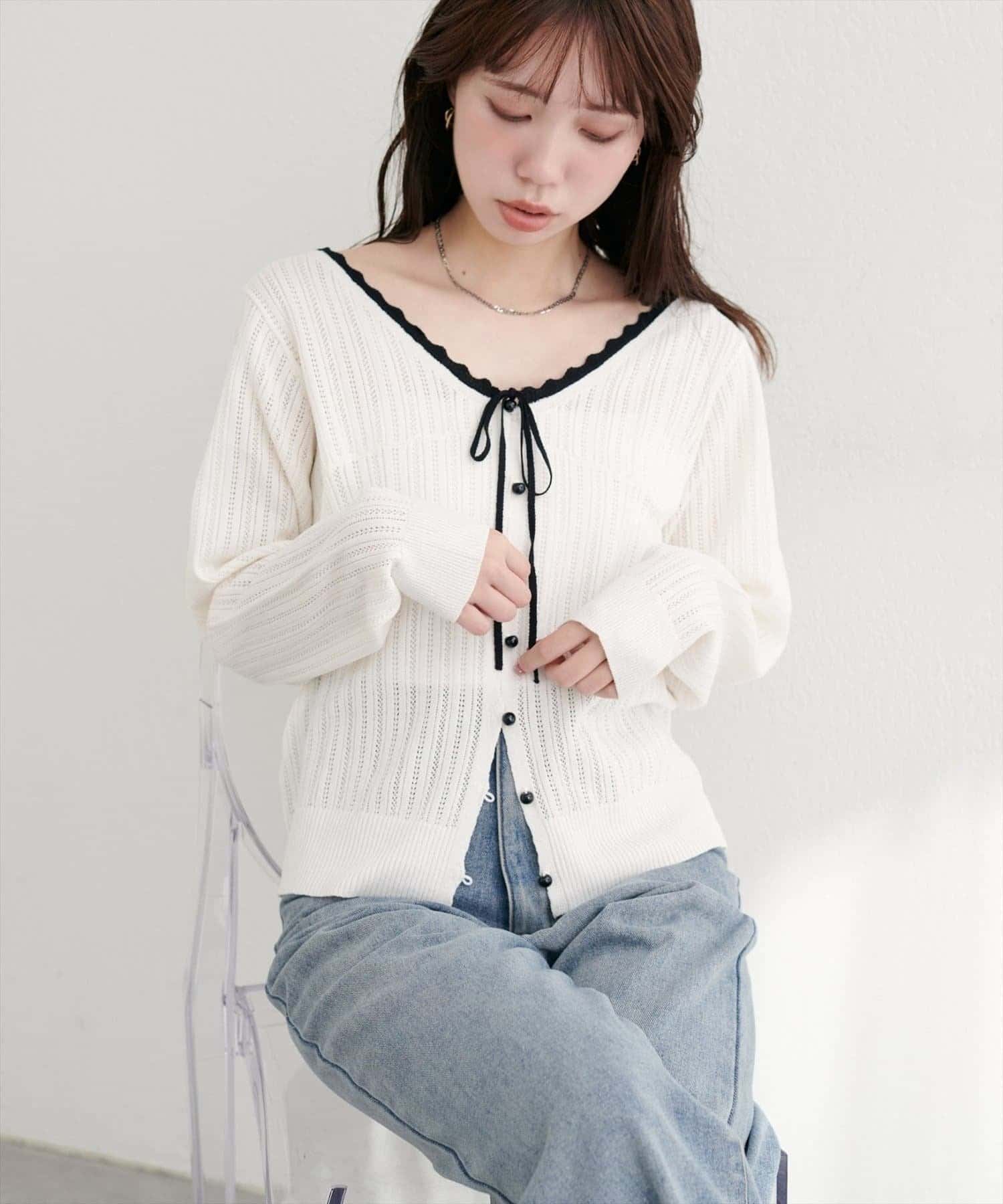 胸元のリボンとレーストリムが、大人の可愛らしさを引き立てるカーディガン。