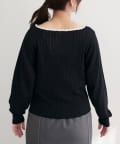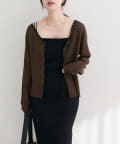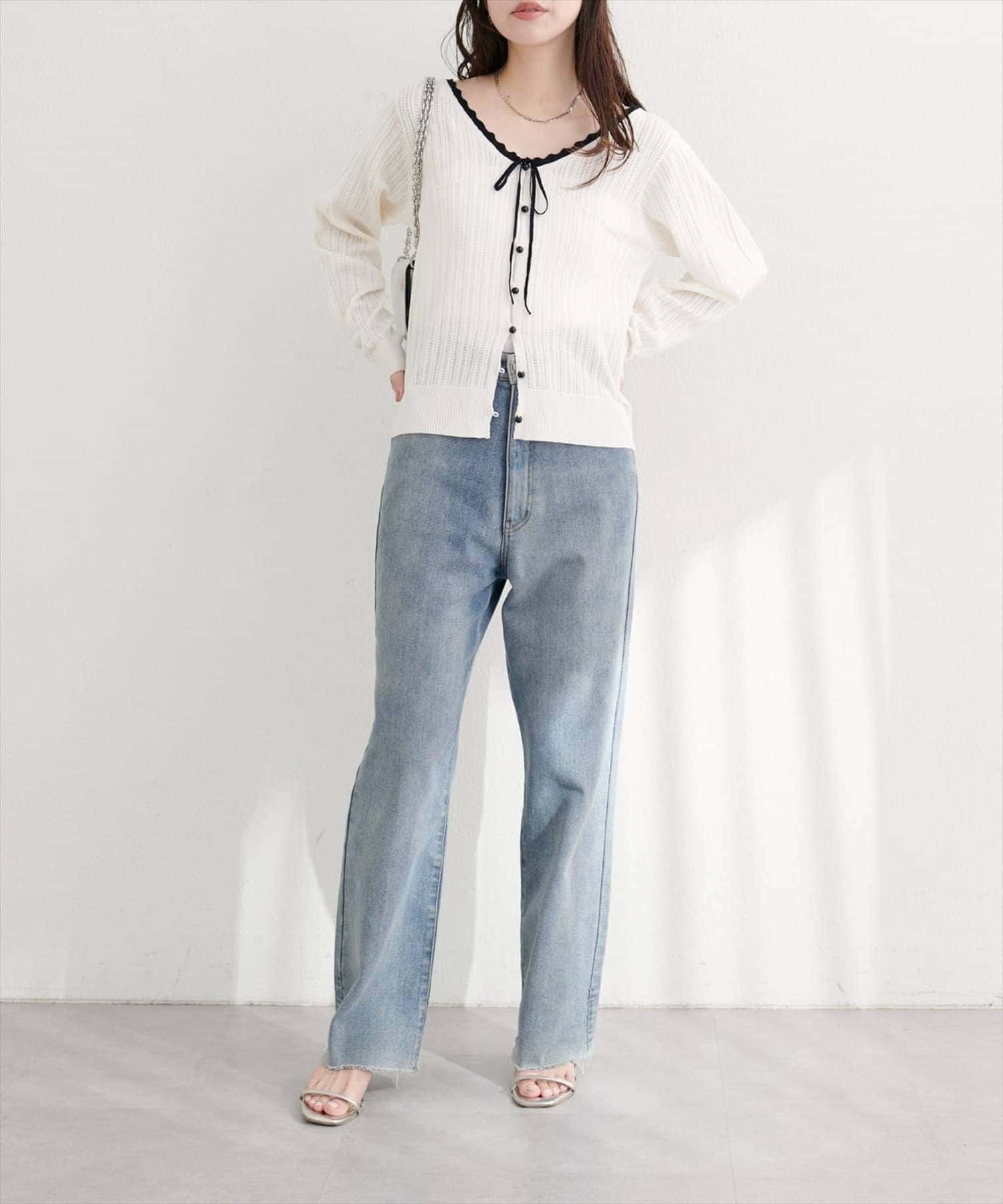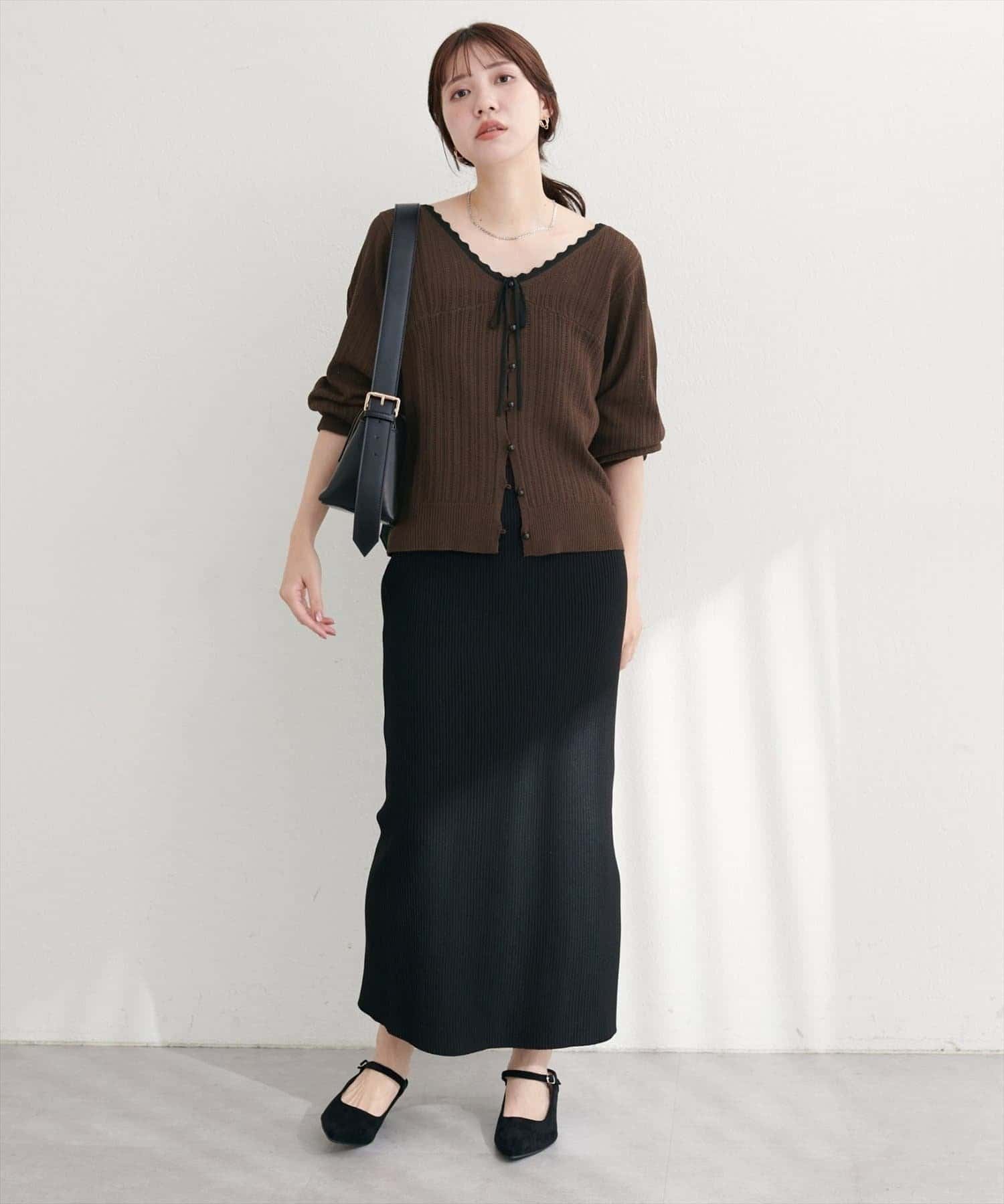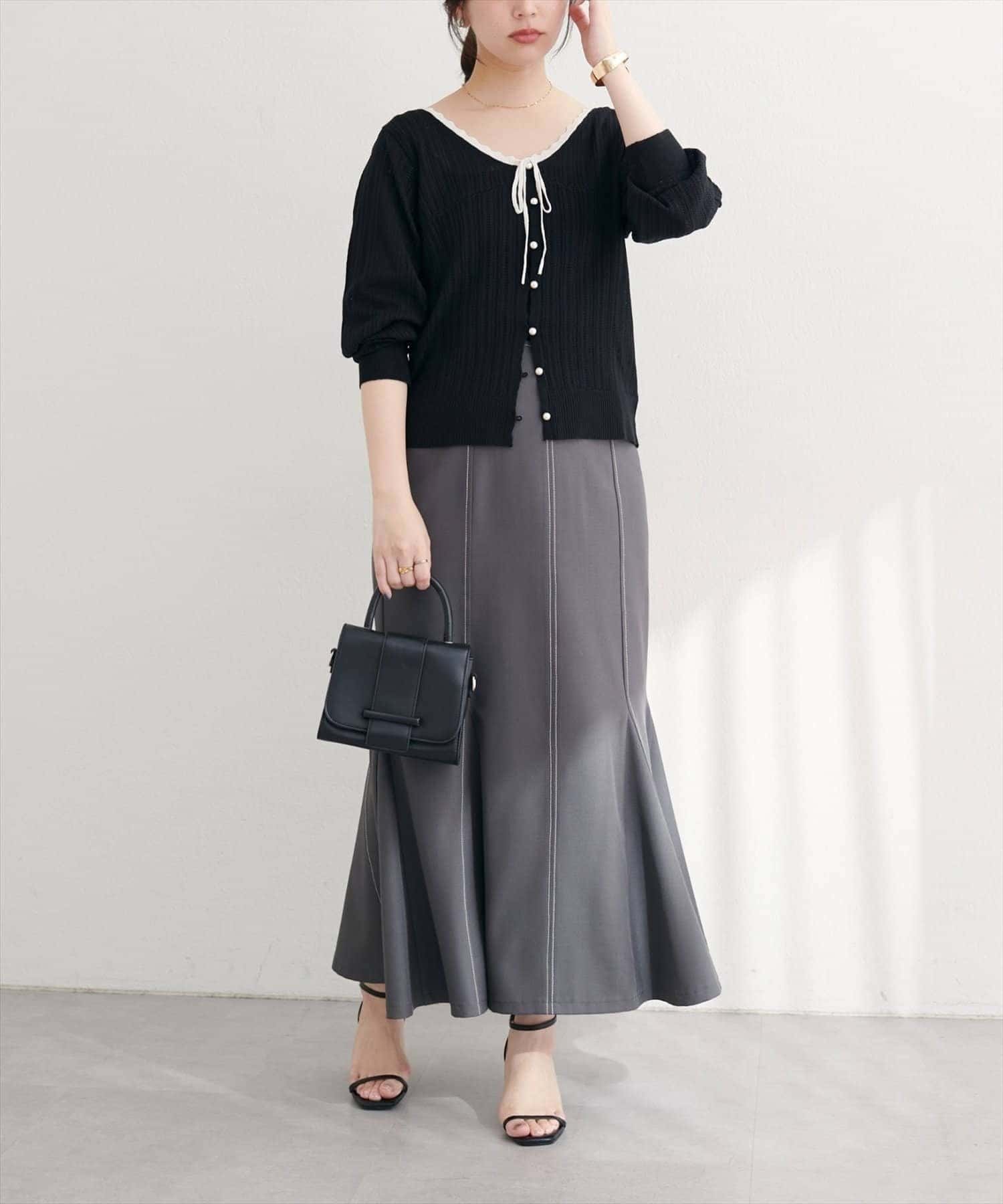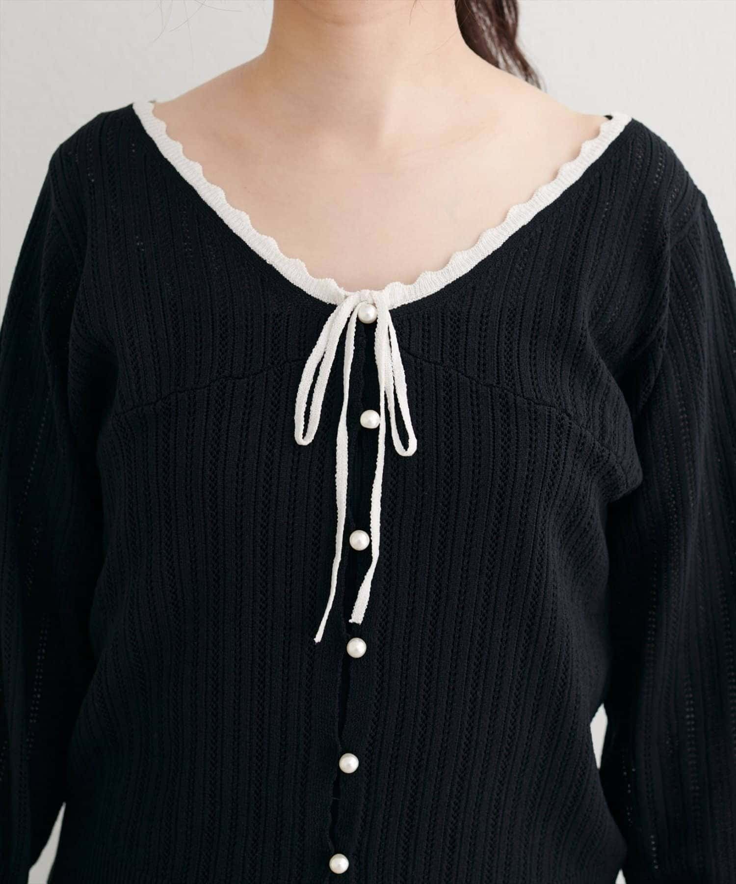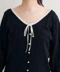 胸元のリボンとレーストリムが、大人の可愛らしさを引き立てるカーディガン。
