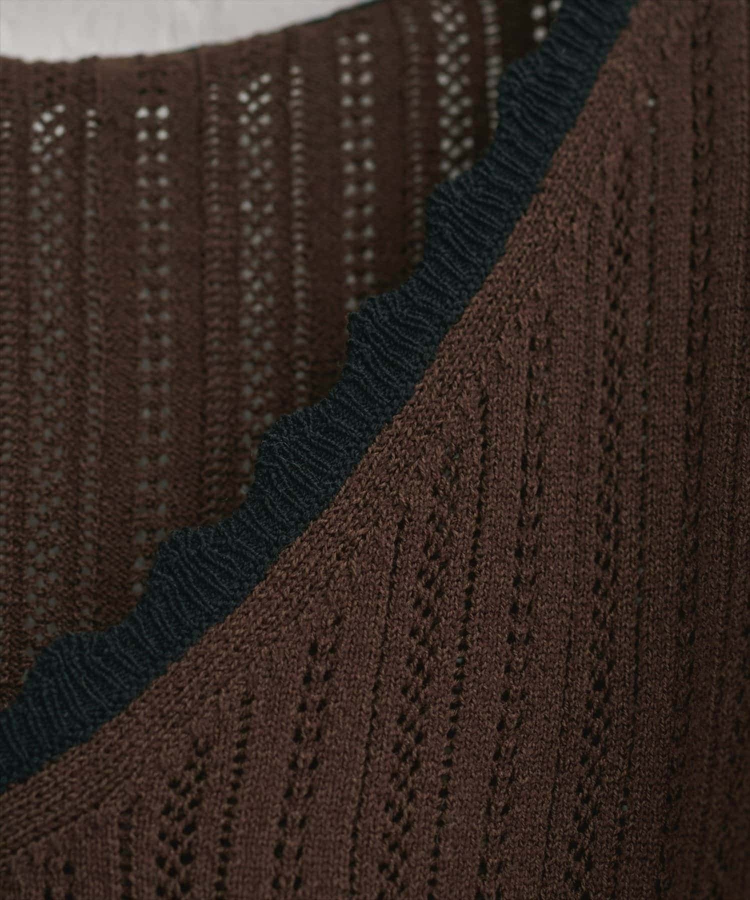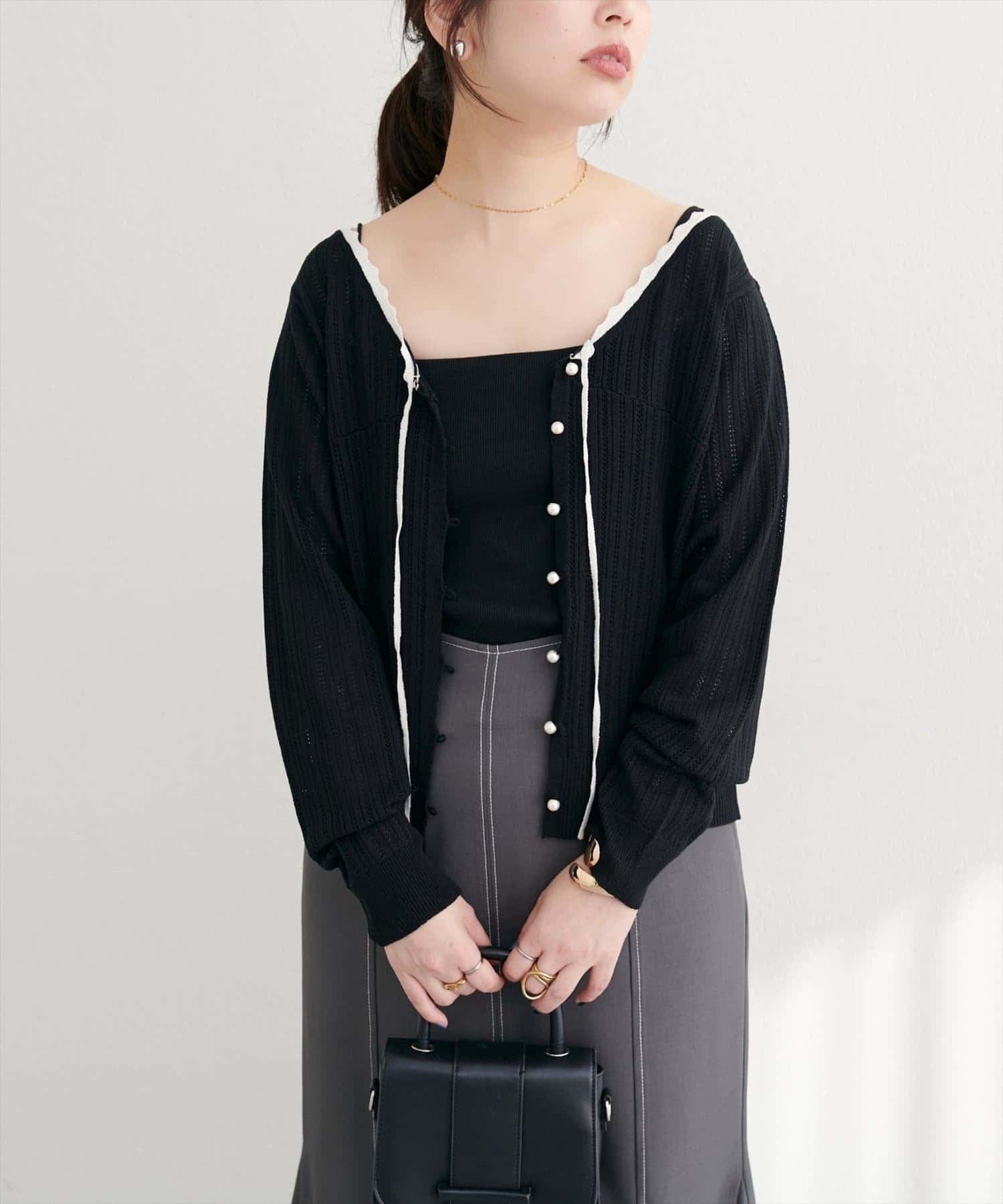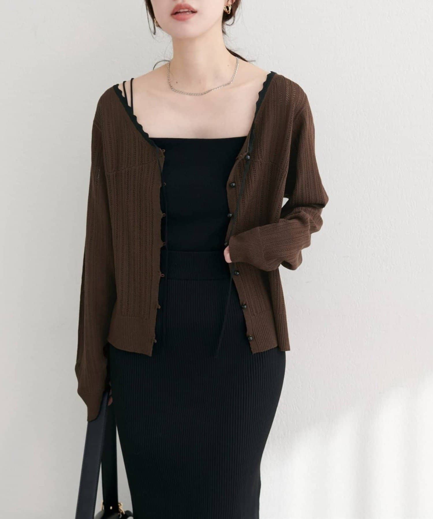 涼しげな印象の透かし編みは、見た目にも着心地にも軽やか。インナーの色を透けさせて、遊び心のあるレイヤードスタイルもおすすめです。