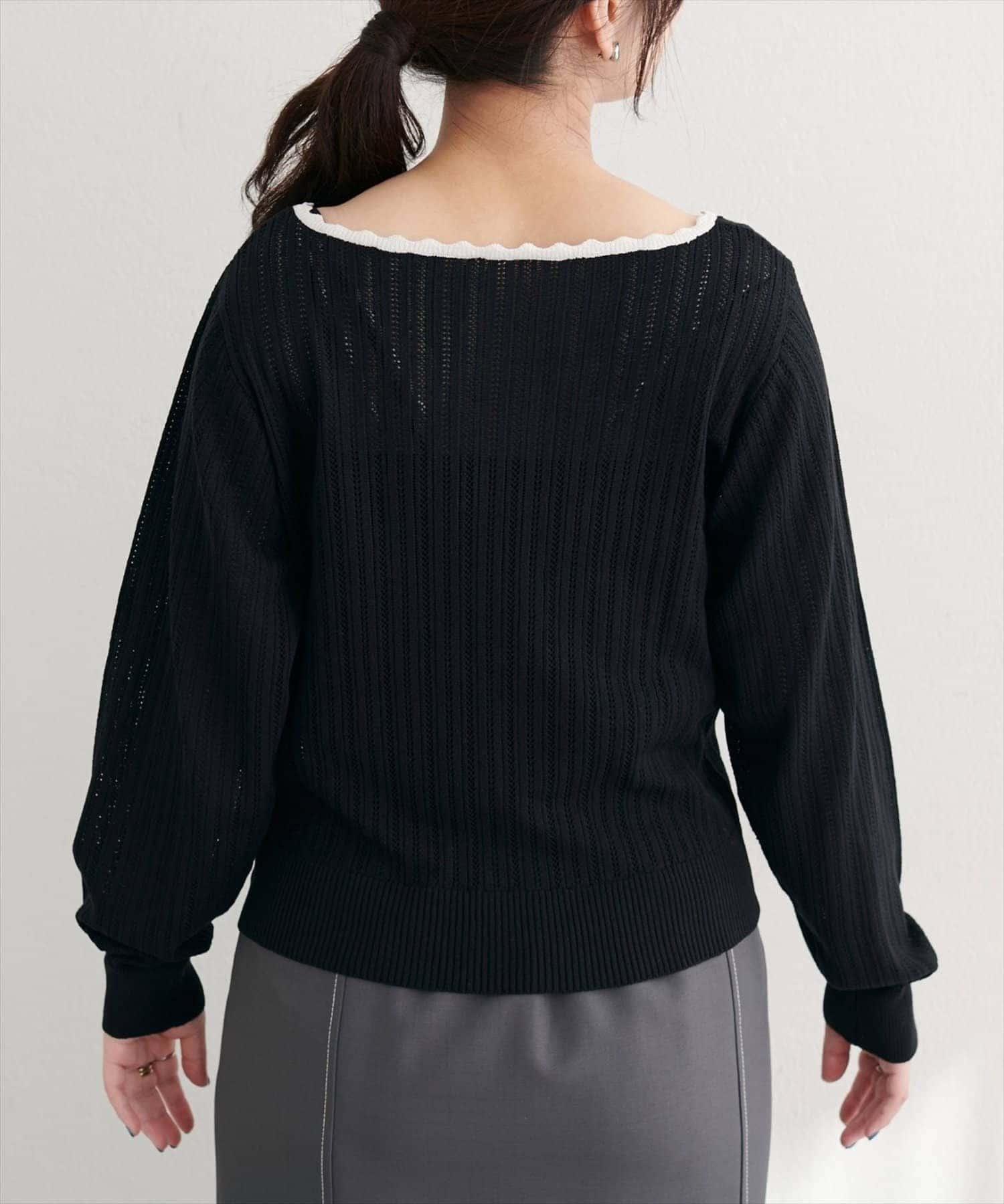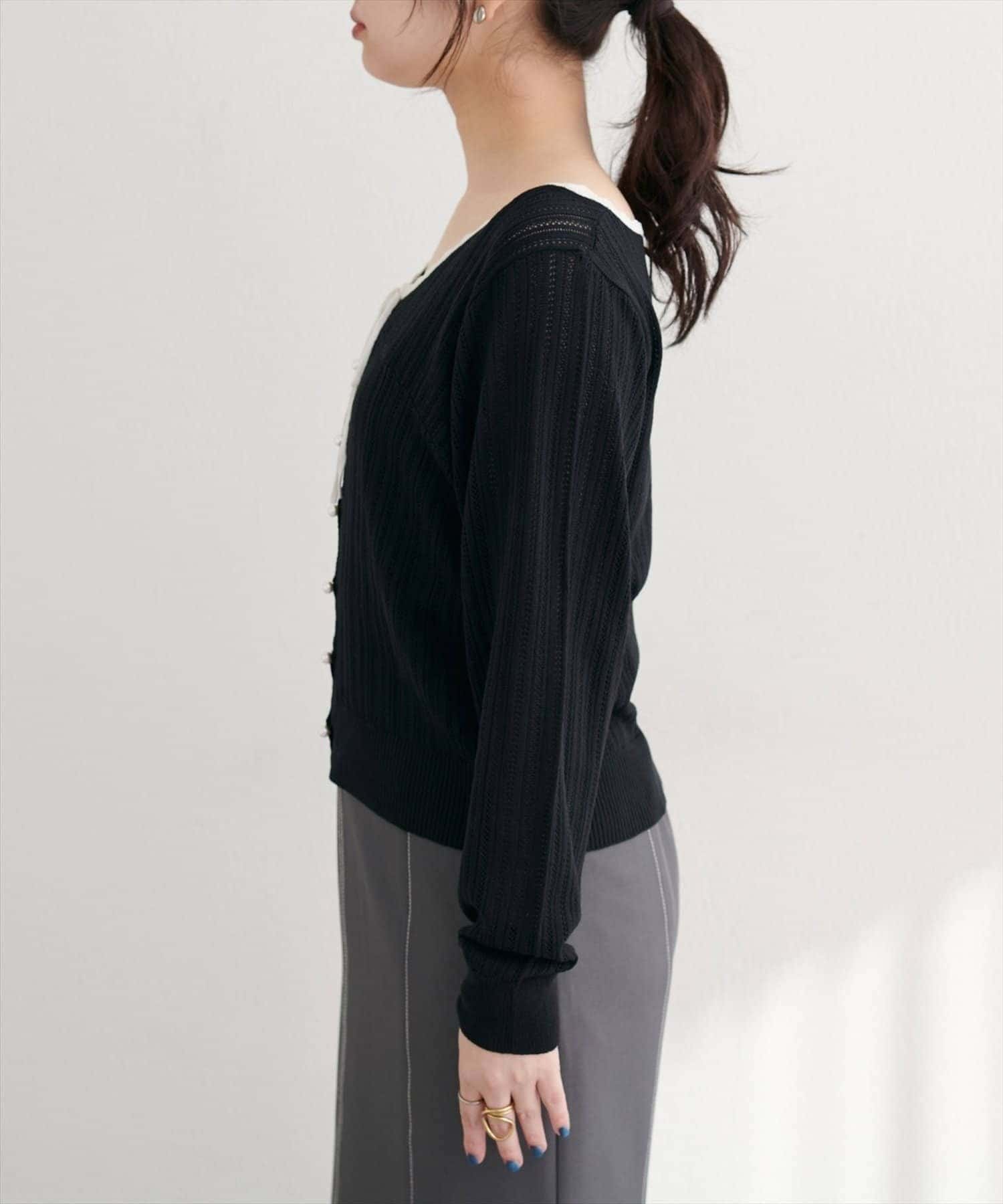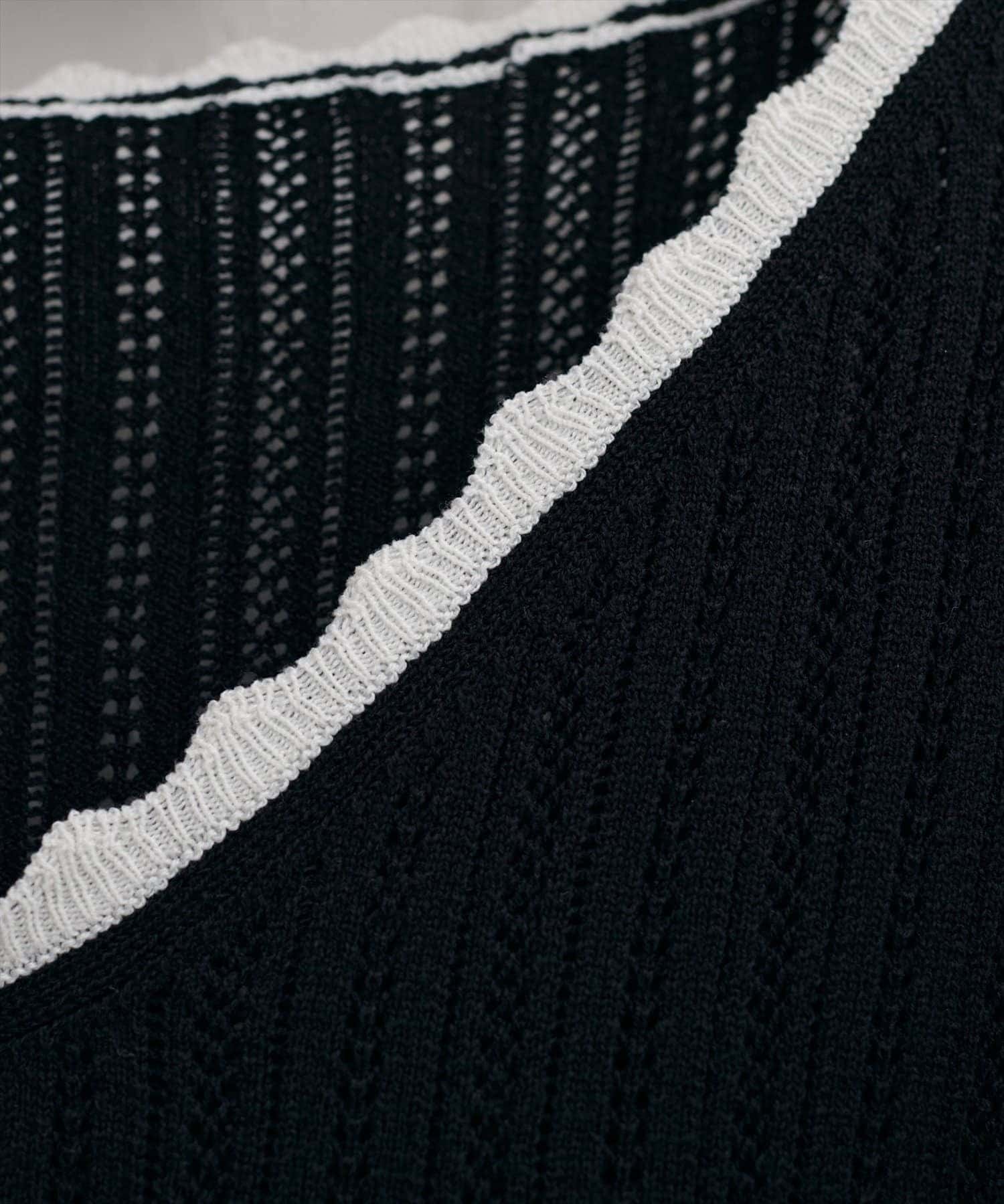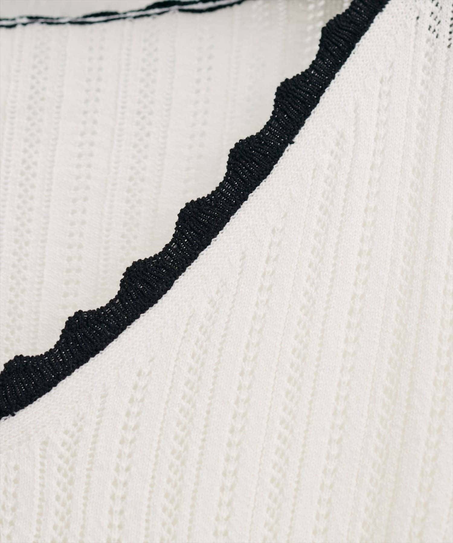 涼しげな印象の透かし編みは、見た目にも着心地にも軽やか。インナーの色を透けさせて、遊び心のあるレイヤードスタイルもおすすめです。