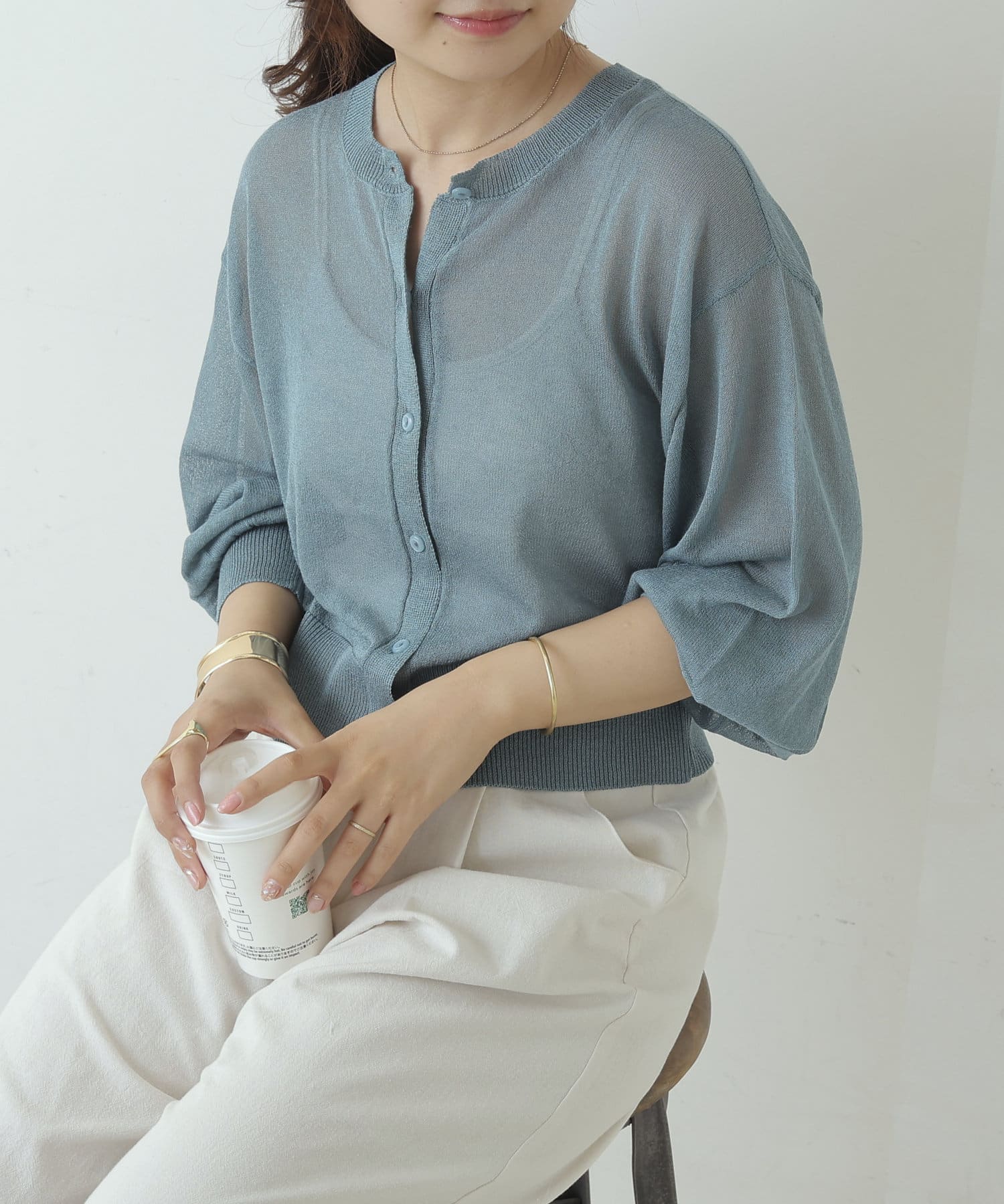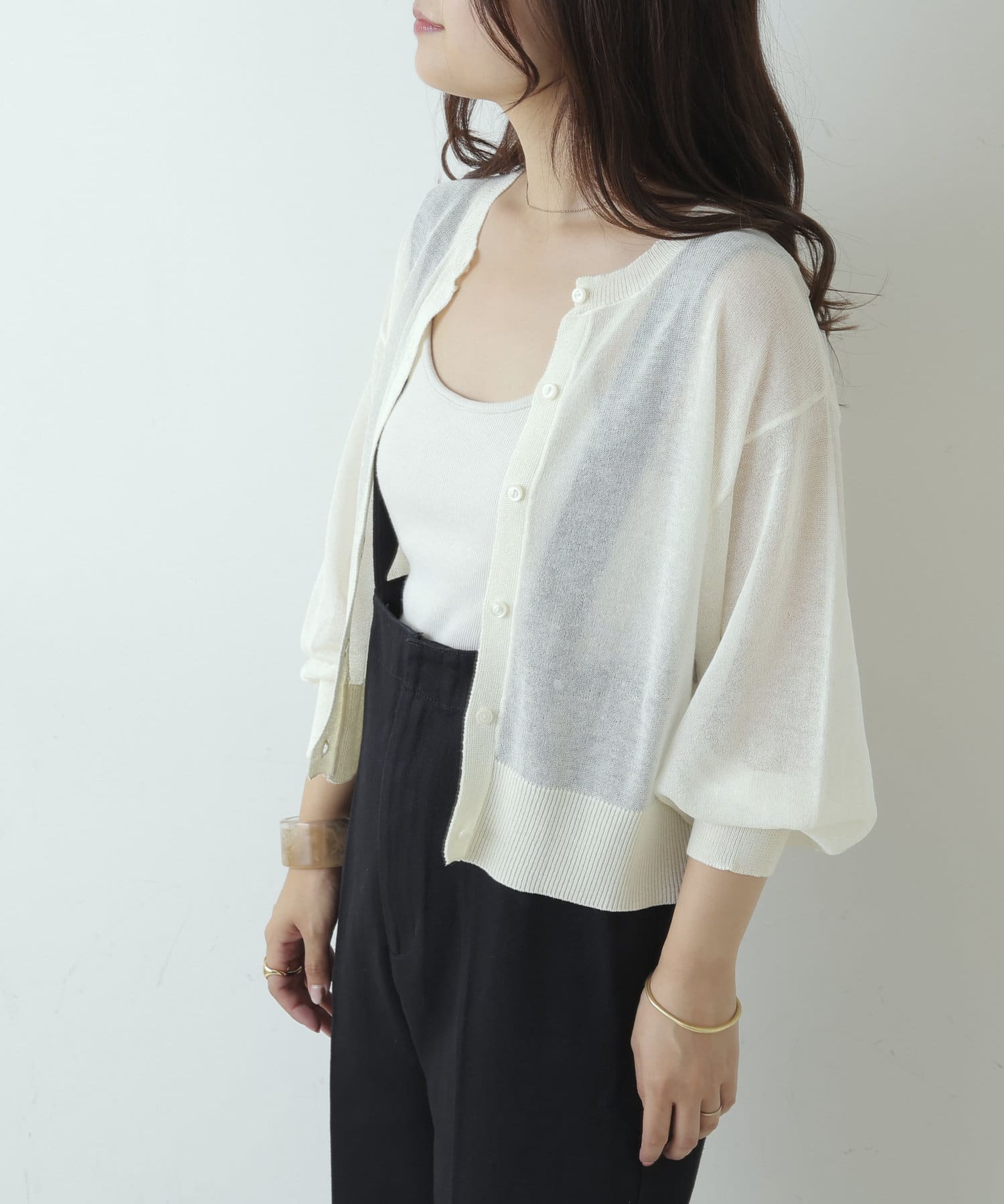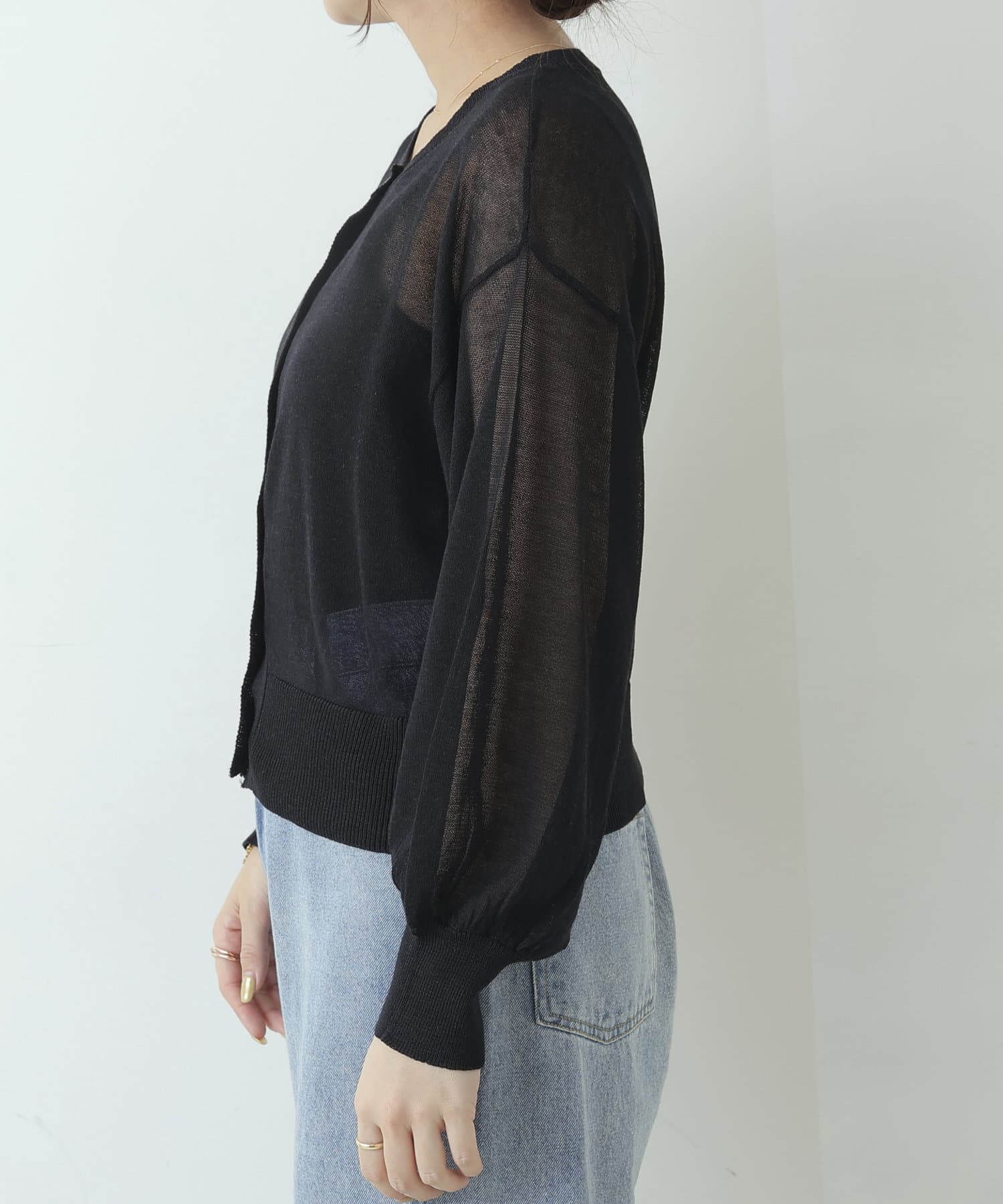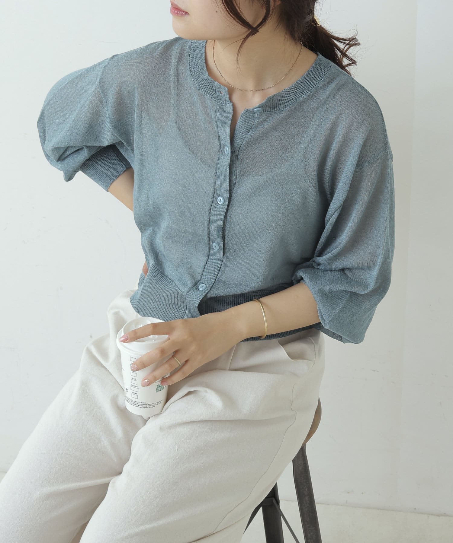 ヘルシーな透け感、清涼感のある素材のカーディガン
