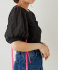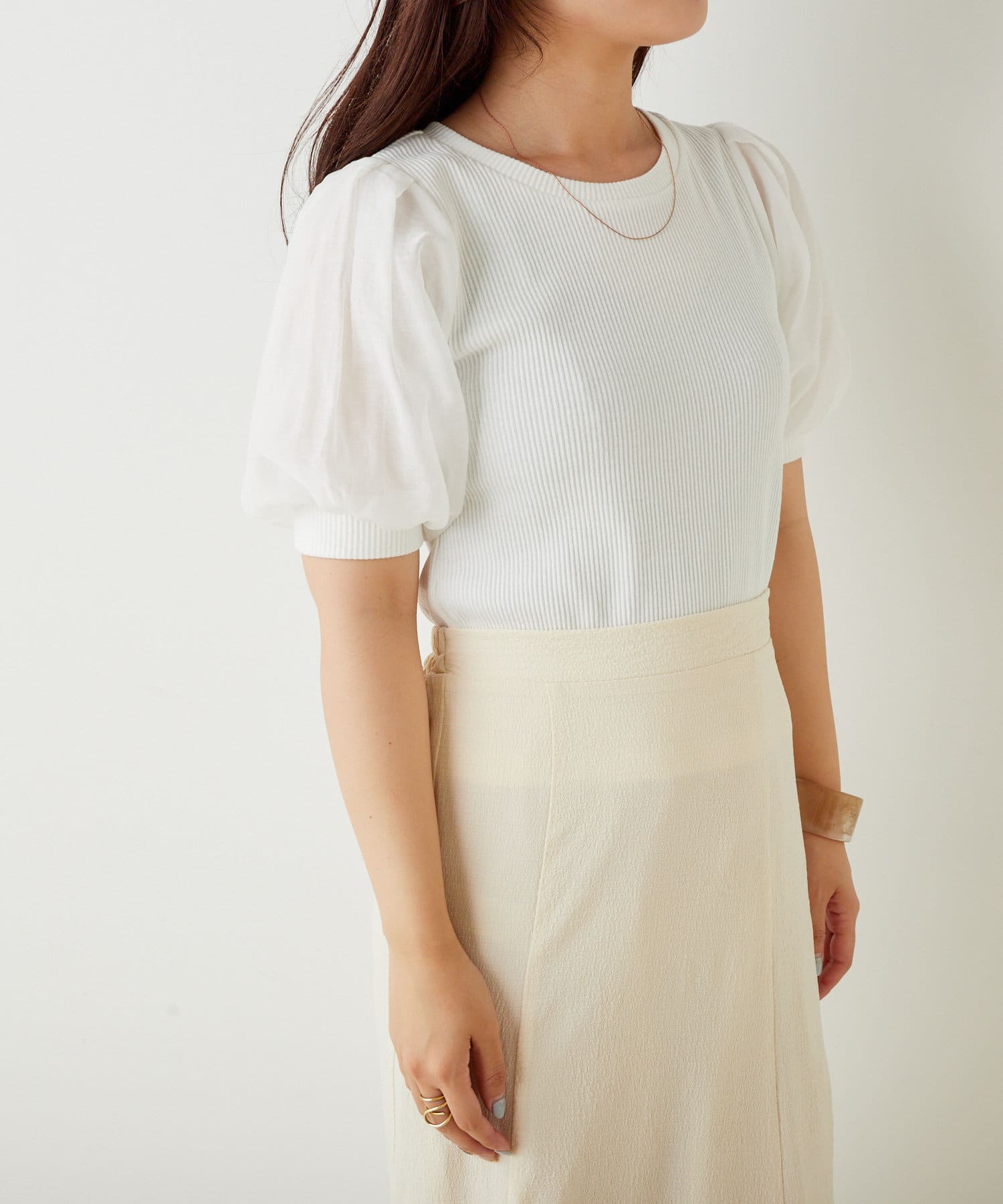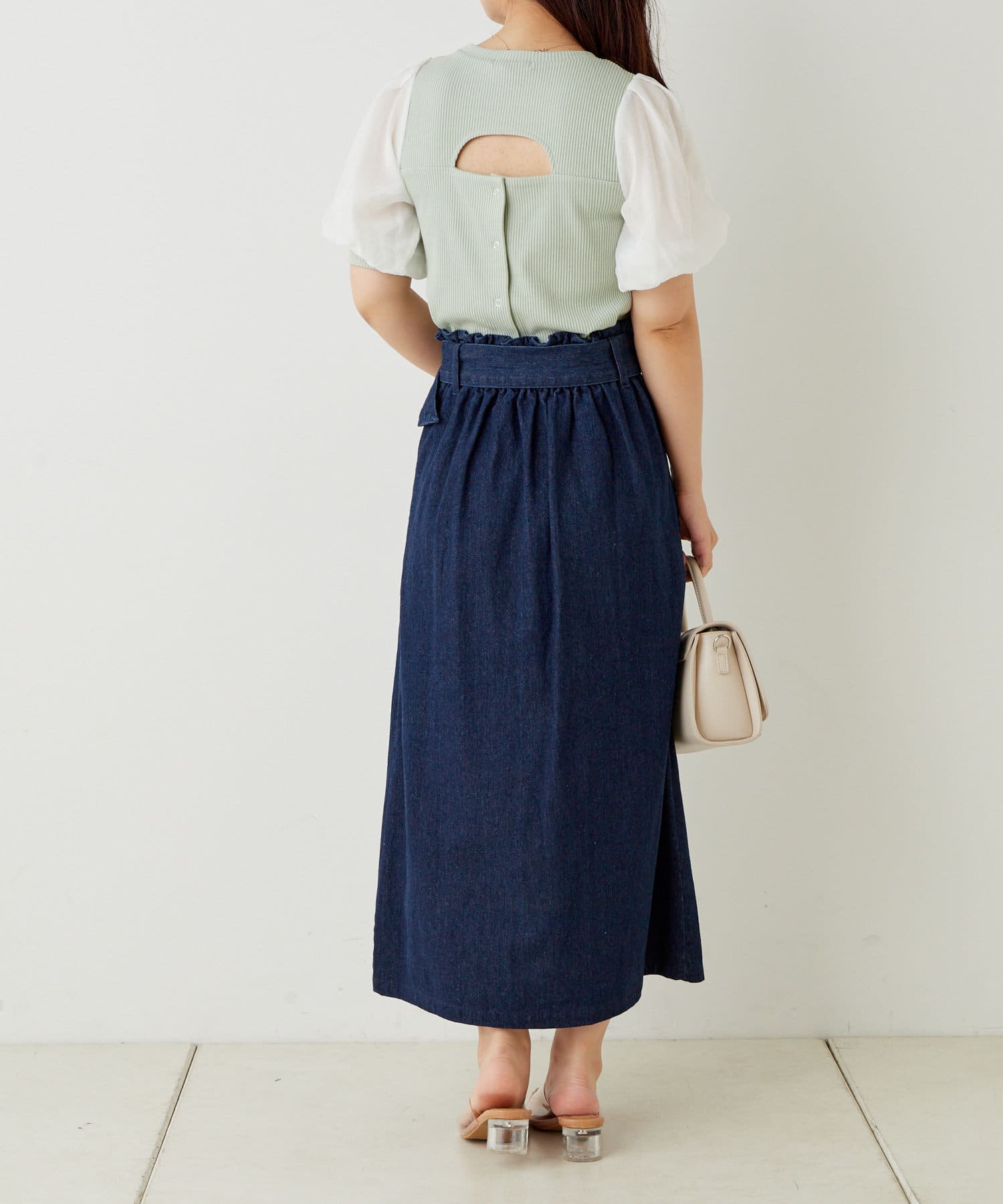 ・素材感もかわいく、特に後ろのデザインが目を惹く、大人ガーリーな印象の1枚です。