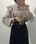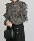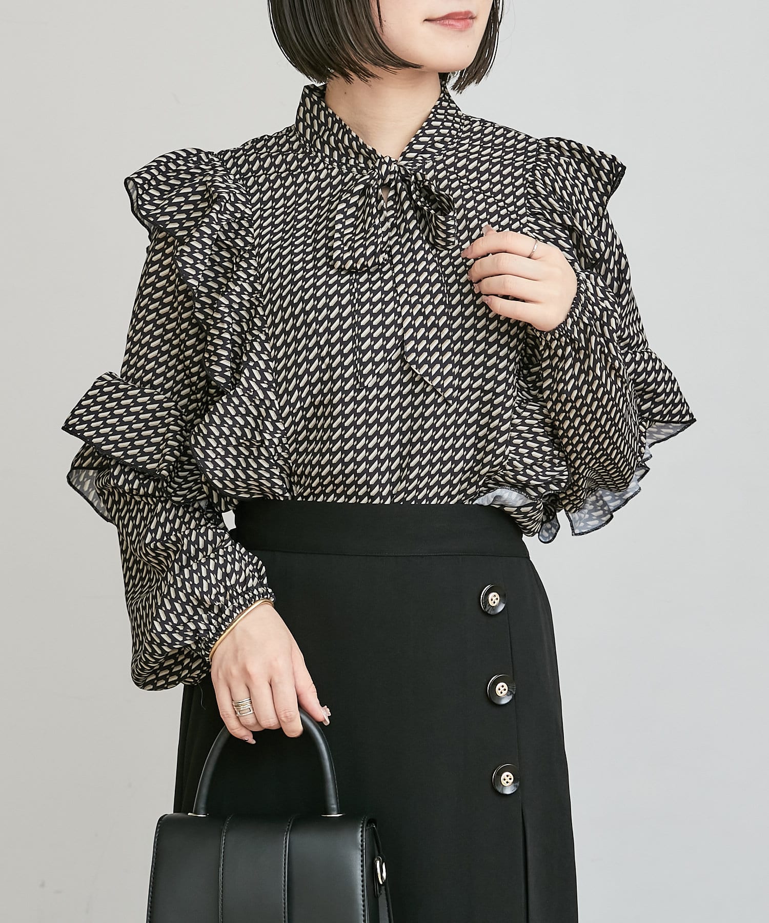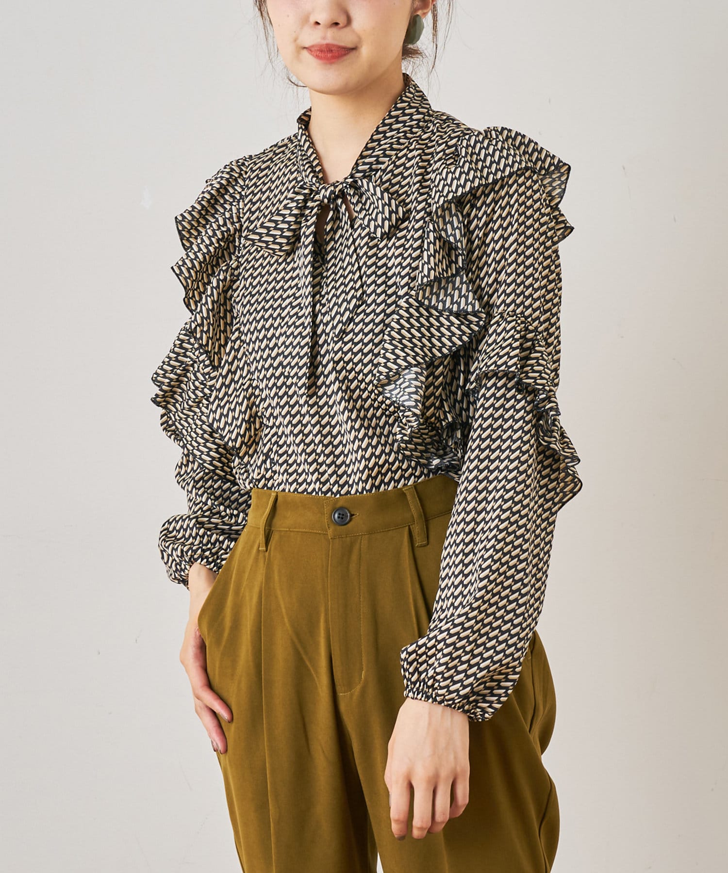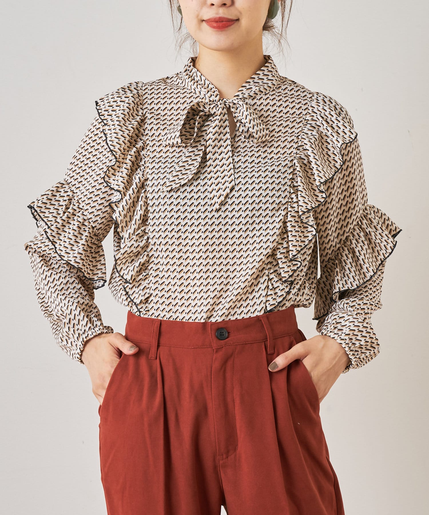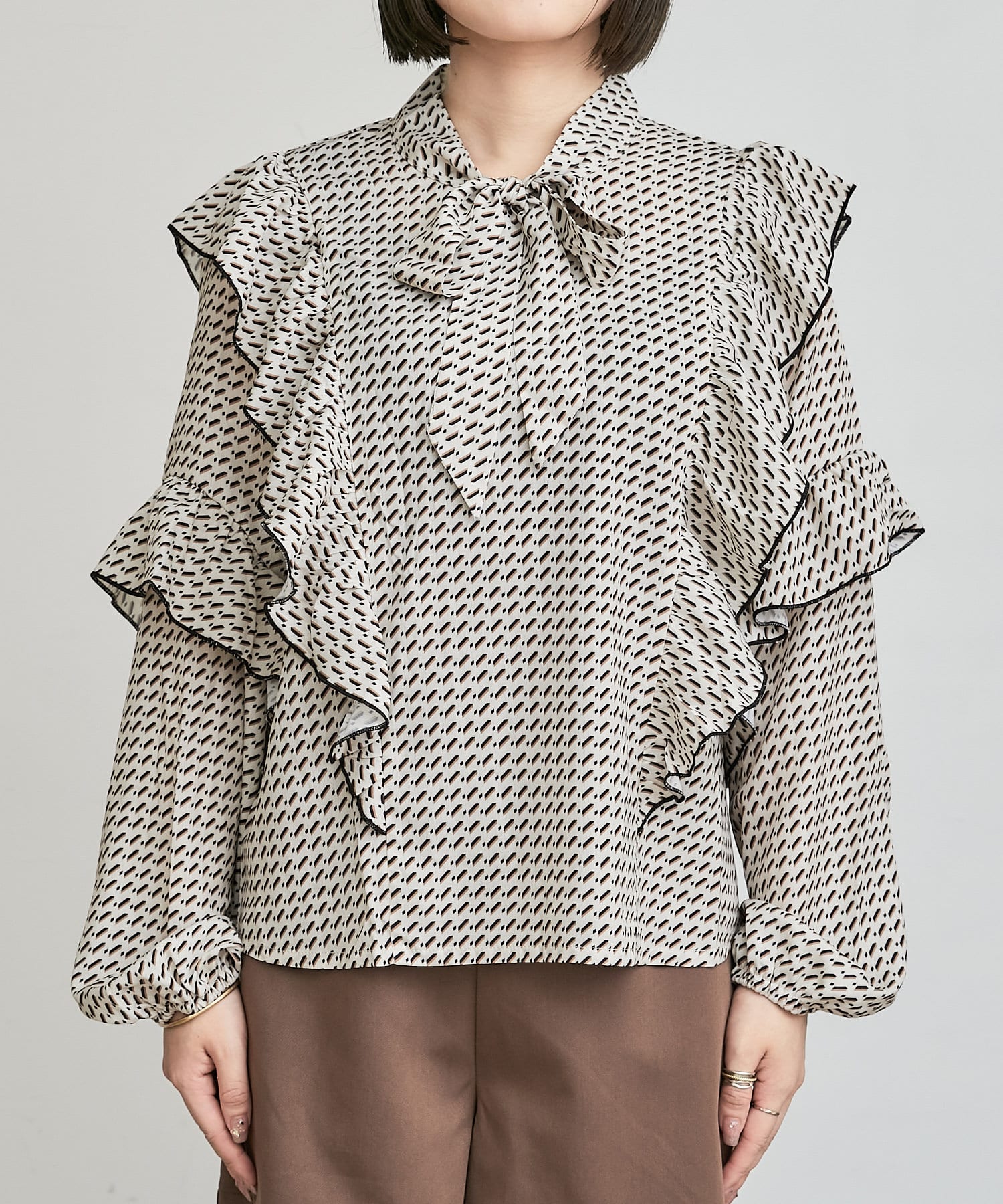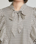 ・秋冬に着たくなる幾何学柄と、人気のボウタイを合わせたトレンドデザインのブラウス。