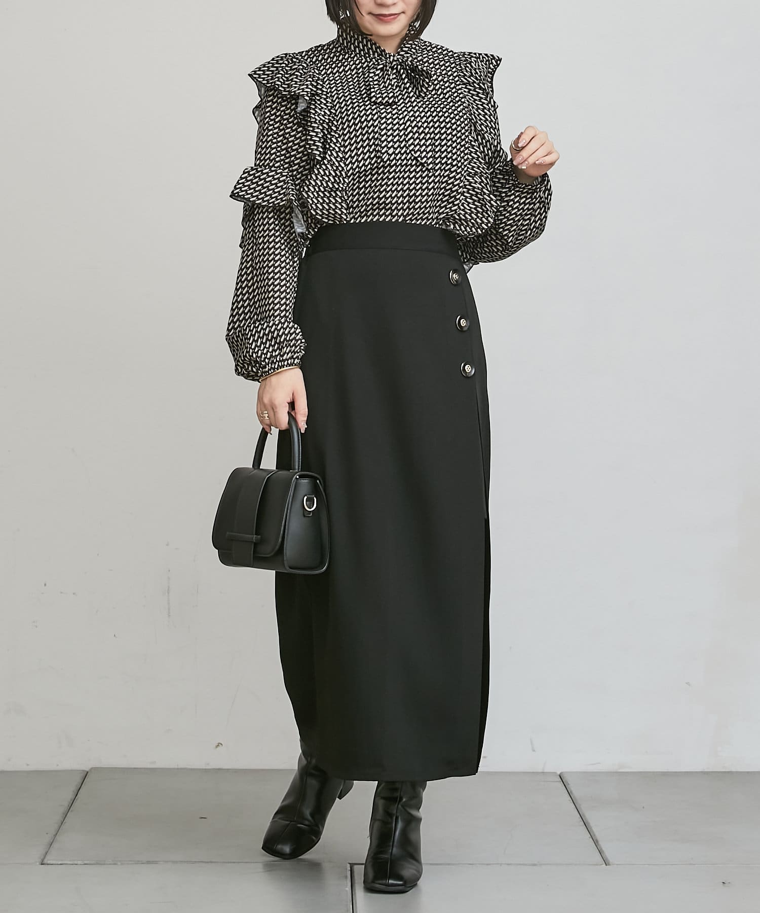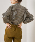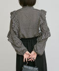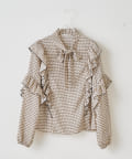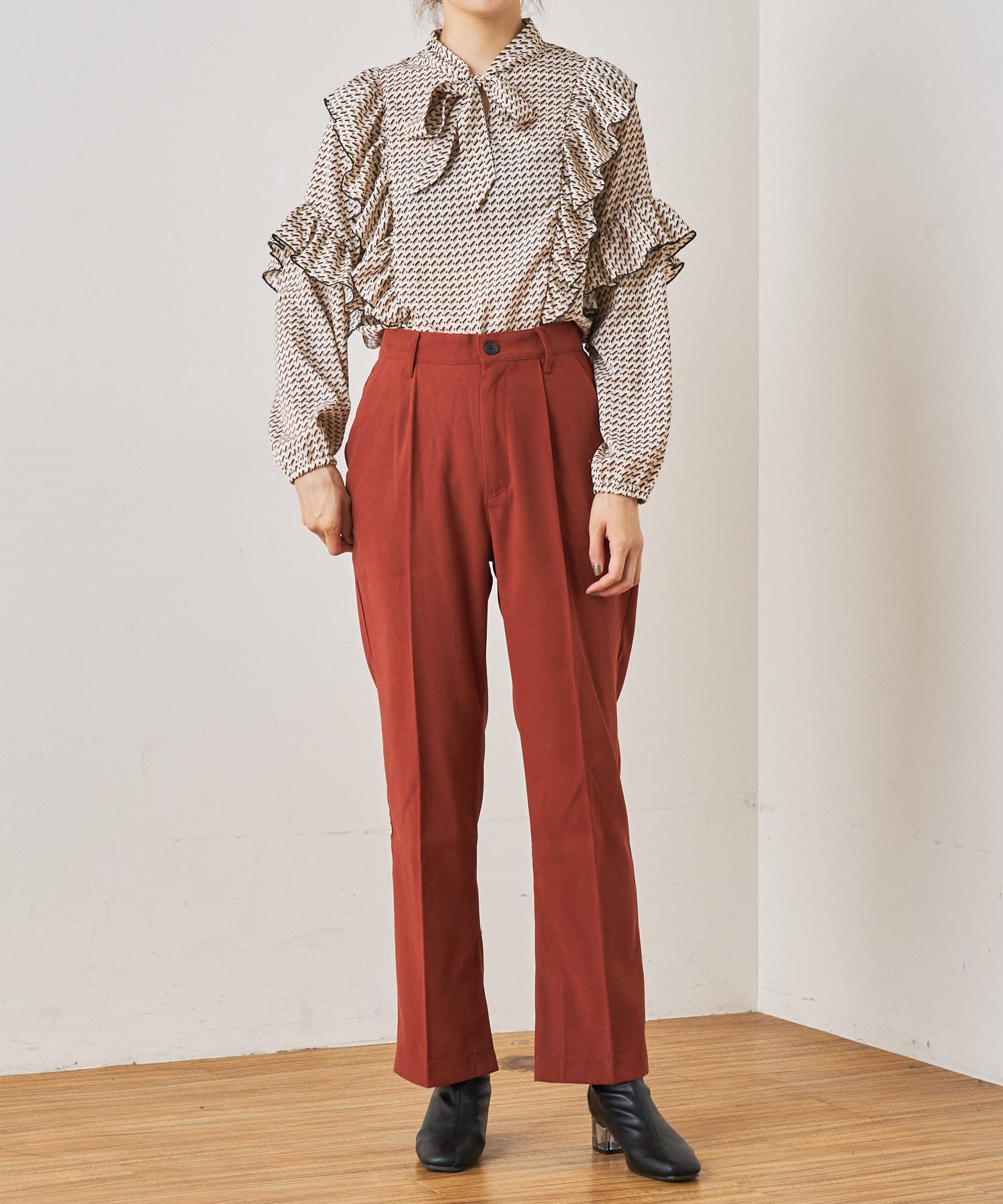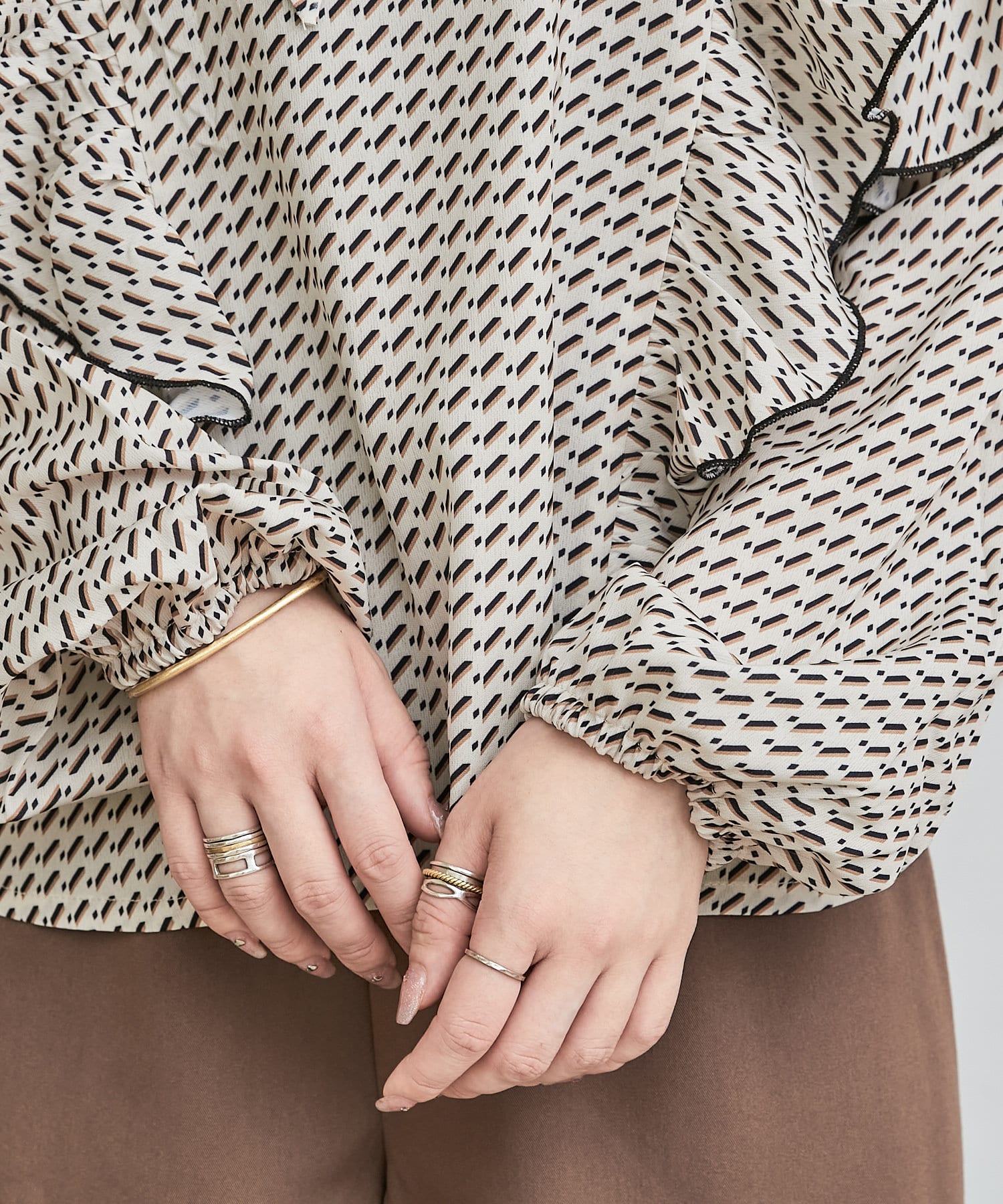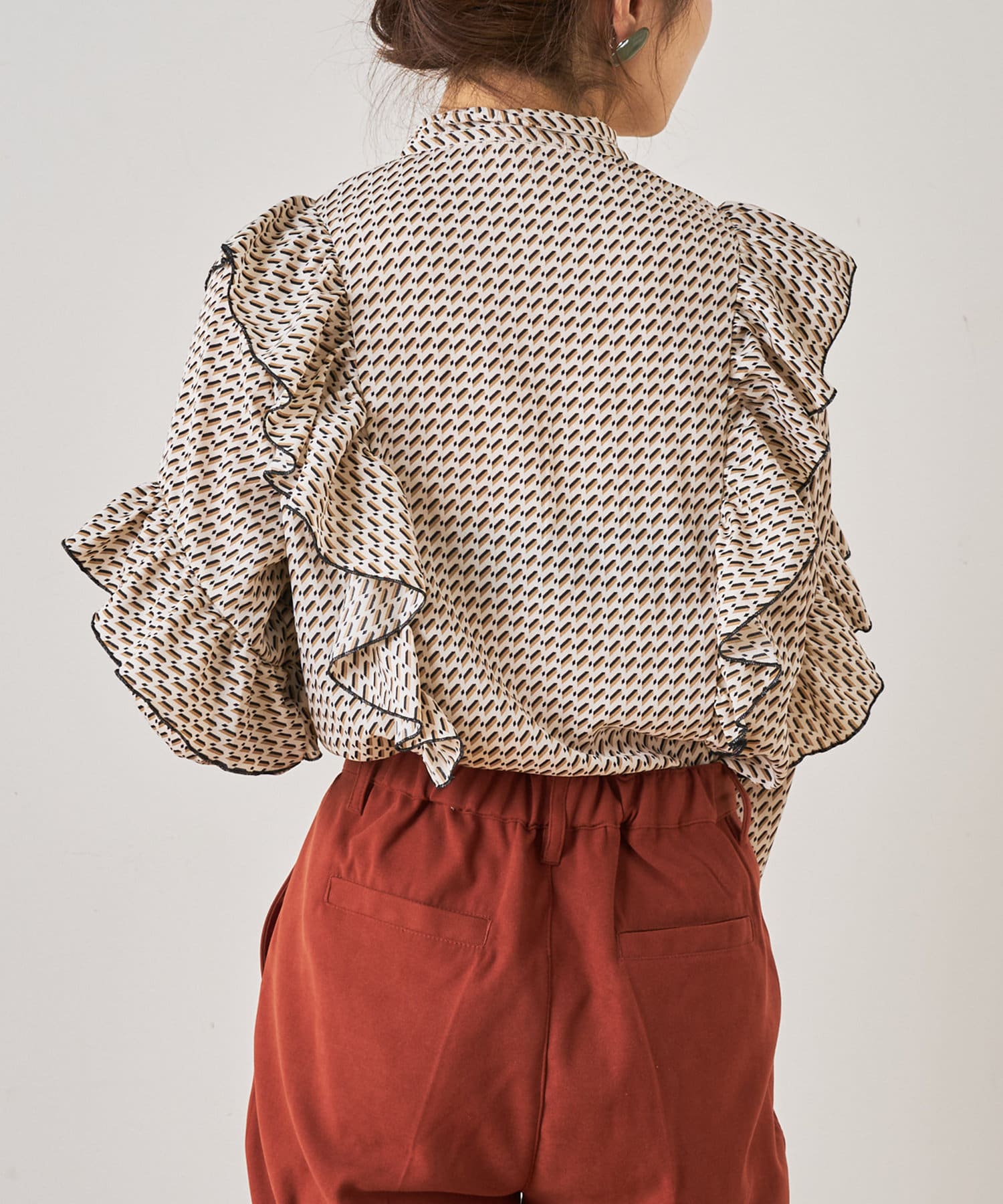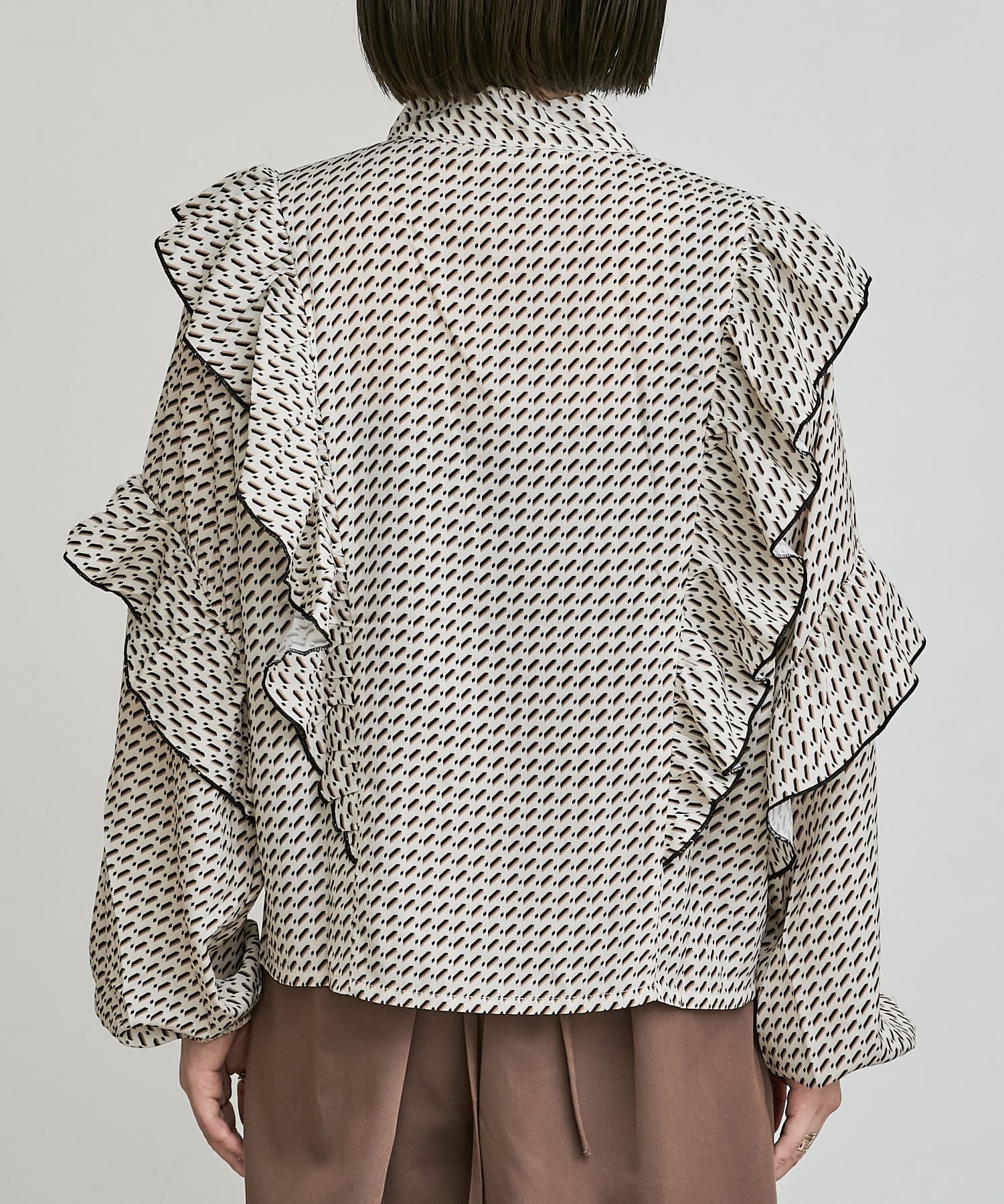 ・秋冬に着たくなる幾何学柄と、人気のボウタイを合わせたトレンドデザインのブラウス。