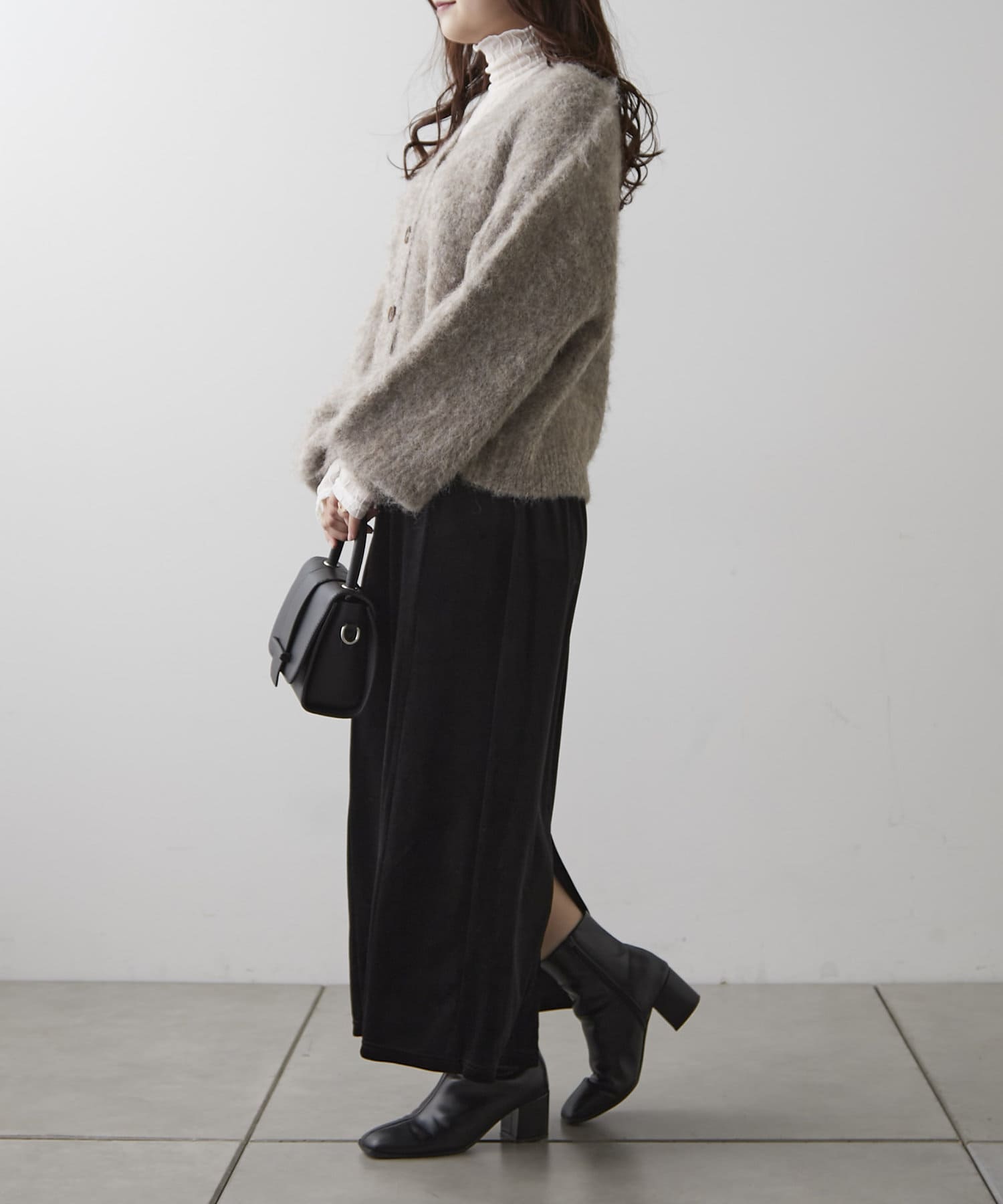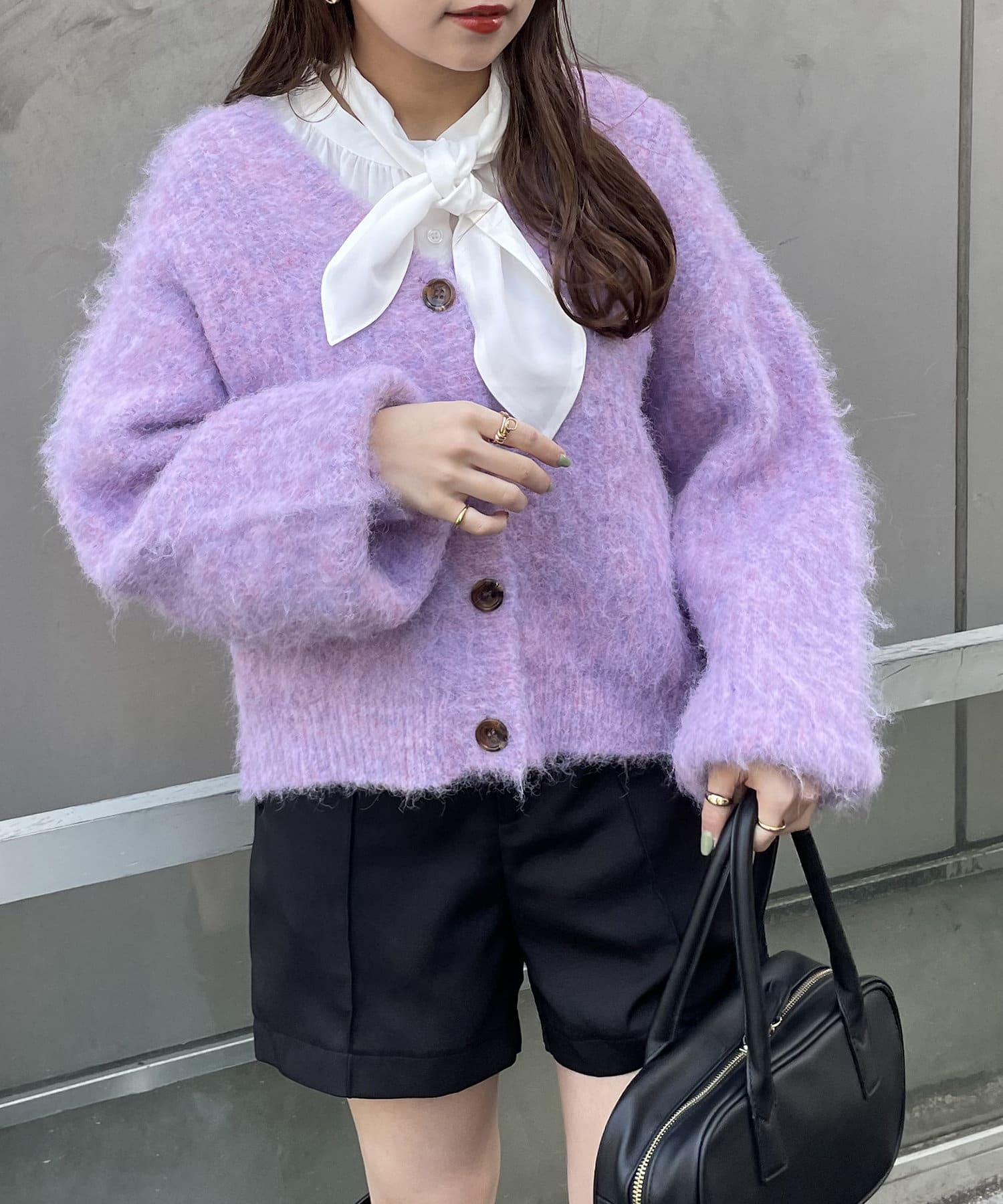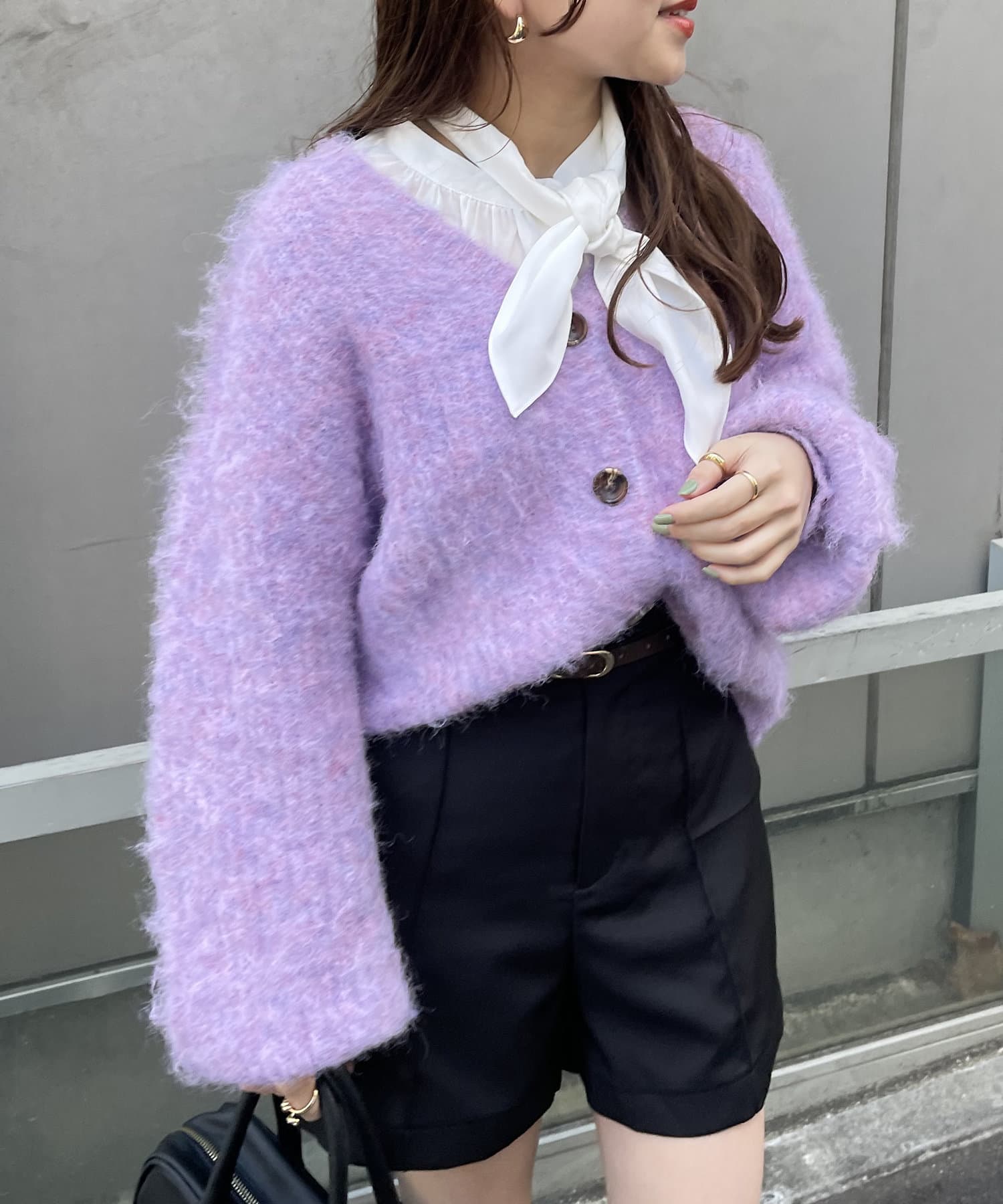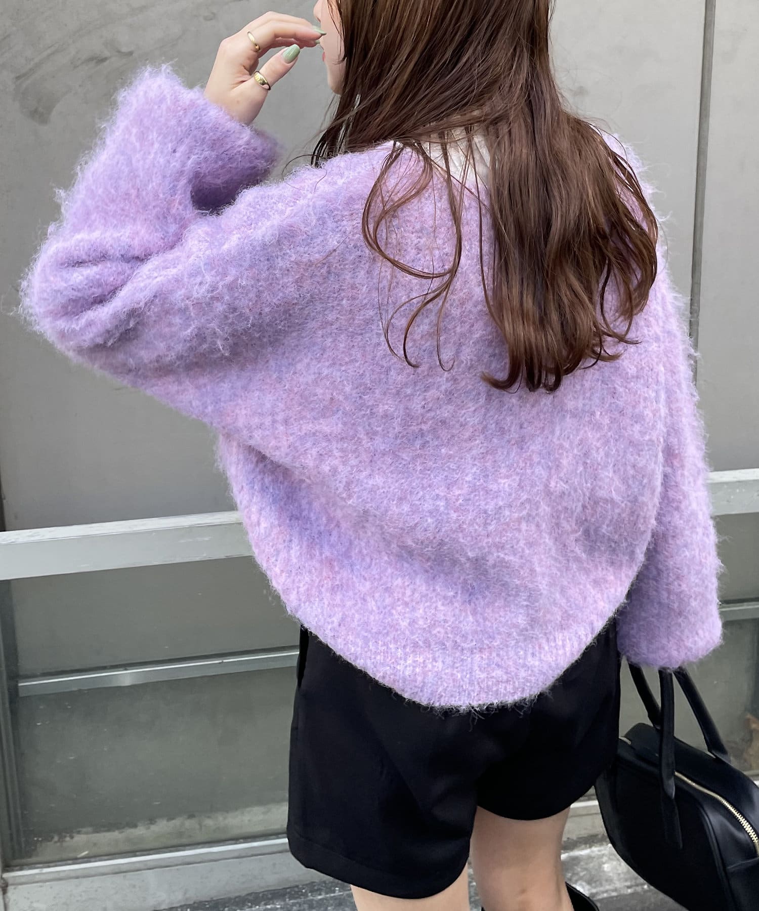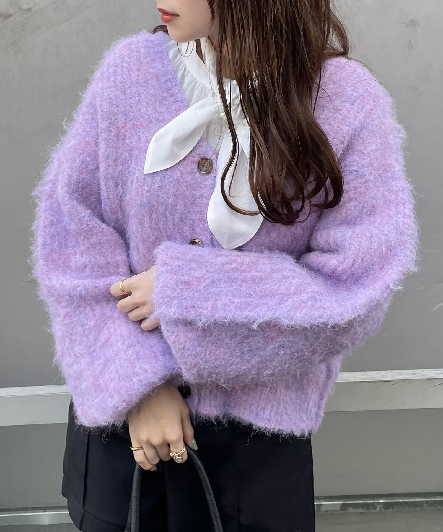 ・様々な色の糸を混ぜ込んだMIXヤーンと毛足の長い素材感がコーデの主役に。