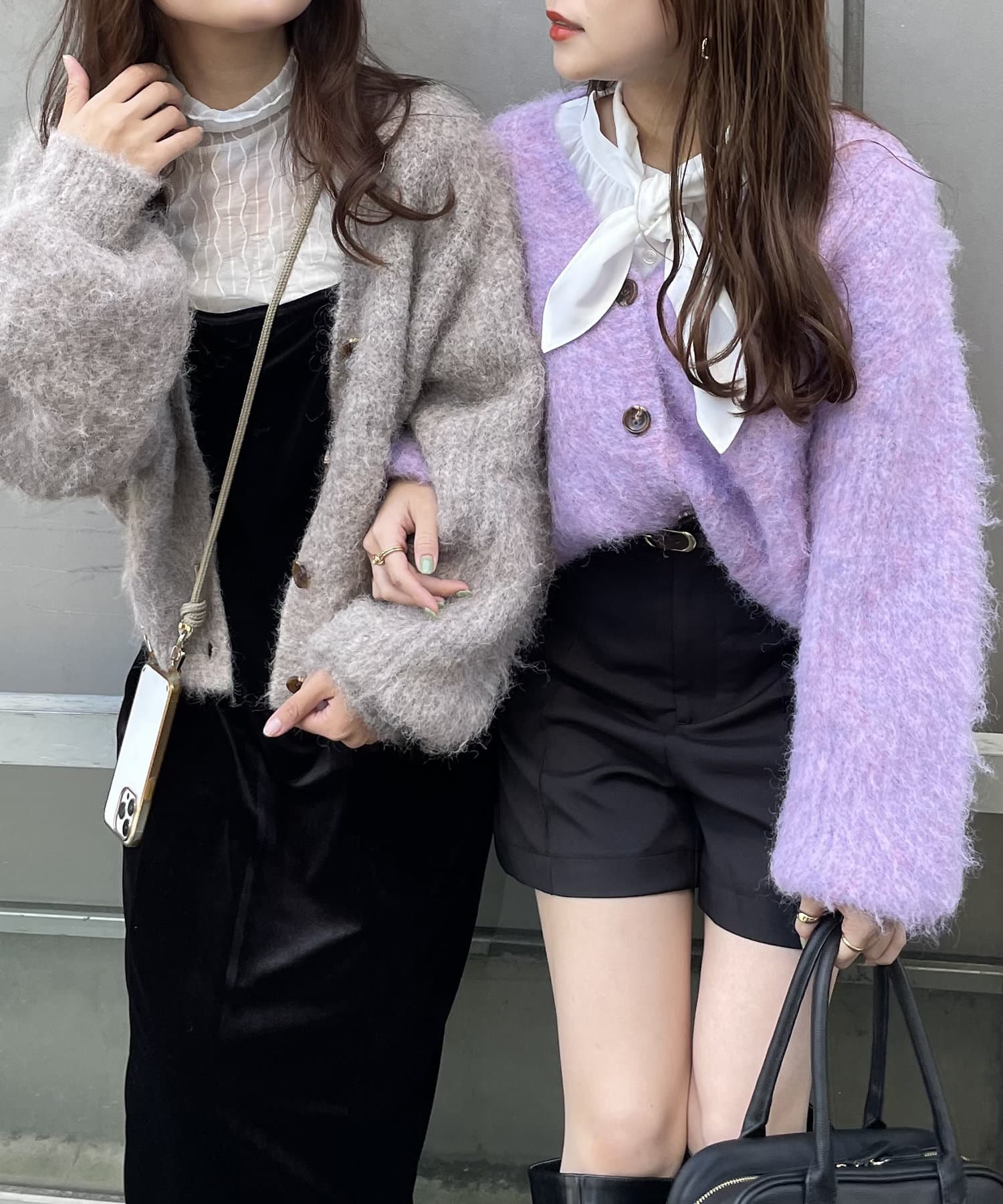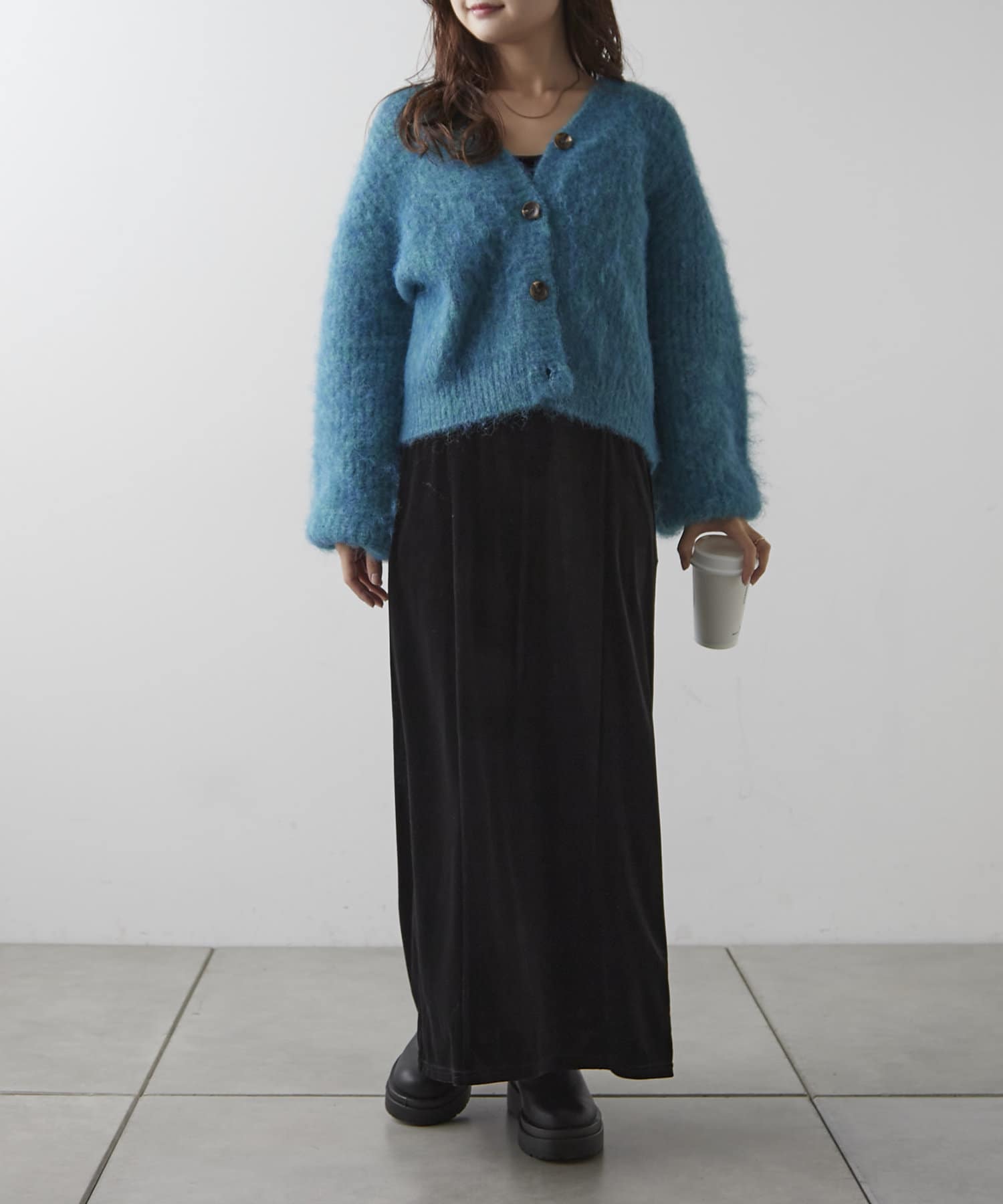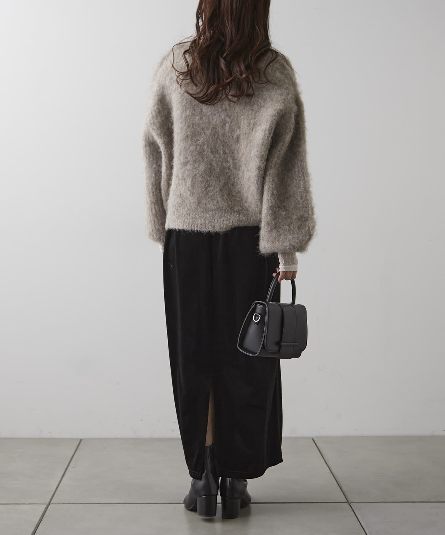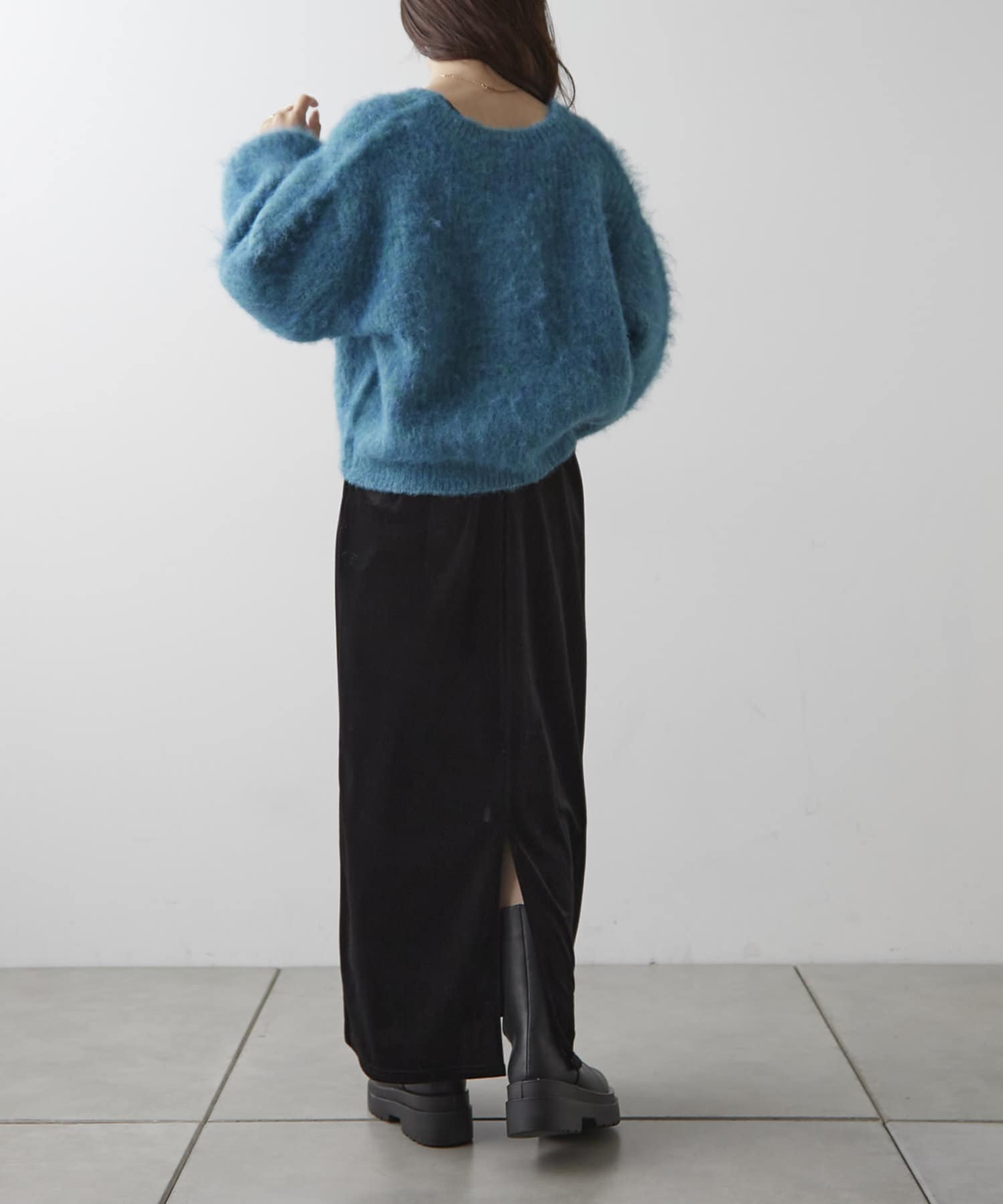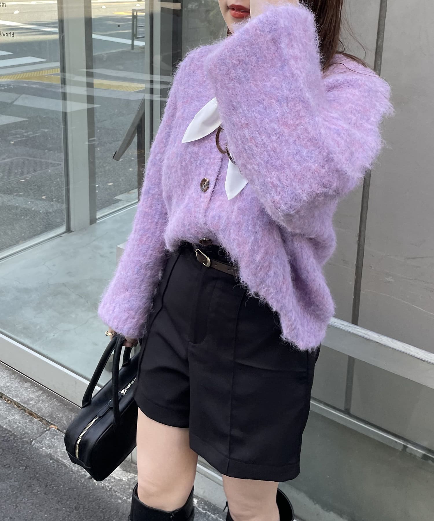 ・様々な色の糸を混ぜ込んだMIXヤーンと毛足の長い素材感がコーデの主役に。