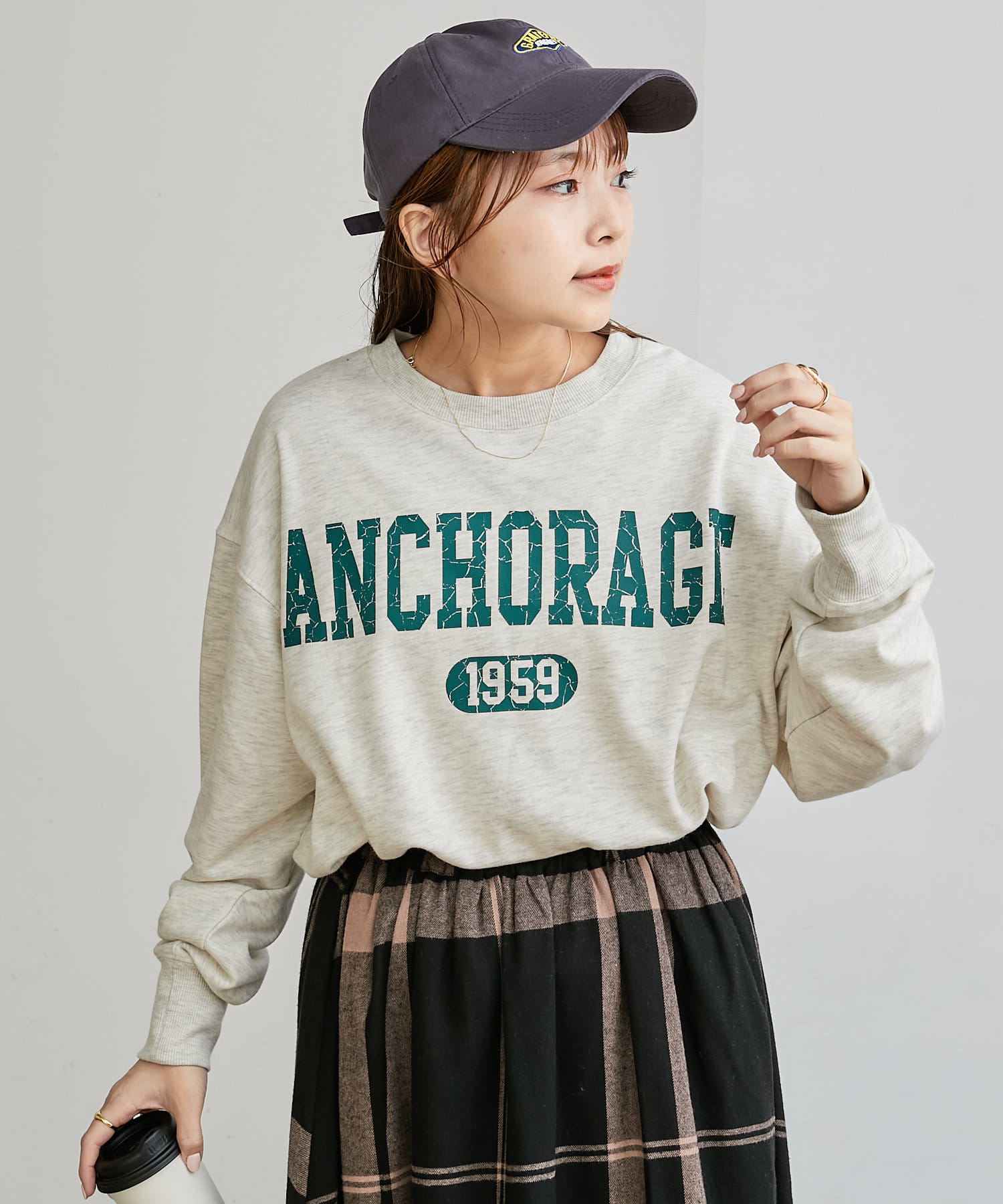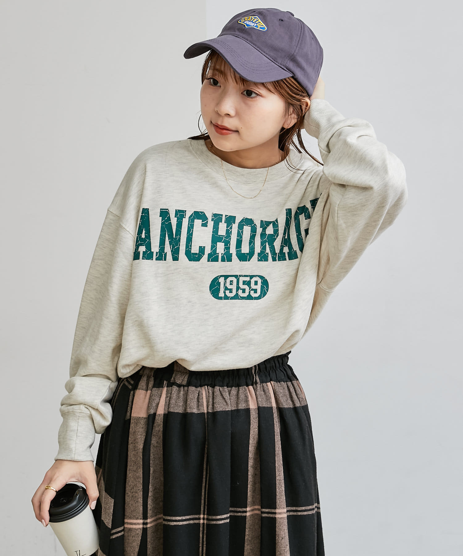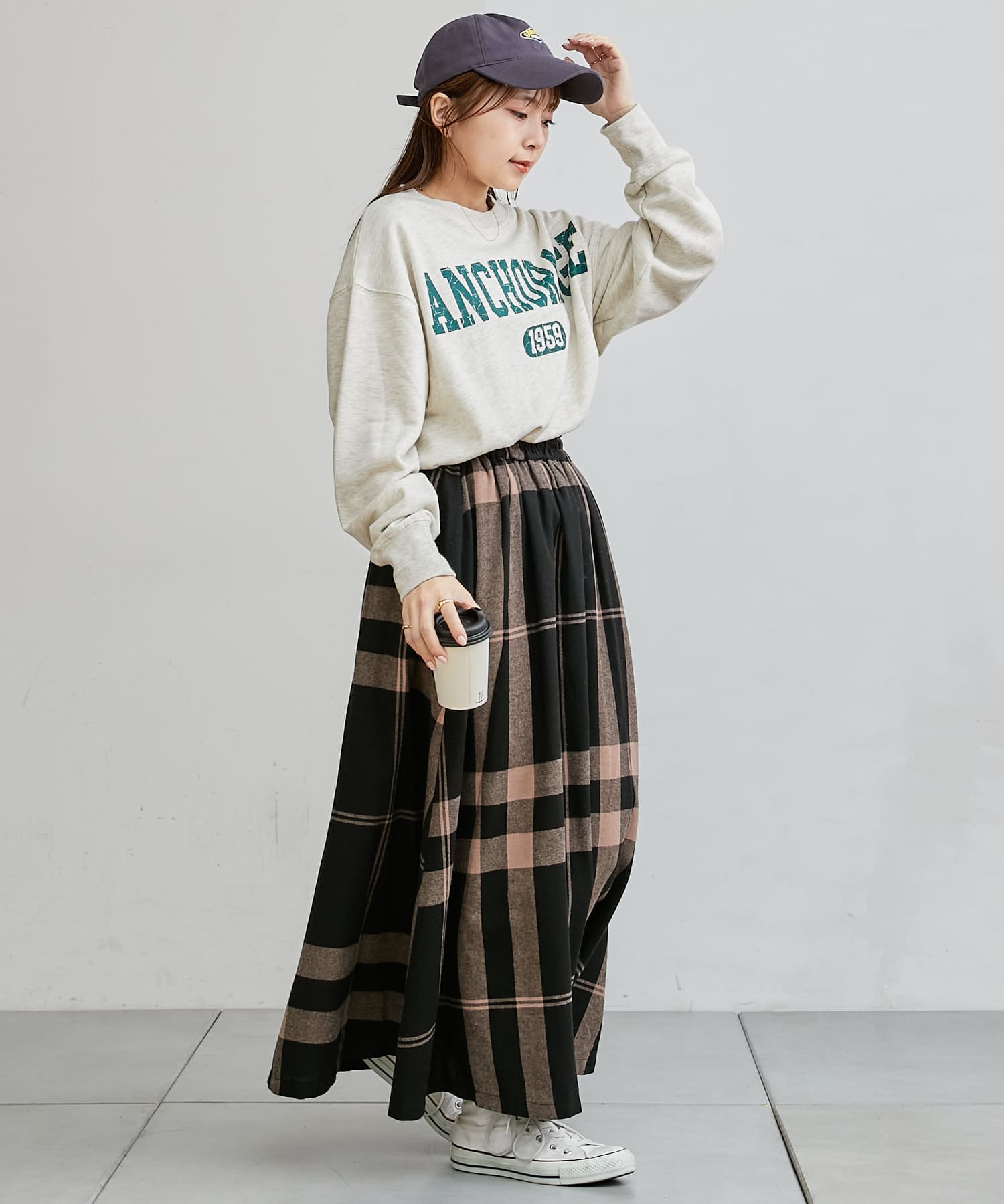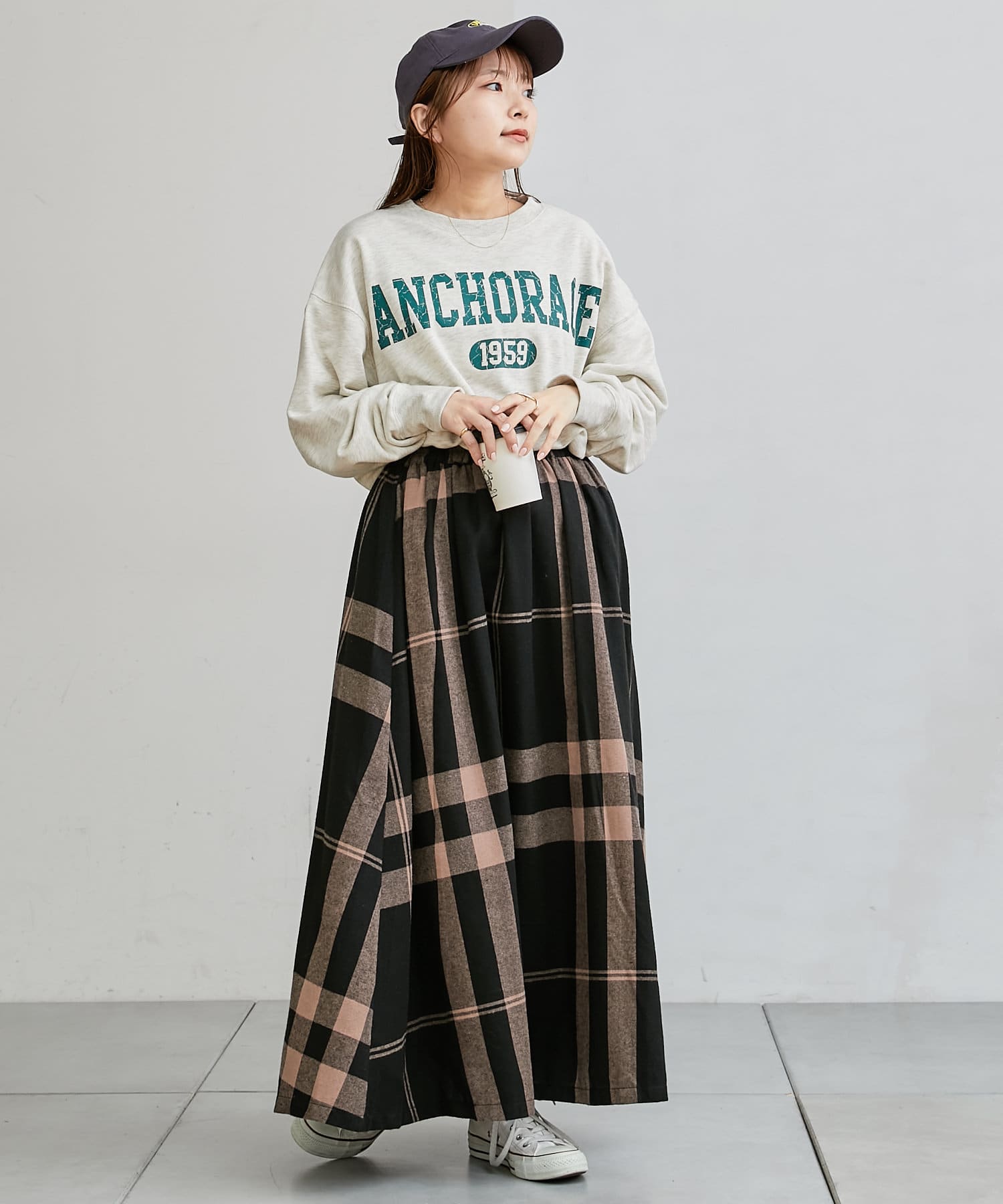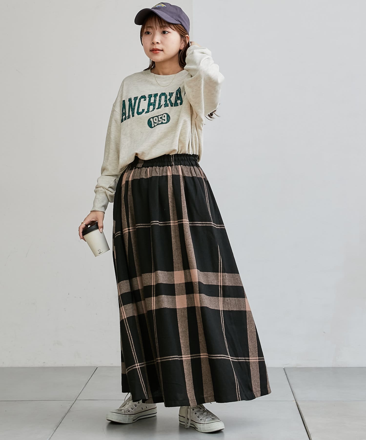 ・人気のチェックスカートやスリットスカートを合わせて女性らしいカジュアルスタイルがおすすめ。