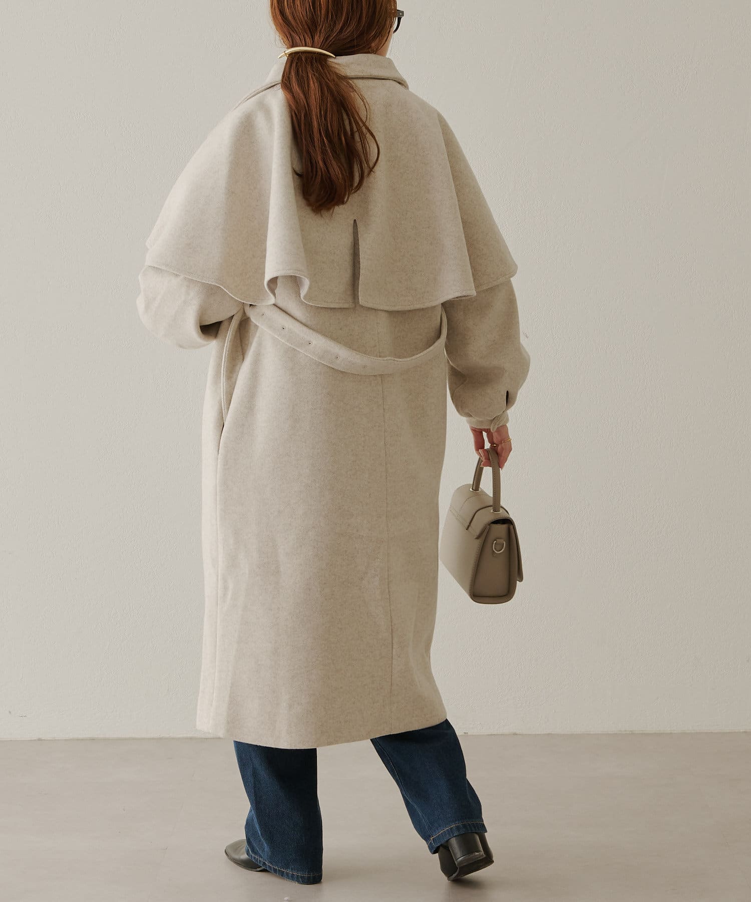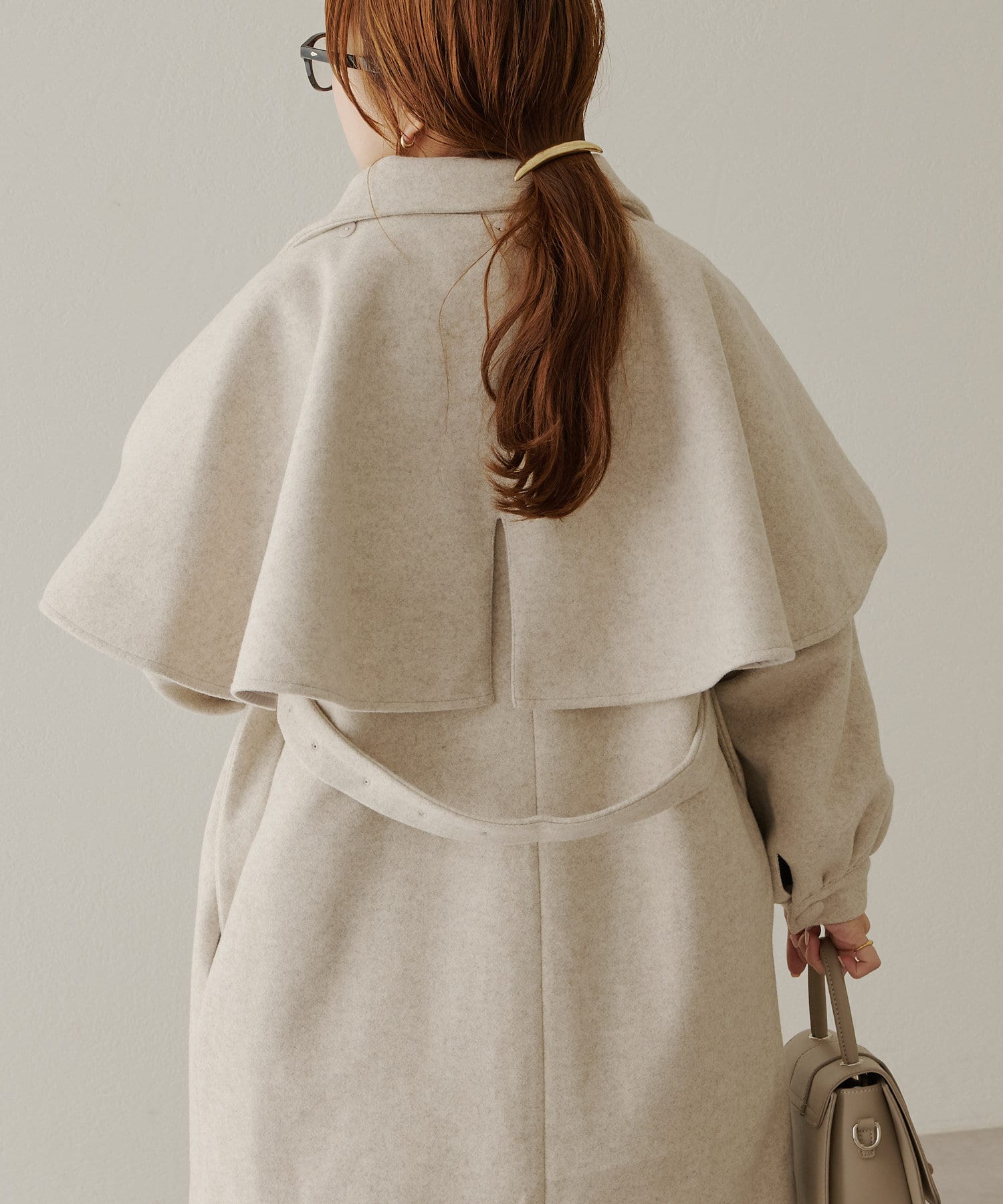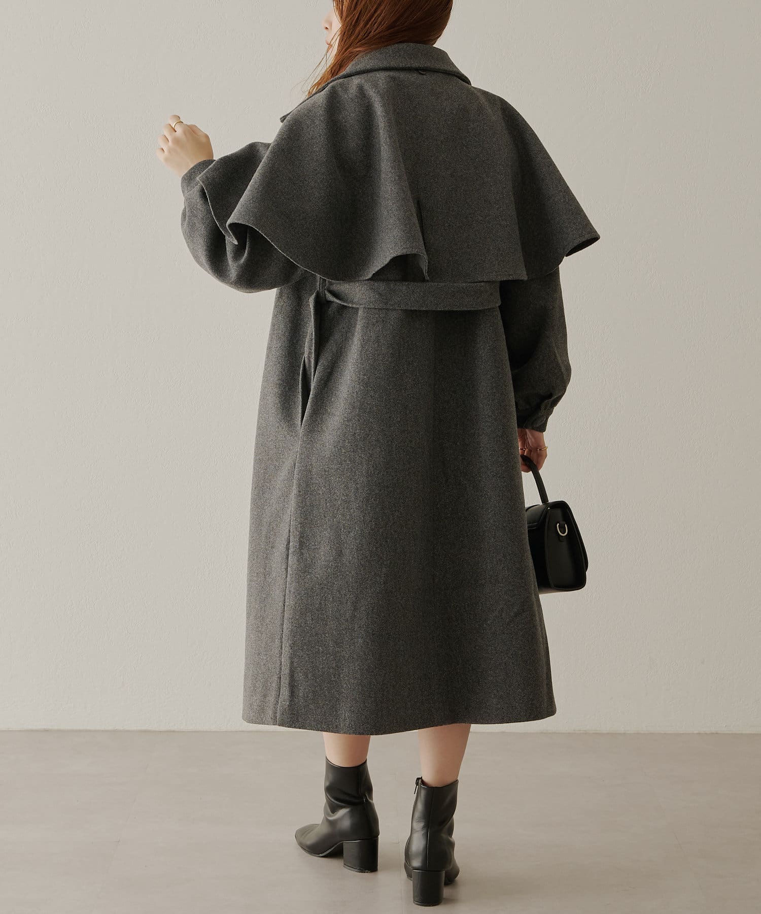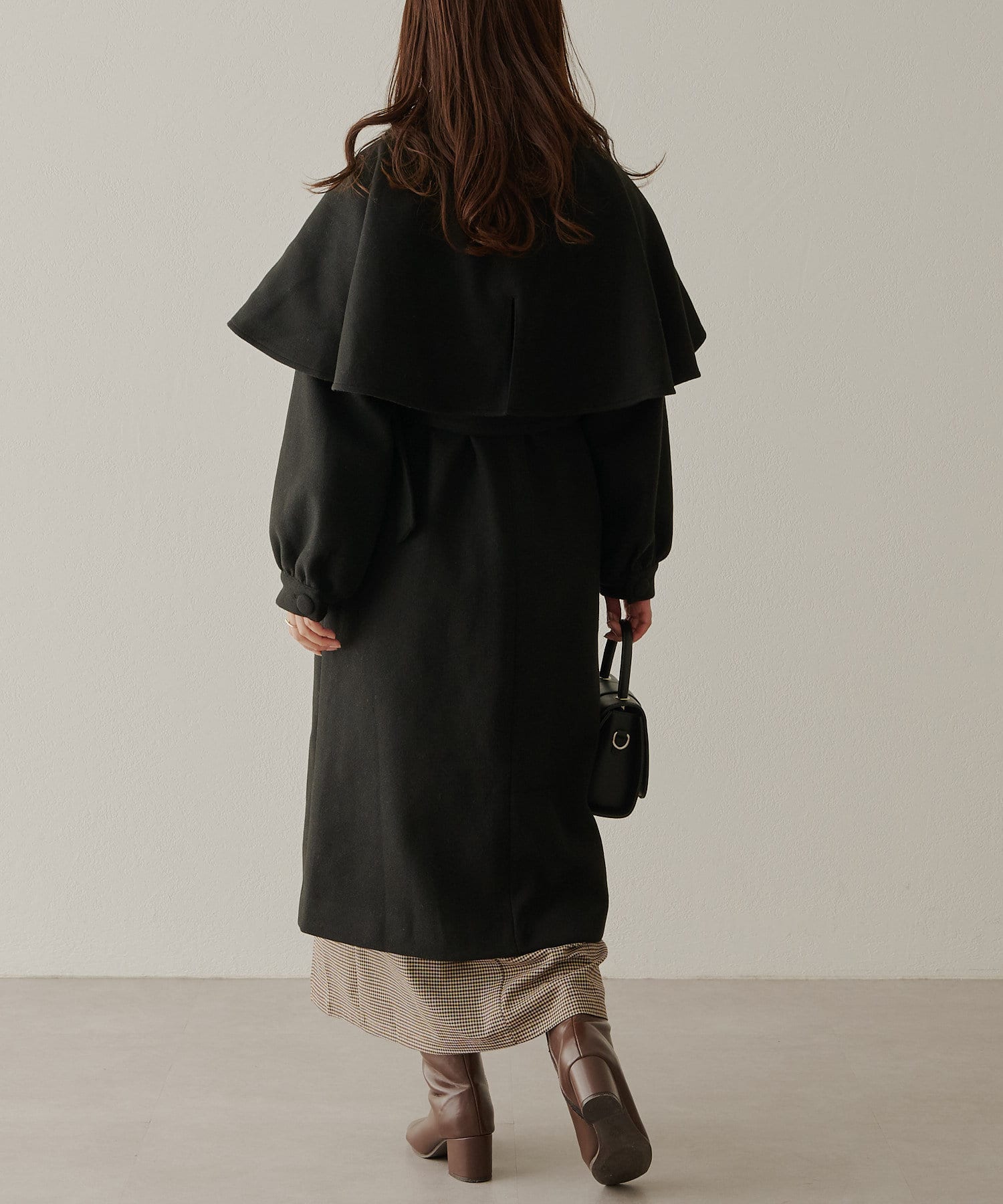 ・高級感のあるフェイクウールにトレンドのケープのデザインでバックスタイルも大人綺麗な印象に見せてくれます。