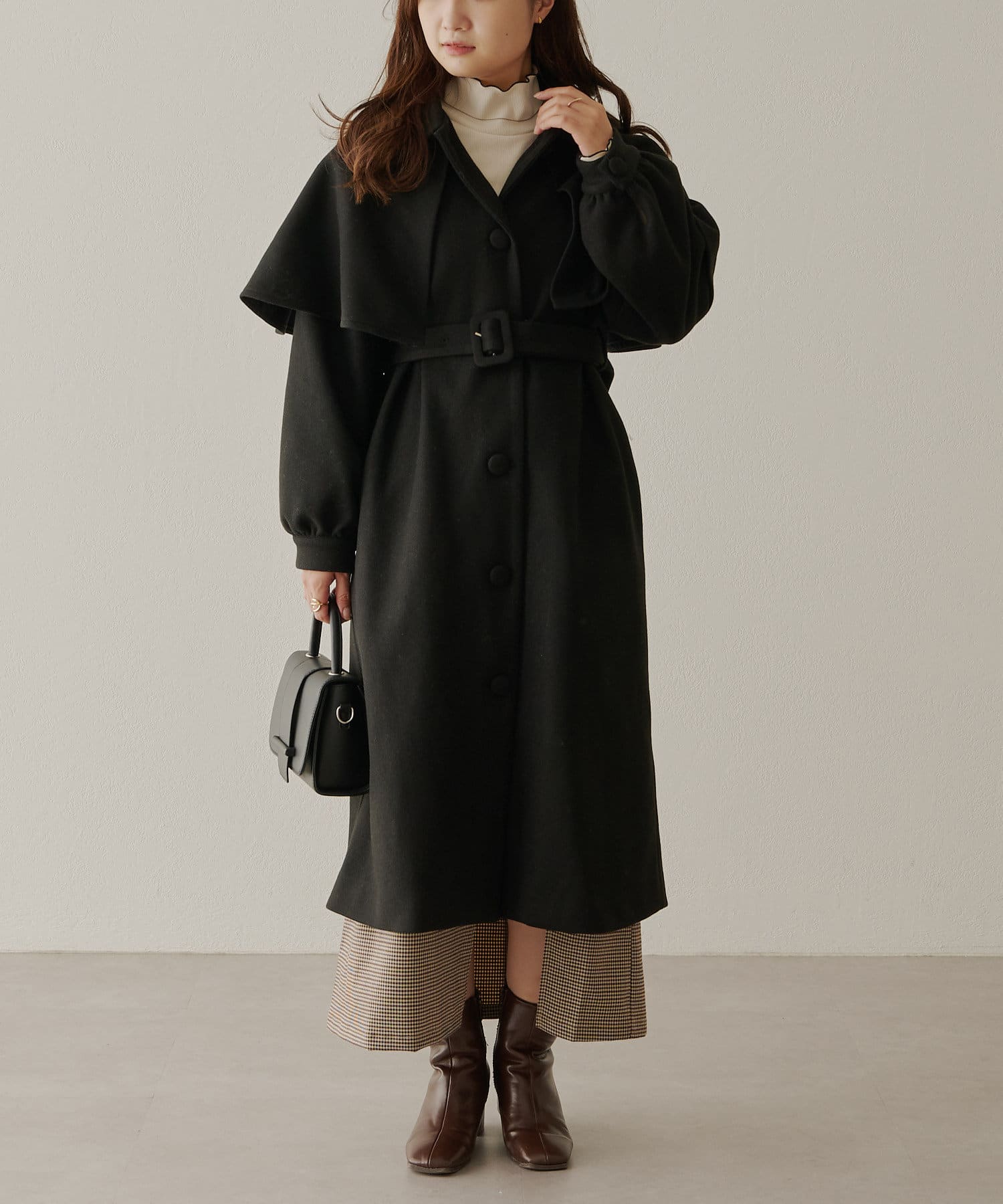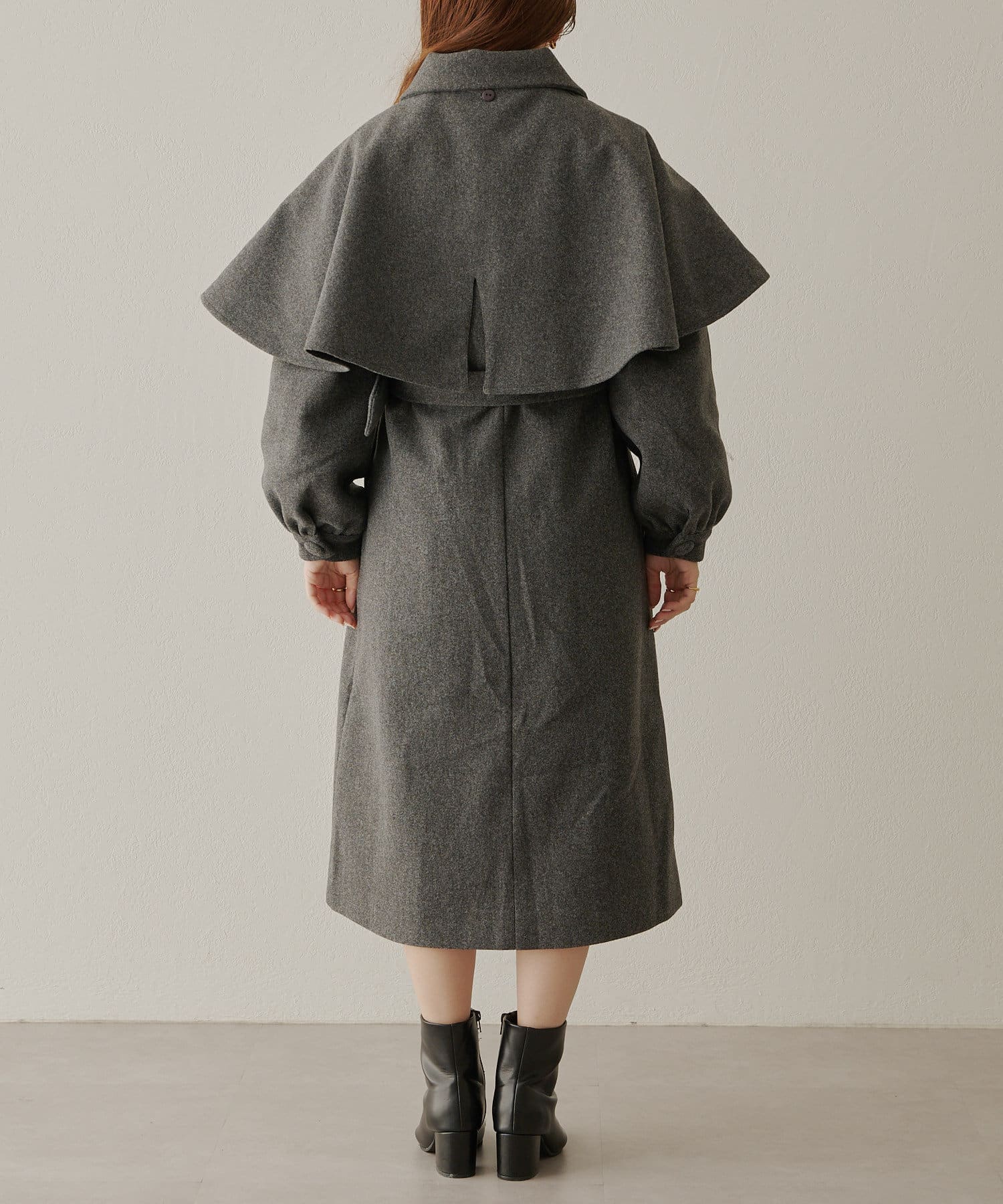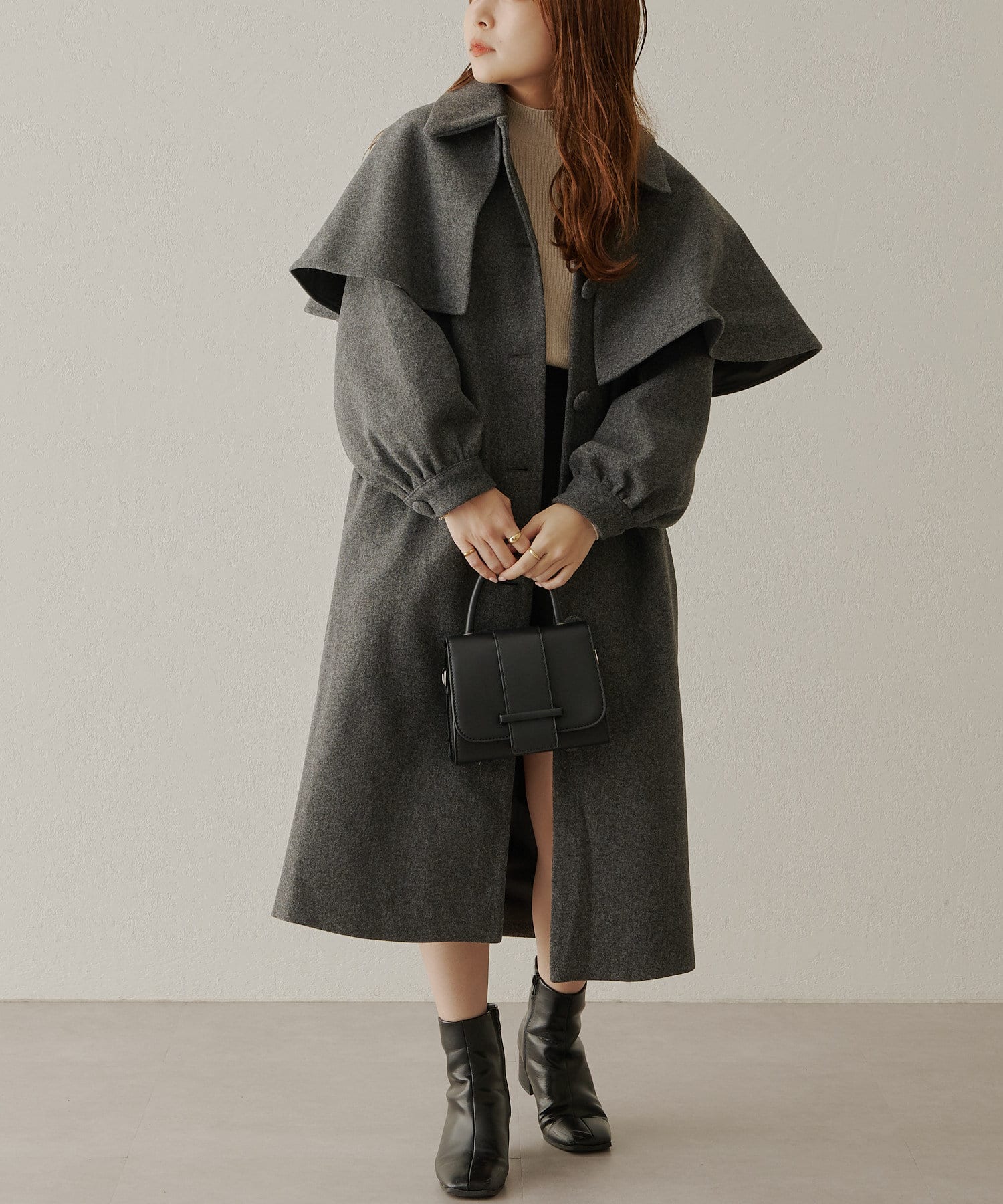 ・高級感のあるフェイクウールにトレンドのケープのデザインでバックスタイルも大人綺麗な印象に見せてくれます。
