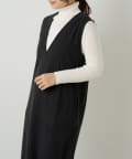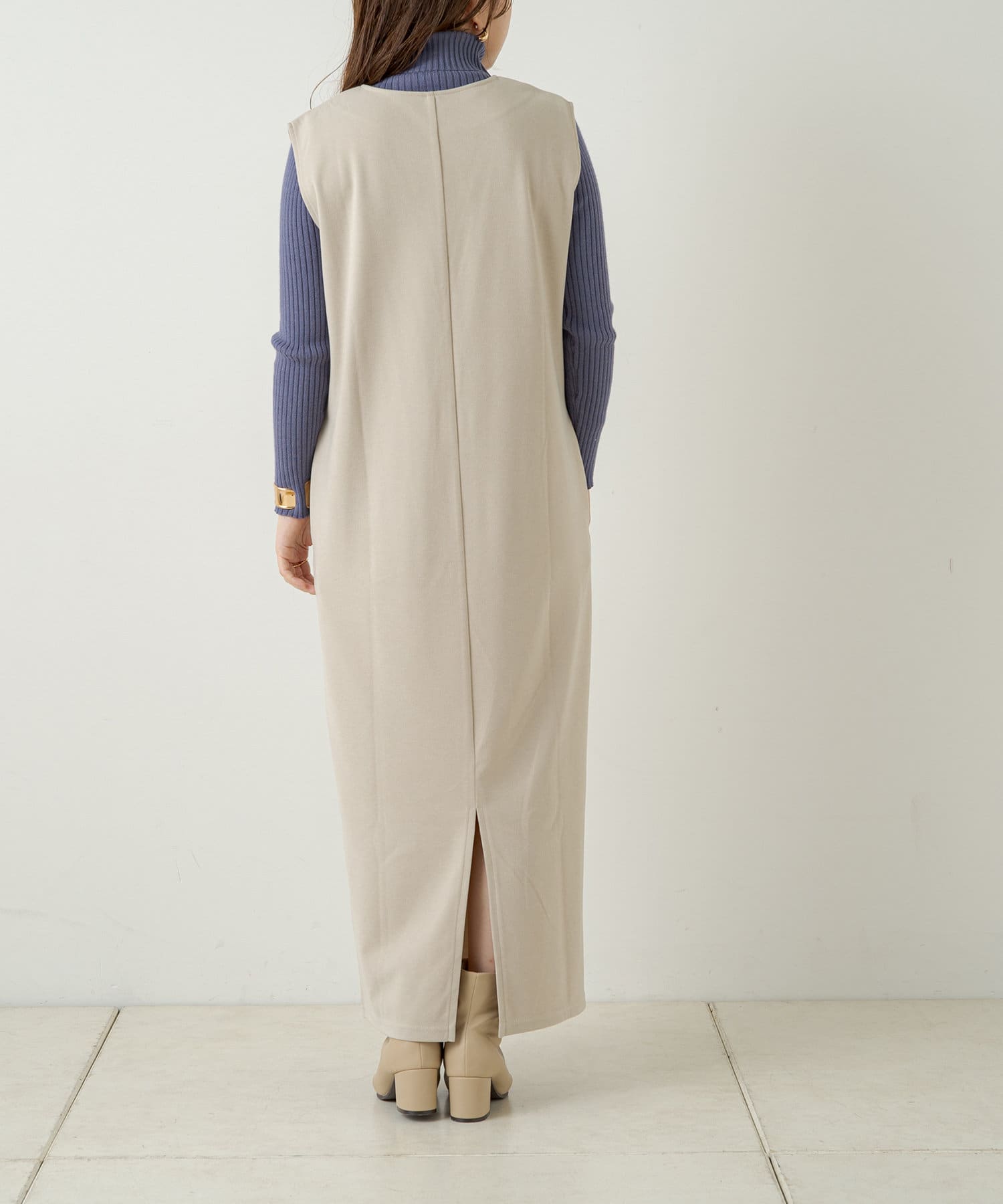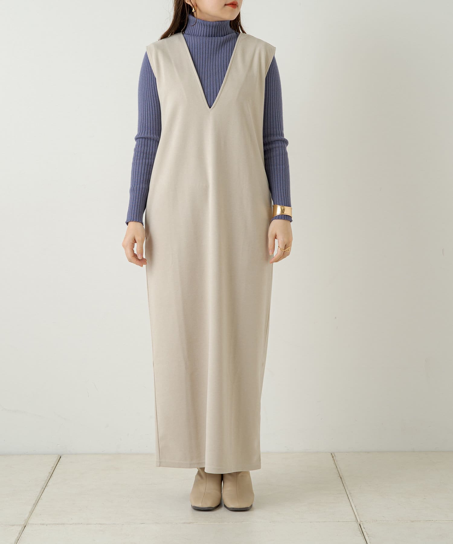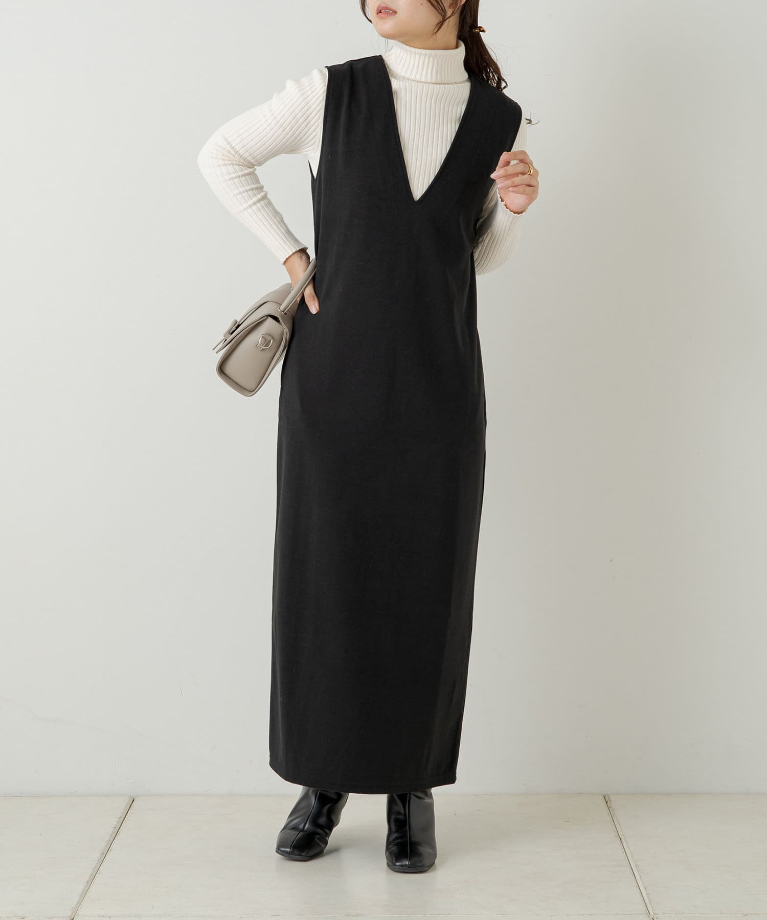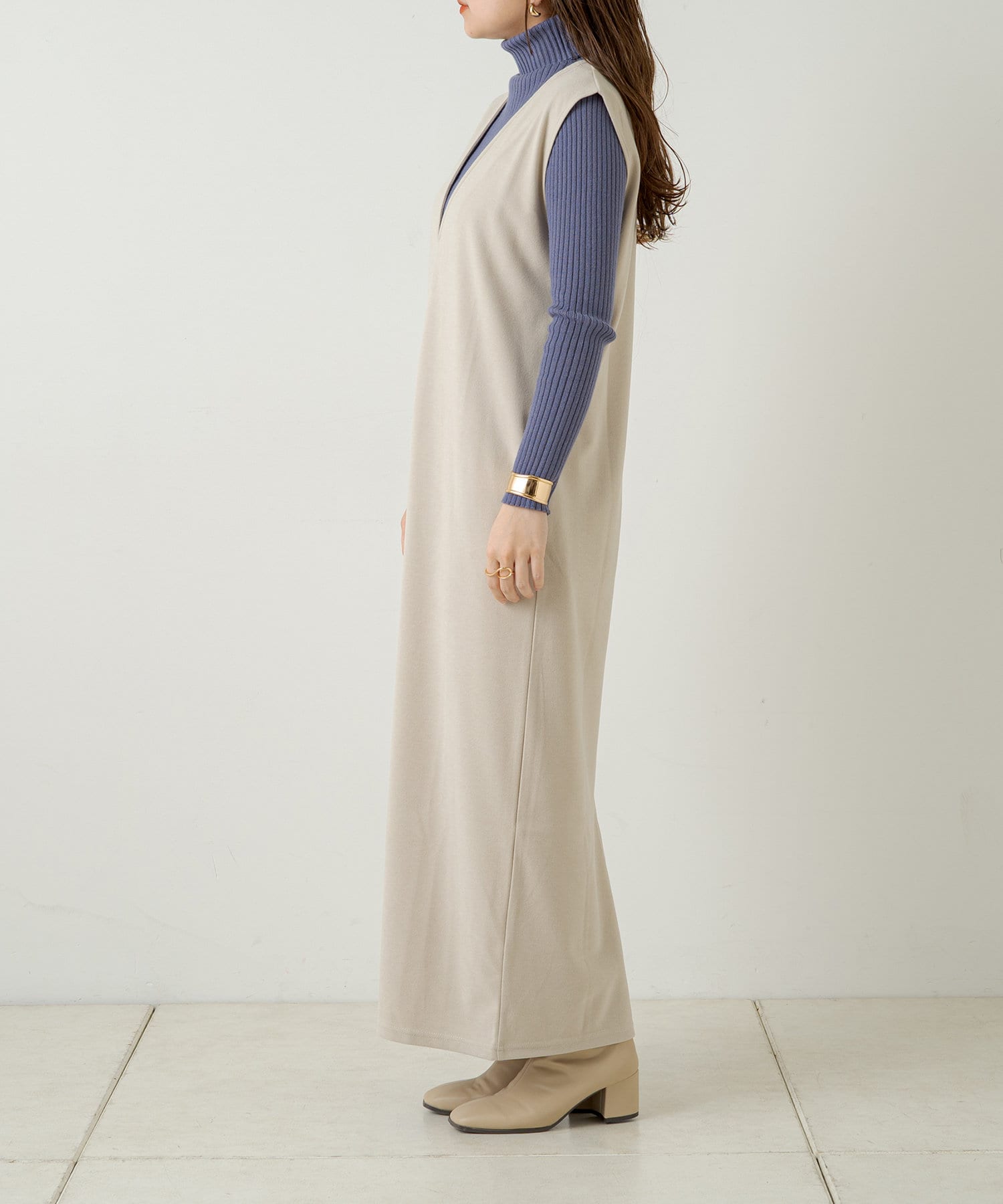 ・Vネックデザインがざっくりと深いディープVネックデザインは抜け感のあるトレンドデザインで、秋口にはロングTシャツやシャツブラウスをインして、真冬にはハイネックニットなどをインして着ていただくと、コーデが今っぽくきまるノースリーブロングベストワンピースです。