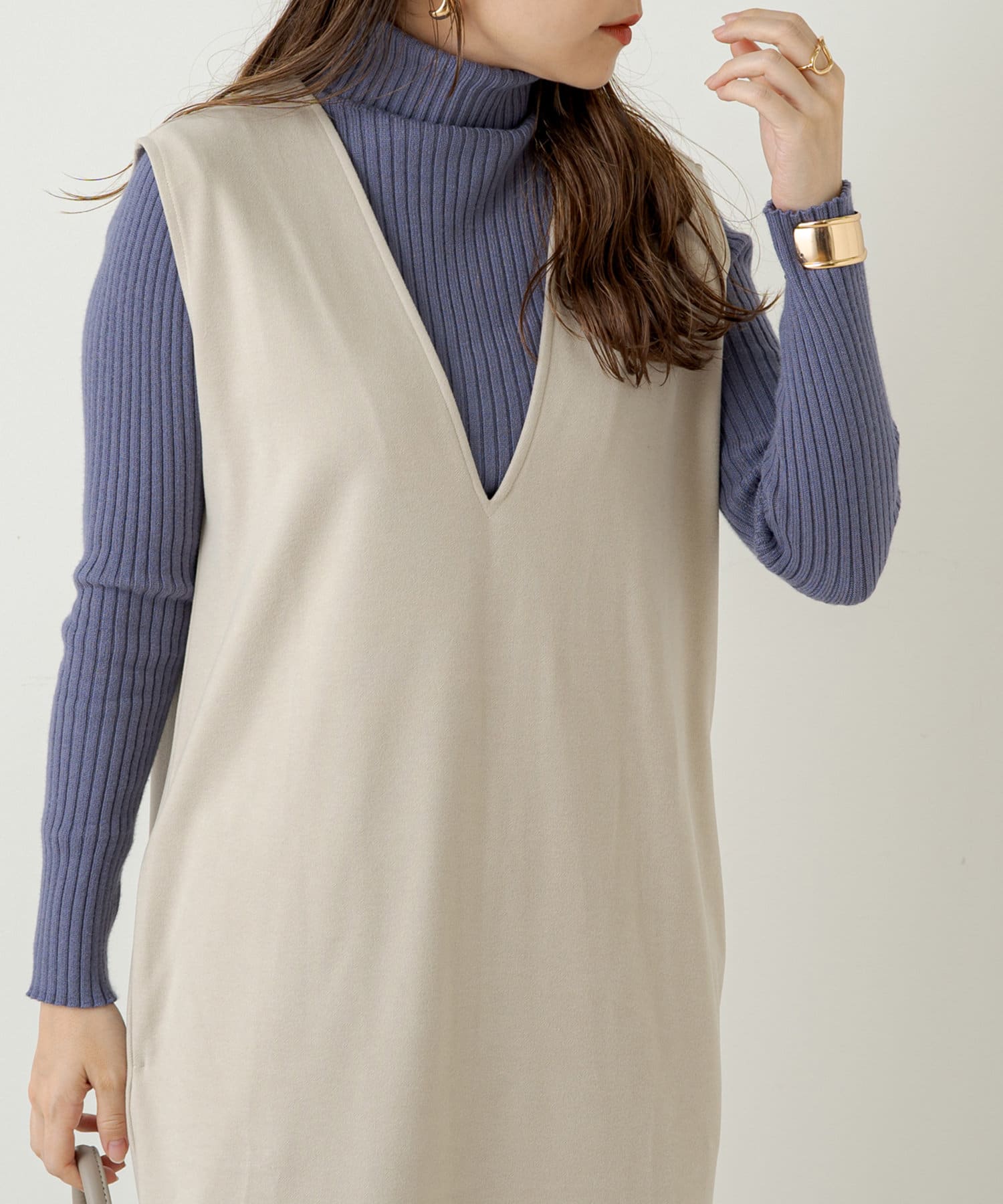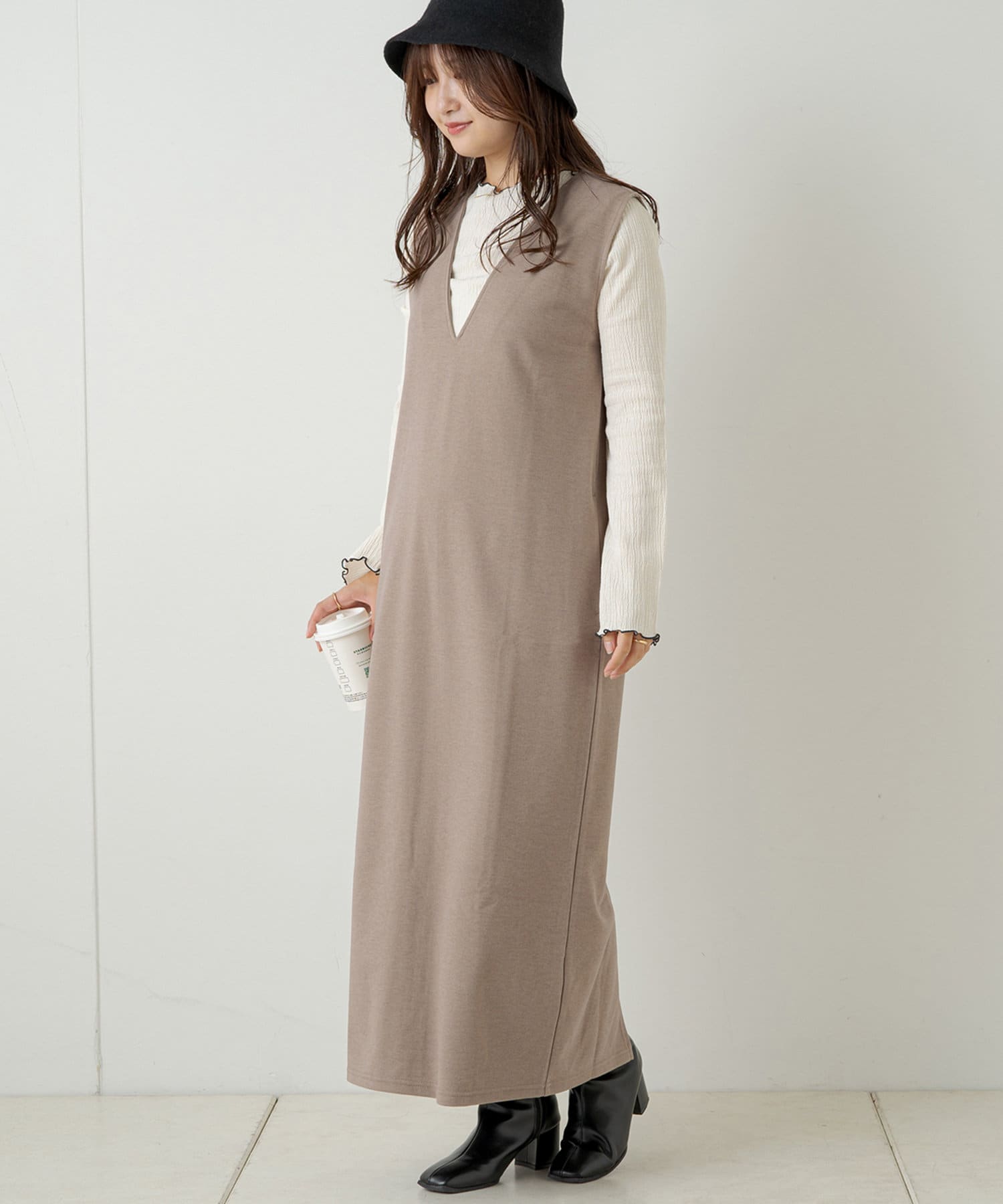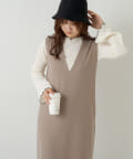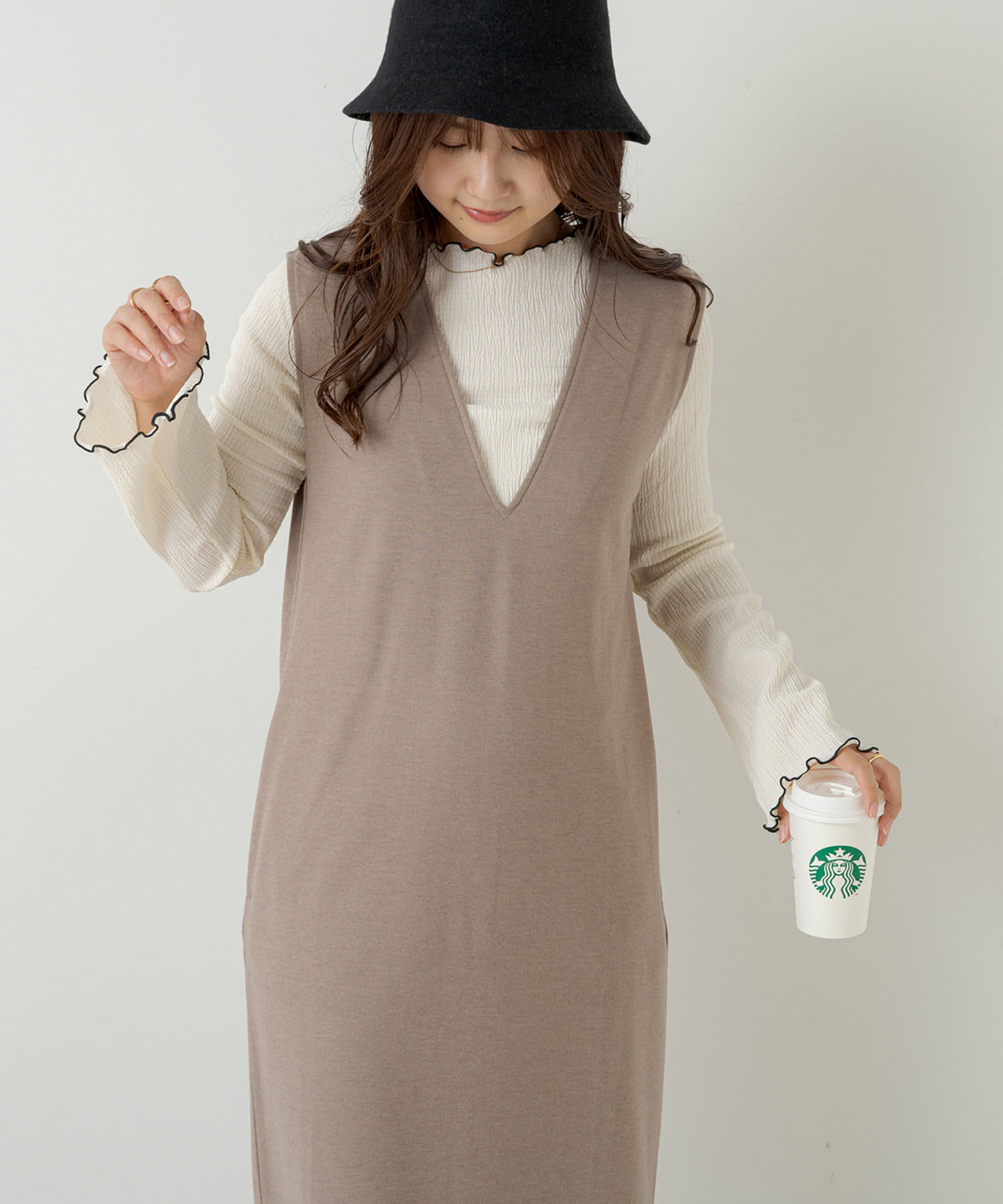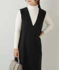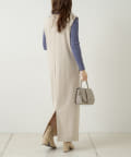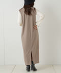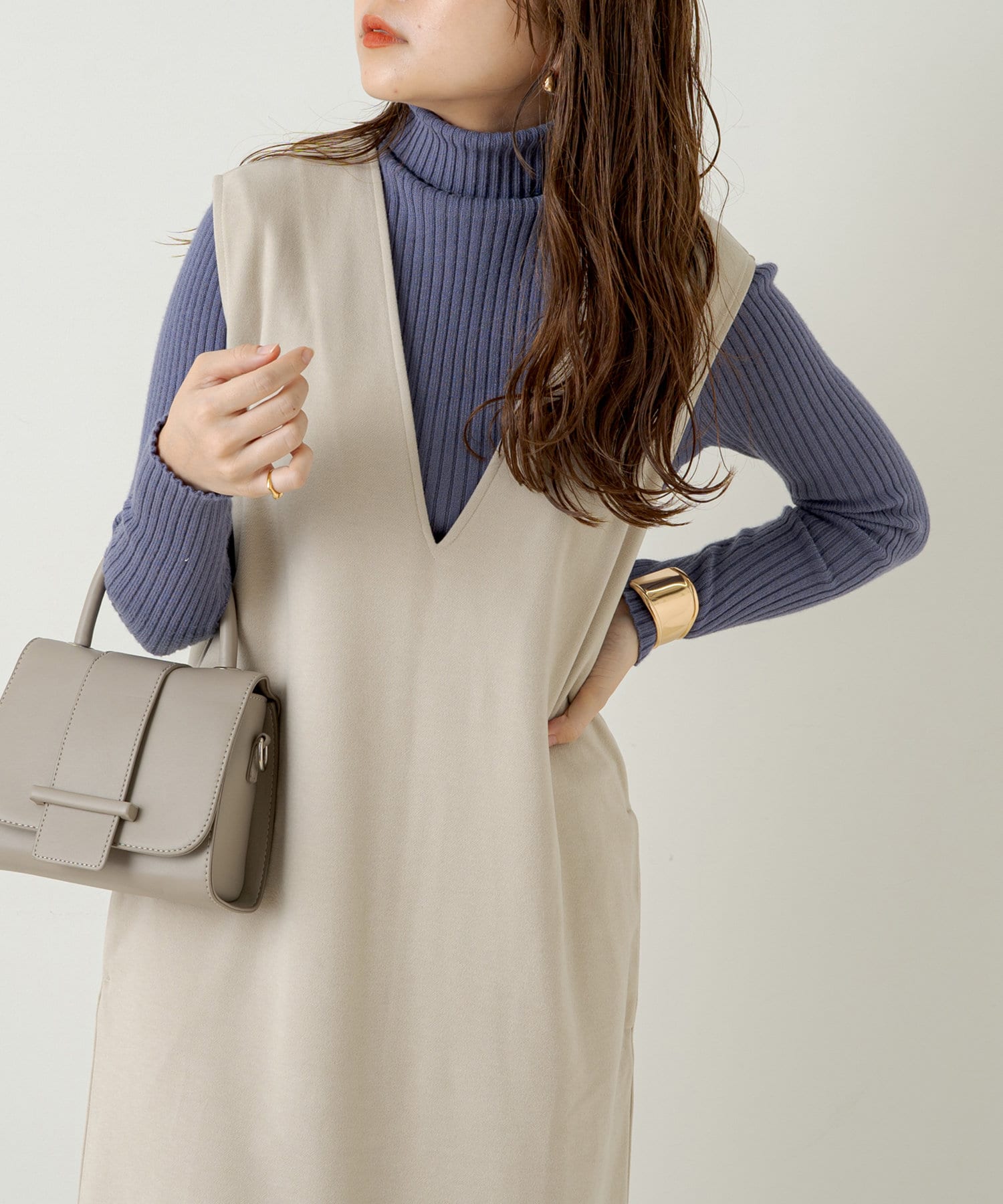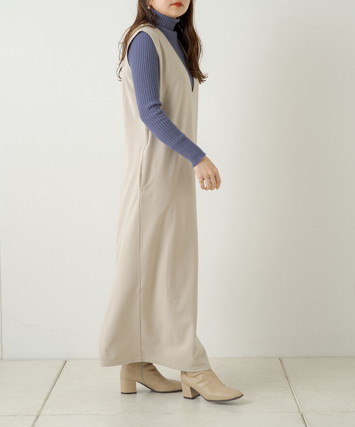 ・Vネックデザインがざっくりと深いディープVネックデザインは抜け感のあるトレンドデザインで、秋口にはロングTシャツやシャツブラウスをインして、真冬にはハイネックニットなどをインして着ていただくと、コーデが今っぽくきまるノースリーブロングベストワンピースです。