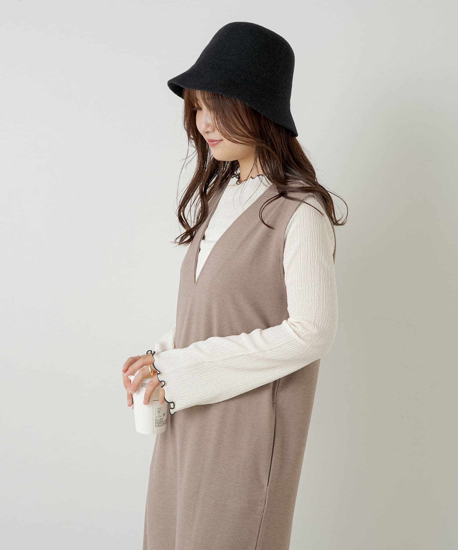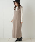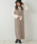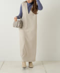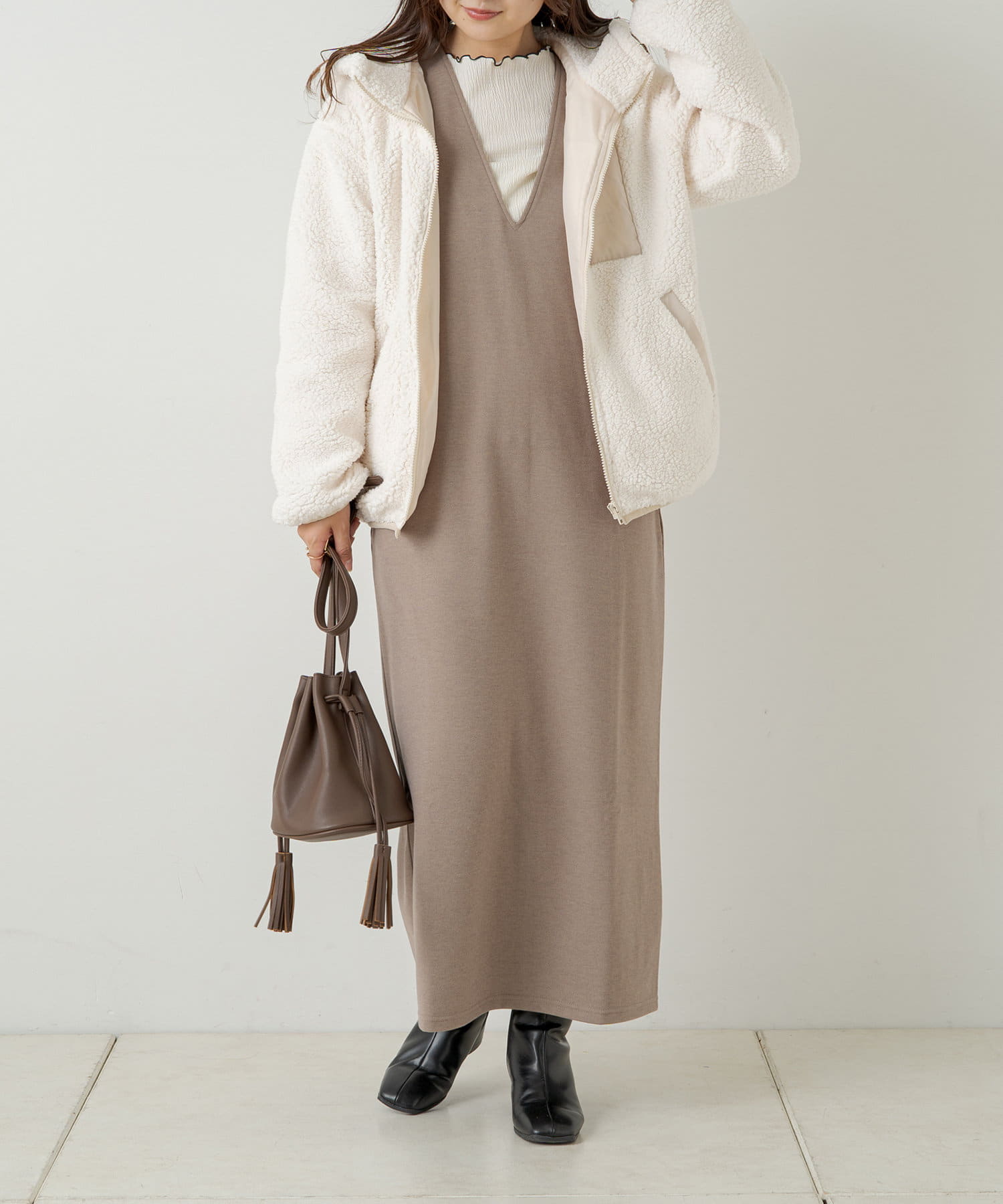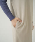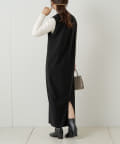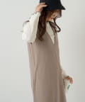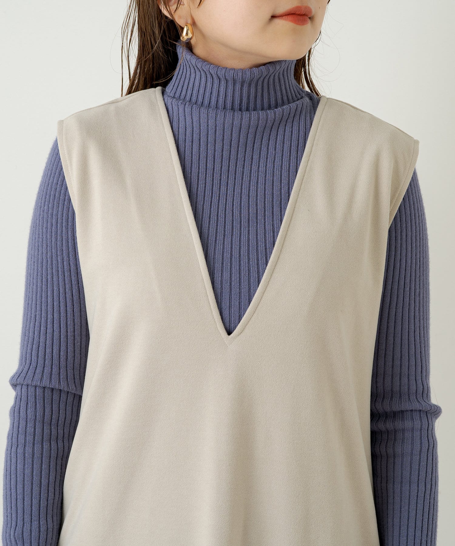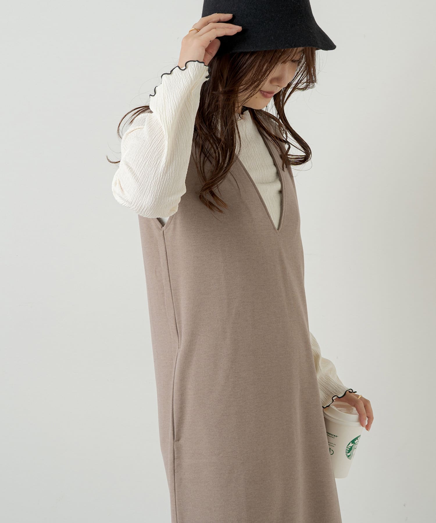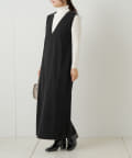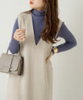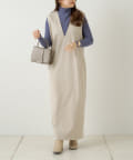 ・Vネックデザインがざっくりと深いディープVネックデザインは抜け感のあるトレンドデザインで、秋口にはロングTシャツやシャツブラウスをインして、真冬にはハイネックニットなどをインして着ていただくと、コーデが今っぽくきまるノースリーブロングベストワンピースです。