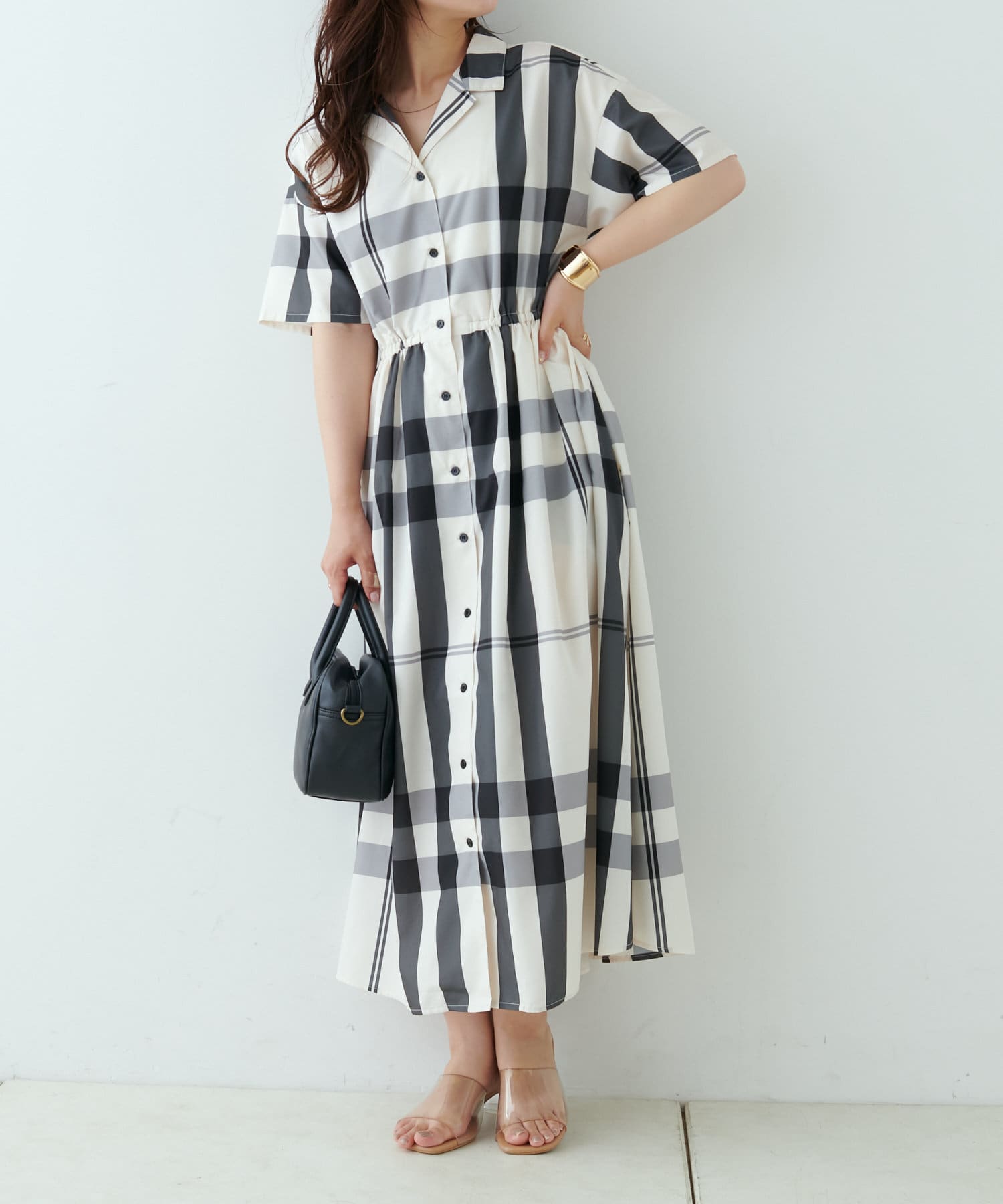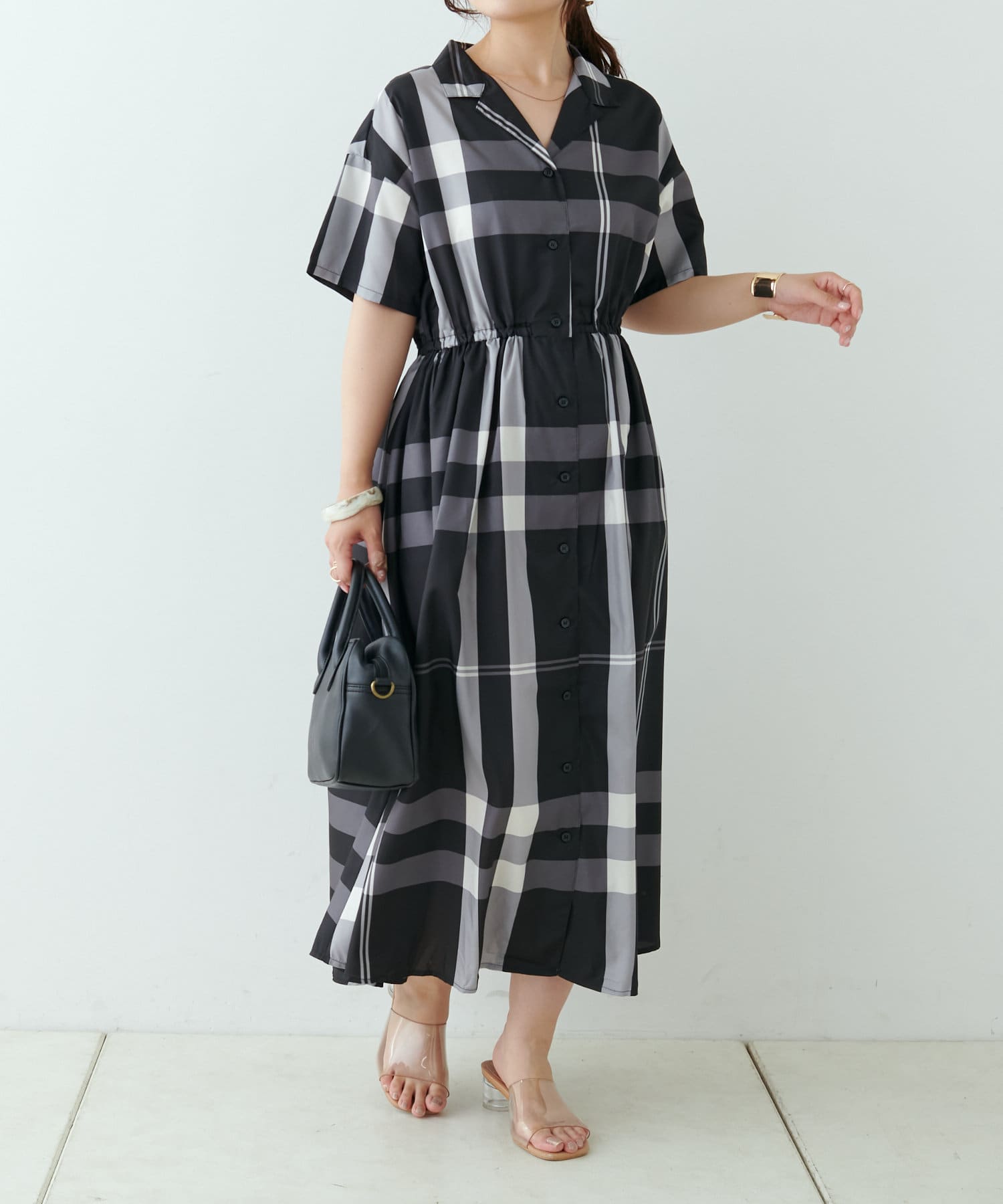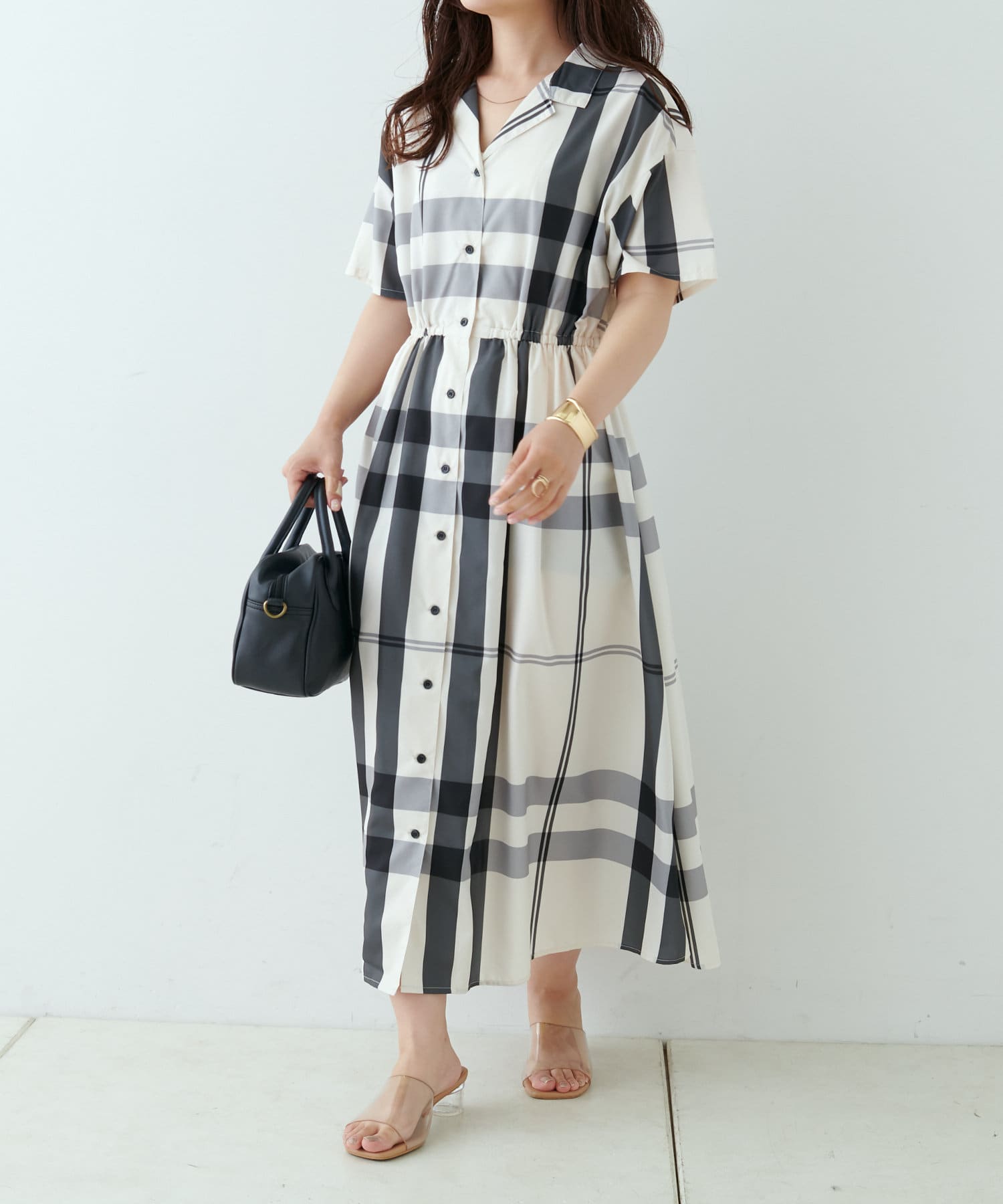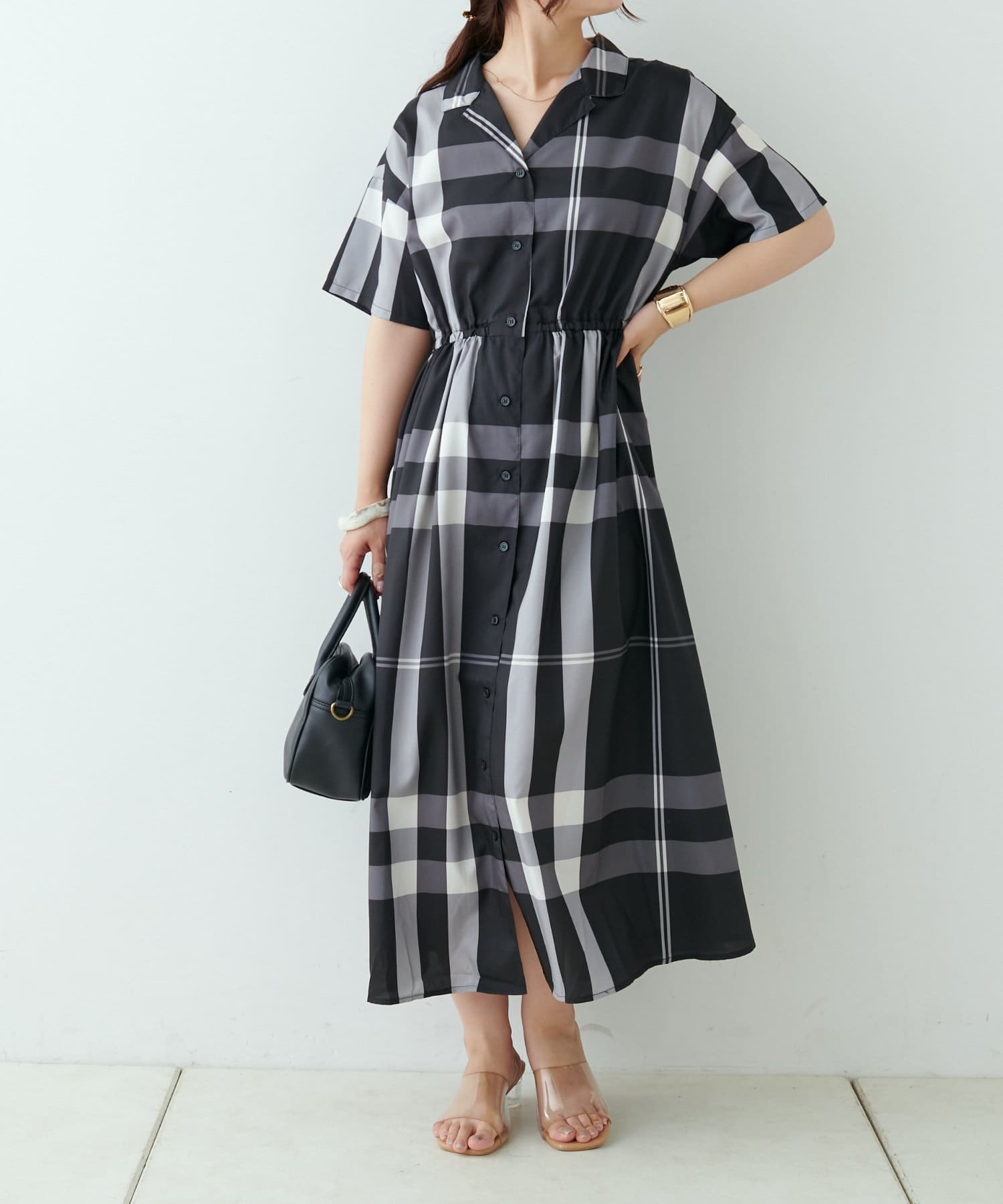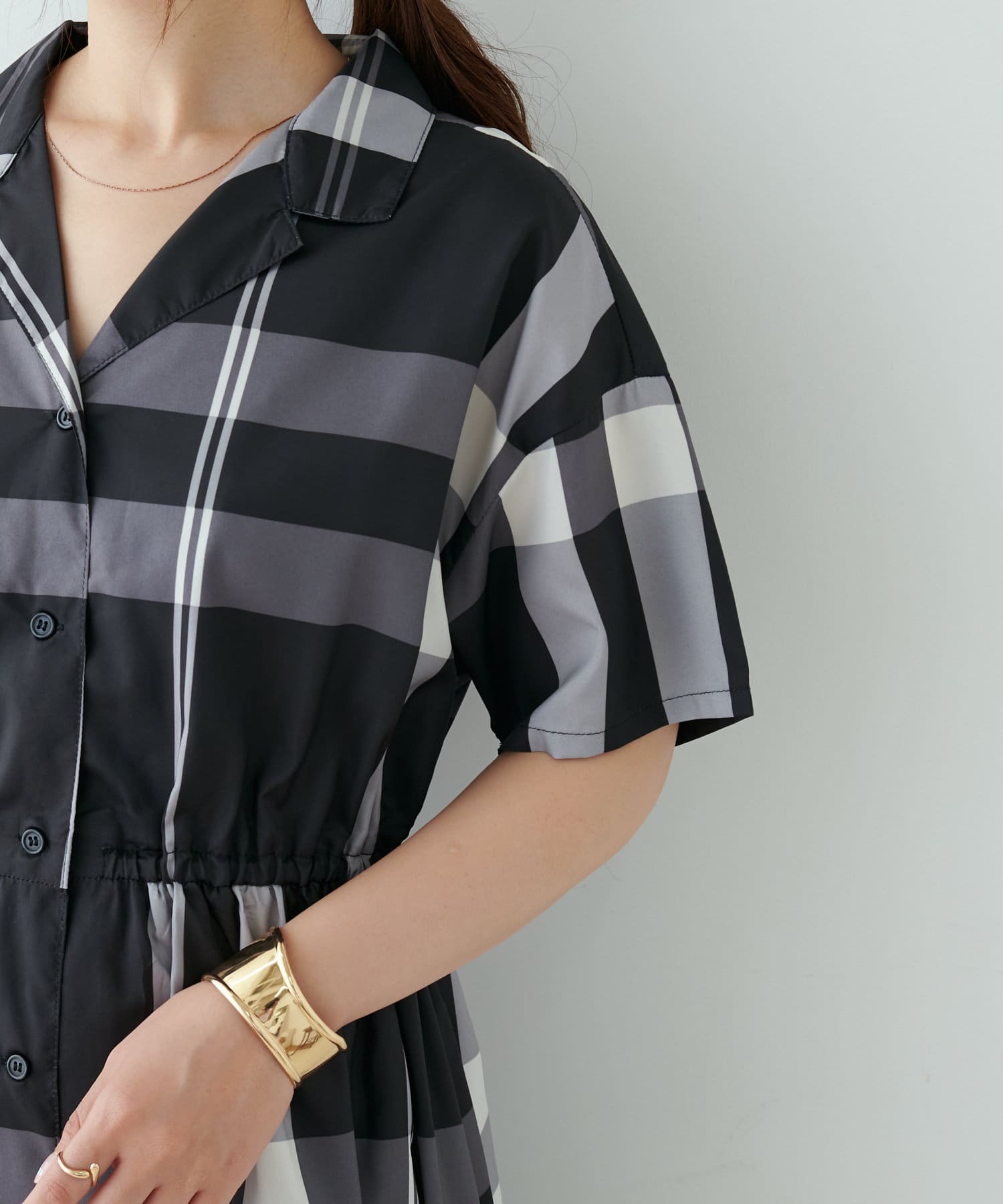 【同柄のスカートも大人気】チェック開襟シャツワンピース