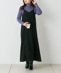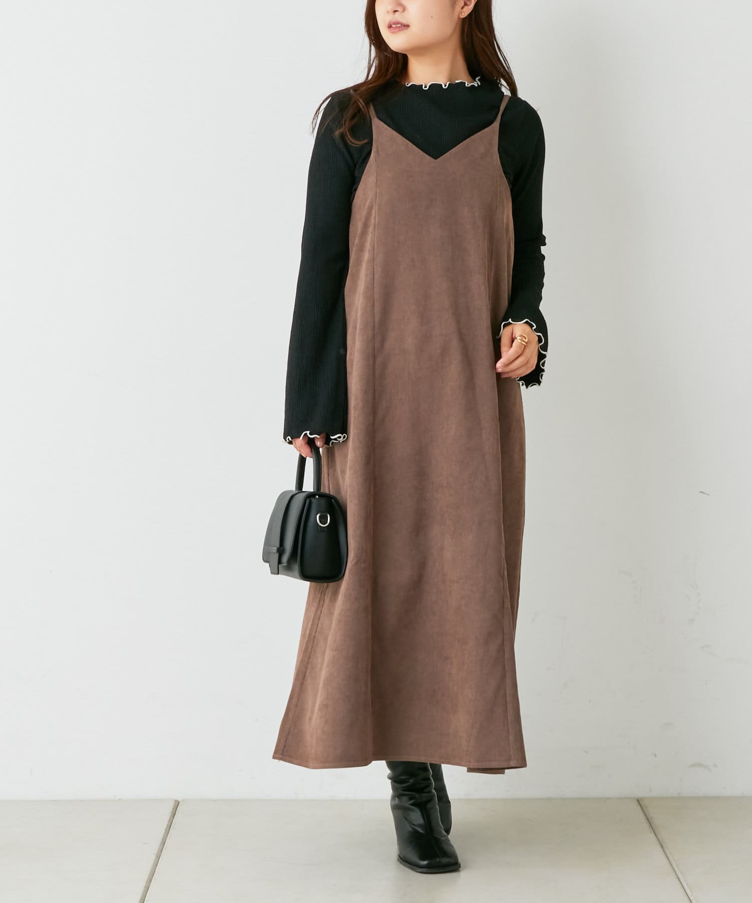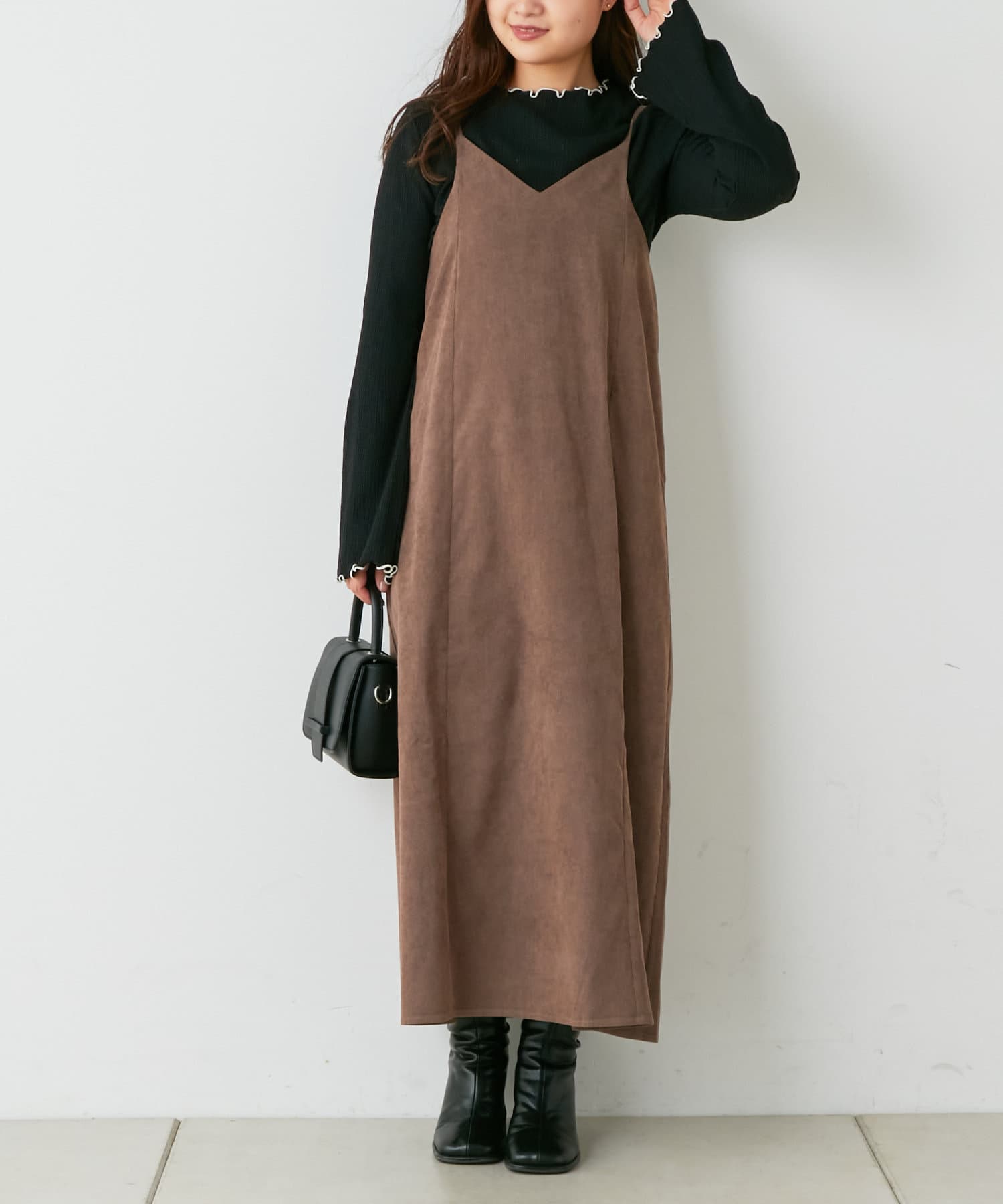 ・カジュアルに着たい気分の時は、リブインナーを合わせて。足元はブーツを選ぶと女性らしい印象に。