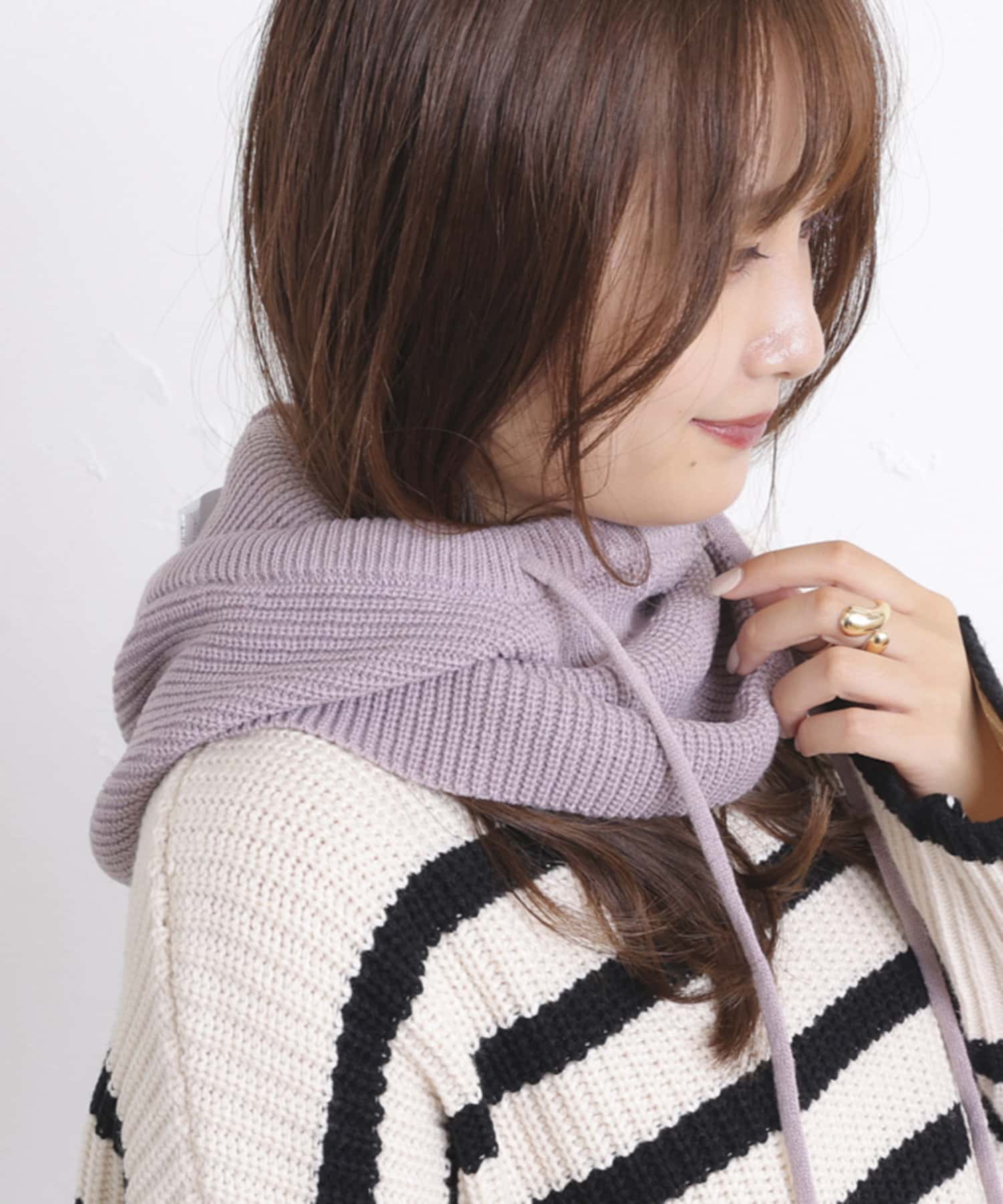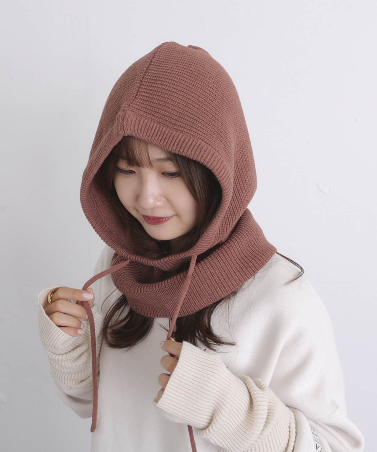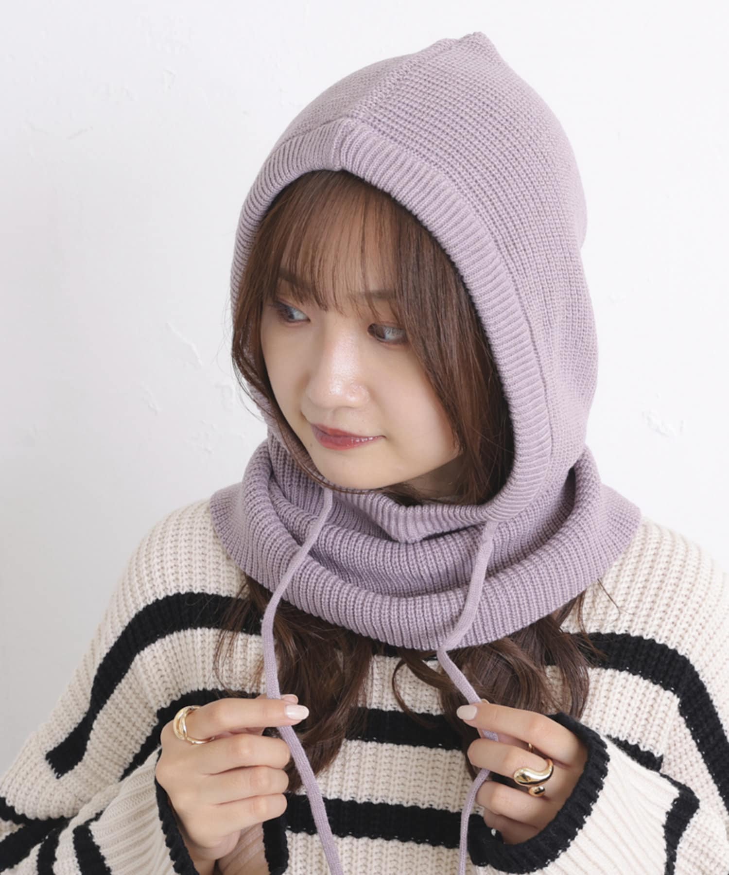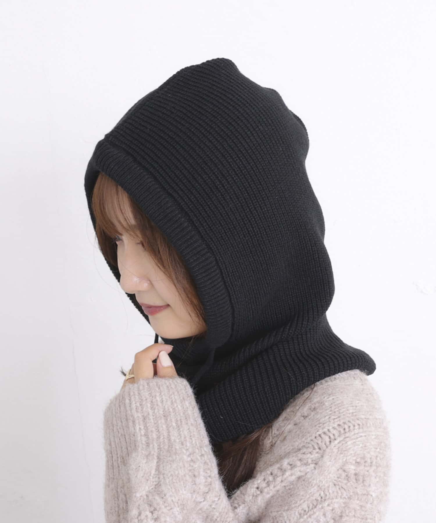 ・紐で顔周りのサイズ調整ができるので、お好みでシルエットを変えていただけます。