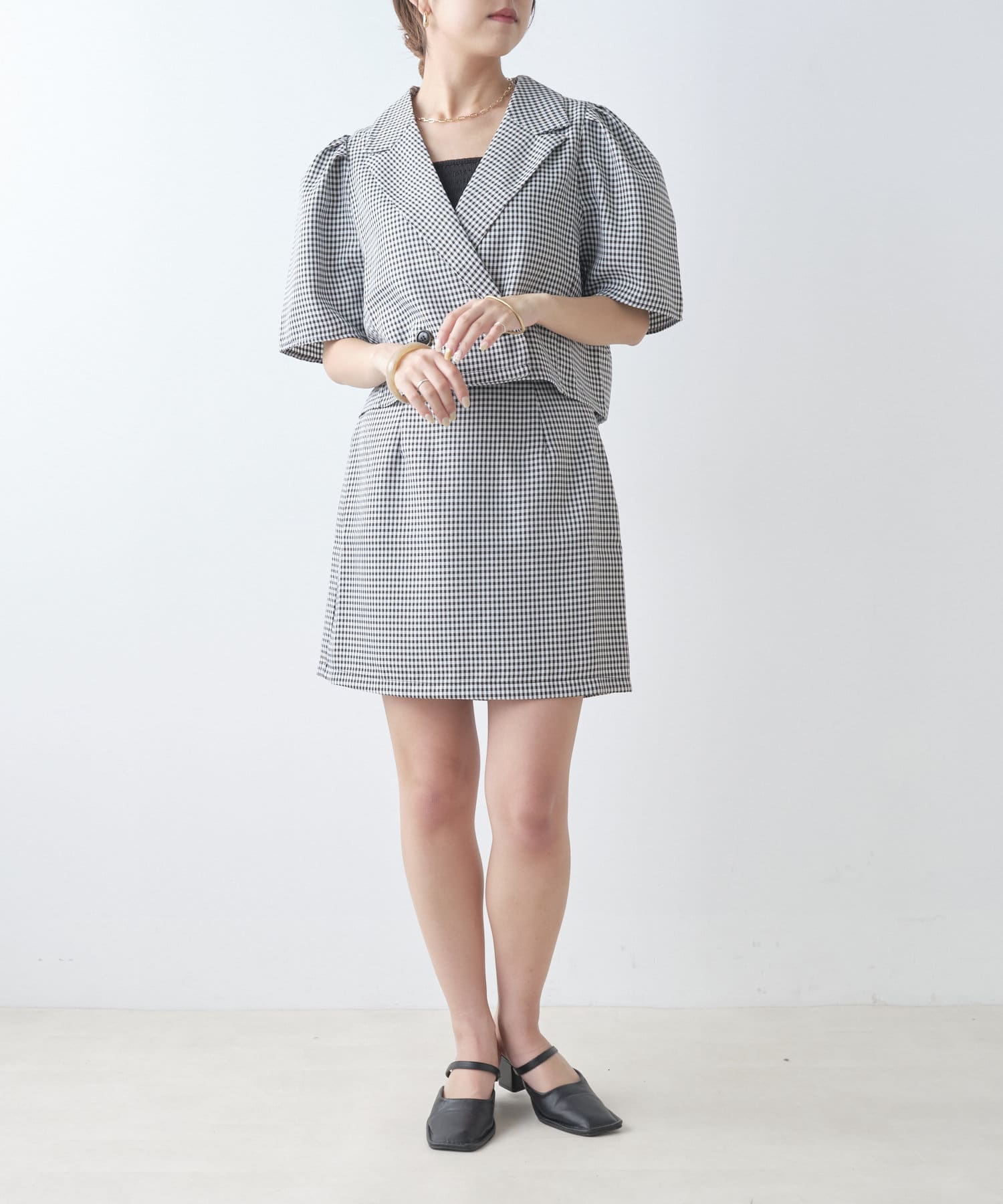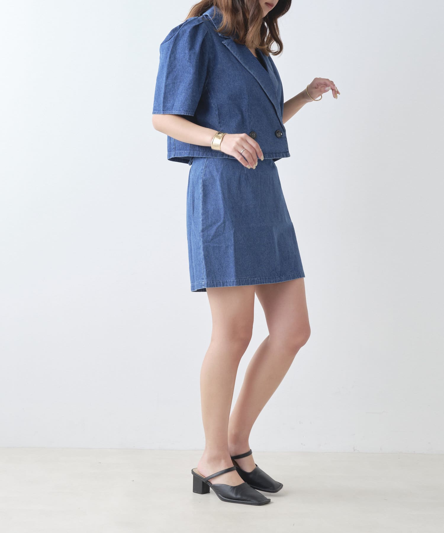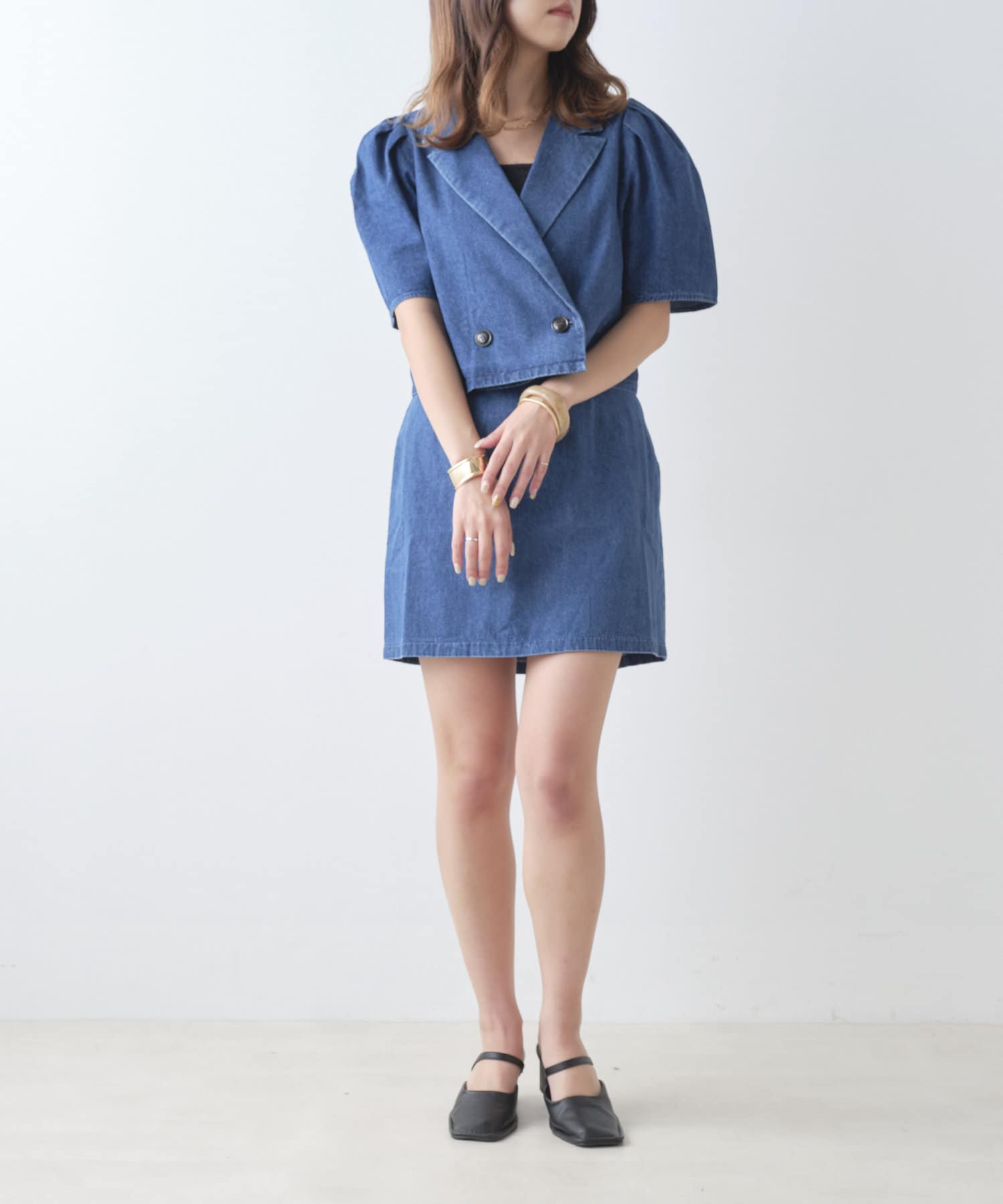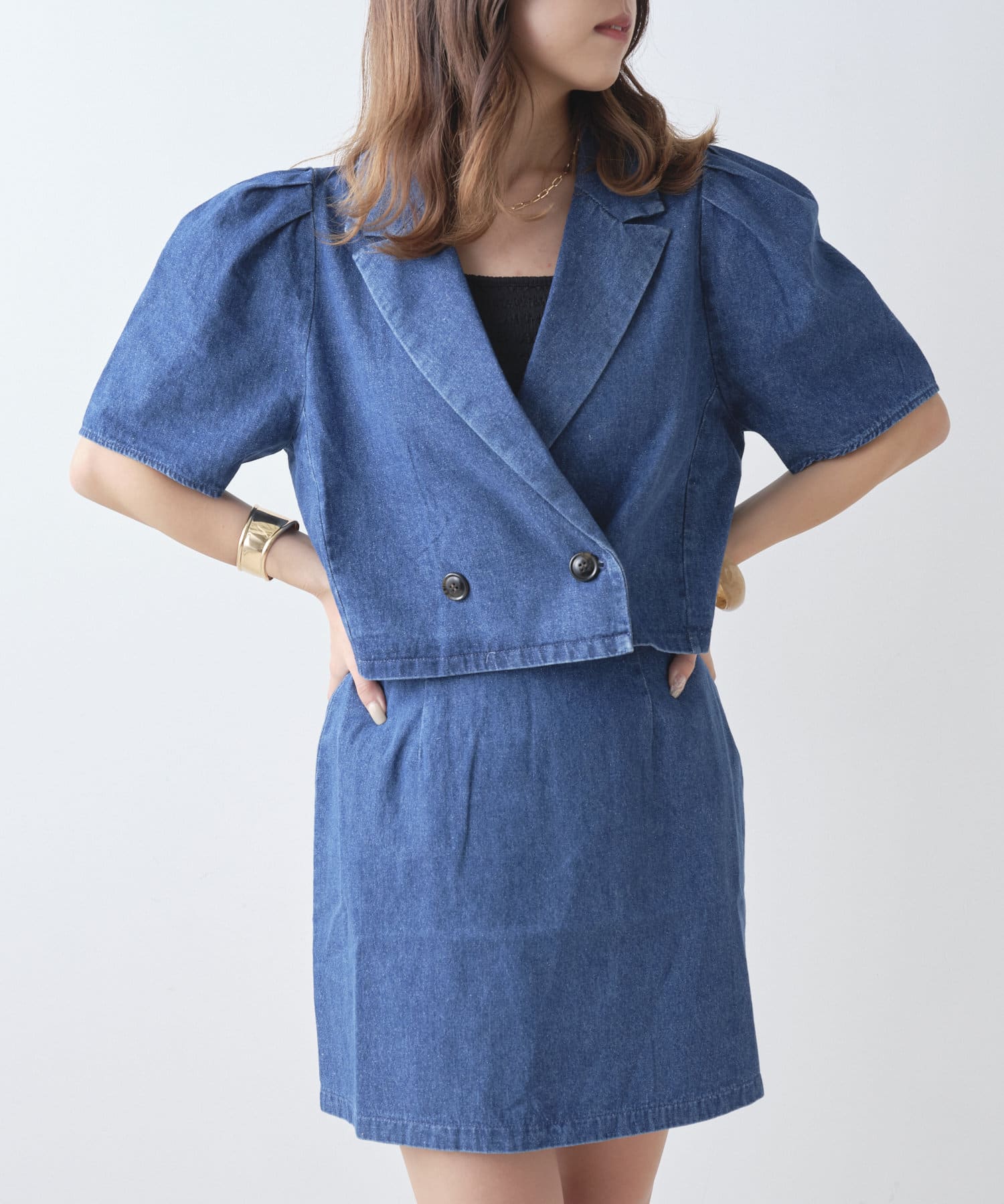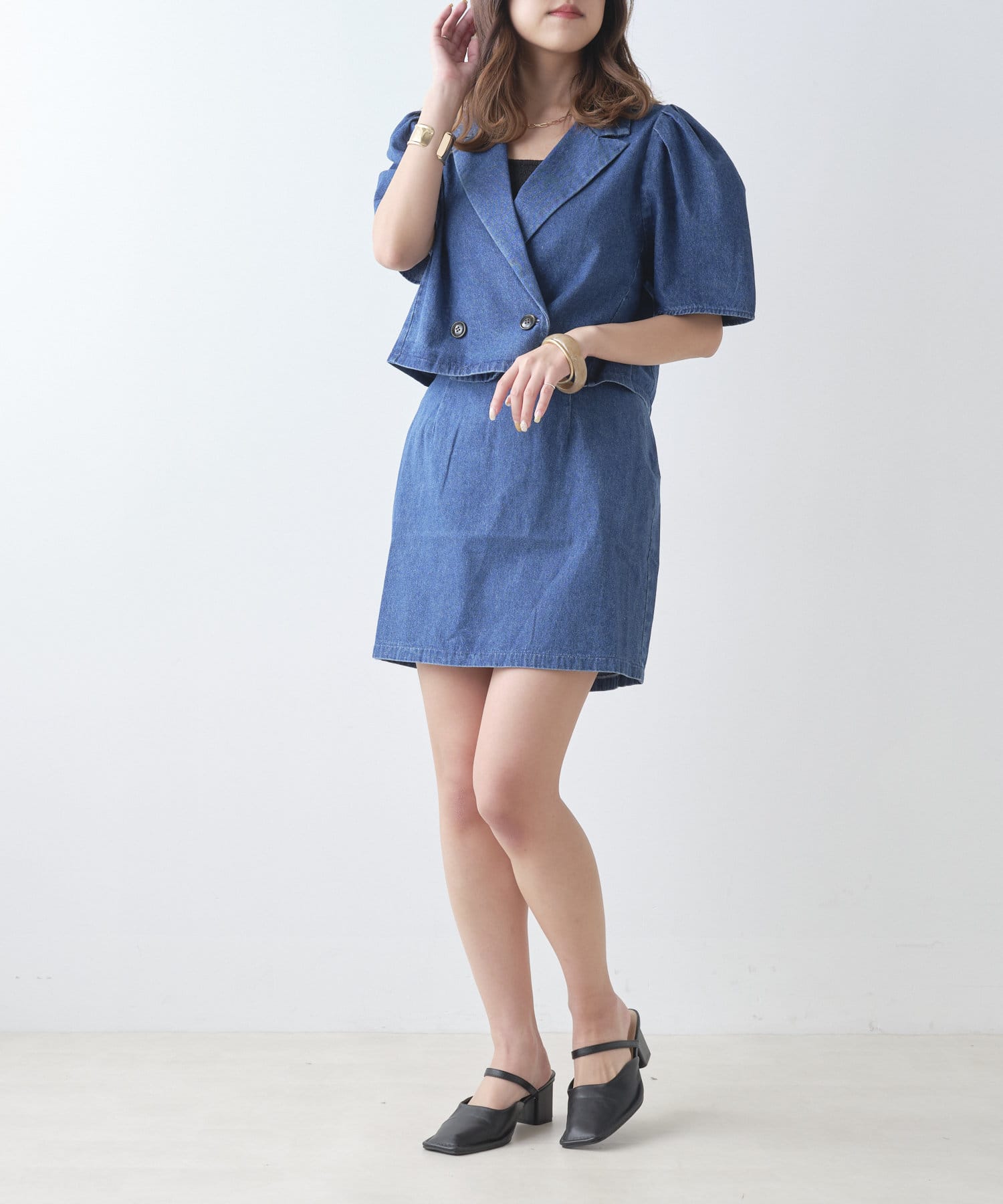 ・同型素材アイテムのSETUPもおすすめですが、お手持ちのトップスと合わせられるのもおすすめポイント。
