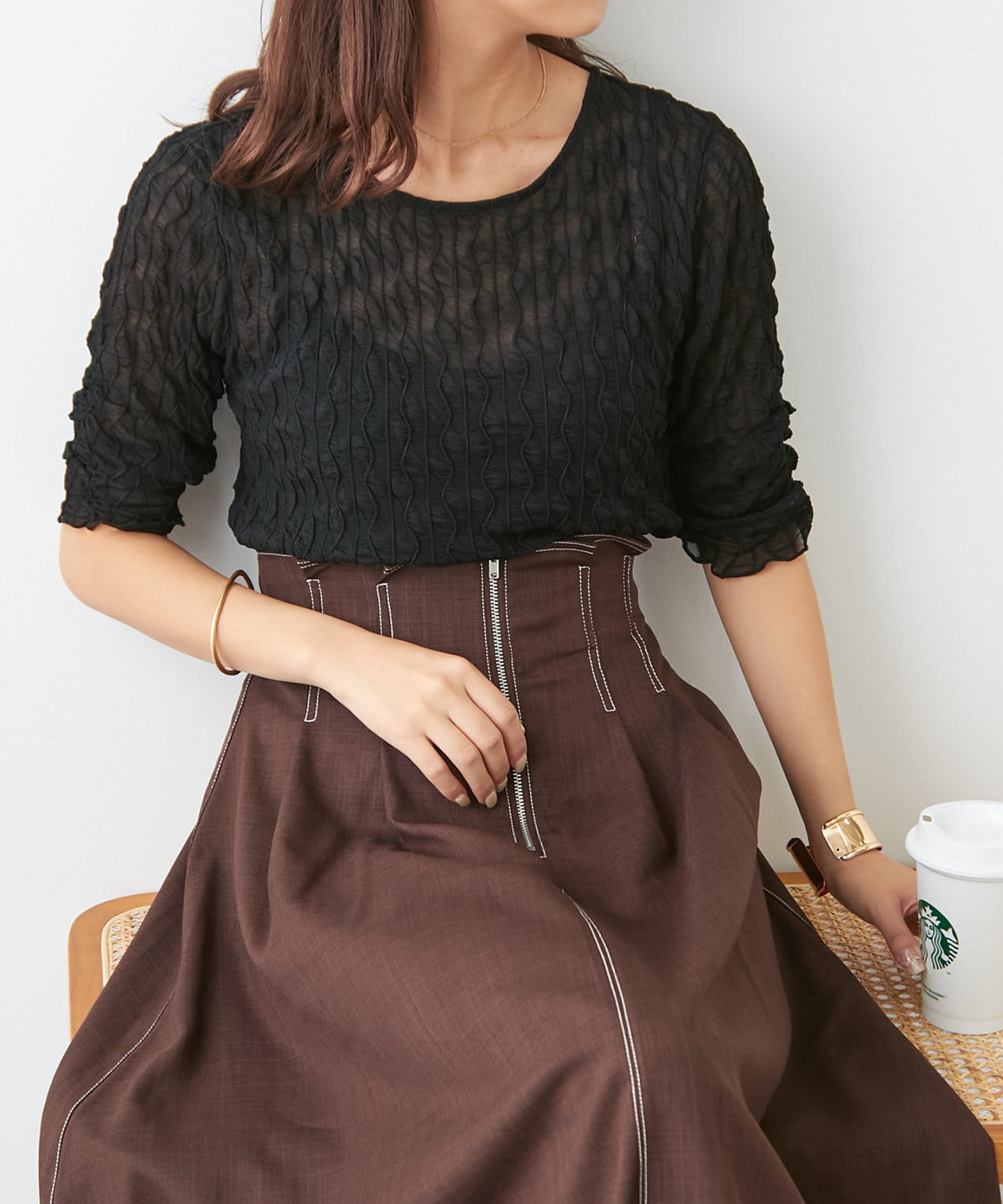 ・すっきりとしたウエスト周りのデザインなのでトップスインスタイルがおすすめ。