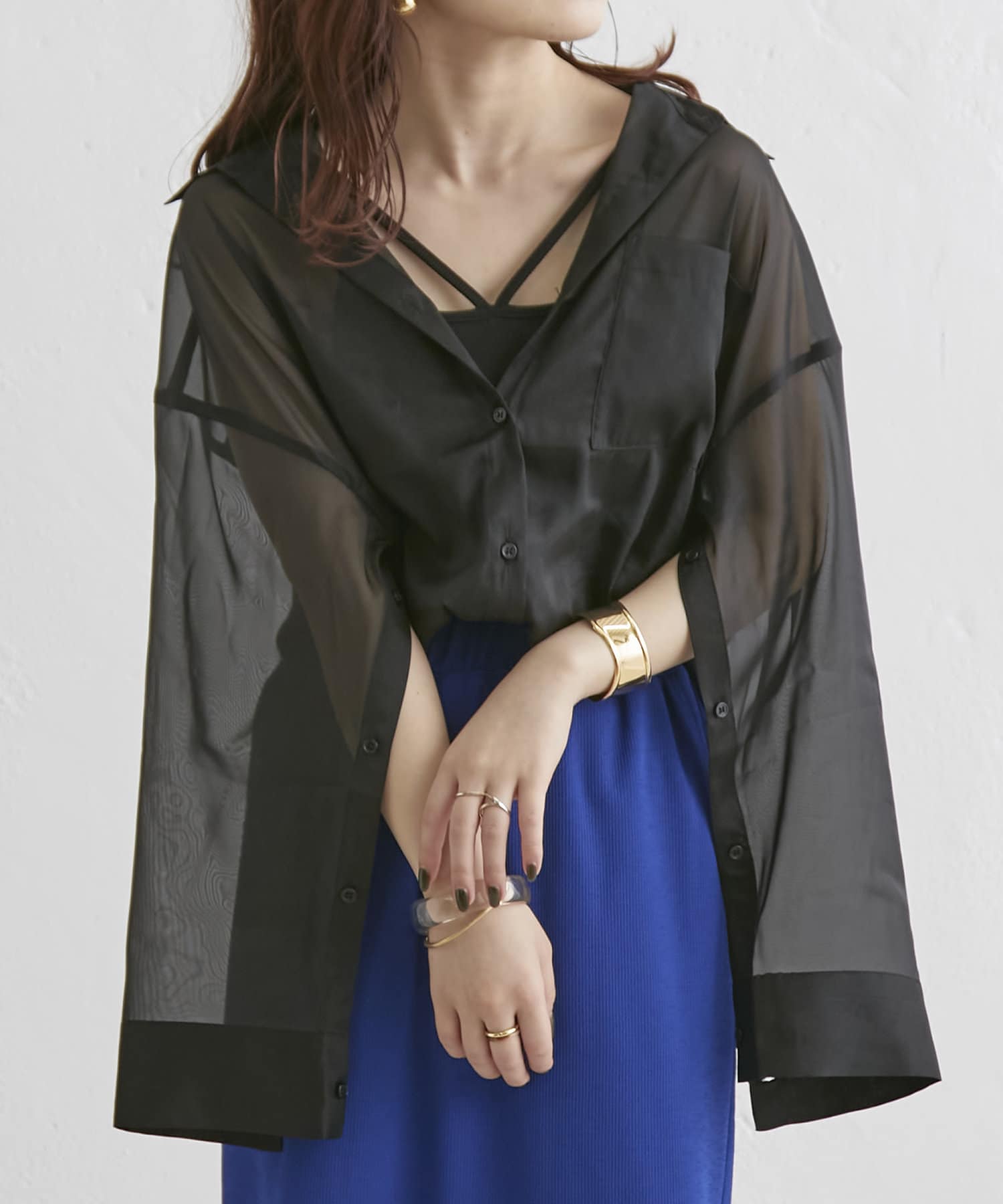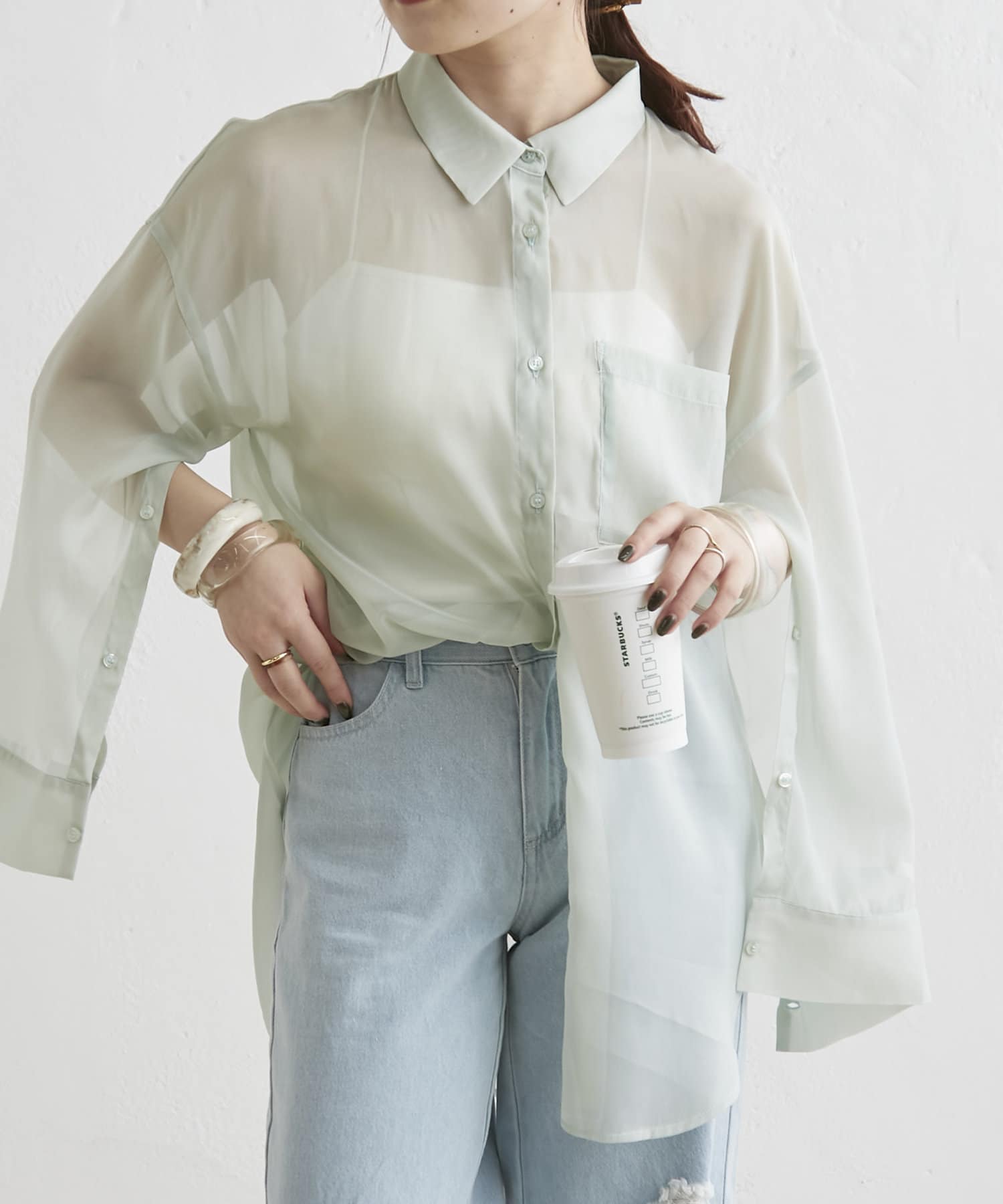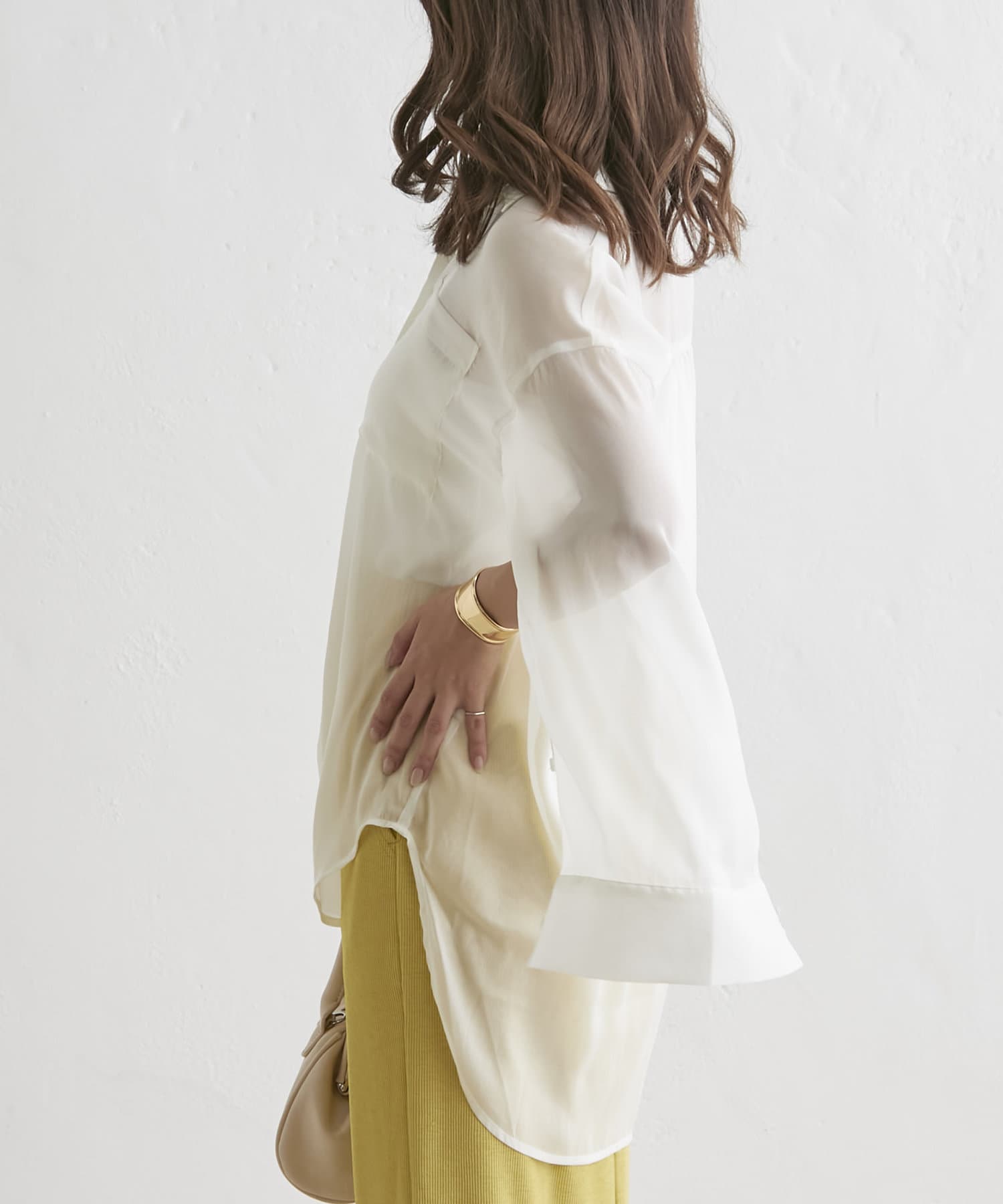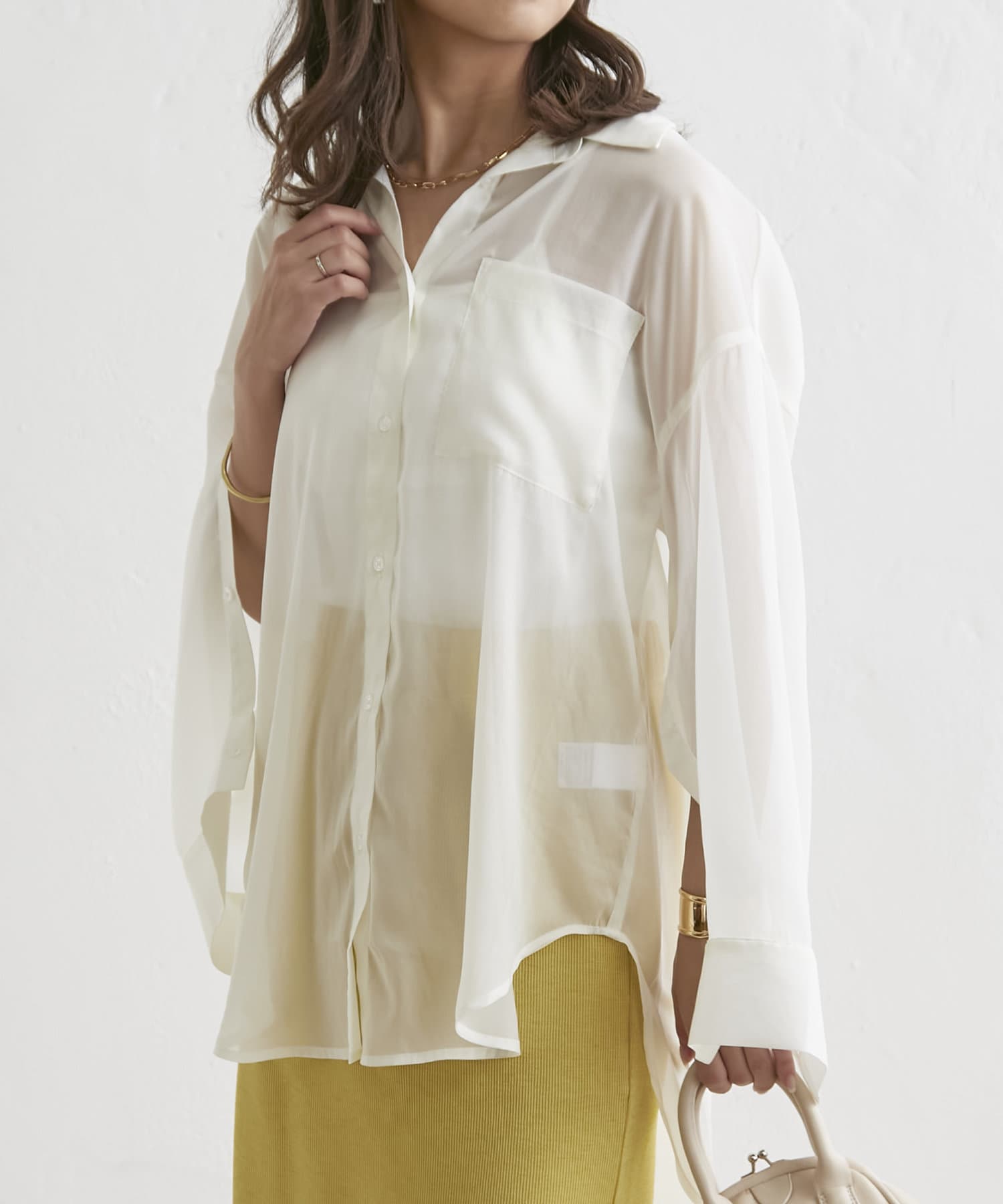 羽織るだけでこなれ感がでる袖スリットシアーシャツ
