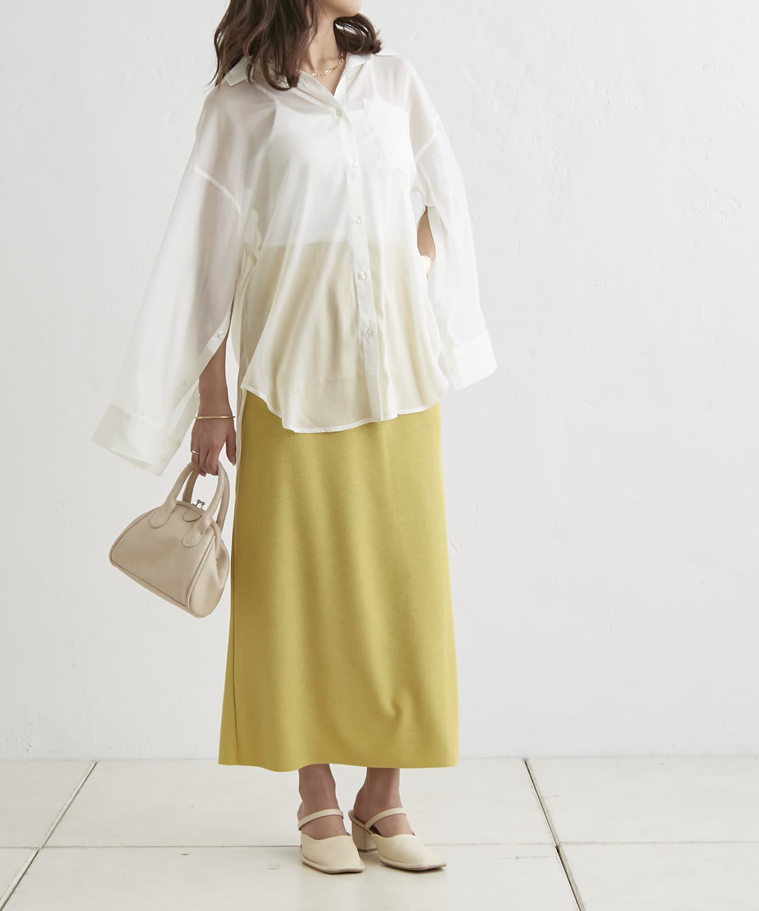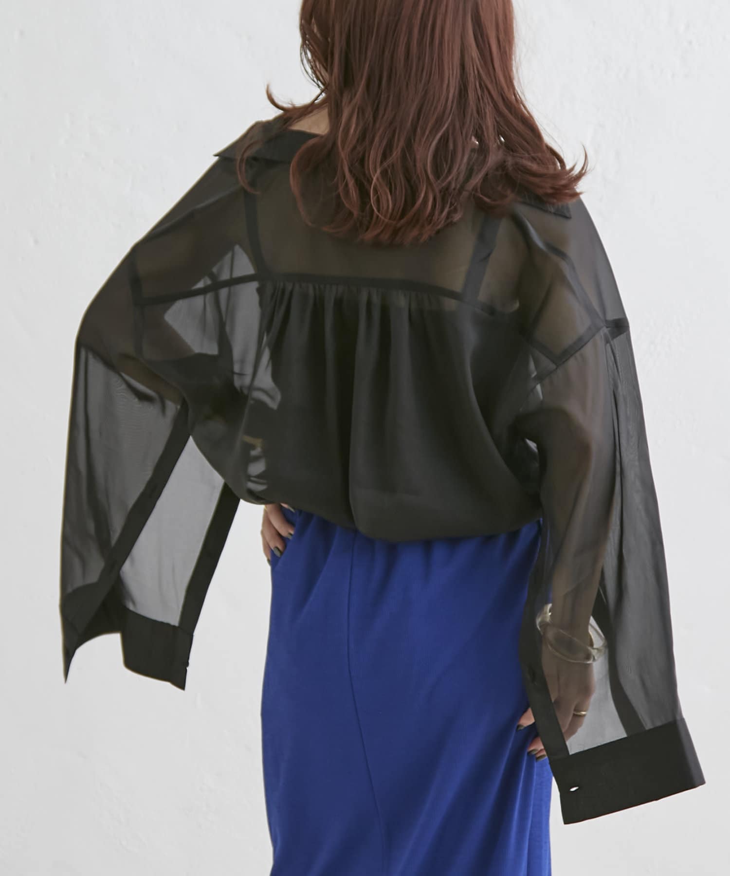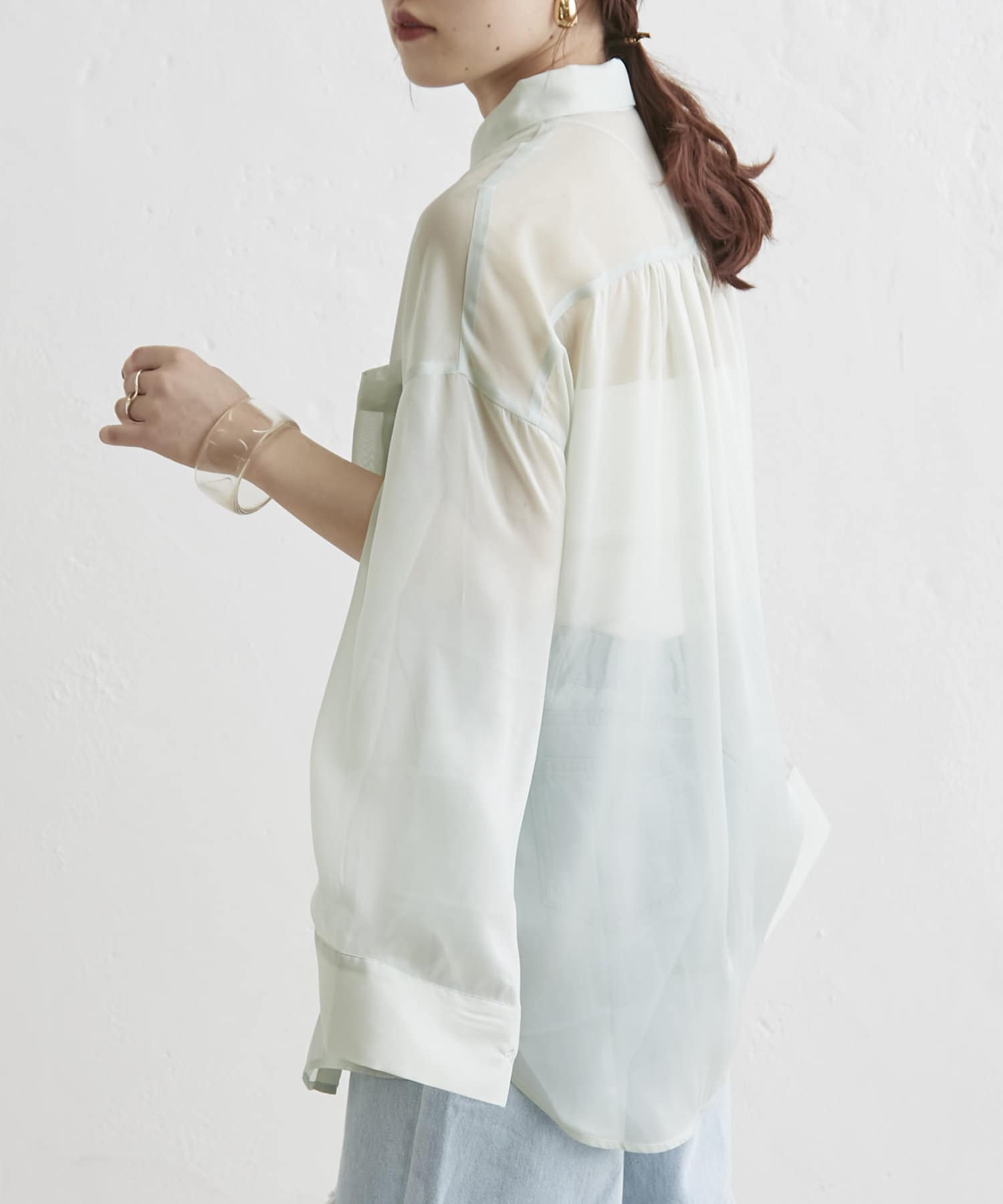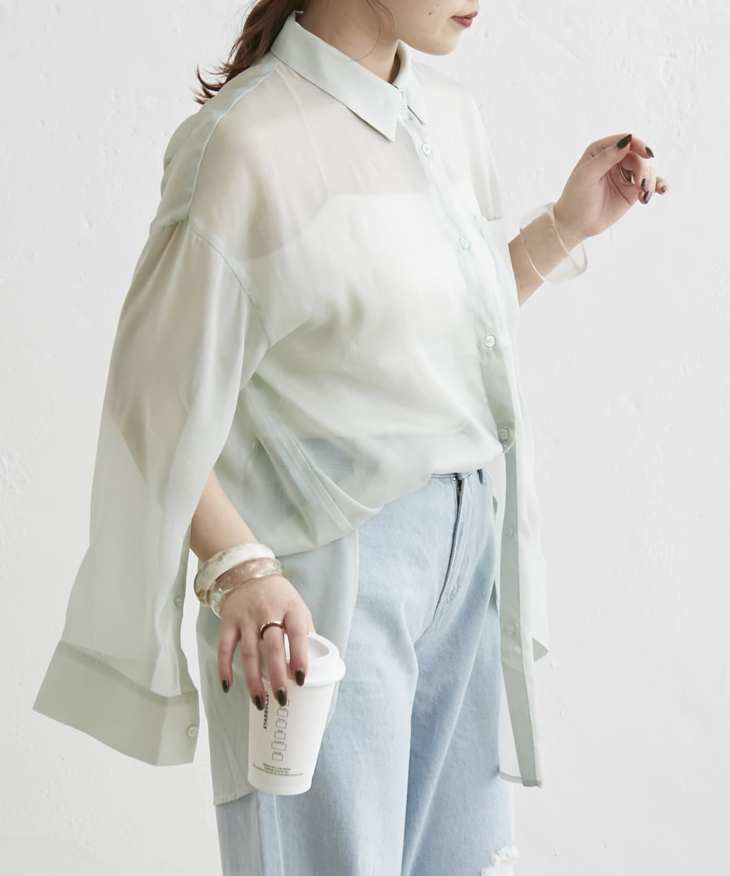 羽織るだけでこなれ感がでる袖スリットシアーシャツ