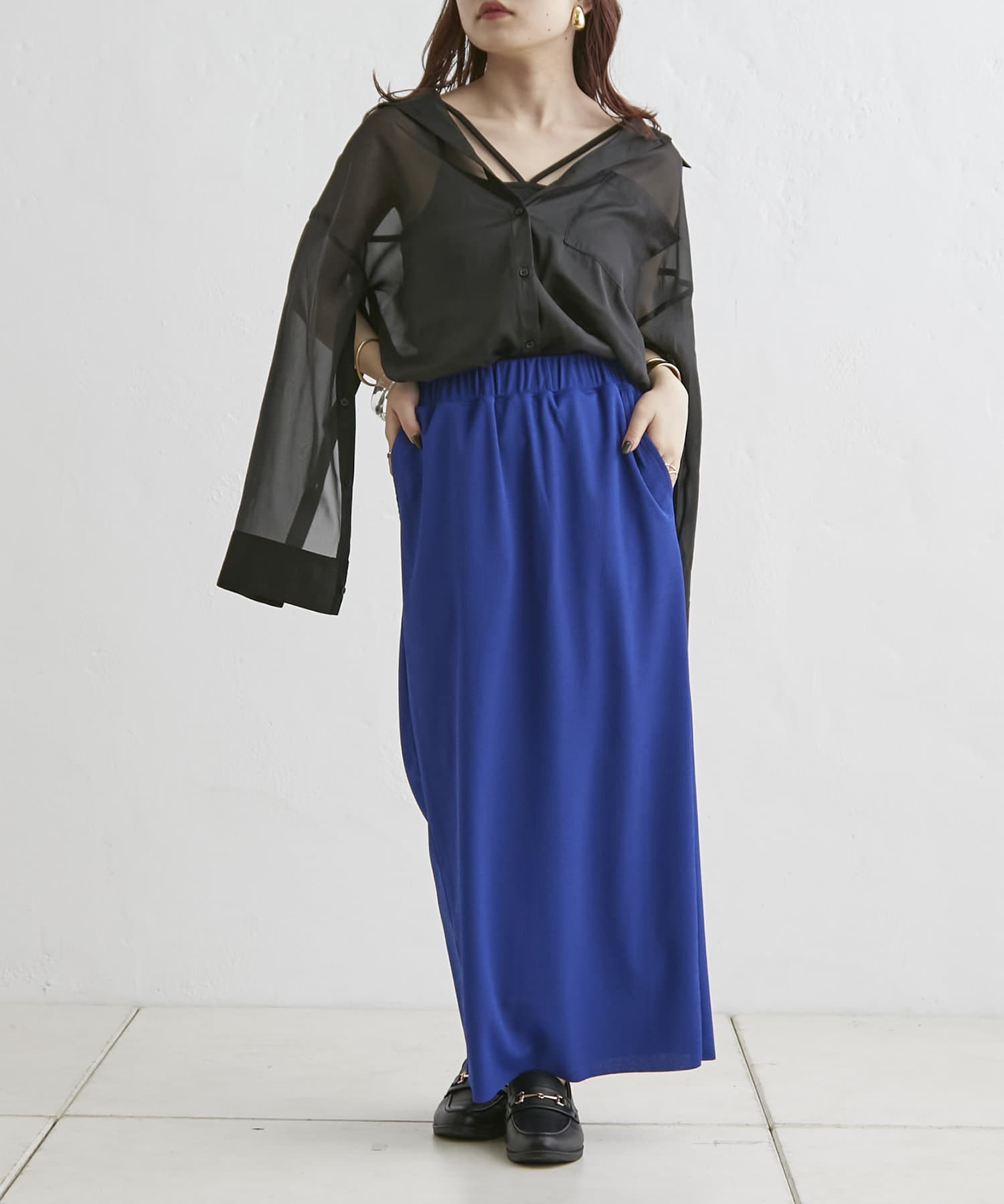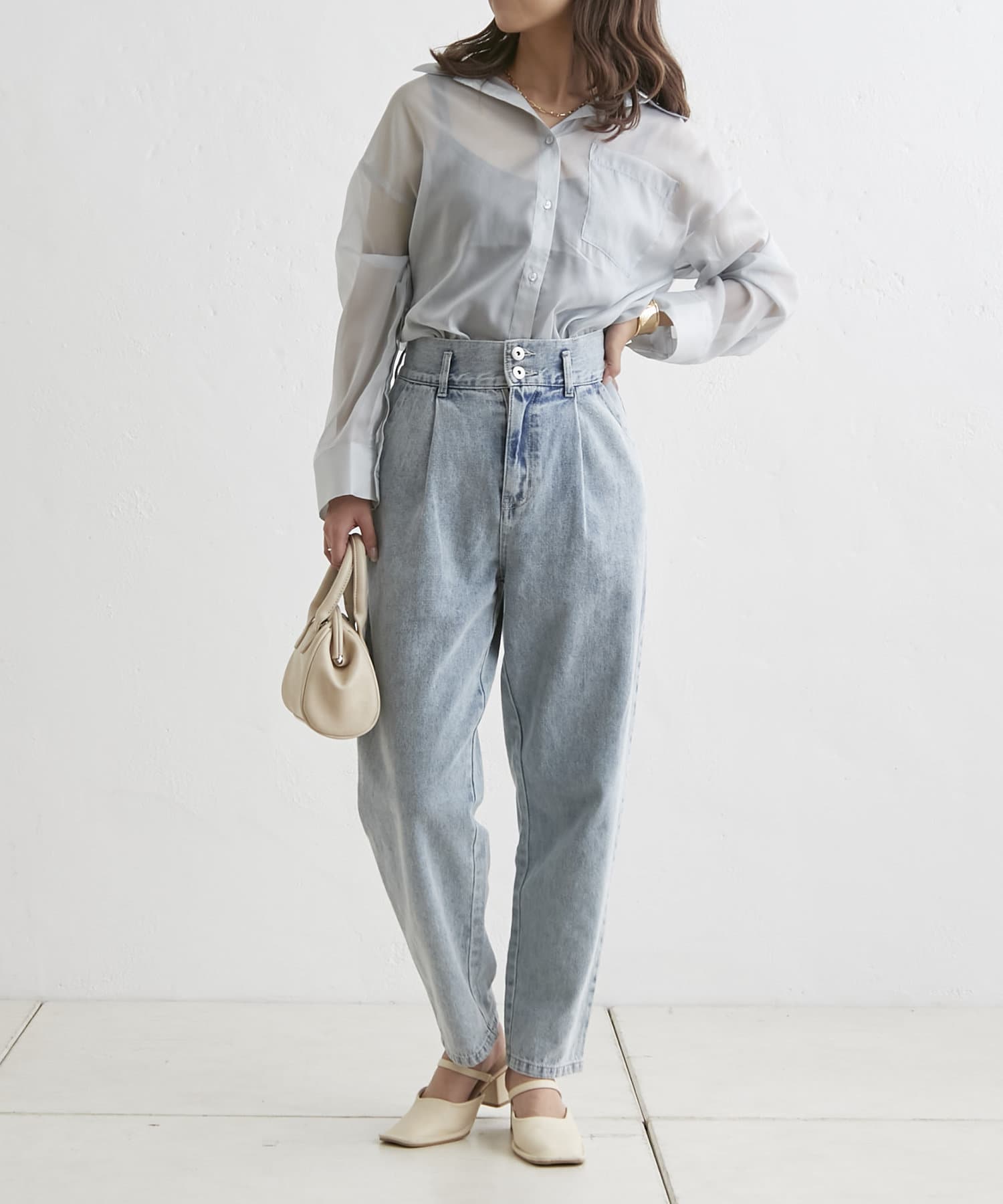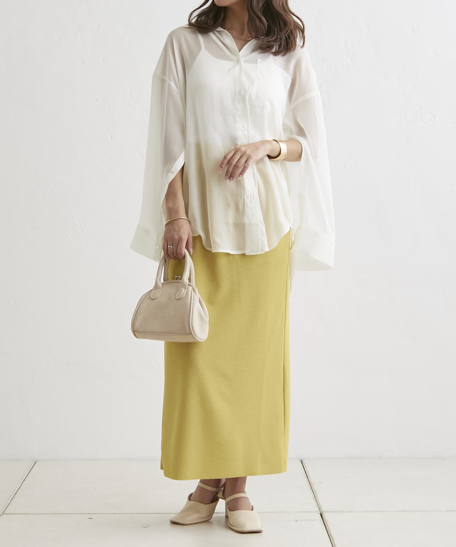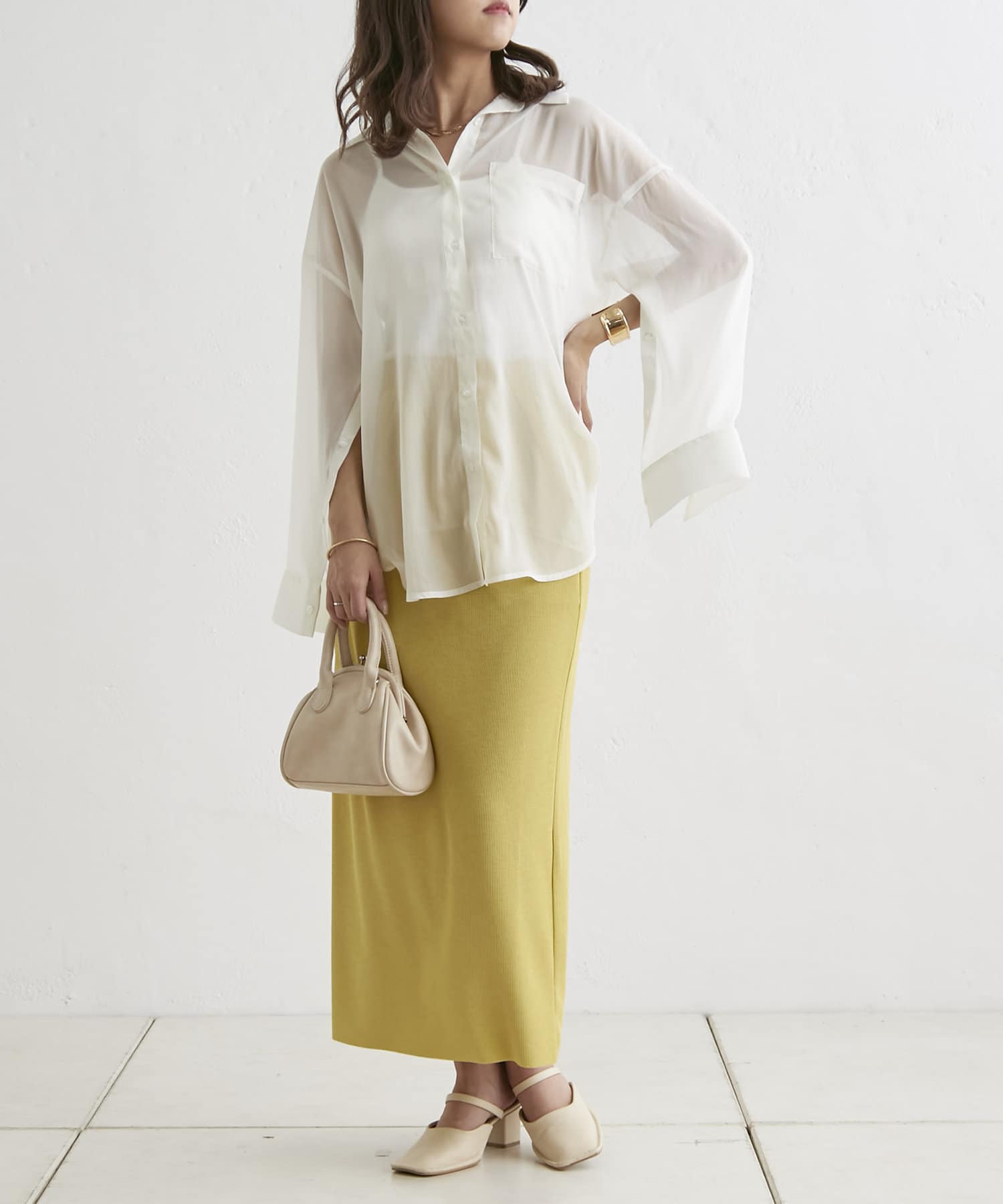 羽織るだけでこなれ感がでる袖スリットシアーシャツ