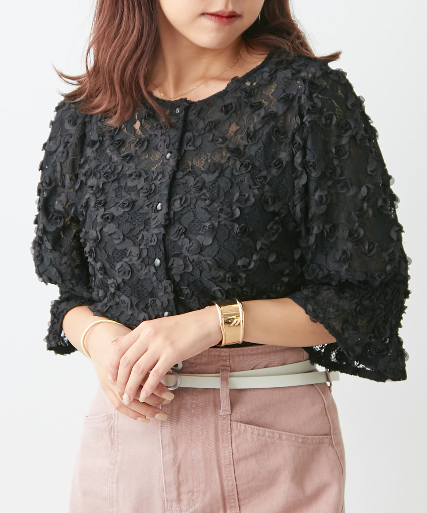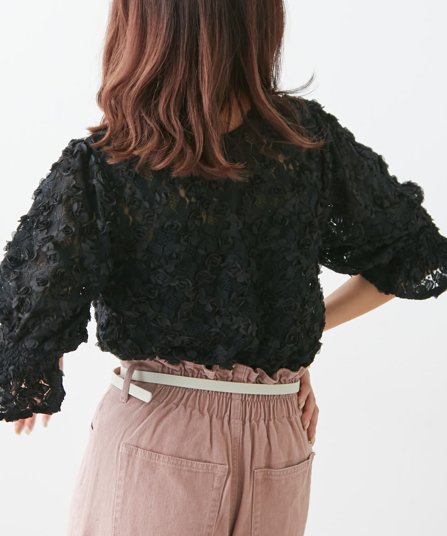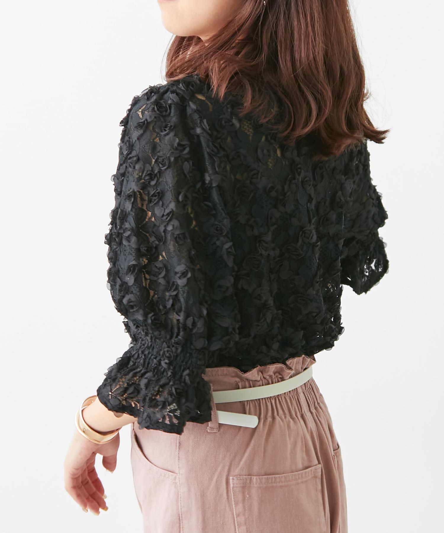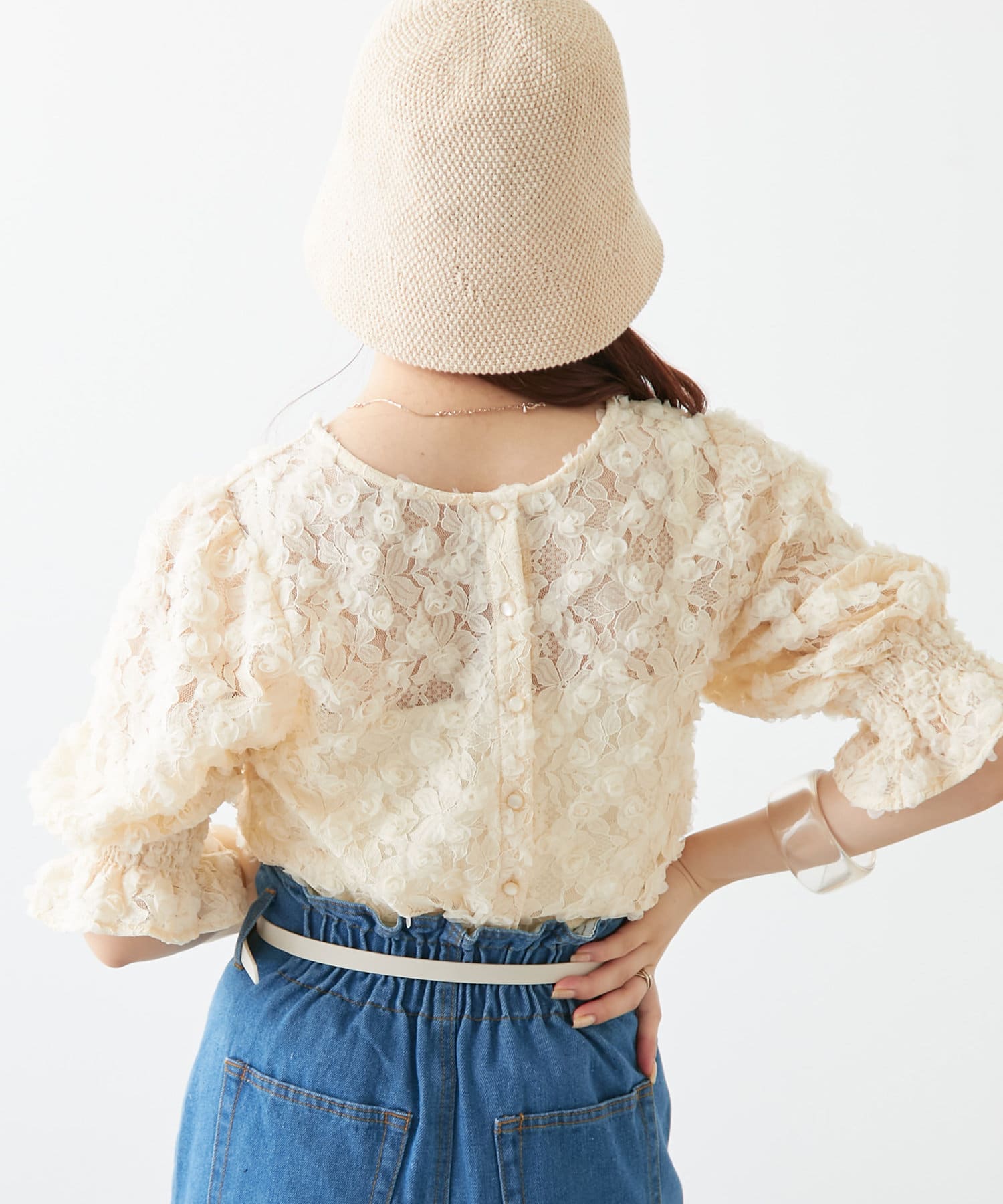 ・凹凸のあるレース素材でお作りした程よい透け感のあるブラウス。
