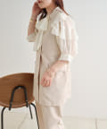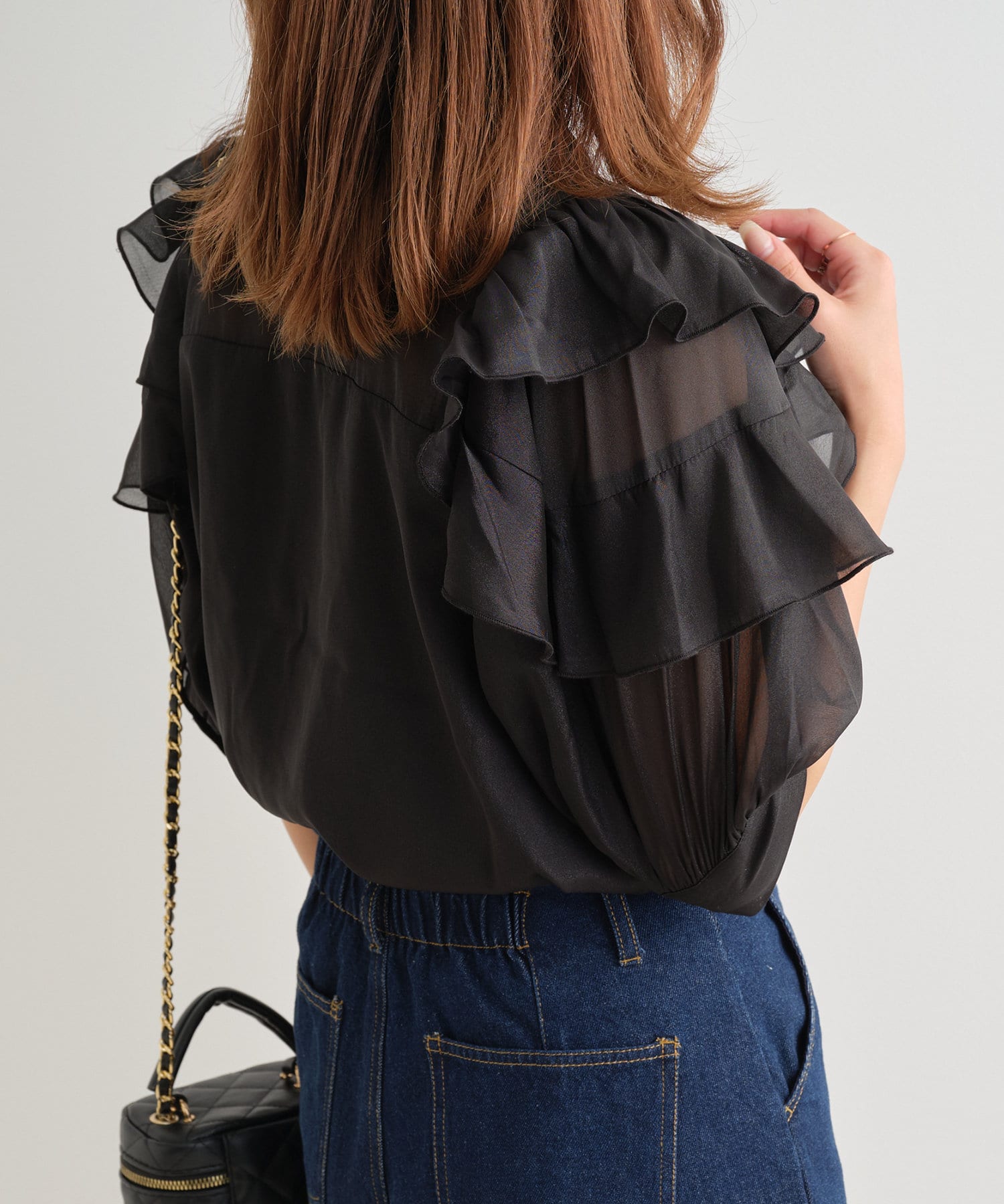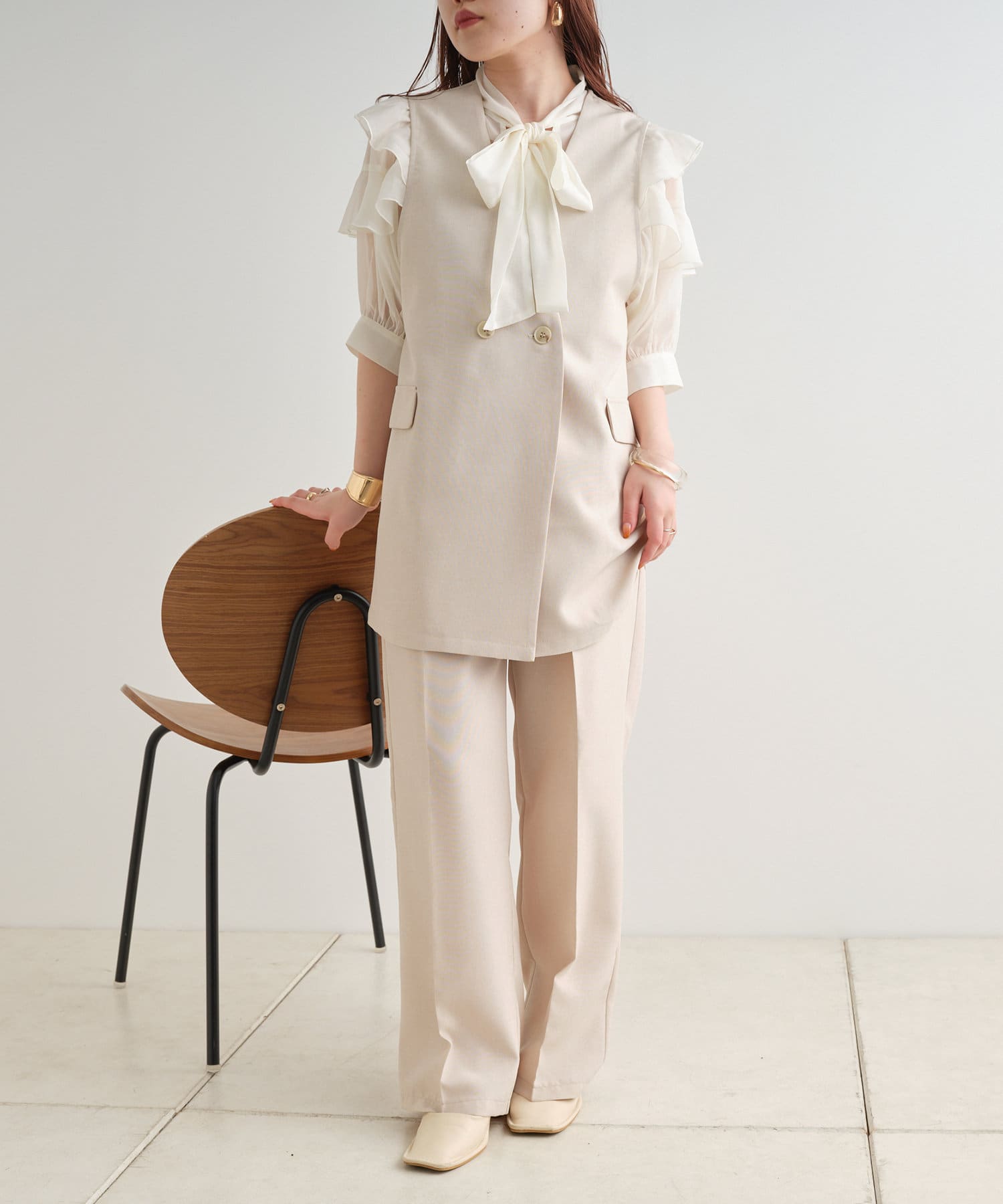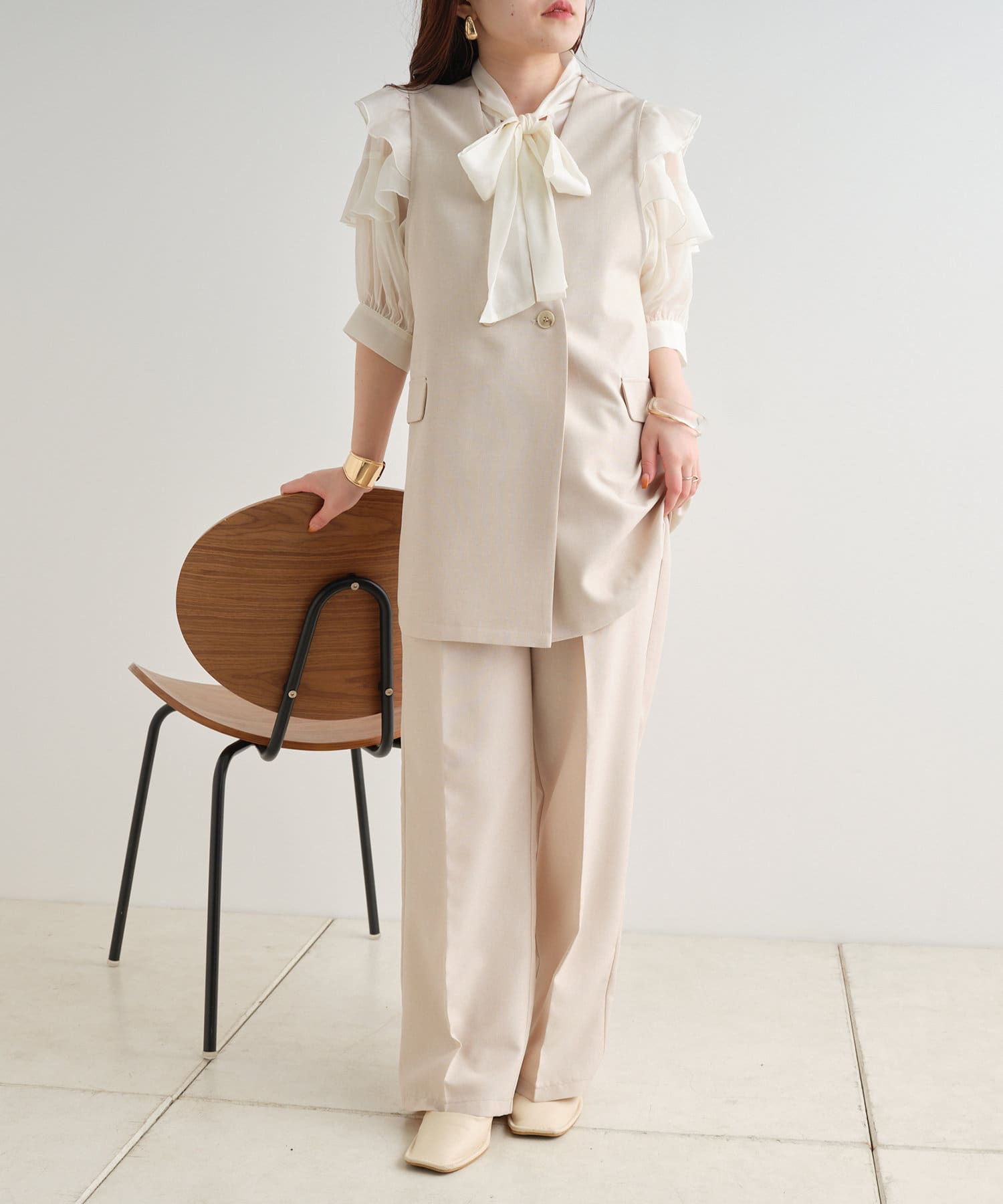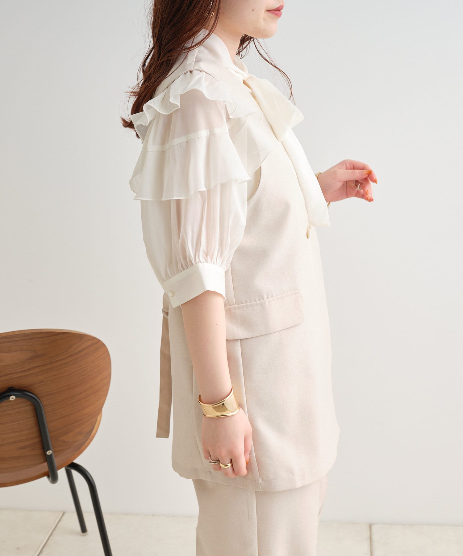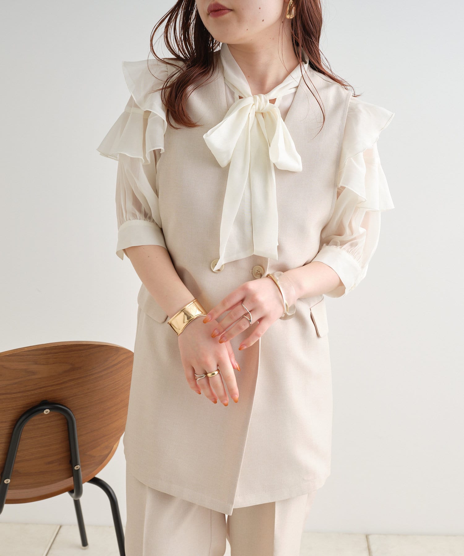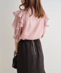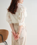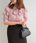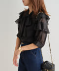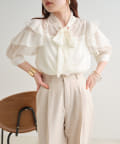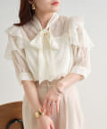 ・大きめのリボンがレトロかわいいブラウス。シアーな素材感が涼しげでフェミニンな印象に