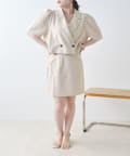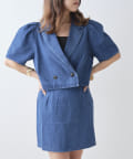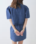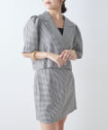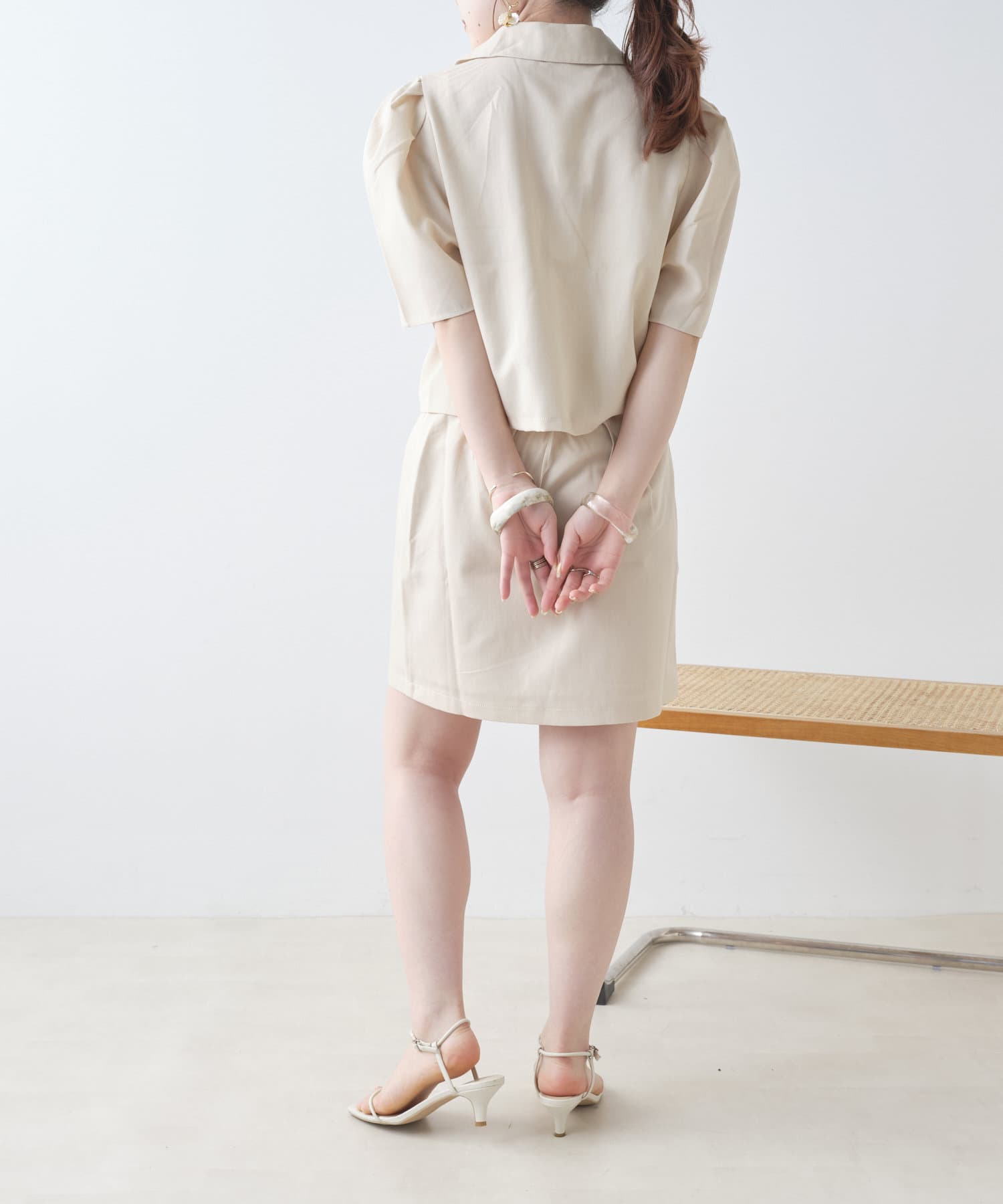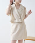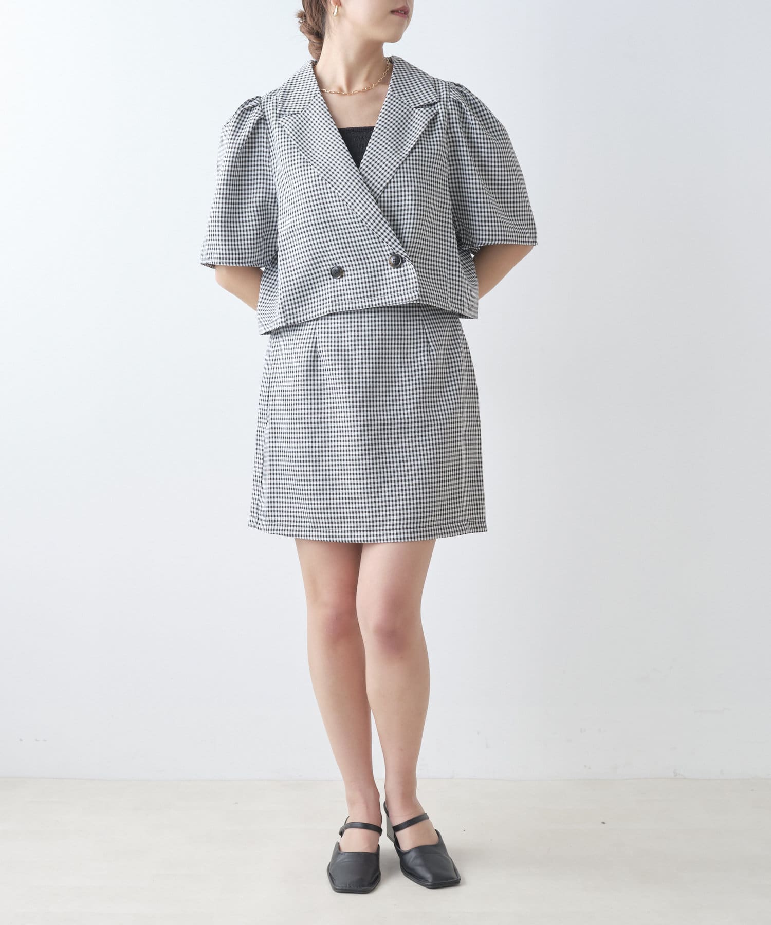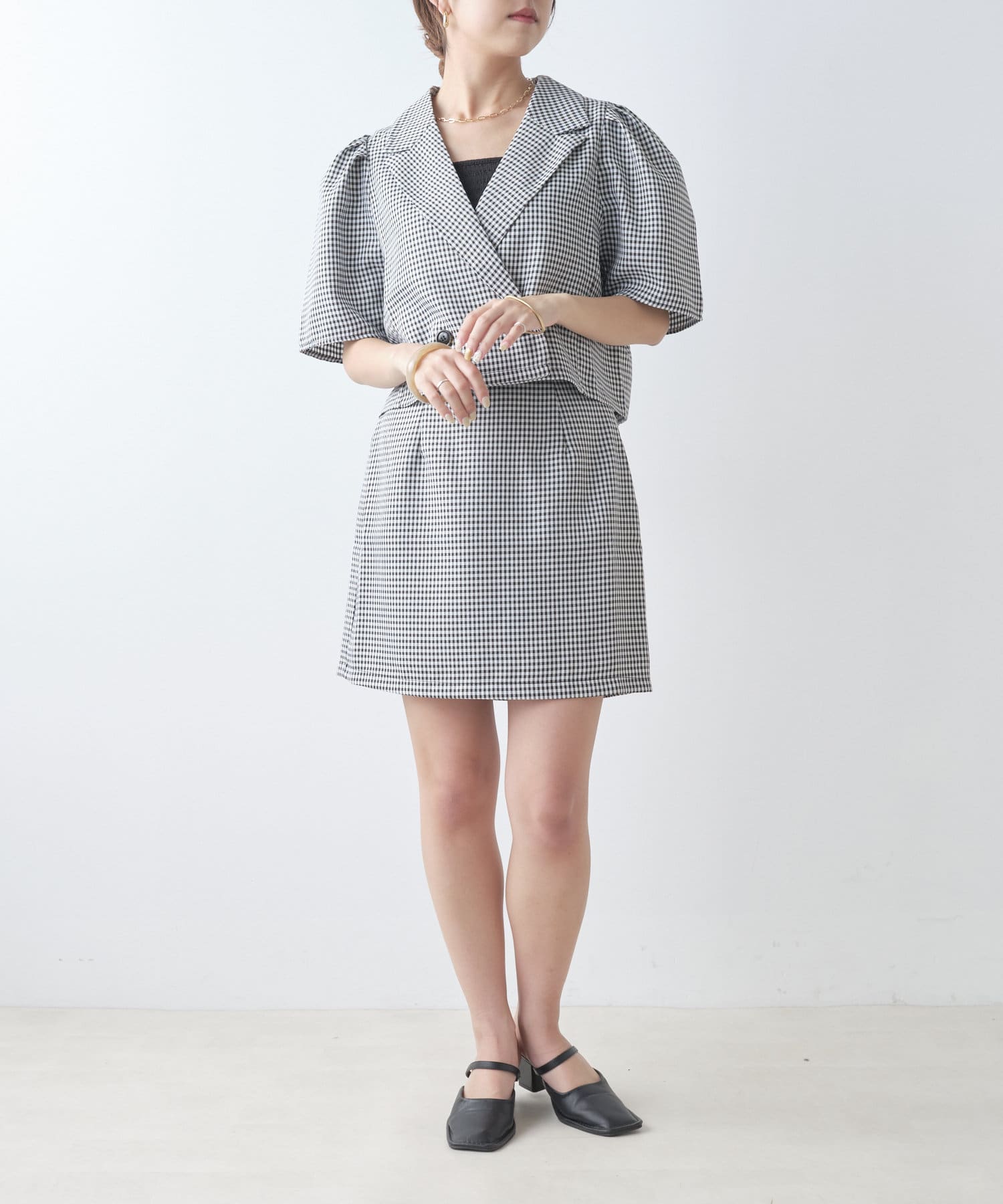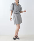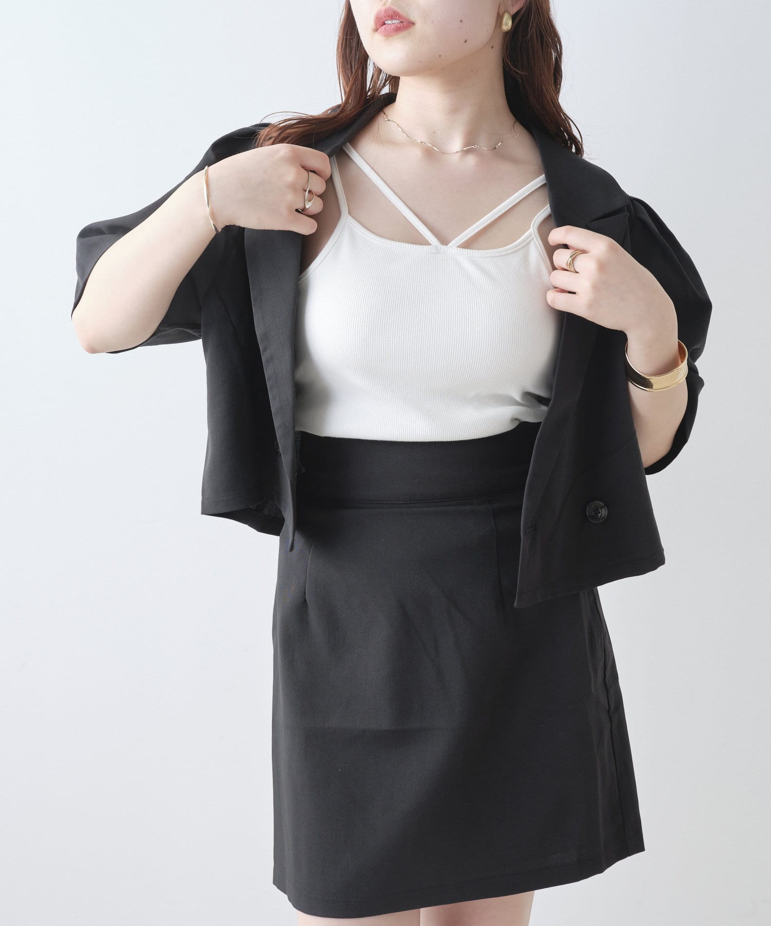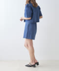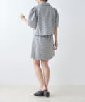 ・同素材のミニスカートと合わせたセットアップコーデがおすすめ。