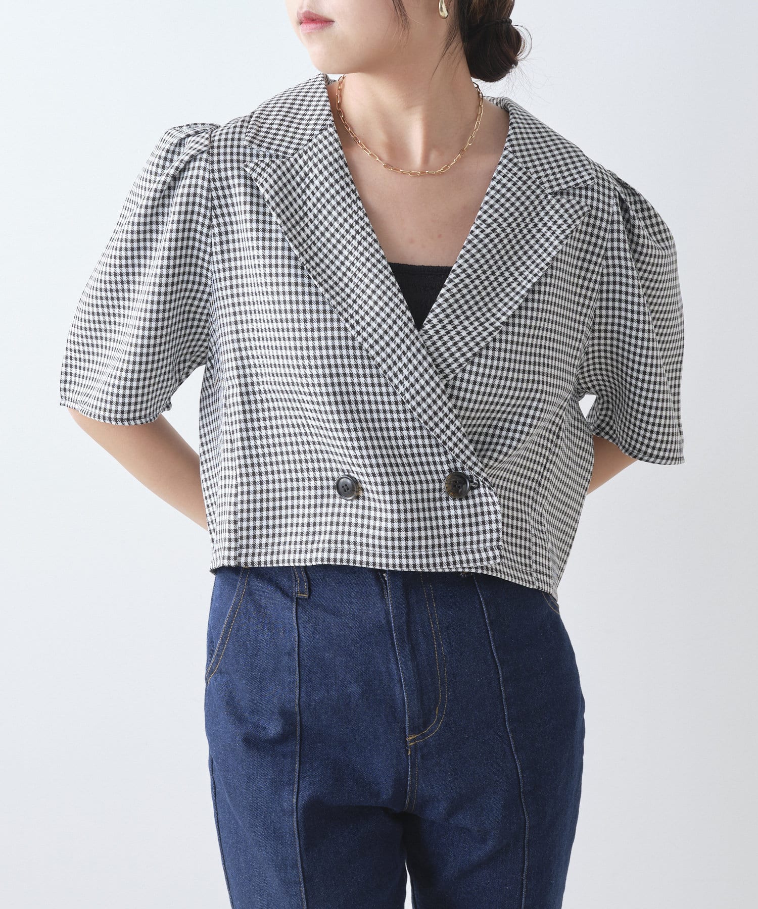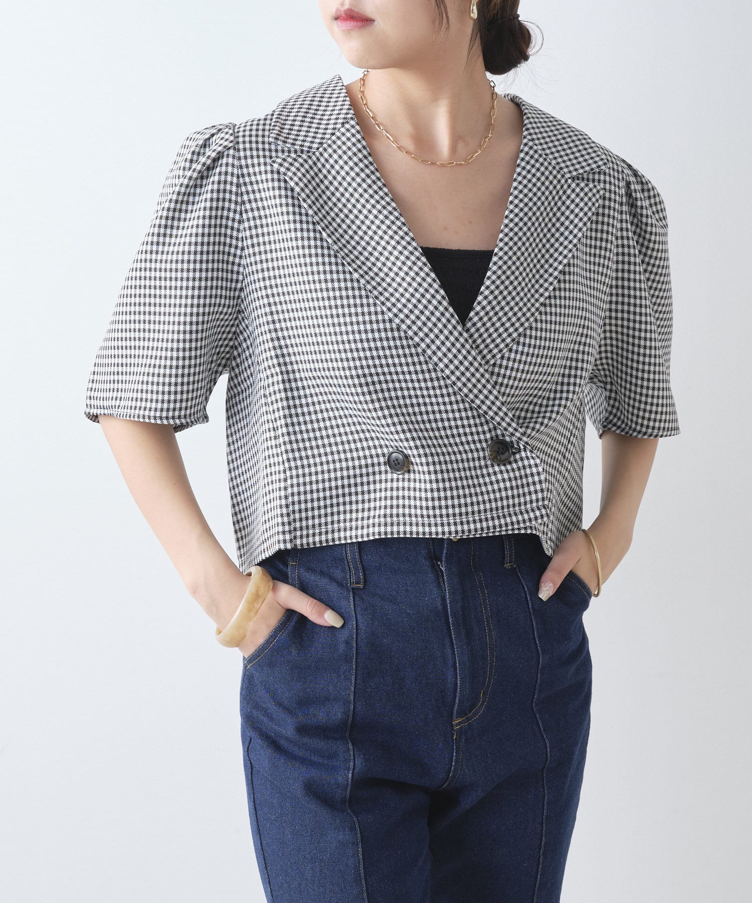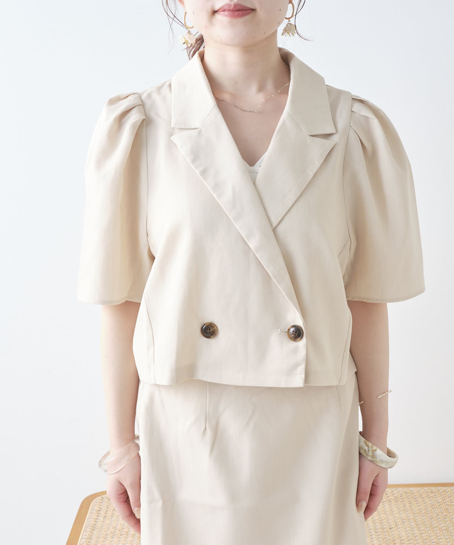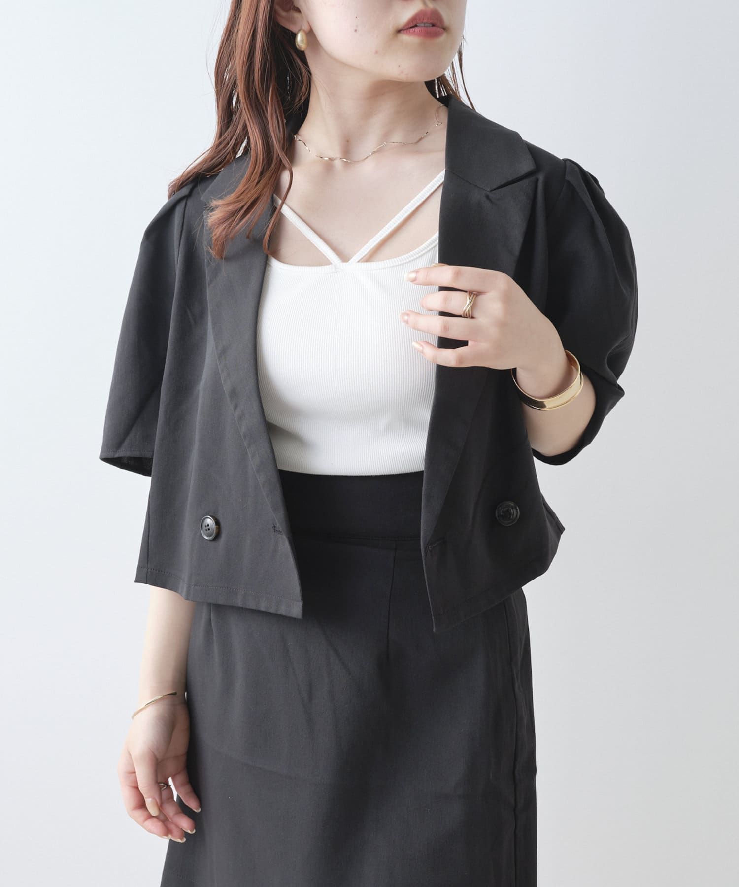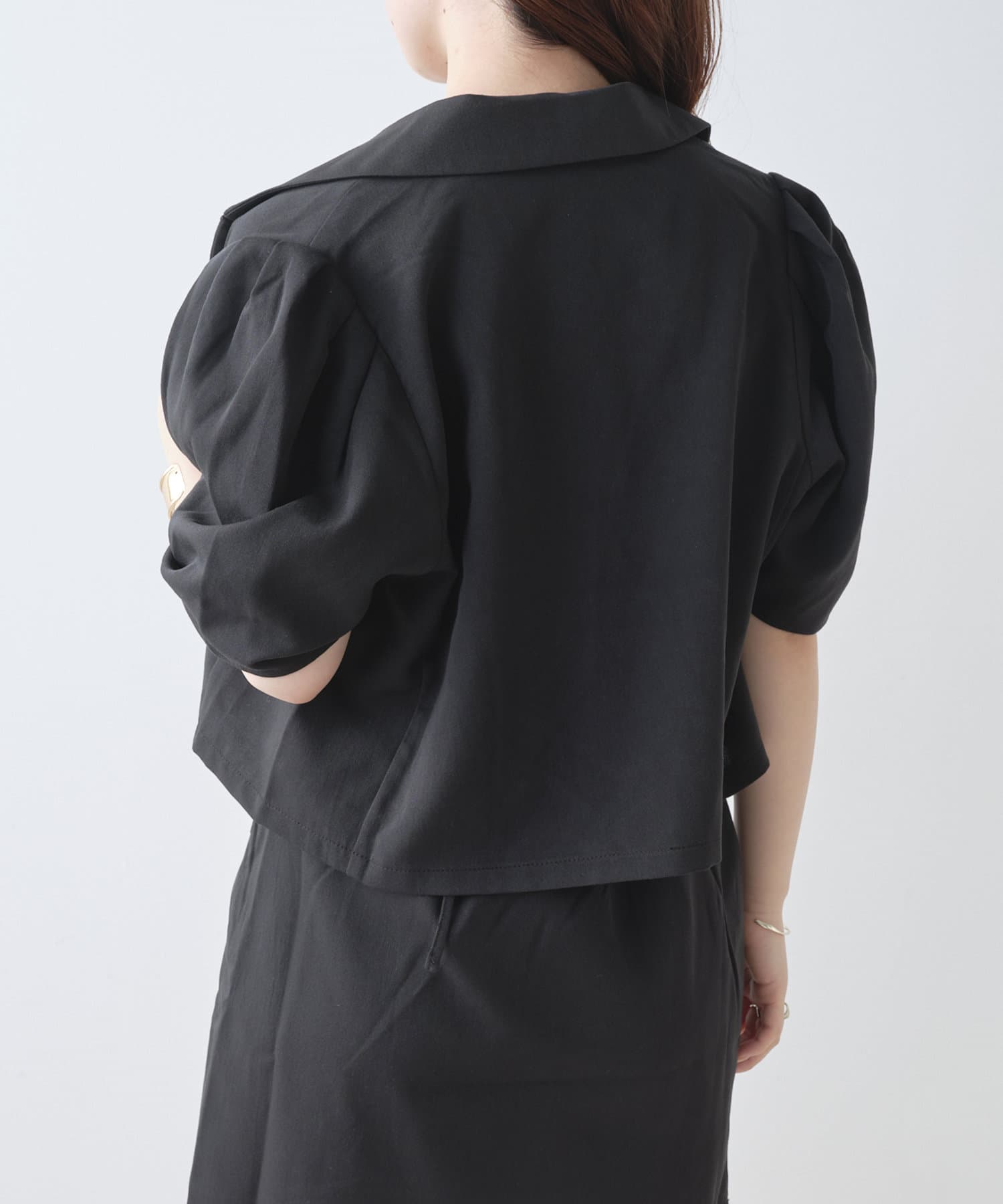 ・トレンドのクロップド丈とパワショルのデザインがかわいい一枚。