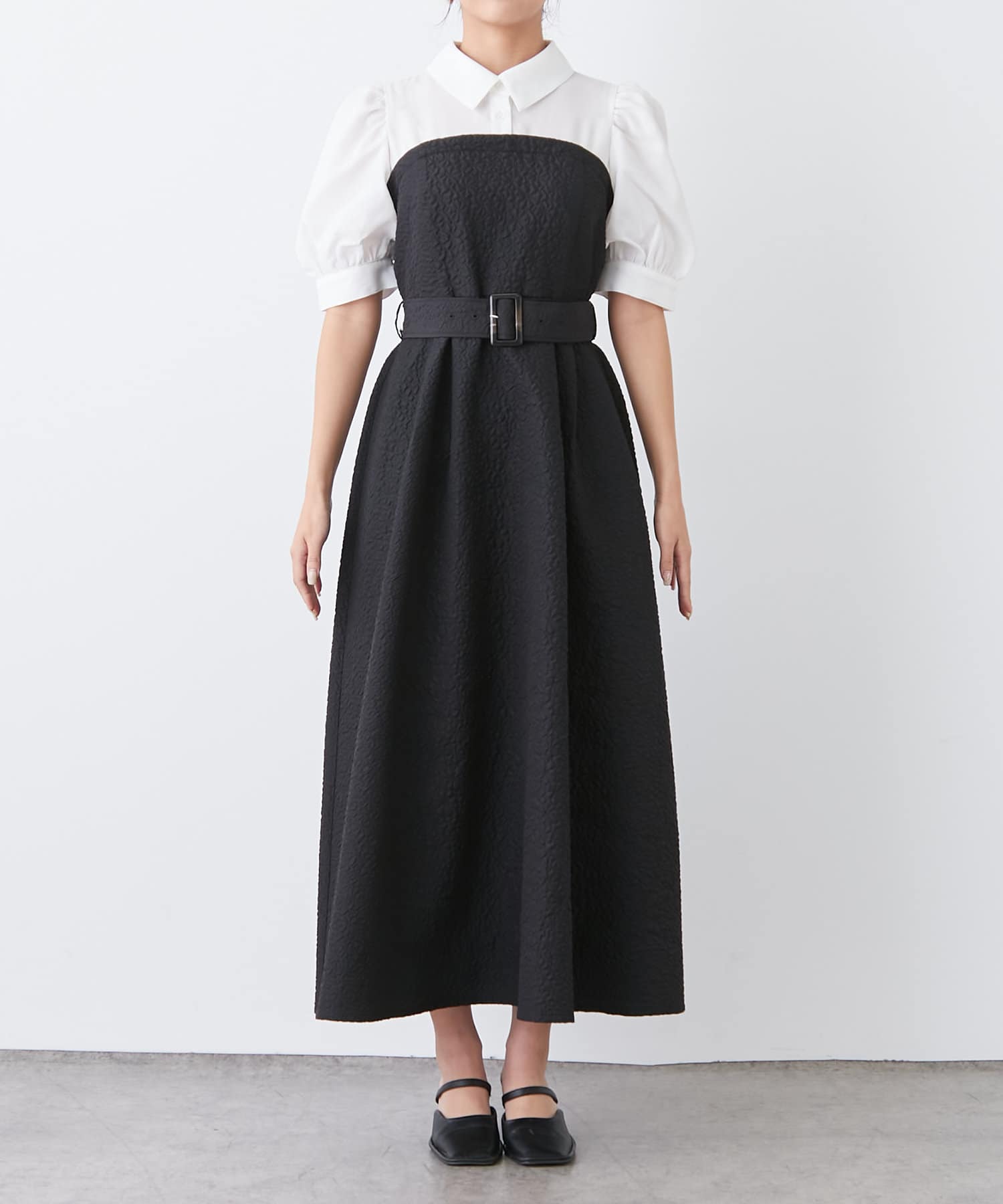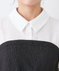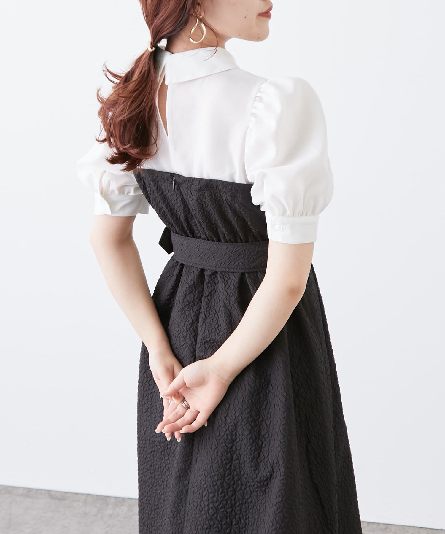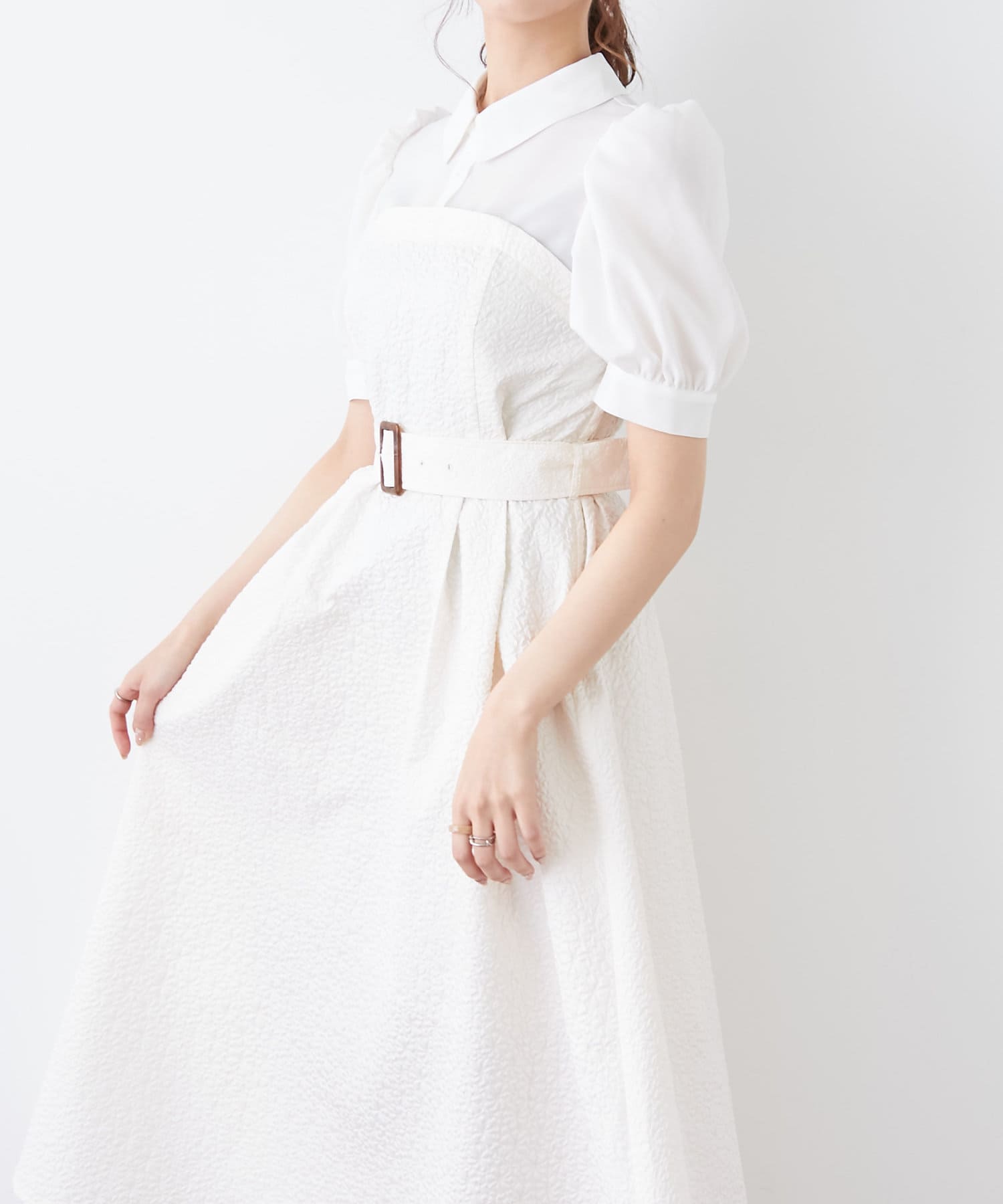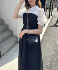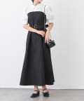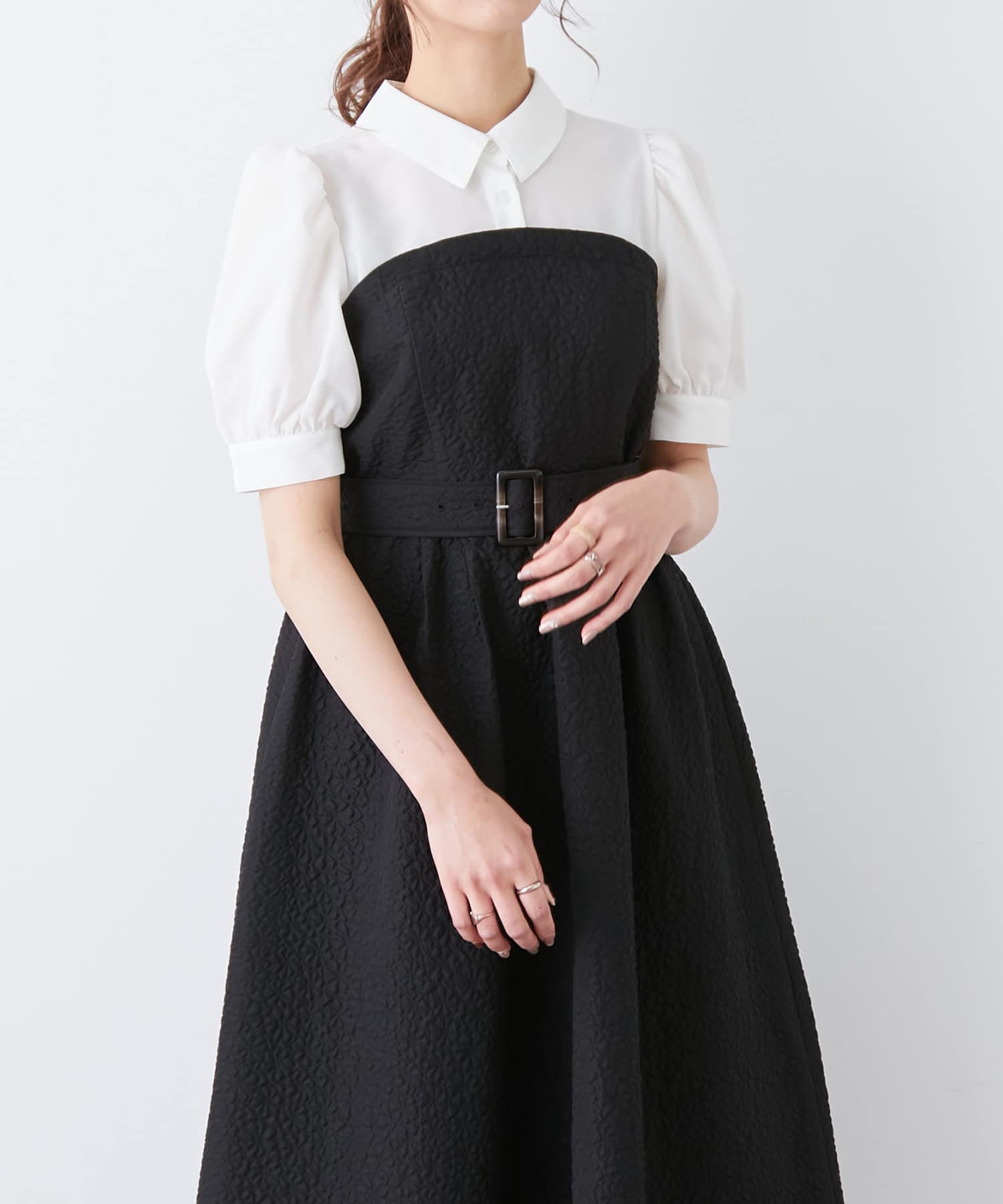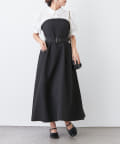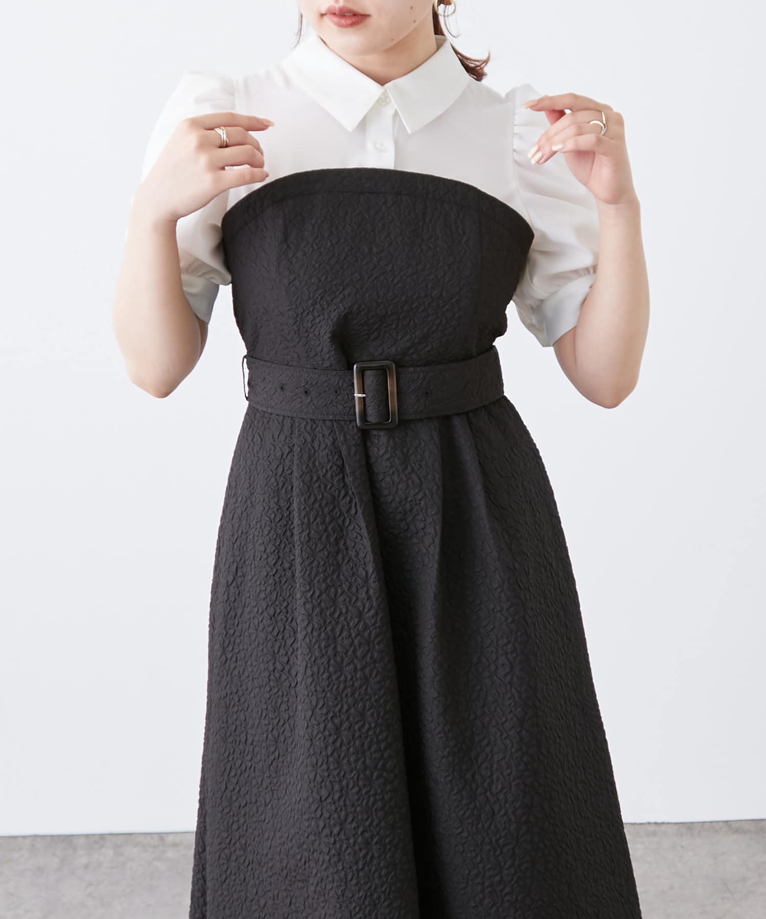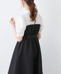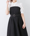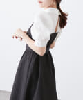 ・柔らかな素材のシャツとベアワンピをレイヤードしているかのような、ドッキングデザインのワンピース。