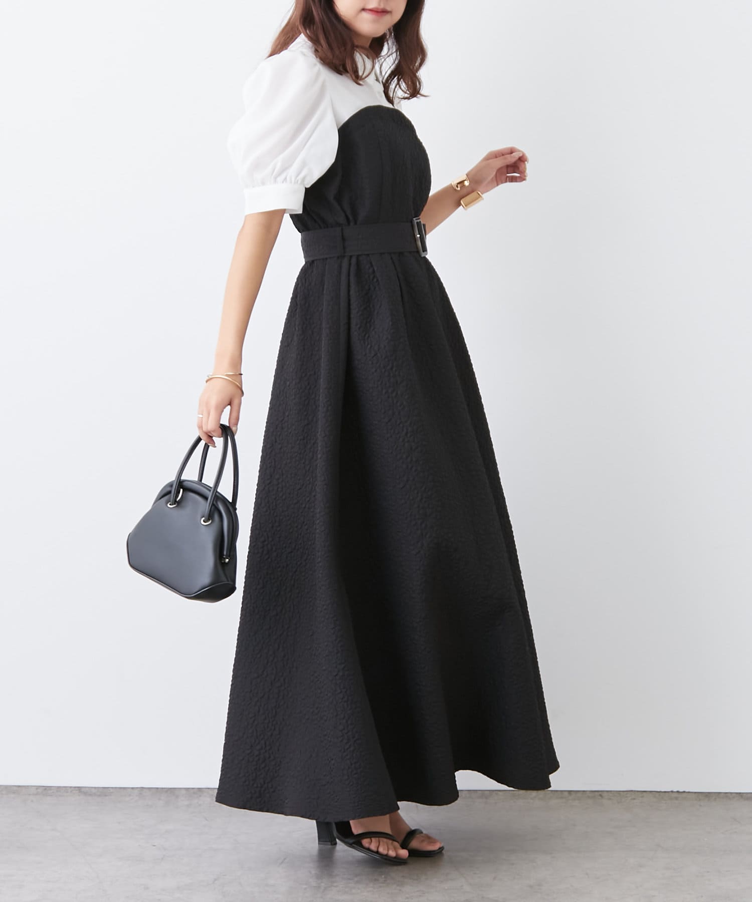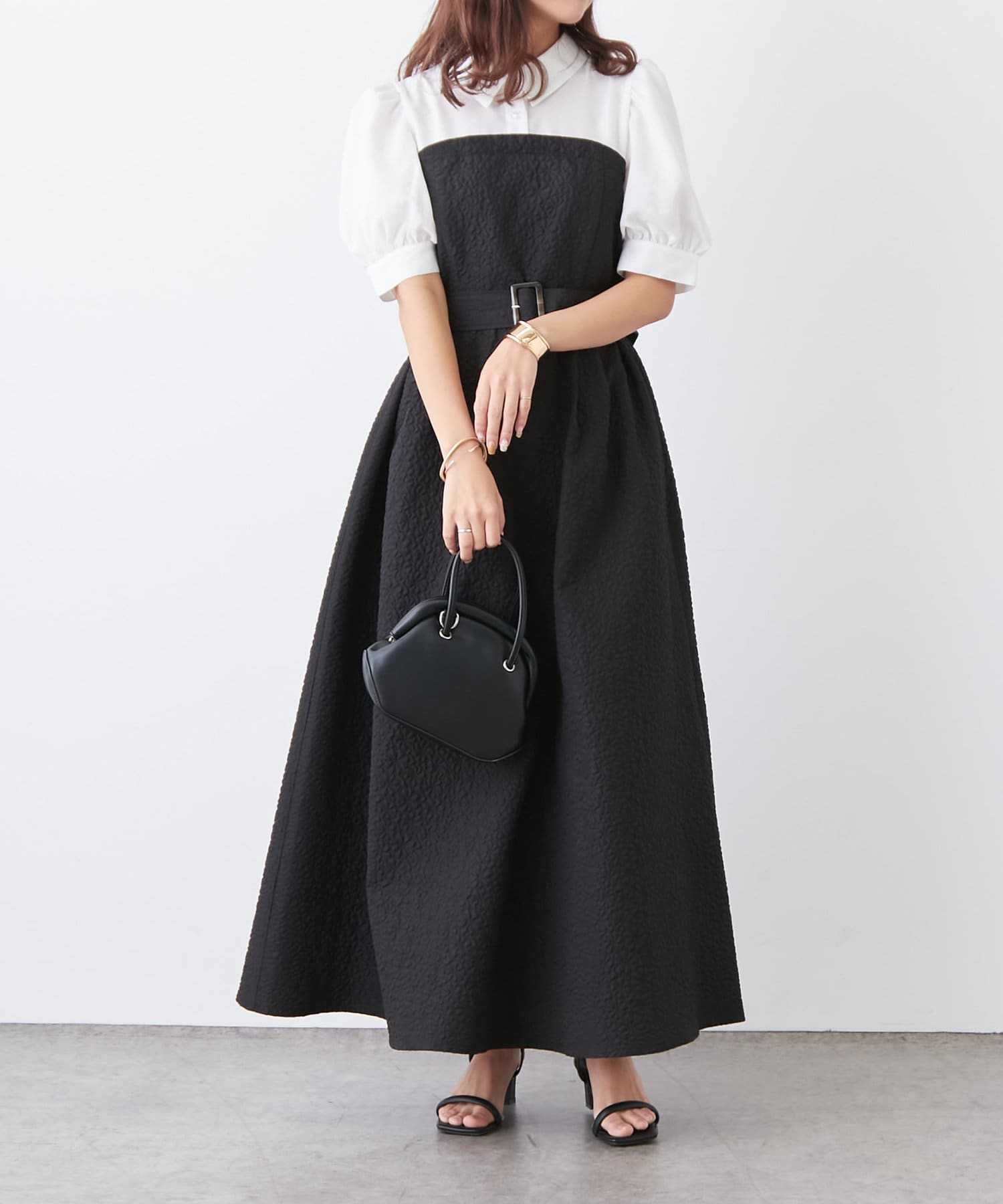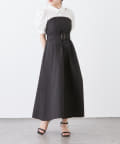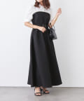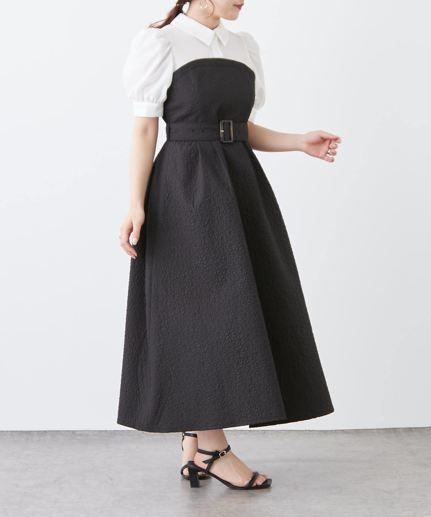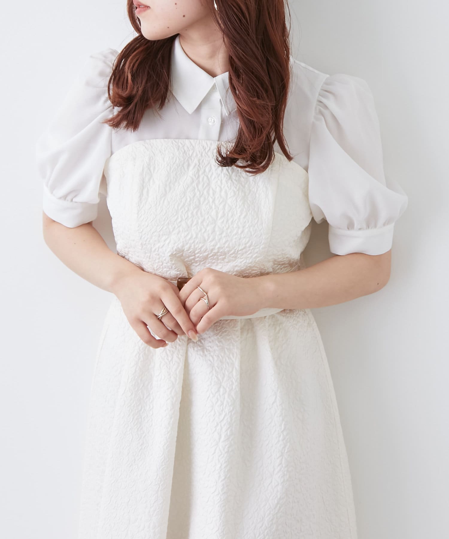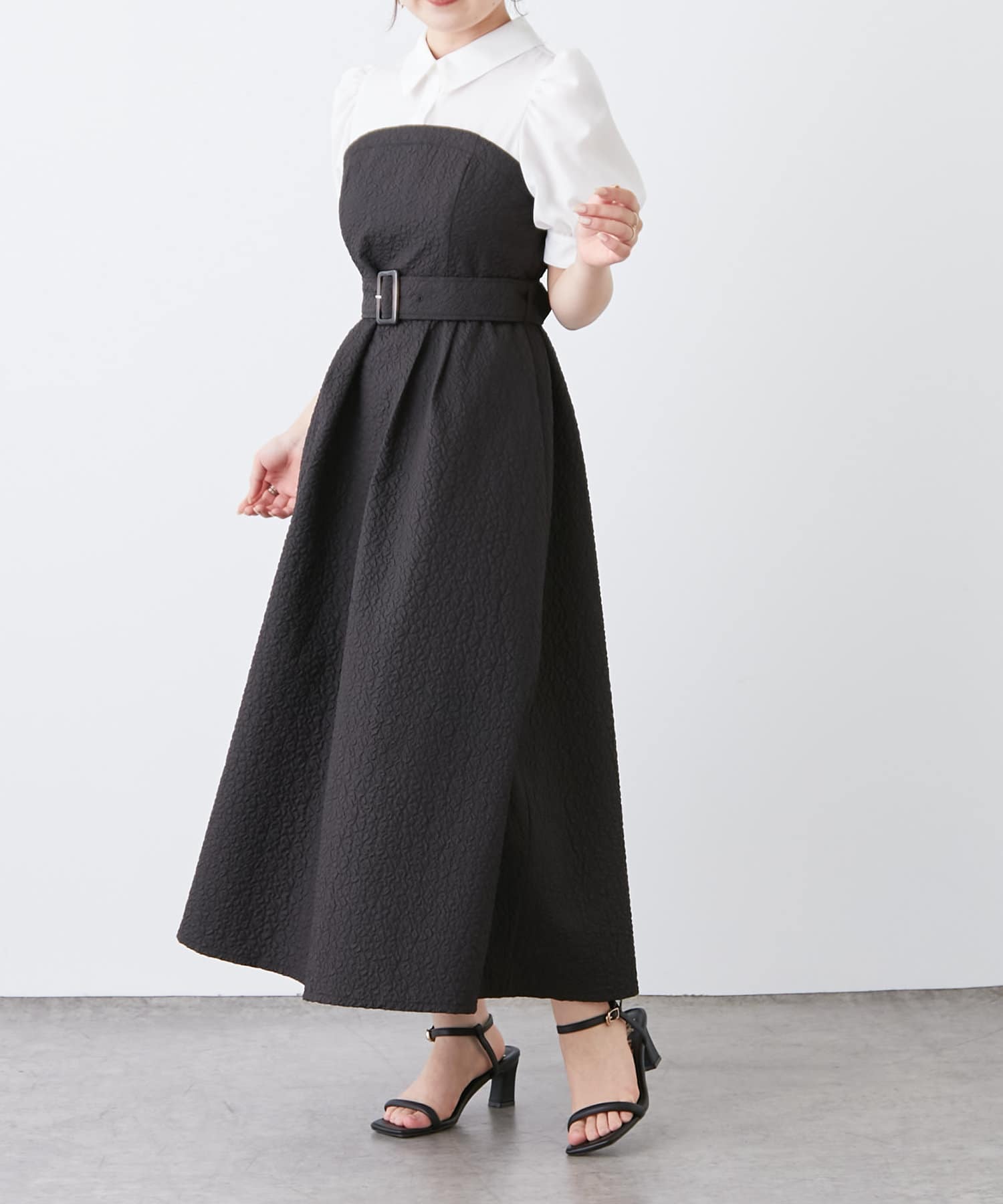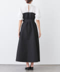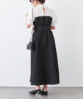 ・柔らかな素材のシャツとベアワンピをレイヤードしているかのような、ドッキングデザインのワンピース。
