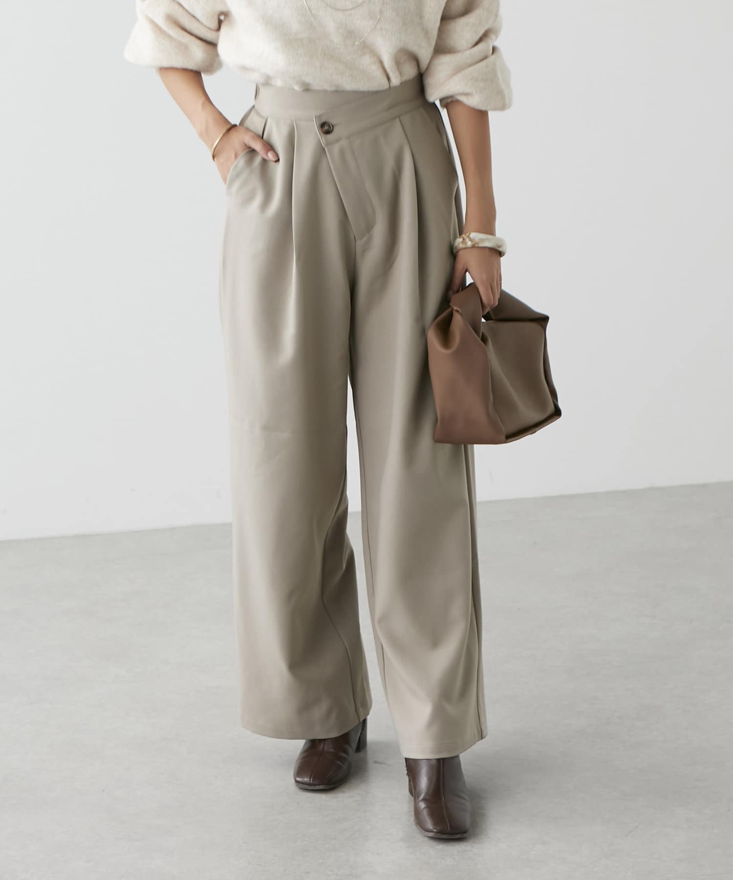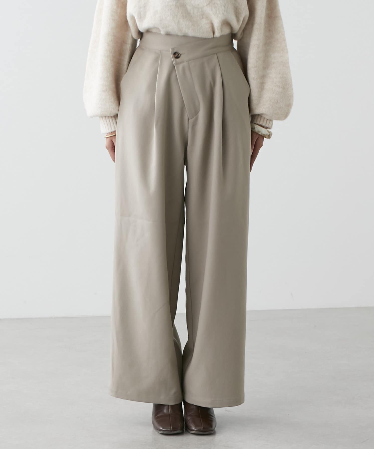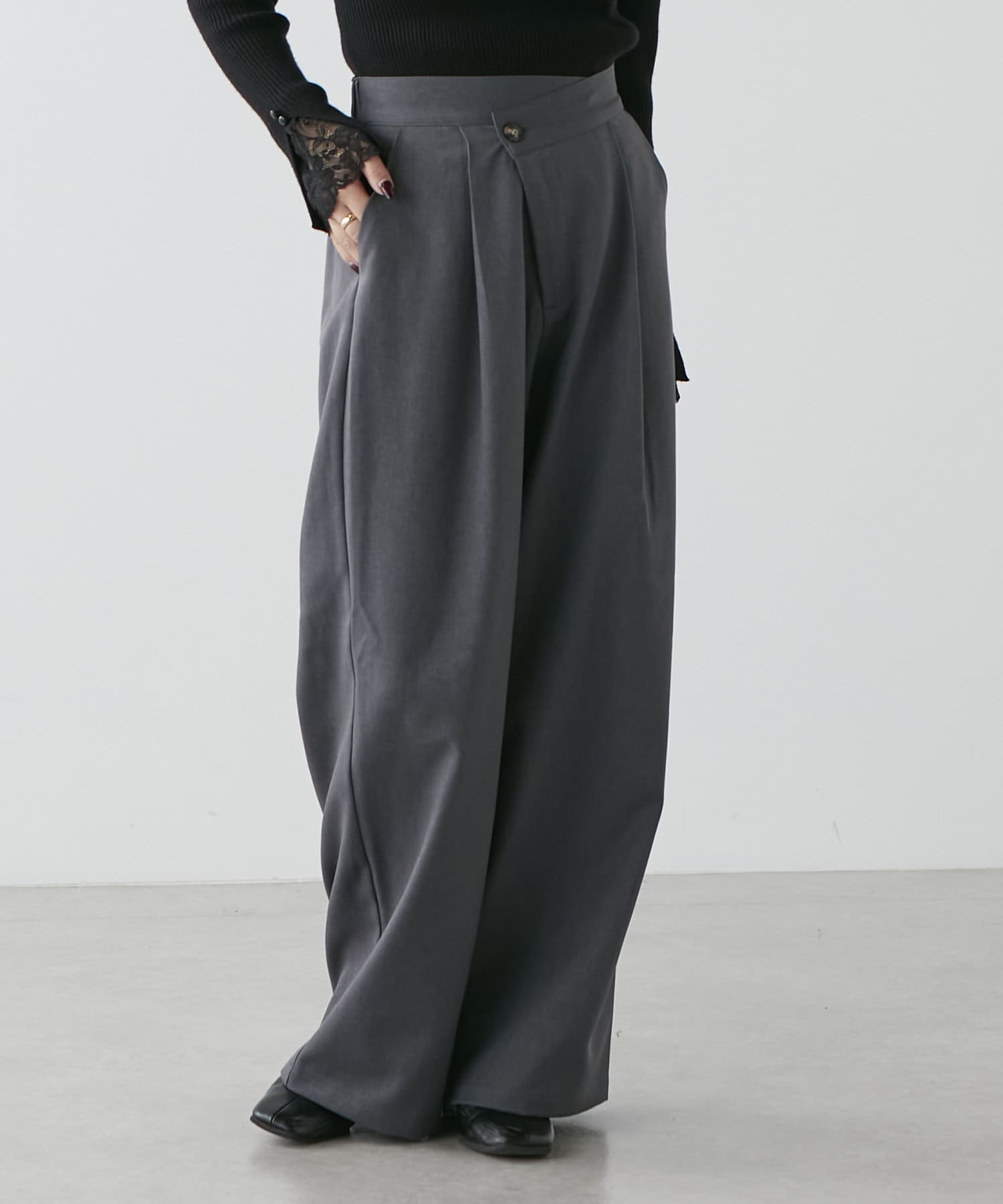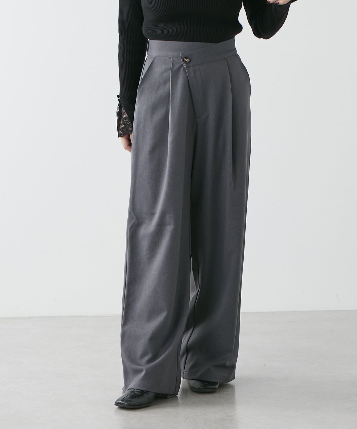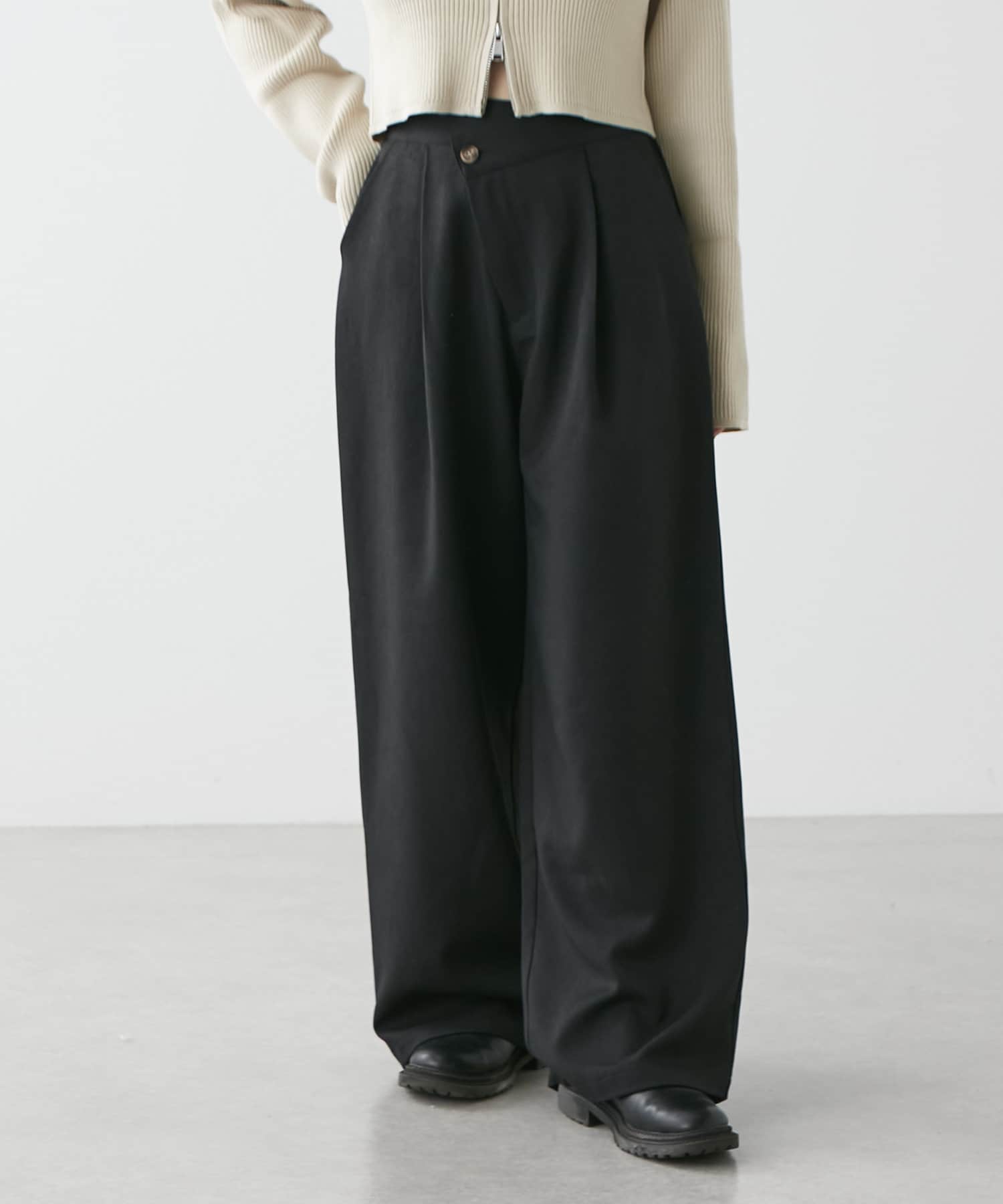 ・ウエストにアシンメトリーデザインが施されたパンツ。