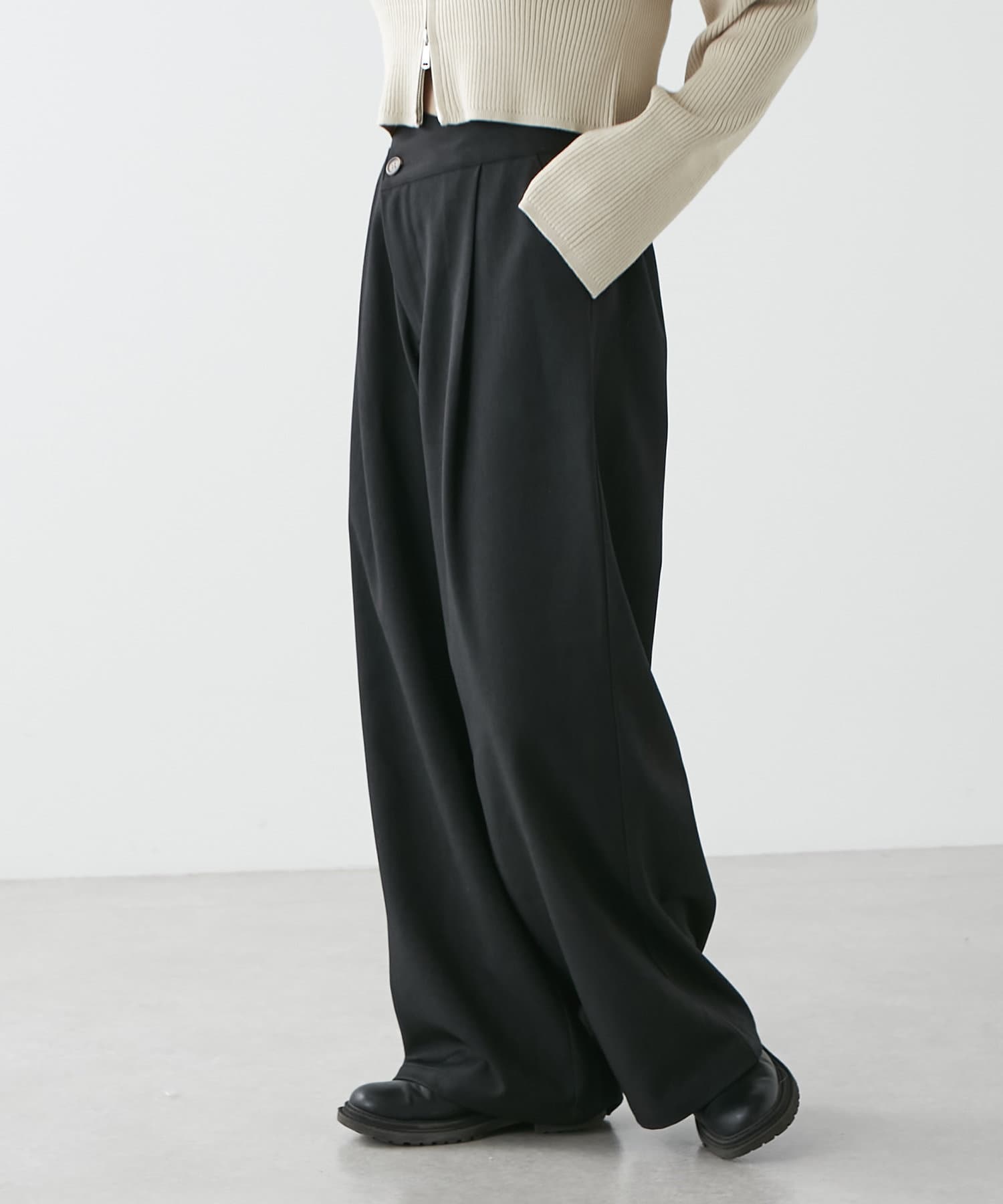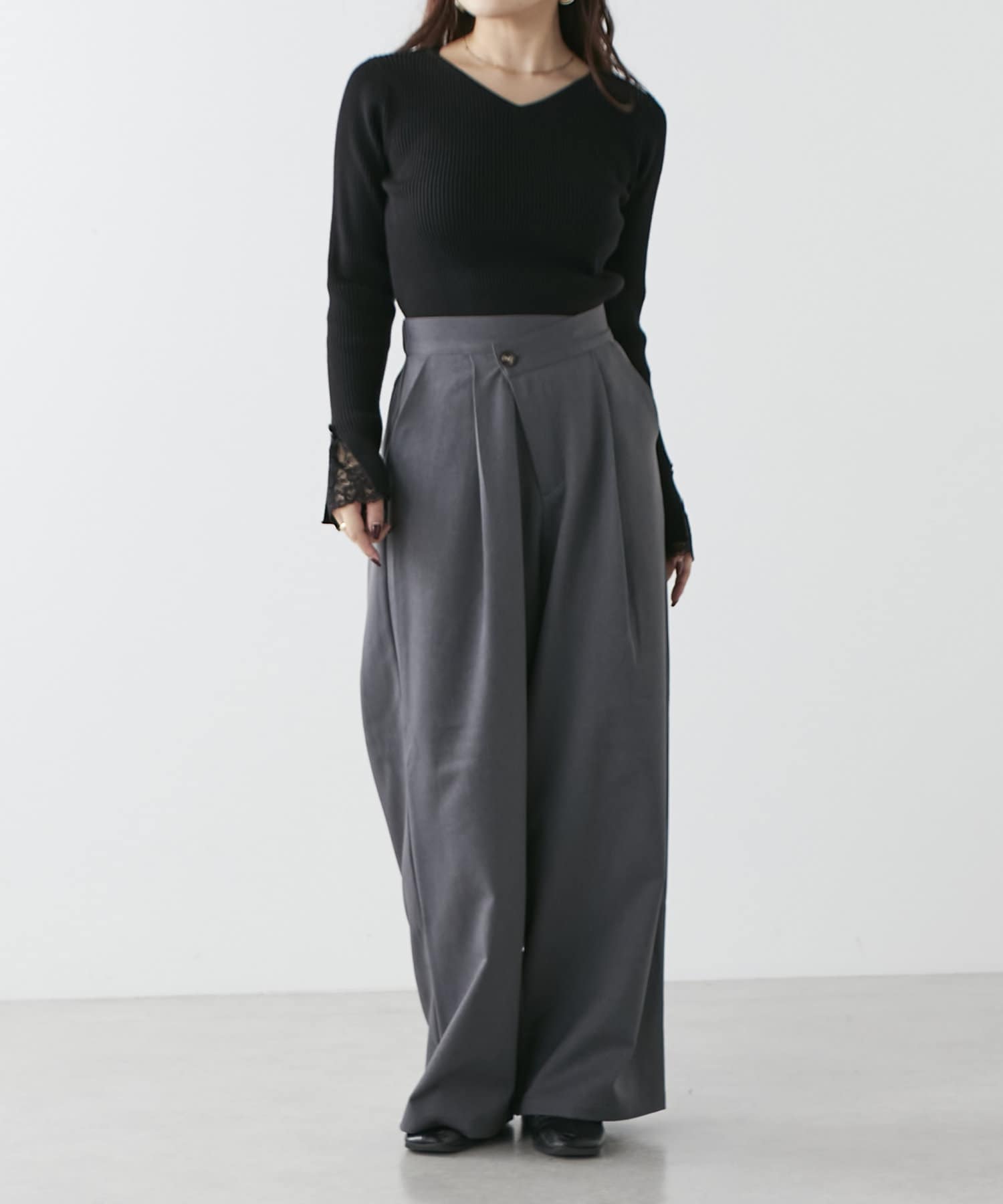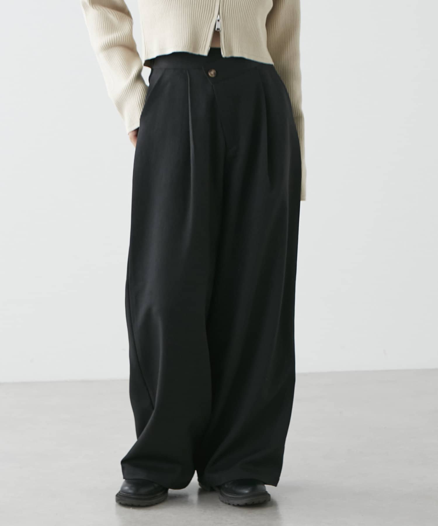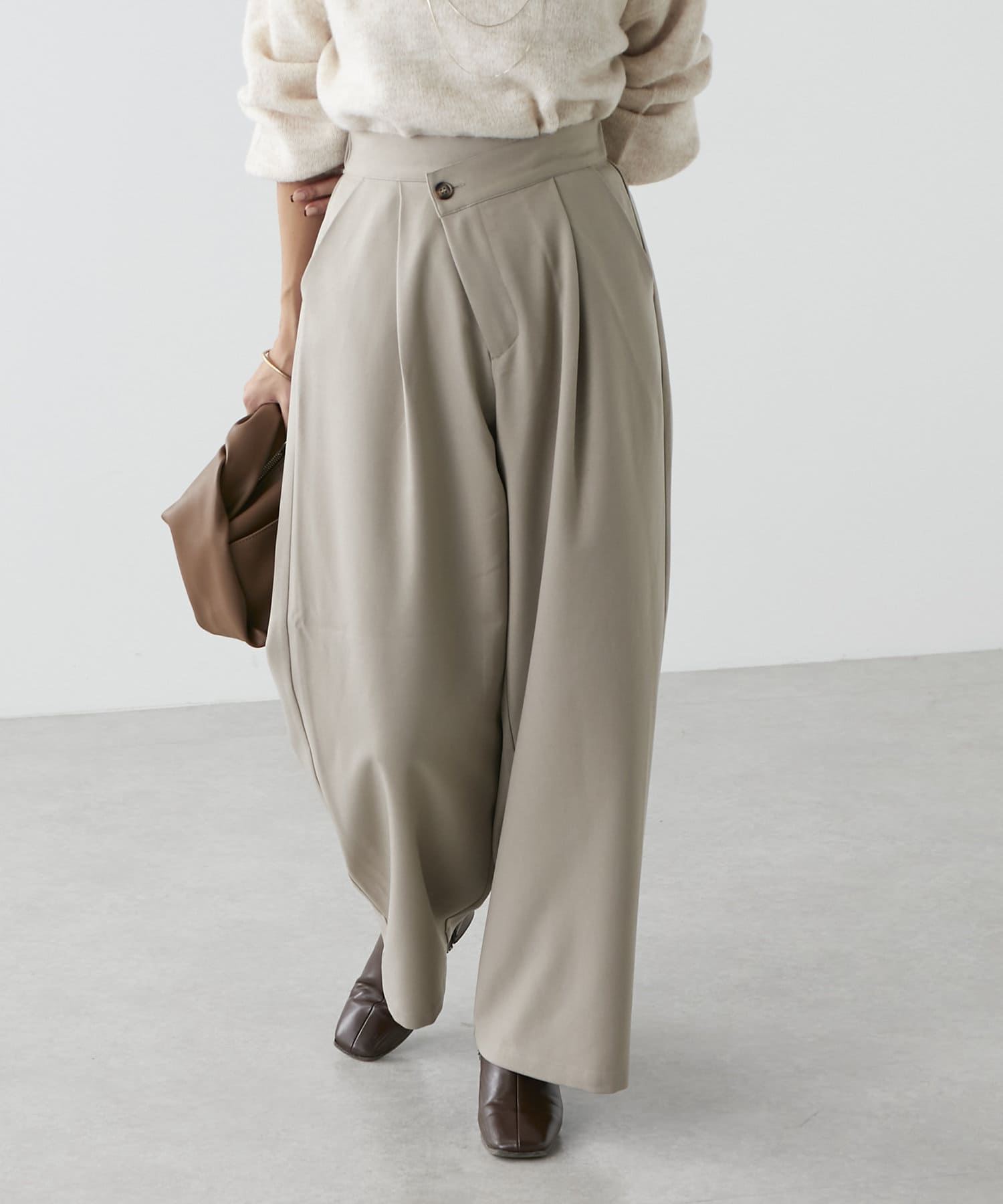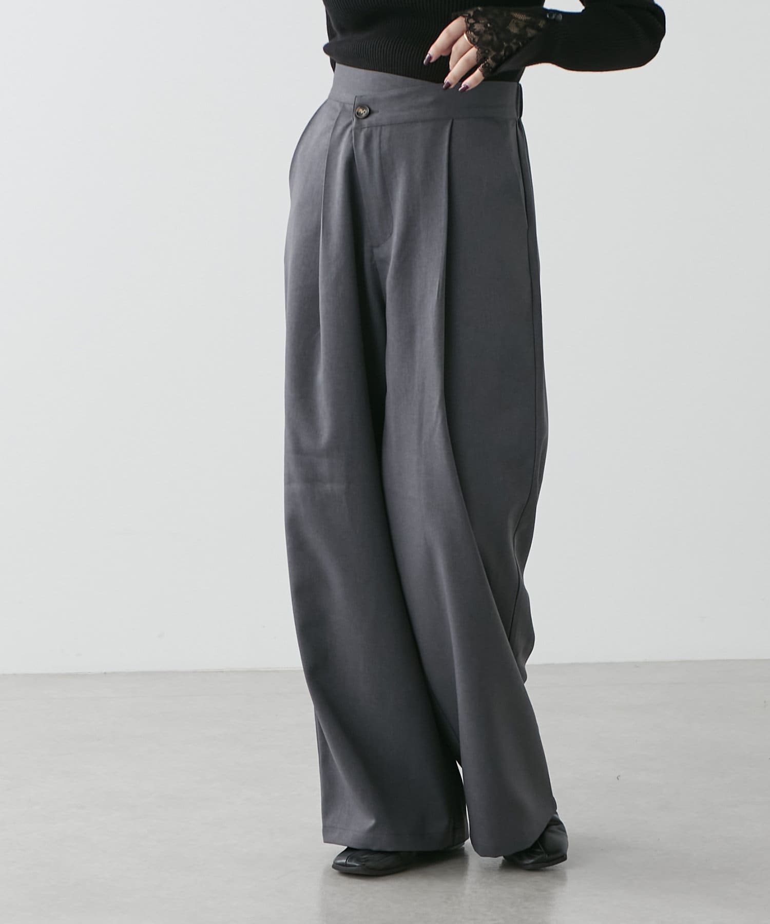 ・ウエストにアシンメトリーデザインが施されたパンツ。