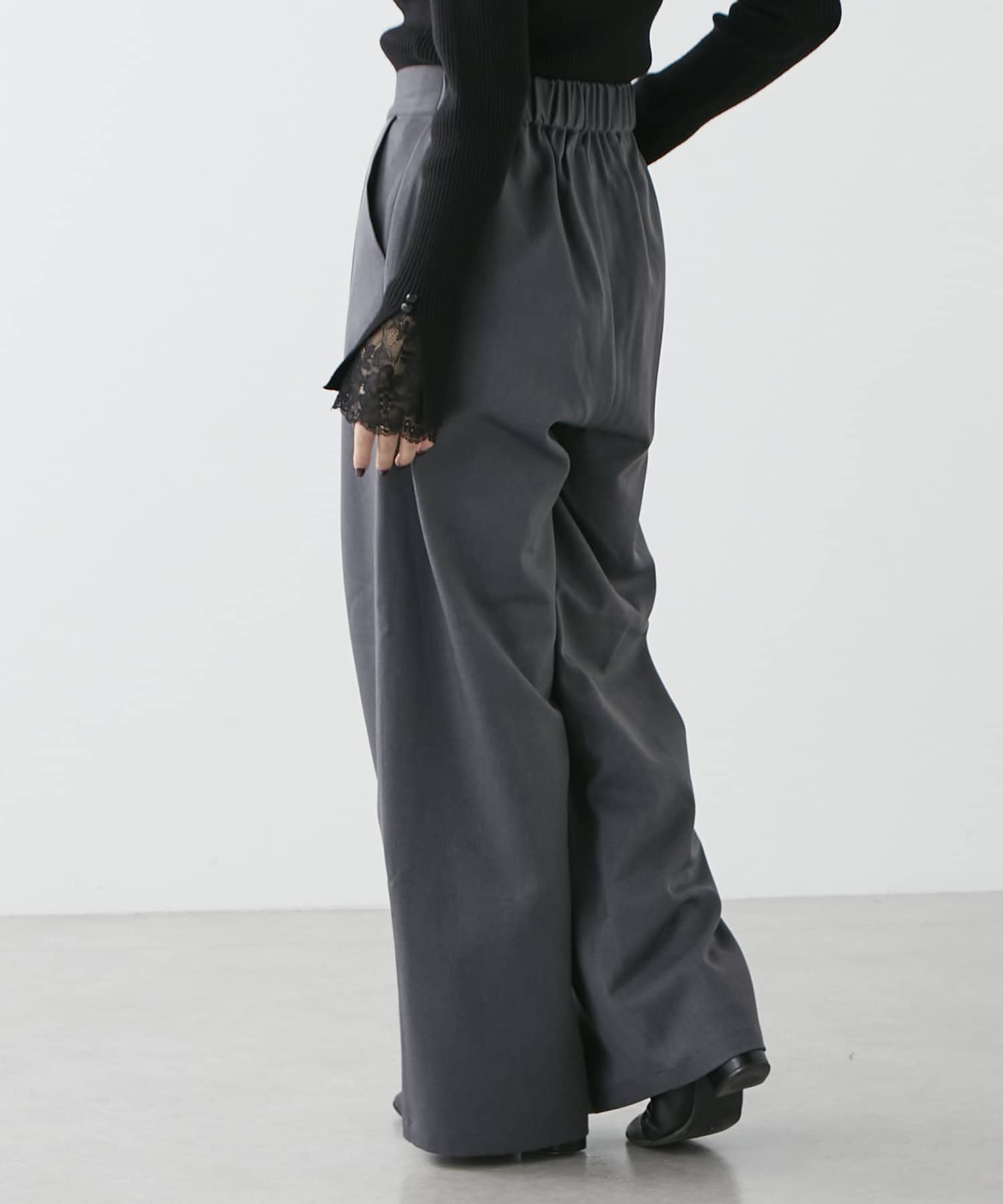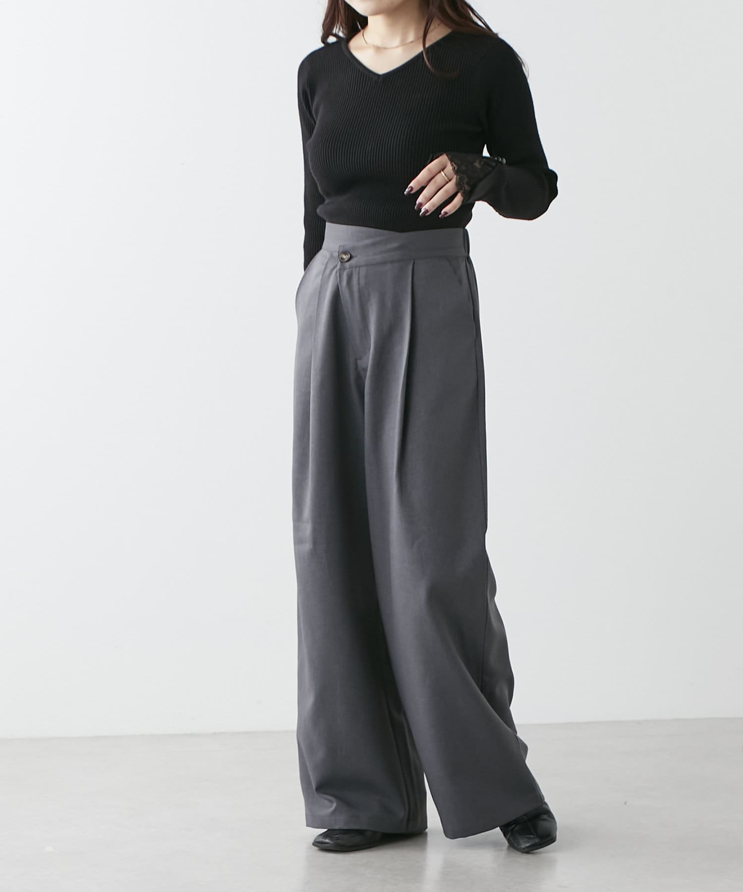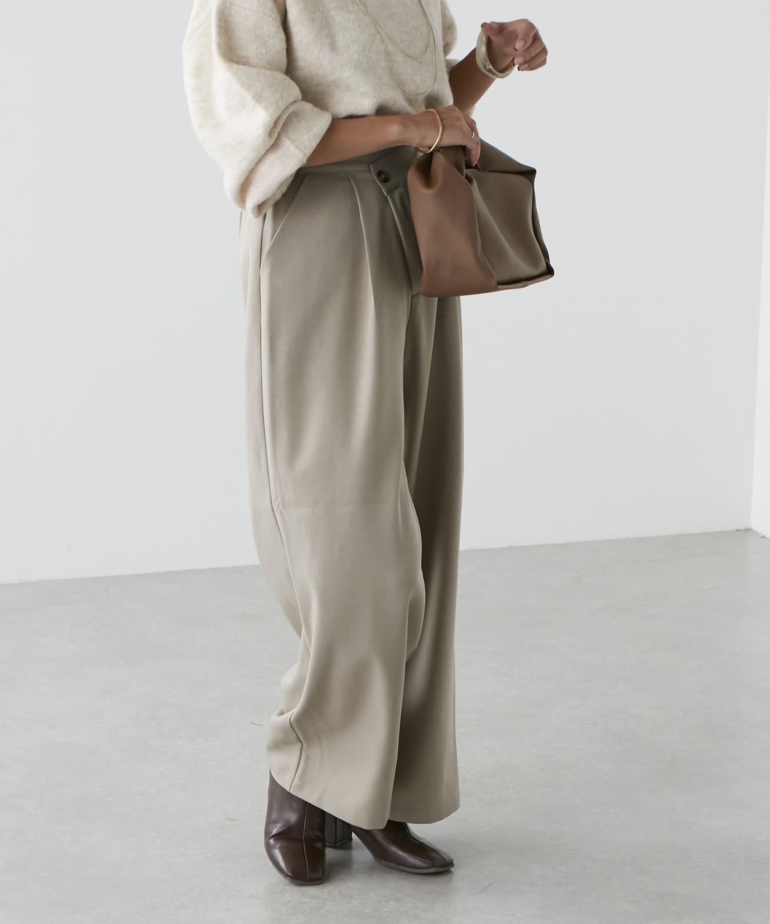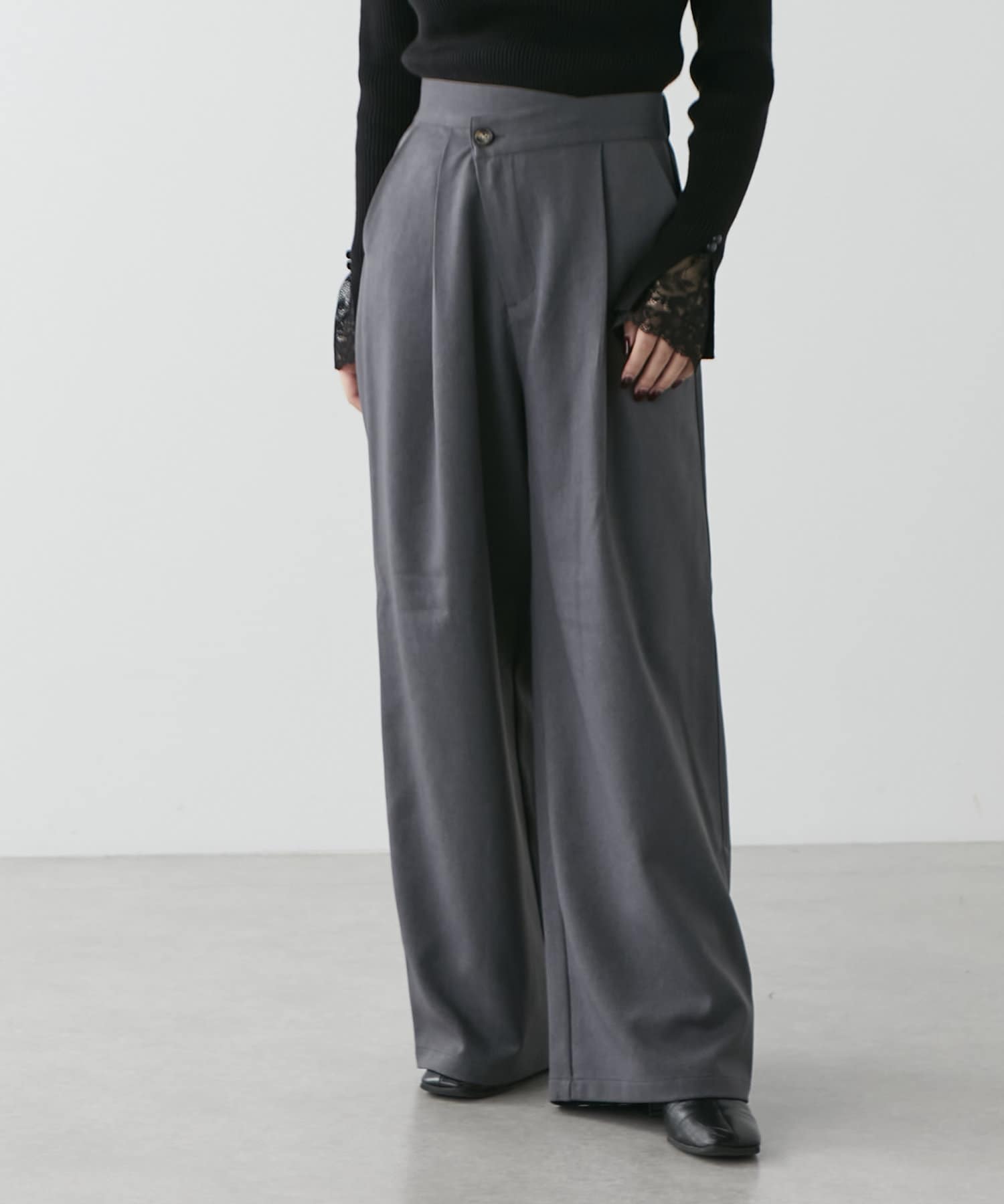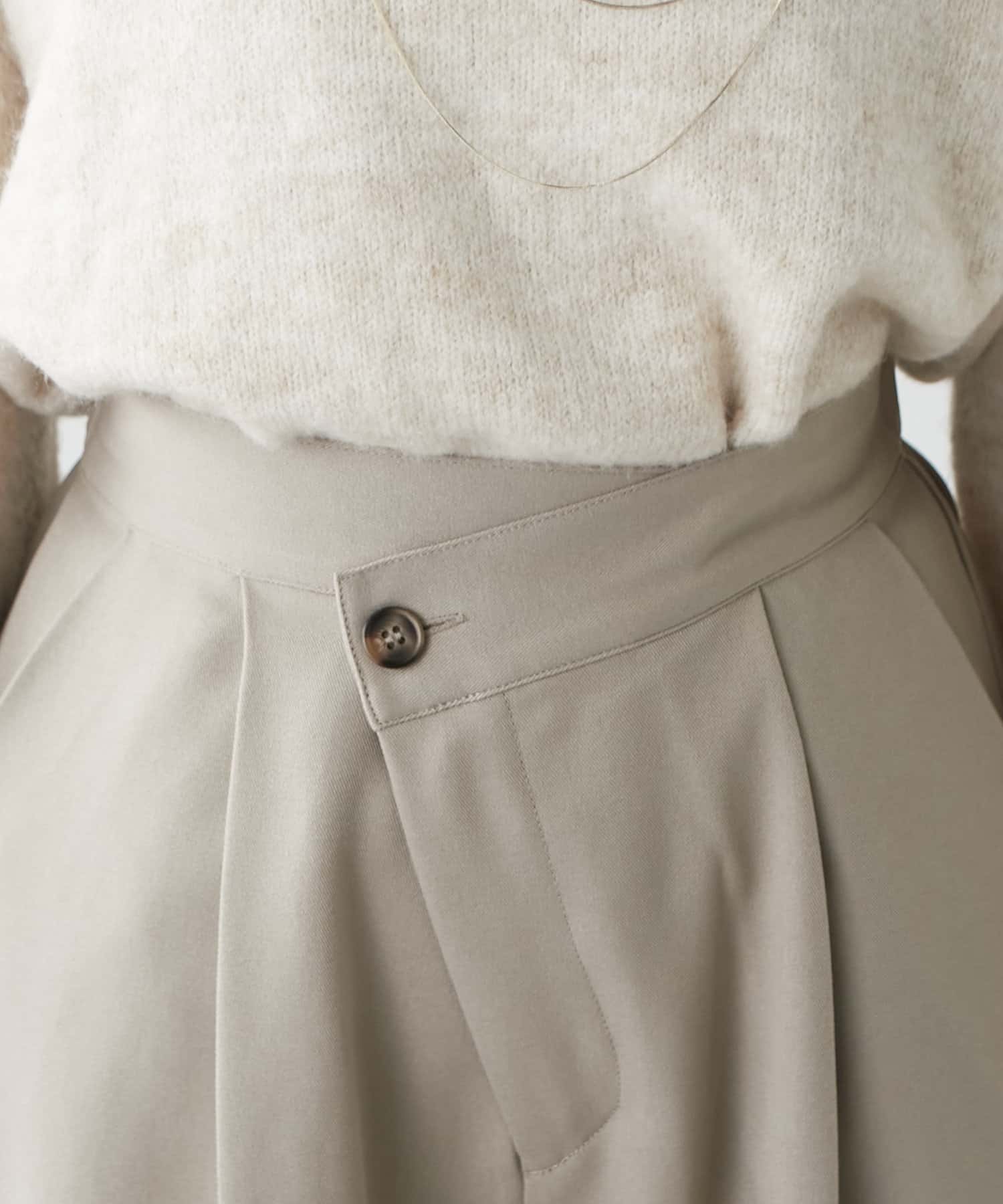 ・ウエストにアシンメトリーデザインが施されたパンツ。