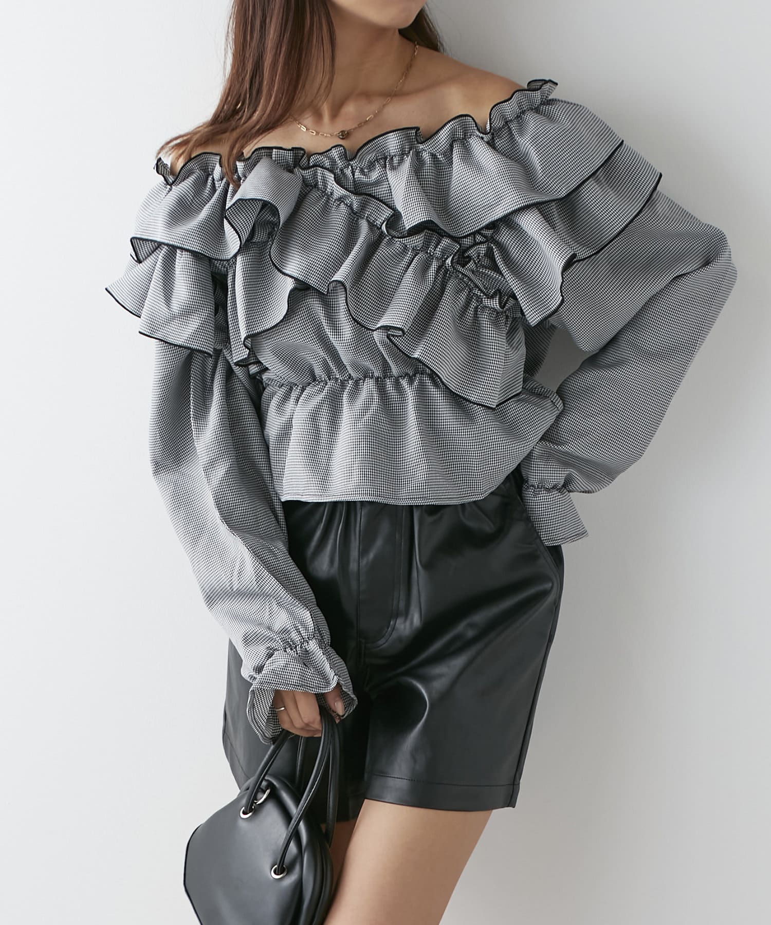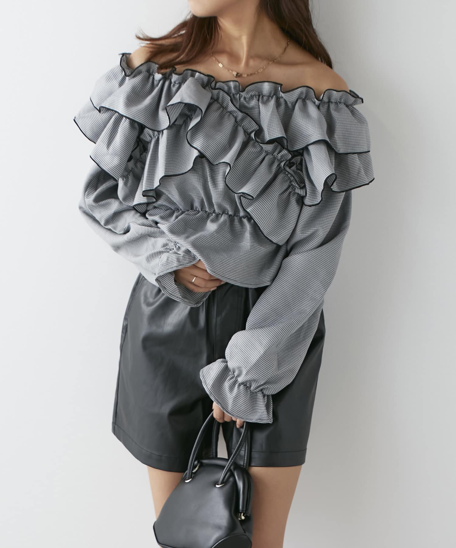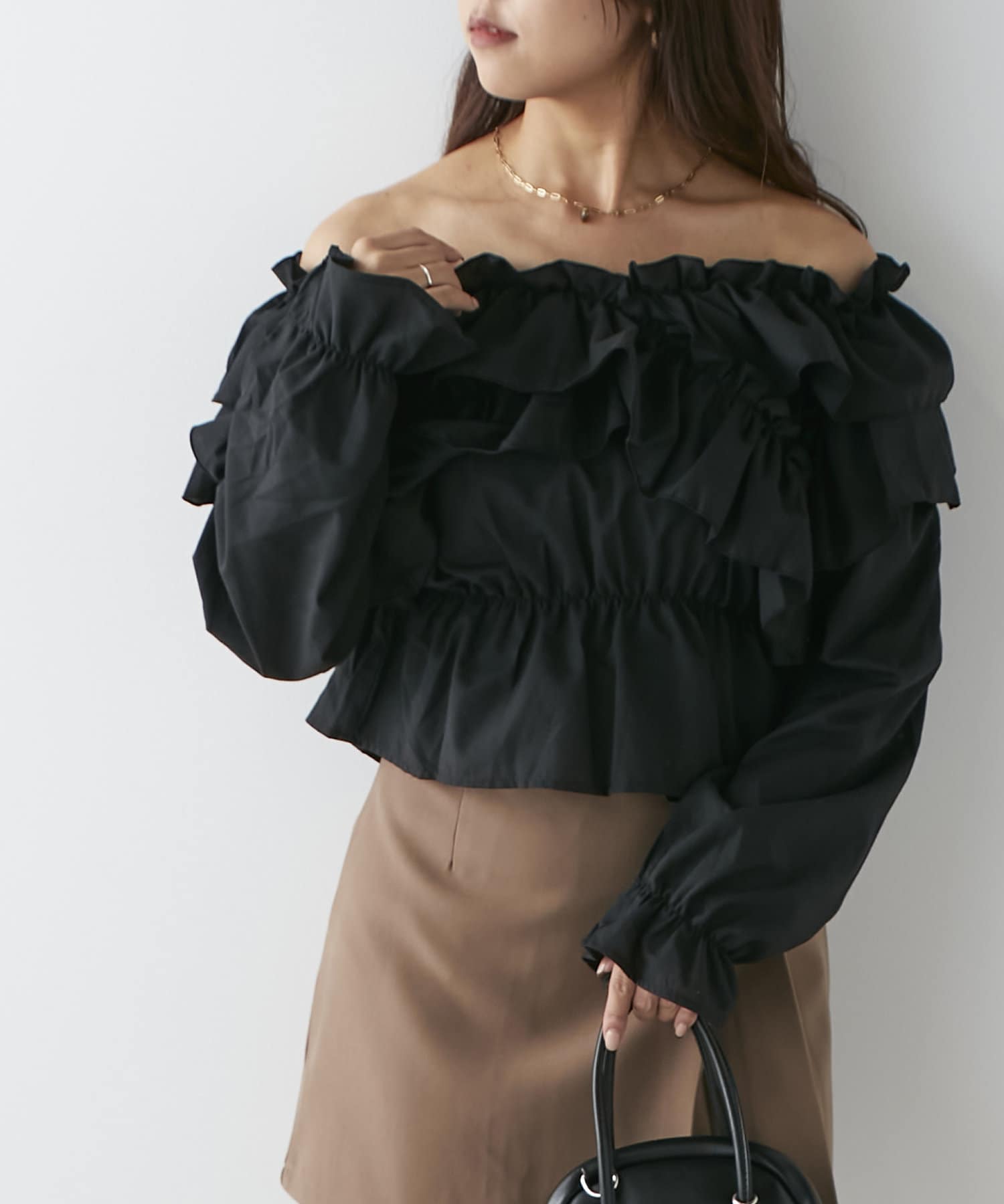 ・胸元クロスデザインでボリュームのあるシルエットのブラウス