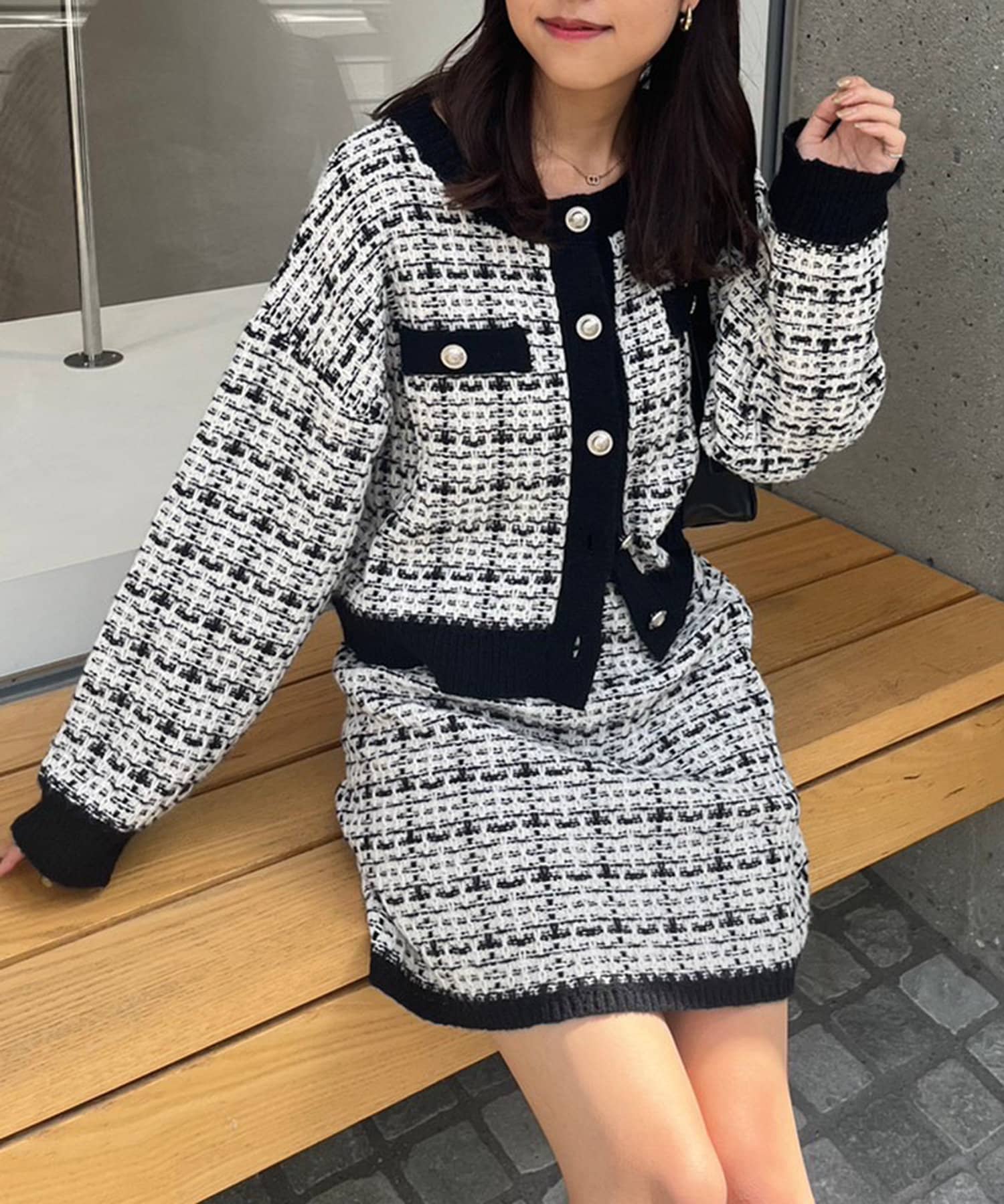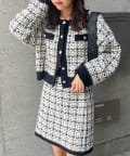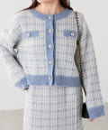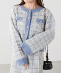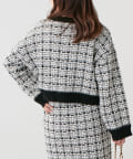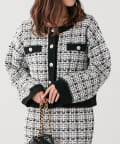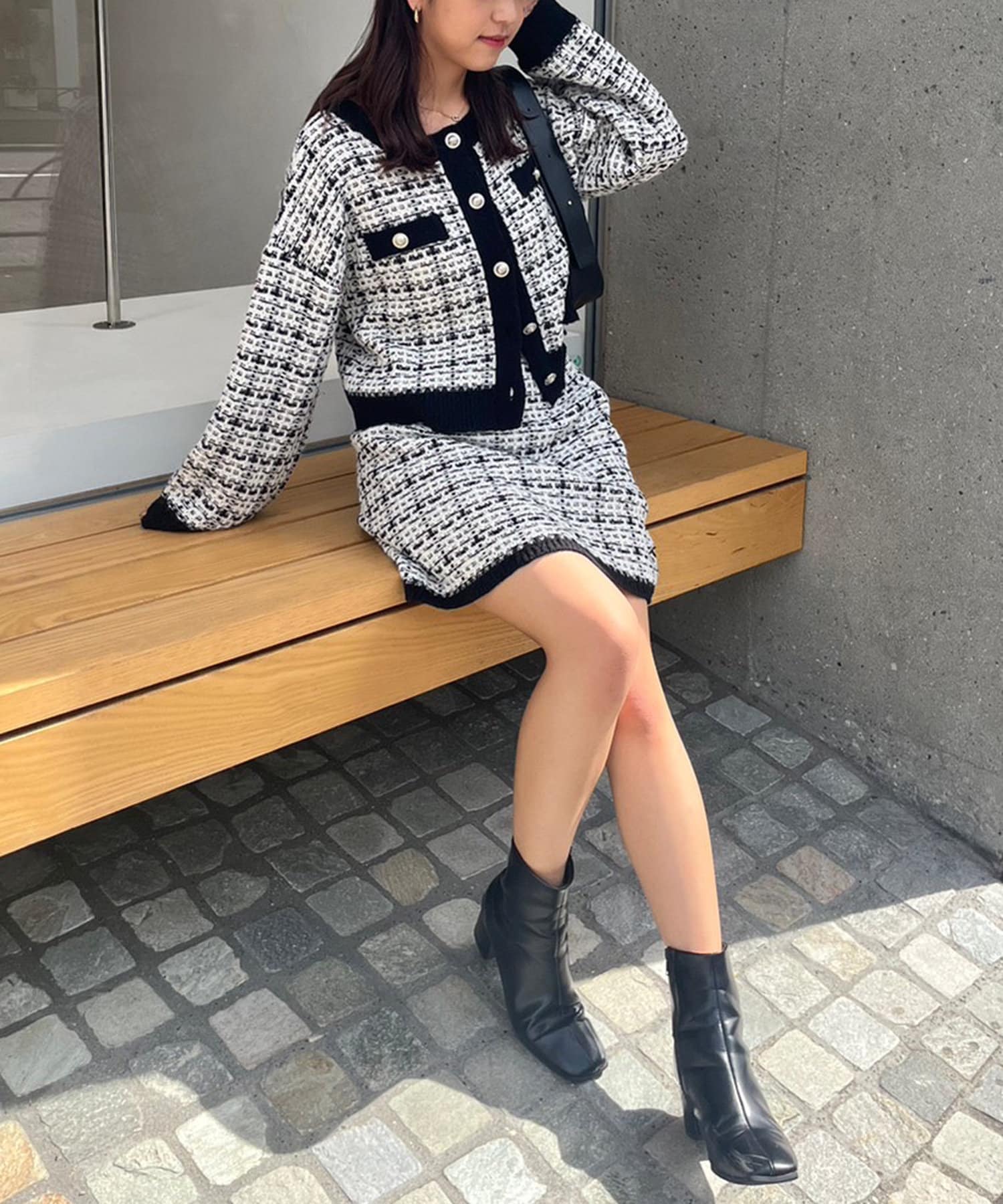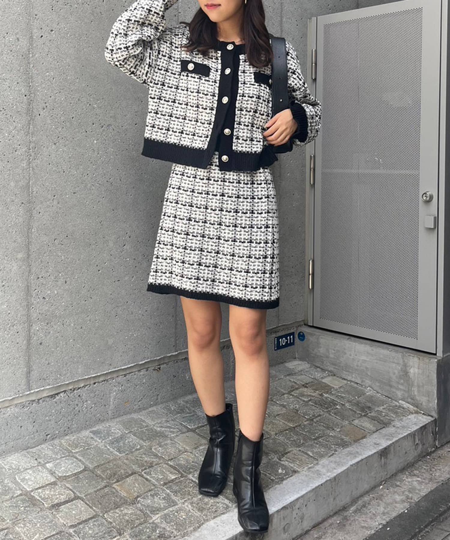 ・同素材のラメツイードスカートとのセットアップコーデもおすすめ。