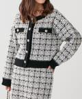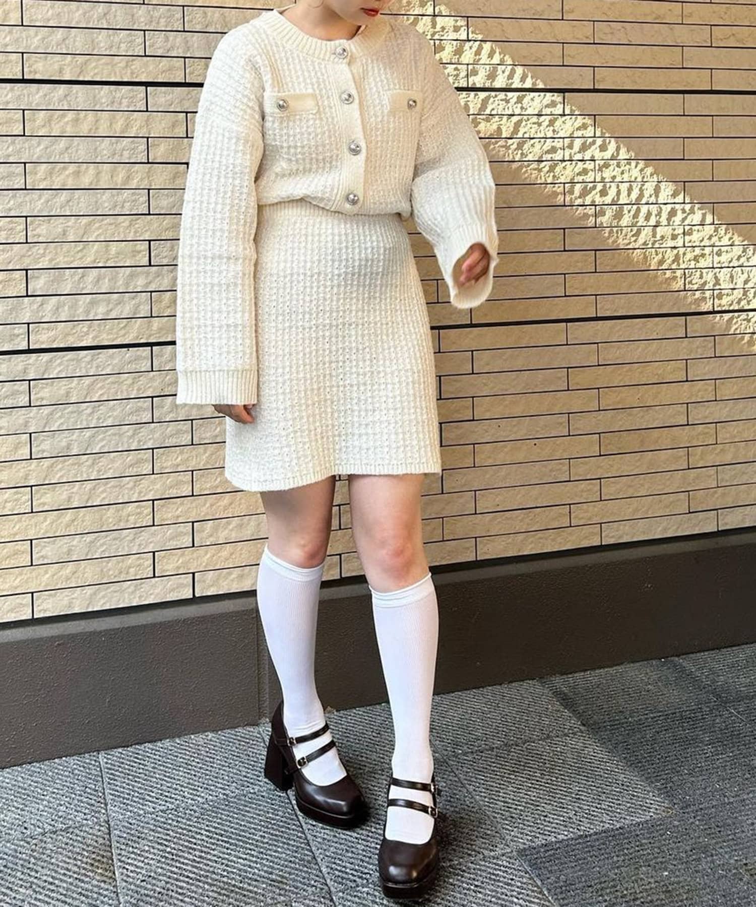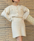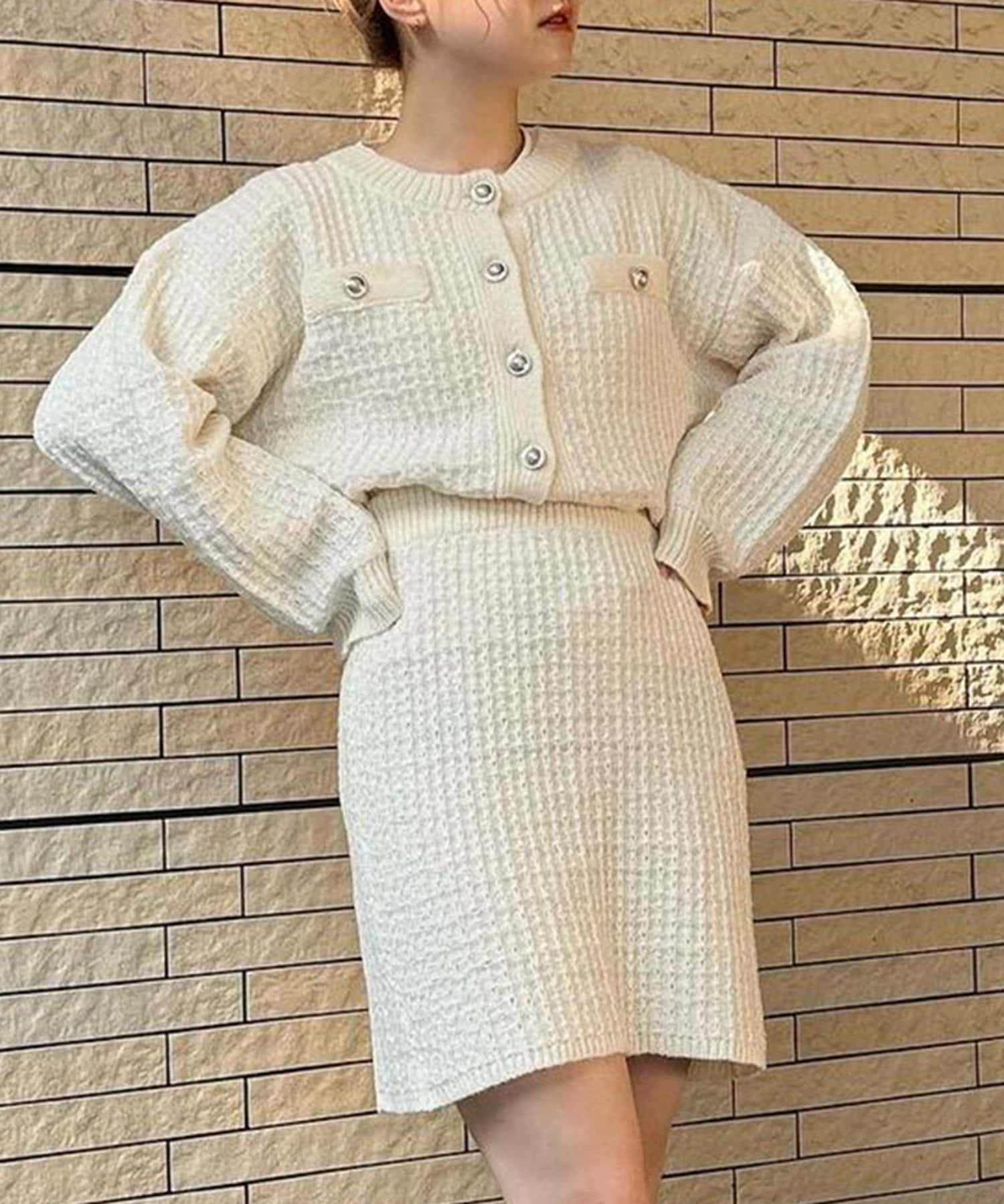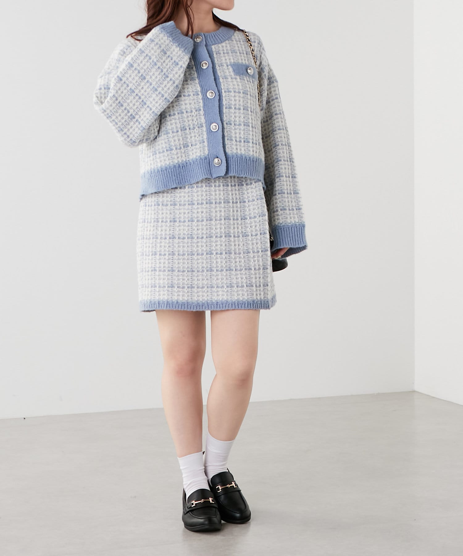 ・同素材のラメツイードスカートとのセットアップコーデもおすすめ。