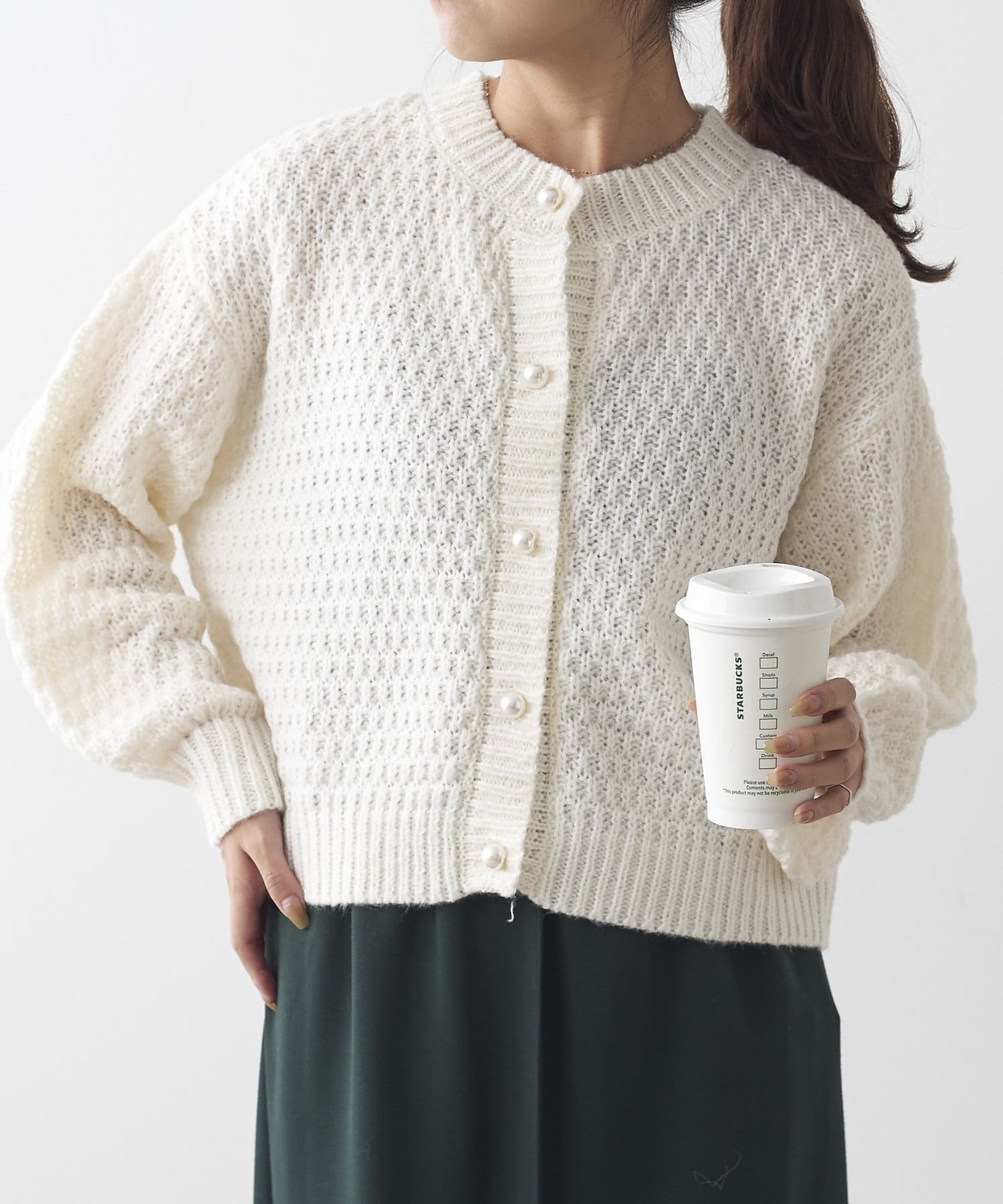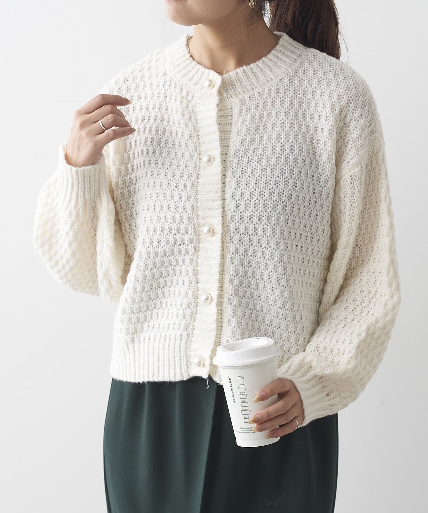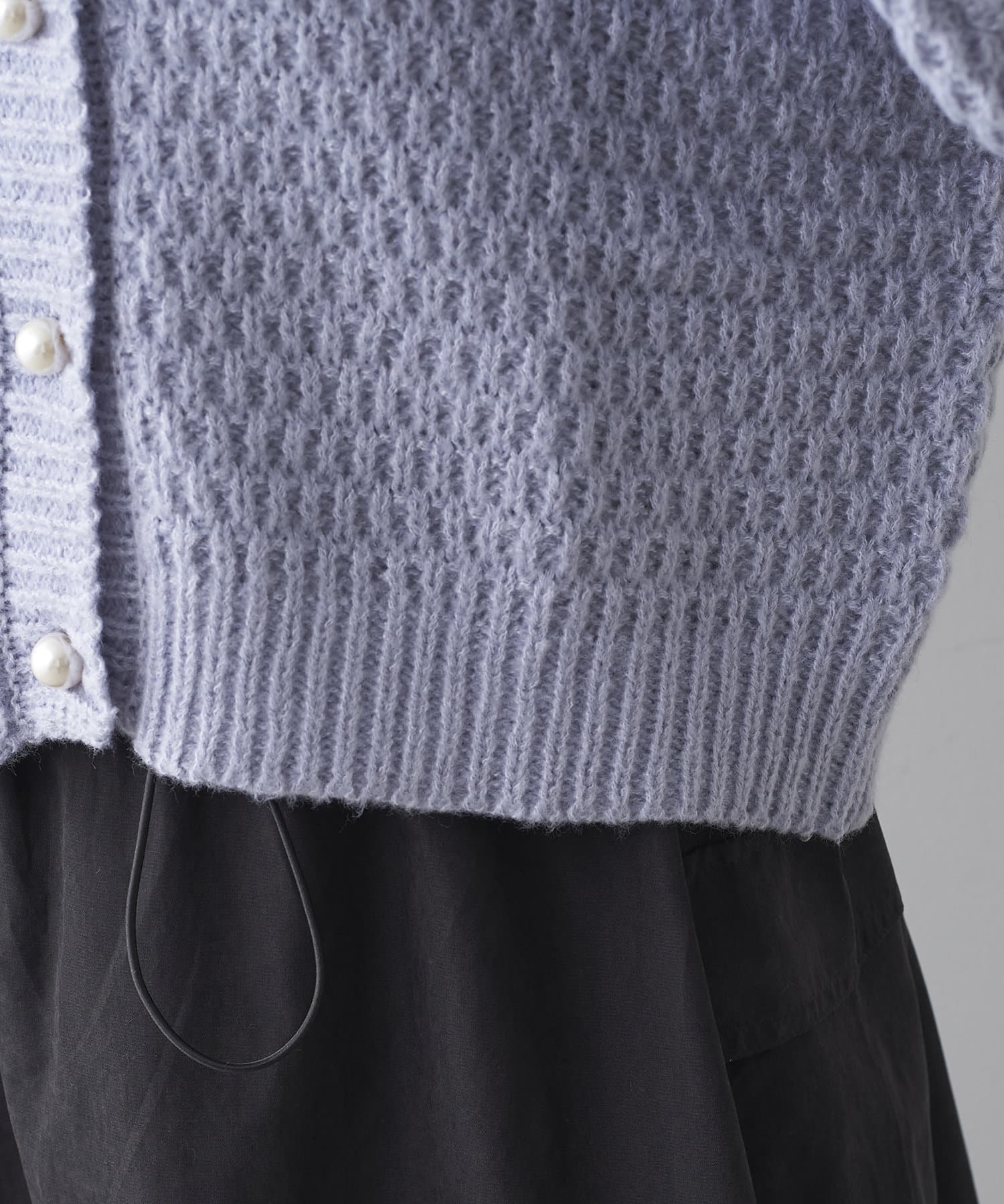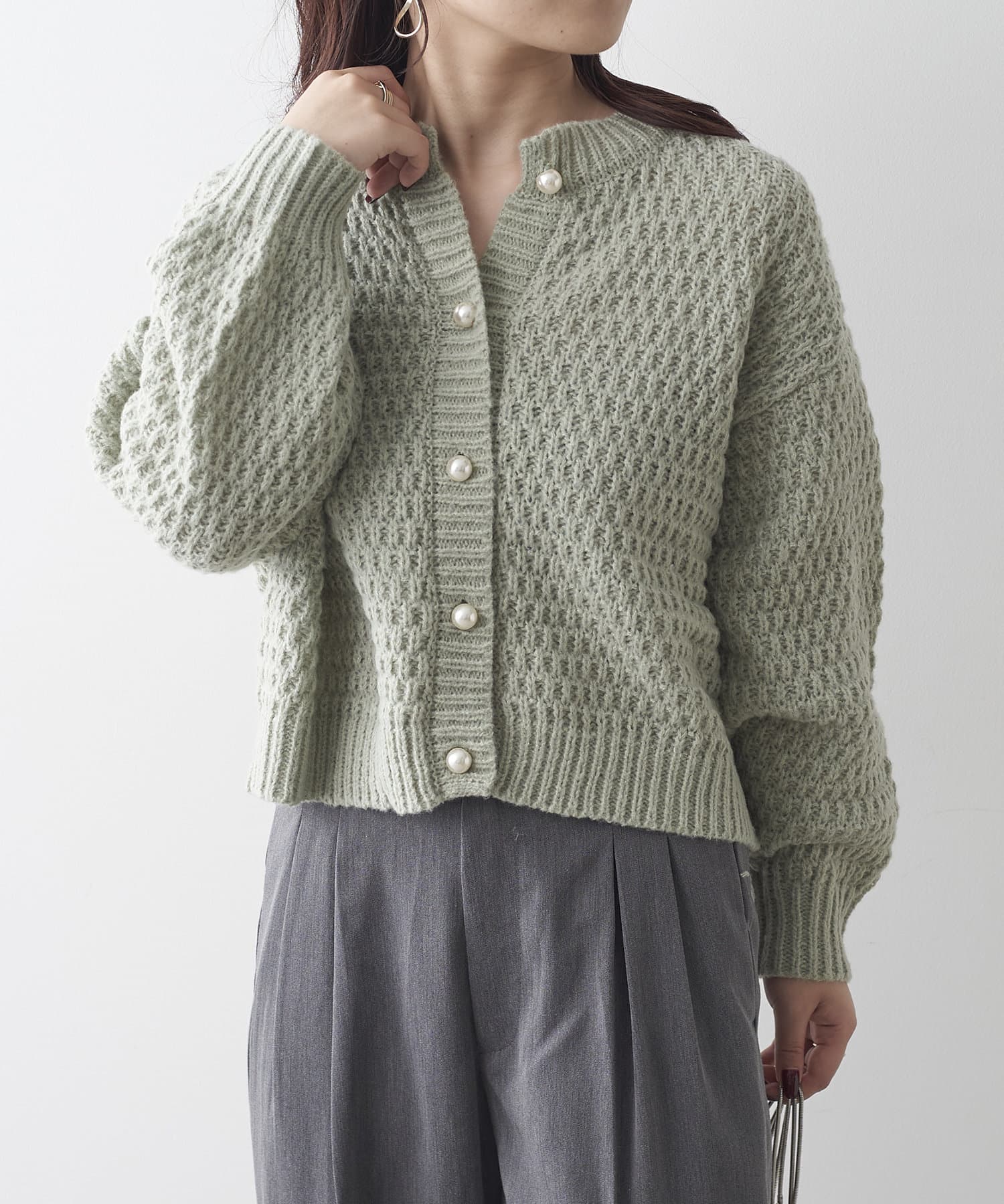 鹿の子編みパール釦カーデ